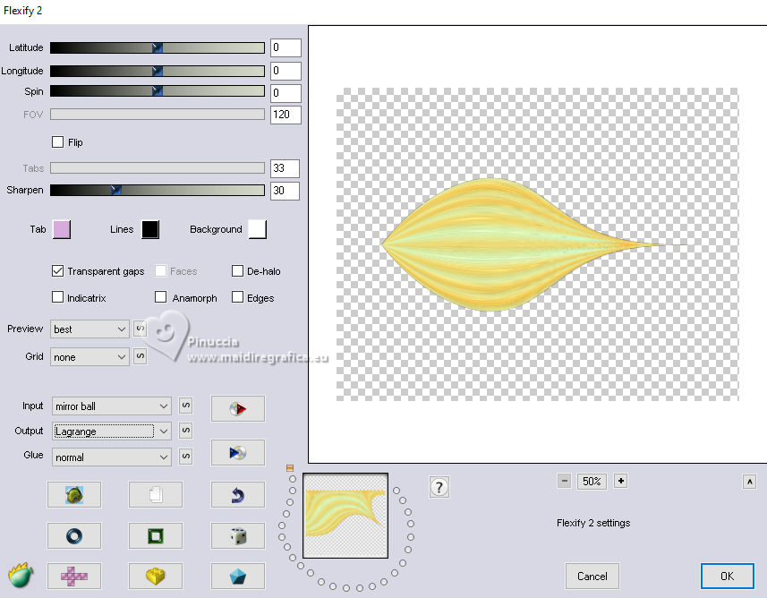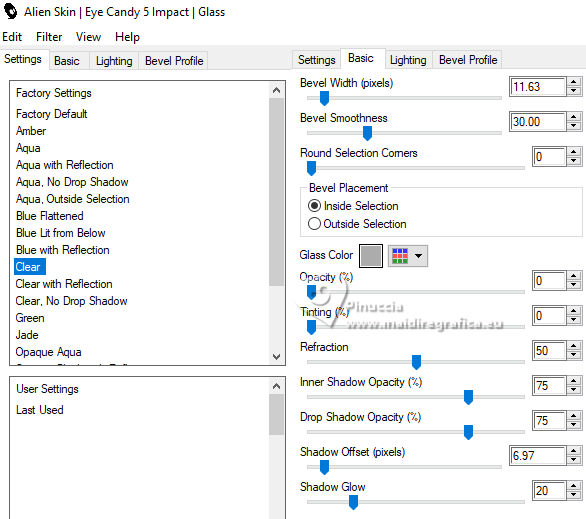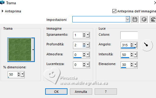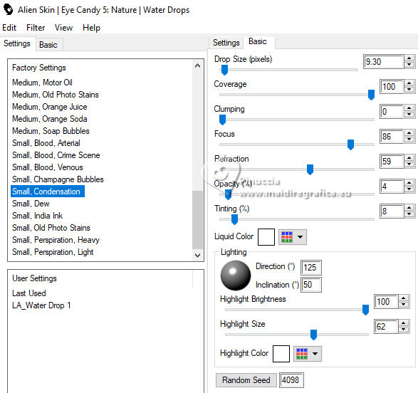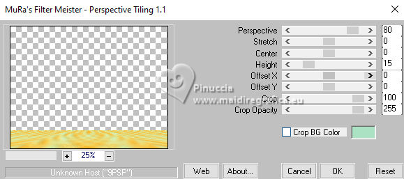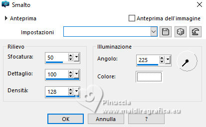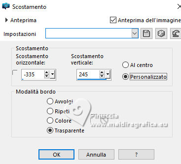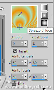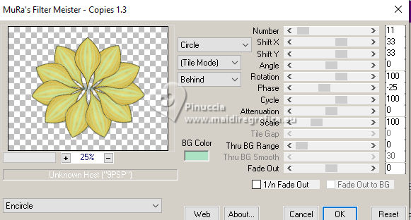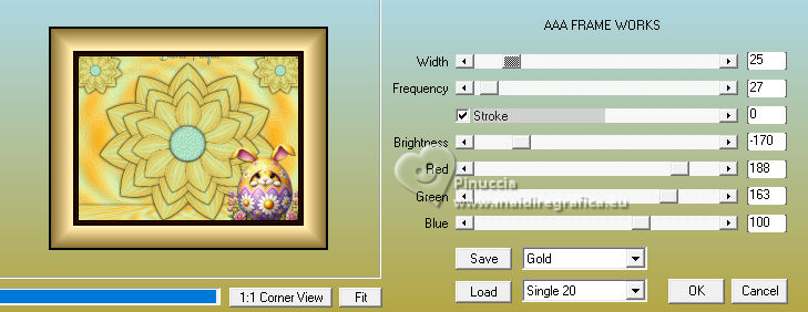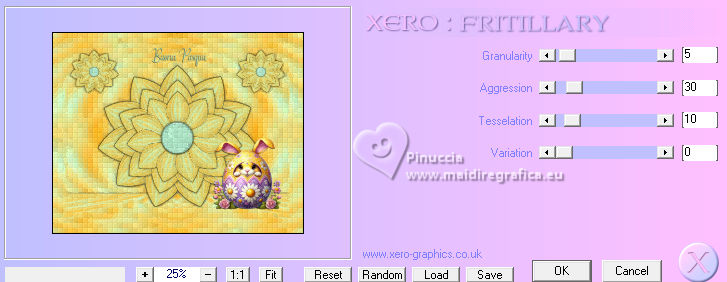 qui puoi trovare qualche risposta ai tuoi dubbi. Se l'argomento che ti interessa non è presente, ti prego di segnalarmelo. Questo tutorial è stato realizzato con PSP2020 e tradotto con PSPX9, ma può essere realizzato anche con le altre versioni di PSP. Dalla versione X4, il comando Immagine>Rifletti è stato sostituito con Immagine>Capovolgi in orizzontale, e il comando Immagine>Capovolgi con Immagine>Capovolgi in verticale. Nelle versioni X5 e X6, le funzioni sono state migliorate rendendo disponibile il menu Oggetti. Con la nuova versione X7, sono tornati Rifletti>Capovolgi, ma con nuove varianti. Vedi la scheda sull'argomento qui Occorrente: Tubes a scelta: 1 tube principale 1 tube accessorio Il resto del materiale qui Per i tubes dei miei esempi grazie Virginia (in questa pagina trovi i links ai siti dei creatori di tubes) Filtri: in caso di dubbi, ricorda di consultare la mia sezione filtri qui Alien Skin Eye Candy 5 Impact - Glass qui Alien Skin Eye Candy 5 Nature - Water Drops qui Flaming Pear - Flexify 2 qui Mura's Meister - Copies, Pole Transform qui Xero - Fritillary qui AAA Frames - Frame Works qui ![]() non esitare a cambiare modalità di miscelatura e opacità secondo i colori utilizzati. Nelle ultime versioni di PSP non c'è il gradiente di primo piano/sfondo (Corel_06_029) Puoi usare i gradienti delle versioni precedenti. Trovi qui i gradienti Corel X. ![]() Metti la trama Natural58 nella cartella Trame. Metti la selezione nella cartella Selezioni. 1. Apri una nuova immagine trasparente 900 x 700 pixels. Scegli due colori dal tuo tube Per l'esempio: Imposta il colore di primo piano con il colore #ef9206, e il colore di sfondo con il colore #abe2c3 ![]() 2. Passa il colore di primo piano a Gradiente di primo piano/sfondo, stile Sprazzo di luce. ![]() Riempi l'immagine trasparente con il gradiente.3. Livelli>Duplica. Immagine>Rifletti>Rifletti verticalmente (Immagine>Capovolgi). Abbassa l'opacità di questo livello al 50%. Livelli>Unisci>Unisci giù. Livelli>Duplica. Immagine>Rifletti>Rifletti orizzontalmente (Immagine>Rifletti). Abbassa l'opacità di questo livello al 50%. Livelli>Unisci>Unisci giù. 4. Eventualmente se l'immagine ti sembra troppo scura: Regola>Luminosità e contrasto>Luminosità e contrasto ![]() 5. Effetti>Effetti artistici>Smalto. ![]() 6. Livelli>Duplica. Effetti>Effetti geometrici>Prospettiva orizzontale. ![]() 7. Effetti>Plugins>Flaming Pear - Flexify 2. ![]() 8. Immagine>Ridimensiona, al 50%, tutti livelli non selezionato. ![]() 9. Immagine>Ruota per gradi - 90 gradi a destra. ![]() Effetti>Effetti di bordo>Erodi 10. Effetti>Plugins>Mura's Meister - Copies. ![]() Regola>Messa a fuoco>Metti a fuoco. 11. Effetti>Effetti 3D>Sfalsa ombra, colore nero. ![]() 12. Livelli>Duplica. Immagine>Ridimensiona, all'80%, tutti i livelli non selezionato. ![]() Livelli>Duplica. Di nuovo Immagine>Ridimensiona, all'80%, tutti i livelli non selezionato. 13. Livelli>Nuovo livello raster. Selezione>Carica/Salva selezione>Carica selezione da disco. Cerca e carica la selezione 01ornament139-romana1 ![]() Riempi la selezione con il colore di sfondo.14. Effetti>Plugins>Alien Skin Eye Candy 5 Nature - Water Drops ![]() 15. Effetti>Plugins>Alien Skin Eye Candy 5 Impact - Glass ![]() 16. Effetti>Effetti di trama>Trama - scegli la trama Natural58 con i seguenti settaggi: ![]() Effetti>Effetti 3D>Sfalsa ombra, colore nero. ![]() Selezione>Deseleziona. Livelli>Unisci>Unisci giù - 3 volte. 17. Livelli>Duplica. Immagine>Ridimensiona, al 30%, tutti i livelli non selezionato. ![]() Regola>Messa a fuoco>Metti a fuoco. 18. Effetti>Effetti di immagine>Scostamento. ![]() Effetti>Effetti 3D>Sfalsa ombra, colore nero. ![]() Livelli>Duplica. Immagine>Rifletti>Rifletti orizzontalmente. 19. Attiva il livello Raster 1. Livelli>Duplica. Effetti>Plugins>Mura's Meister - Perspective Tiling. ![]() Effetti>Effetti 3D>Sfalsa ombra, colore nero. ![]() 20. Attiva il livello soprastante con il "fiore" più grande. Effetti>Effetti di immagine>Scostamento. ![]() 21. Attiva lo strumento Testo , scegli un font,e scrivi il tuo testo, io ho scritto Buona Pasqua. Effetti>Effetti 3D>Sfalsa ombra, colore nero. ![]() 22. Apri il tuo tube accessorio e vai a Modifica>Copia. Torna al tuo lavoro e vai a Modifica>Incolla come nuovo livello. Immagine>Ridimensiona, se e quanto necessario, tutti i livelli non selezionato. Regola>Messa a fuoco>Metti a fuoco. Sposta il tube in basso a destra.Effetti>Effetti 3D>Sfalsa ombra, colore nero. ![]() 23. Attiva il livello Raster 1. Modifica>Copia Selezione>Seleziona tutto. Immagine>Aggiungi bordatura, 50 pixels, simmetriche, colore bianco #ffffff. Selezione>Inverti. Modifica>Incolla nella selezione 24. Effetti>Plugins>Xero - Fritillary. ![]() Regola>Messa a fuoco>Accentua messa a fuoco. 25. Effetti>Plugins>AAA Frames - Frame Works. ![]() Selezione>Inverti. Effetti>Effetti 3D>Sfalsa ombra, colore nero. ![]() 25. Apri il tuo tube principale e vai a Modifica>Copia. Torna al tuo lavoro e vai a Modifica>Incolla come nuovo livello. Ridimensiona, se e quanto necessario, tutti i livelli non selezionato. Regola>Messa a fuoco>Metti a fuoco. Sposta il tube a sinistra.Effetti>Effetti 3D>Sfalsa ombra, colore nero. ![]() 26. Attiva lo strumento Testo ![]() Scrivi il tuo nome o, se preferisci, aggiungi il tuo watermark. Effetti>Effetti 3D>Sfalsa ombra, a scelta. 27. Livelli>Unisci>Unisci tutto e salva in formato jpg. ![]() ![]() Se hai problemi o dubbi, o trovi un link non funzionante, o anche soltanto per un saluto, scrivimi. |