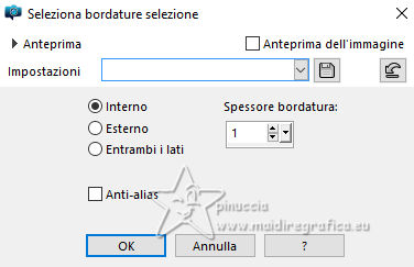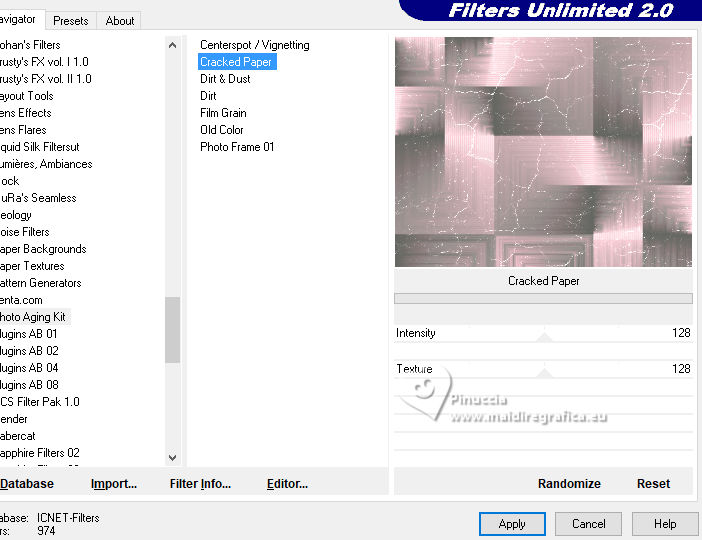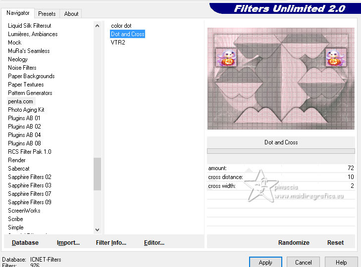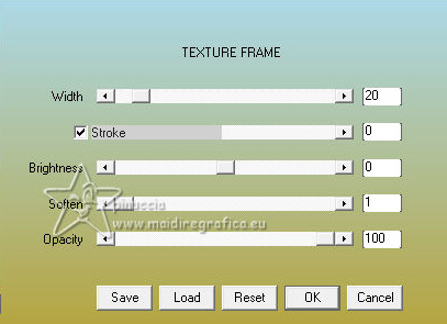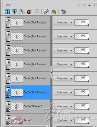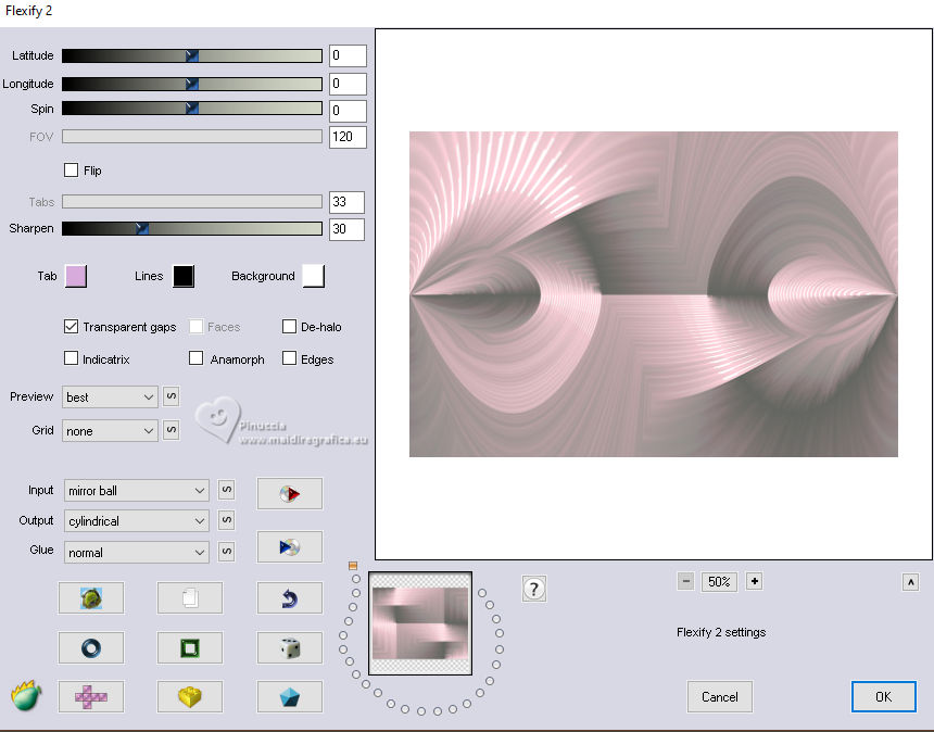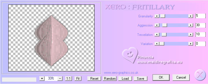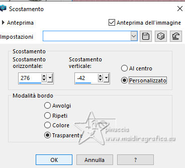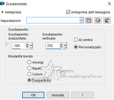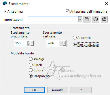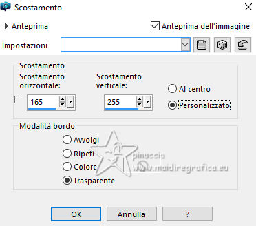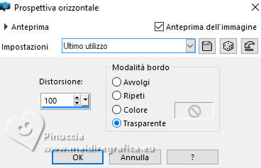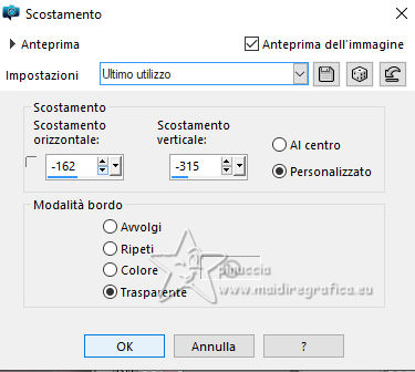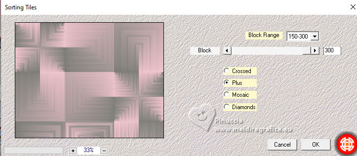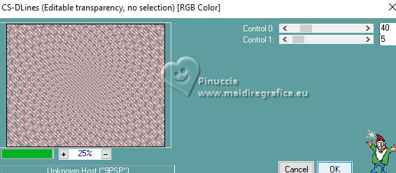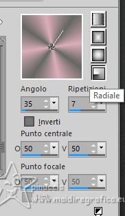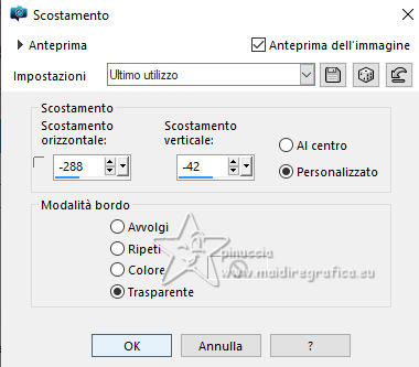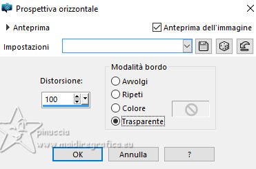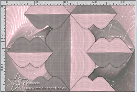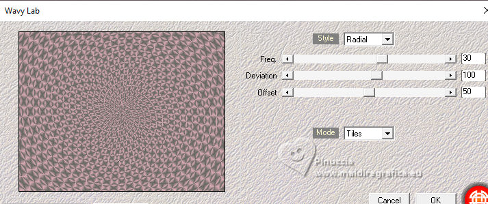 qui puoi trovare qualche risposta ai tuoi dubbi. Se l'argomento che ti interessa non è presente, ti prego di segnalarmelo. Questo tutorial è stato realizzato con PSP2020 e tradotto con PSPX9, ma può essere realizzato anche con le altre versioni di PSP. Dalla versione X4, il comando Immagine>Rifletti è stato sostituito con Immagine>Capovolgi in orizzontale, e il comando Immagine>Capovolgi con Immagine>Capovolgi in verticale. Nelle versioni X5 e X6, le funzioni sono state migliorate rendendo disponibile il menu Oggetti. Con la nuova versione X7, sono tornati Rifletti>Capovolgi, ma con nuove varianti. Vedi la scheda sull'argomento qui Occorrente: Tubes a scelta 3 deco tubes Il tube principale Il resto del materiale (una selezione) qui Per i tubes usati grazie Blaque Heart Designz, Virginia e Colybrix. (in questa pagina trovi i links ai siti dei creatori di tubes) Filtri: in caso di dubbi, ricorda di consultare la mia sezione filtri qui Filters Unlimited 2.0 qui Photo Aging Kit - Cracked Paper qui Xero - Fritillary qui Mehdi - Sorting Tiles qui Mehdi - Wavy Lab 1.1. qui Flaming Pear - Flexify 2 qui Carolaine and Sensibility - CS-LDots, CS-DLinesqui Penta.com - Dot and Cross qui AAA Frames - Texture Frame qui I filtri VM Instant Art e Simple si possono usare da soli o importati in Filters Unlimited (come fare vedi qui) Se un filtro fornito appare con questa icona ![]() Nelle ultime versioni di PSP non c'è il gradiente di primo piano/sfondo (Corel_06_029) Puoi usare i gradienti delle versioni precedenti. Trovi qui i gradienti Corel X. ![]() Metti la selezione nella cartella Selezioni. 1. Apri una nuova immagine trasparente 900 x 600 pixels. Scegli due colori dal tuo tube. Per l'esempio: Imposta il colore di primo piano con #656762, e il colore di sfondo con #dbacb6. ![]() 2. Passa il colore di primo piano a Gradiente di primo piano/sfondo, stile Radiale. ![]() Riempi l'immagine trasparente con il gradiente.3. Effetti>Plugins>Mehdi - Wavy Lab ![]() 4. Effetti>Plugins>Carolaine and Sensibility - CS LDots. ![]() 5. Effetti>Plugins>Carolaine and Sensibility - CS DLines, con i settaggi standard. ![]() 6. Effetti>Plugins>Mehdi - Sorting Tiles. ![]() 7. Effetti>Plugins>Flaming Pear - Flexify 2. ![]() la versione usata nel tutorial originale è una vecchia versione e a volte può dare risultati differenti dalle nuove versioni; in questo caso, con questi settaggi, il risultato con le versioni più recenti non cambia. ![]() 8. Livelli>Duplica. Effetti>Effetti geometrici>Prospettiva orizzontale. ![]() Livelli>Duplica. Immagine>Rifletti>Rifletti orizzontalmente. Livelli>Unisci>Unisci giù. 9. Effetti>Plugins>Flaming Pear - Flexify 2. ![]() 10. Immagine>Ridimensiona, al 60%, tutti i livelli non selezionato. ![]() 11. Immagine>Ruota per gradi - 90 gradi a destra. ![]() 12. Effetti>Effetti di immagine>Scostamento. ![]() 13. Effetti>Effetti 3D>Sfalsa ombra, colore nero. ![]() 14. Effetti>Plugins>Xero - Fritillary. ![]() 15. Attiva il livello inferiore, Raster 1. Effetti>Plugins>Filters Unlimited 2.0 - Photo Aging Kit - Cracked Paper, con i settaggi standard. ![]() 16. Attiva nuovamente il livello superiore. Livelli>Duplica. Immagine>Ridimensiona, al 60%, tutti i livelli non selezionato. Livelli>Duplica - 5 volte e avrai 6 livelli uguali. Chiudi i livelli delle copie e attiva il livello della prima copia. ![]() 17. Immagine>Ruota per gradi - 90 gradi a destra. ![]() 18. Effetti>Effetti di immagine>Scostamento. ![]() 19. Riapri e attiva il livello soprastante. Immagine>Ruota per gradi - 90 gradi a sinistra. ![]() 20. Effetti>Effetti di immagine>Scostamento. ![]() 21. Riapri e attiva il livello soprastante. Immagine>Rifletti>Rifletti verticalmente. Immagine>Ruota per gradi - 90 gradi a destra. ![]() Effetti>Effetti di immagine>Scostamento. ![]() 22. Riapri e attiva il livello successivo. Immagine>Rifletti>Rifletti verticalmente. Immagine>Ruota per gradi - 90 gradi a sinistra. ![]() Effetti>Effetti di immagine>Scostamento. ![]() 23. Riapri e attiva il livello successivo. Immagine>Rifletti>Rifletti verticalmente. Immagine>Ruota per gradi - 90 gradi a destra ![]() Effetti>Effetti di immagine>Scostamento. ![]() 24. Riapri e attiva il livello successivo (l'ultimo). Immagine>Rifletti>Rifletti orizzontalmente. Immagine>Ruota per gradi - 90 gradi a destra. ![]() Effetti>Effetti di immagine>Scostamento. ![]() Risultato ![]() 25. Livelli>Nuovo livello raster. Selezione>Carica/Salva selezione>Carica selezione da disco. Cerca e carica la selezione 01ornament40-romana1 ![]() Riempi la selezione con il colore di sfondo.26. Livelli>Nuovo livello raster. Selezione>Modifica>Seleziona bordature selezione. ![]() Riempi la selezione con il colore di primo piano.non esitare a ingrandire bene l'immagine per vedere il piccolo spazio da riempire Selezione>Deseleziona. Livelli>Unisci>Unisci giù. 27. Selezione>Carica/Salva selezione>Carica selezione da disco. Carica nuovamente la selezione 01ornament40-romana1 ![]() Apri il primo tube accessorio. Immagine>Ridimensiona, quanto necessario per adattarlo al piccolo quadro. Modifica>Copia. Modifica>Incolla come nuovo livello. Se sei soddisfatto: Selezione>Inverti. Premi sulla tastiera il tasto CANC ![]() Selezione>Deseleziona. Effetti>Effetti 3D>Sfalsa ombra, colore nero. ![]() Livelli>Unisci>Unisci giù. Ripeti Effetti>Effetti 3D>Sfalsa ombra, con i settaggi precedenti. Livelli>Duplica. Immagine>Rifletti>Rifletti orizzontalmente. 28. Copia/Incolla come nuovo livello i tuoi altri tubes accessori, e posizionali uno a destra e uno a sinistra.Ripeti Effetti>Effetti 3D>Sfalsa ombra, con i settaggi precedenti. Per il mio esempio, ho preferito aggiungere i tubes dopo i bordi Attiva il livello inferiore, Raster 1. Modifica>Copia 29. Immagine>Aggiungi bordatura, 2 pixels, simmetriche, colore di primo piano #656762. Immagine>Aggiungi bordatura, 2 pixels, simmetriche, colore di sfondo #dbacb6. Immagine>Aggiungi bordatura, 2 pixels, simmetriche, colore di primo piano #656762 Selezione>Seleziona tu