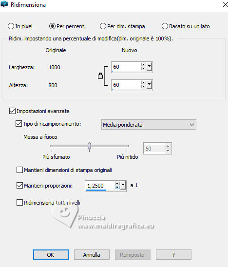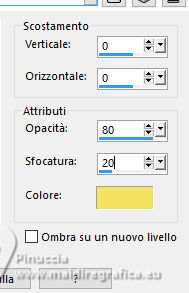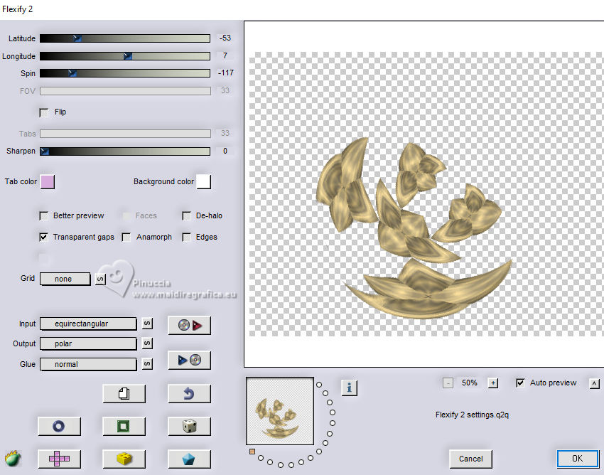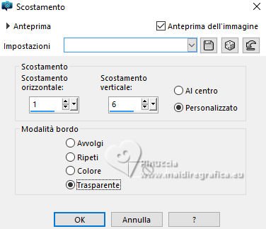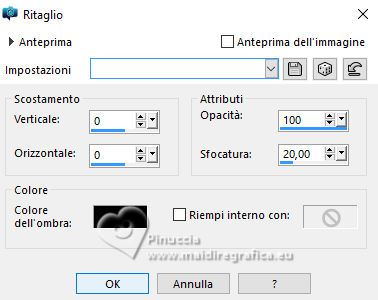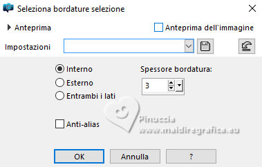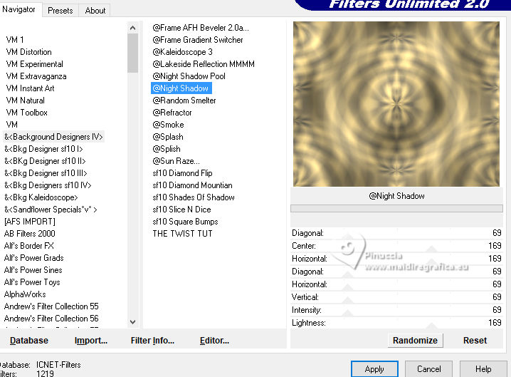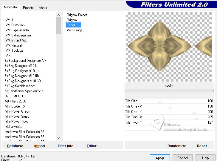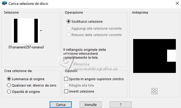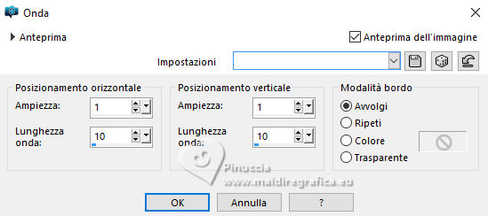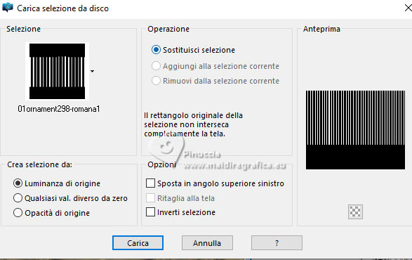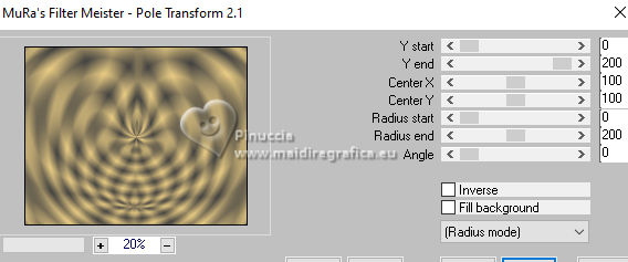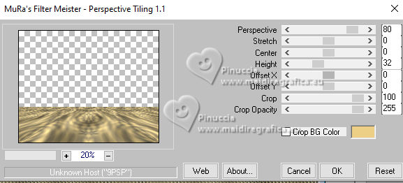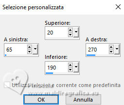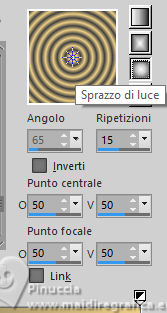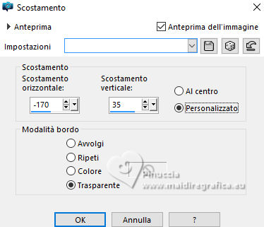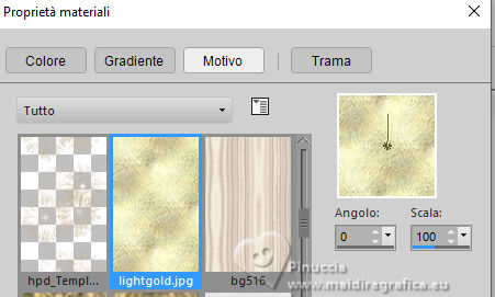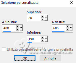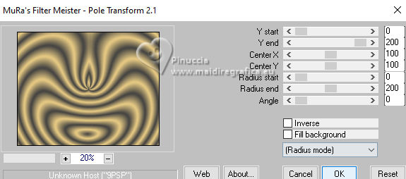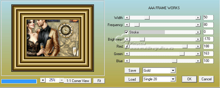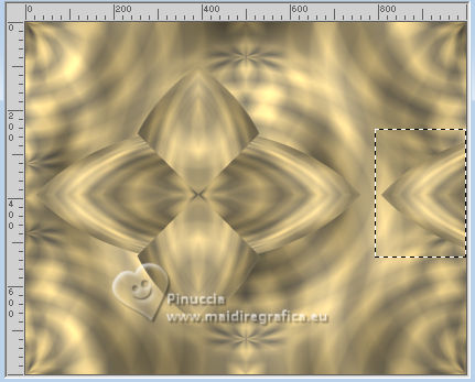 qui puoi trovare qualche risposta ai tuoi dubbi. Se l'argomento che ti interessa non è presente, ti prego di segnalarmelo. Questo tutorial è stato realizzato con PSP2020 e tradotto con PSPX9, ma può essere realizzato anche con le altre versioni di PSP. Dalla versione X4, il comando Immagine>Rifletti è stato sostituito con Immagine>Capovolgi in orizzontale, e il comando Immagine>Capovolgi con Immagine>Capovolgi in verticale. Nelle versioni X5 e X6, le funzioni sono state migliorate rendendo disponibile il menu Oggetti. Con la nuova versione X7, sono tornati Rifletti>Capovolgi, ma con nuove varianti. Vedi la scheda sull'argomento qui Occorrente: Tubes a scelta: 1 tube principale 3 tubes accessori 1 immagine di sfondo Il resto del materiale qui Filtri: in caso di dubbi, ricorda di consultare la mia sezione filtri qui Filters Unlimited 2.0 qui &<Background DesignerIV> - @Night Shadow (da importare in Unlimited) qui VM Instant Art- Tripolis qui Flaming Pear - Flexify 2 qui Mura's Meister - Pole Transform, Perspective Tiling qui AAA Frames - Frame Works qui I filtri VM Instant Art si possono usare da soli o importati in Filters Unlimited (come fare vedi qui) Se un filtro fornito appare con questa icona ![]() non esitare a cambiare modalità di miscelatura e opacità secondo i colori utilizzati. Nelle ultime versioni di PSP non c'è il gradiente di primo piano/sfondo (Corel_06_029) Puoi usare i gradienti delle versioni precedenti. Trovi qui i gradienti Corel X. ![]() Metti le selezioni nella cartella Selezioni. Apri il motivo oro in PSP e minimizzalo con il resto del materiale. 1. Apri una nuova immagine trasparente 1000 x 800 pixels. Scegli due colori dal tuo tube. Per l'esempio: Imposta il colore di primo piano con #404040. e il colore di sfondo con #edcf86. ![]() 2. Passa il colore di primo piano a Gradiente di primo piano/sfondo, stile Sprazzo di luce ![]() Riempi l'immagine trasparente con il gradiente.3. Effetti>Plugins>Mura's Meister - Pole Transform. ![]() Livelli>Duplica. Immagine>Rifletti>Rifletti verticalmente (Immagine>Capovolgi). Abbassa l'opacità di questo livello al 50%. Livelli>Unisci>Unisci giù. 4. Effetti>Plugins>Mura's Meister - Pole Transform, con i settaggi precedenti. ![]() Livelli>Duplica. Immagine>Rifletti>Rifletti verticalmente (Immagine>Capovolgi). Abbassa l'opacità di questo livello al 50%. Livelli>Unisci>Unisci giù. 5. Effetti>Effetti di immagine>Motivo unico, con i settaggi standard. ![]() 6. Effetti>Plugins>Filters Unlimited 2.0 - &<Background Designer IV> - @Night Shadow. ![]() 7. Livelli>Duplica. Immagine>Ridimensiona, al 60%, tutti i livelli non selezionato. ![]() 8. Effetti>Effetti geometrici>Cilindro orizzontale. ![]() 9. Effetti>Effetti di distorsione>Coordinate polari. ![]() 10. Effetti>Plugins>Filters Unlimited 2.0 - VM Instant Art - Tripolis ![]() 11. Selezione>Carica/Salva selezione>Carica selezione da disco. Cerca e carica la selezione 01ornament297-romana1 ![]() ![]() Premi sulla tastiera il tasto CANC ![]() Selezione>Deseleziona. 12. Immagine>Ridimensiona, al 50%, tutti i livelli non selezionato. ![]() 13. Livelli>Duplica. Immagine>Ruota per gradi - 45 gradi a sinistra. ![]() 14. Effetti>Effetti di immagine>Scostamento. ![]() 15. Livelli>Duplica. Immagine>Rifletti>Rifletti verticalmente (Immagine>Capovolgi). Effetti>Effetti di immagine>Scostamento. ![]() Livelli>Unisci>Unisci giù. 16. Livelli>Duplica. Immagine>Rifletti>Rifletti orizzontalmente. Effetti>Effetti di immagine>Scostamento. ![]() Livelli>Unisci>Unisci giù - 2 volte. 17. Effetti>Plugins>Flaming Pear - Flexify 2 ![]() 18. Effetti>Effetti 3D>Sfalsa ombra, colore nero. ![]() 19. Effetti>Effetti di immagine>Scostamento. ![]() Livelli>Duplica. Immagine>Rifletti>Rifletti orizzontalmente. Livelli>Unisci>Unisci giù. 20. Livelli>Nuovo livello raster. Selezione>Carica/Salva selezione>Carica selezione da disco. Cerca e carica la selezione 01ornament298-romana1 ![]() 21. Passa il colore di primo piano a Motivi e seleziona il motivo oro lightgold ![]() Riempi la selezione con il motivo oro.non esitare a ingrandire bene l'immagine per vedere meglio lo spazio da riempire Selezione>Deseleziona. 22. Effetti>Effetti di distorsione>Onda. ![]() 23. Effetti>Effetti 3D>Sfalsa ombra, colore nero. ![]() Livelli>Duplica. Immagine>Rifletti>Rifletti orizzontalmente. Livelli>Unisci>Unisci giù. Livelli>Disponi>Sposta giù. 24. Attiva il livello Raster 1. Livelli>Duplica. Effetti>Plugins>Mura's Meister - Perspective Tiling. ![]() Livelli>Disponi>Porta in alto. 25. Livelli>Nuovo livello raster. Attiva lo strumento Selezione ![]() (non importa il tipo di selezione impostato, perchè con la selezione personalizzata si ottiene sempre un rettangolo) clicca sull'icona Selezione personalizzata ![]() e imposta i seguenti settaggi. ![]() Apri la tua immagine di sfondo e vai a Modifica>Copia. Torna al tuo lavoro e vai a Modifica>Incolla nella selezione. 26. Selezione>Modifica>Seleziona bordature selezione. ![]() Passa il colore di primo piano a Colore. Riempi la selezione con il colore di primo piano.Effetti>Effetti 3D>Sfalsa ombra, colore nero. ![]() Selezione>Deseleziona. Livelli>Duplica. Immagine>Rifletti>Rifletti orizzontalmente. 27. Apri il primo tube accessorio, per me fuochi ![]() Modifica>Copia. Torna al tuo lavoro e vai a Modifica>Incolla come nuovo livello. Immagine>Ridimensiona, se necessario. Regola>Messa a fuoco>Metti a fuoco. Sposta in alto a destra, o a sinistra.Effetti>Effetti 3D>Sfalsa ombra, colore oro ![]() Livelli>Duplica. Immagine>Rifletti>Rifletti orizzontalmente. 28. Livelli>Nuovo livello raster. Selezione personalizzata ![]() ![]() Riempi la selezione con il colore di primo piano.Effetti>Plugins>Filters Unlimited 2.0 - &<Background Designer IV> - @Night Shadow, con i settaggi precedenti. Selezione>Modifica>Seleziona bordature selezione, con i settaggi precedenti. ![]() Imposta nuovamente il colore di primo piano con il motivo oro ![]() Riempi la selezione con il motivo oro.Effetti>Effetti 3D>Sfal