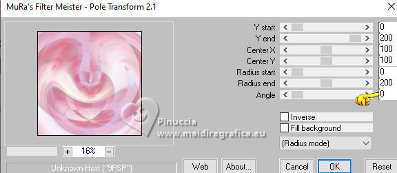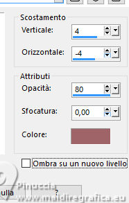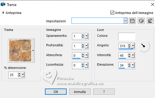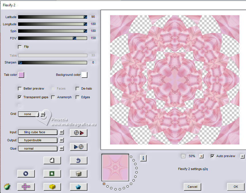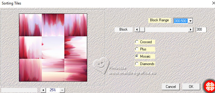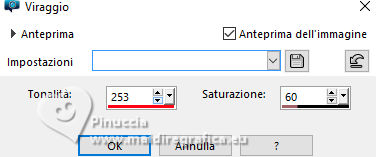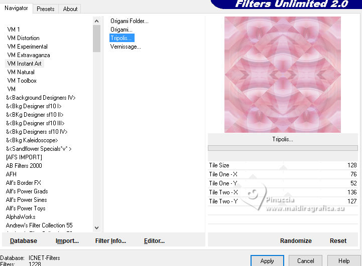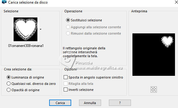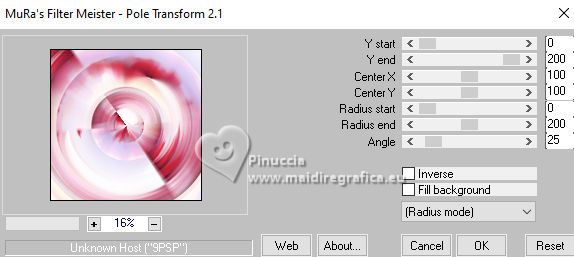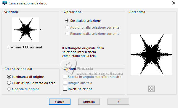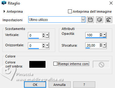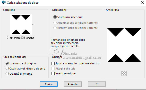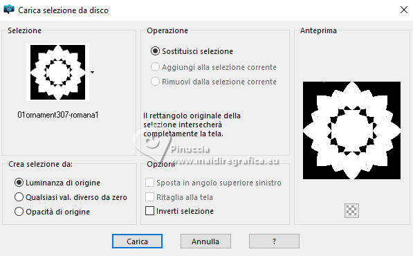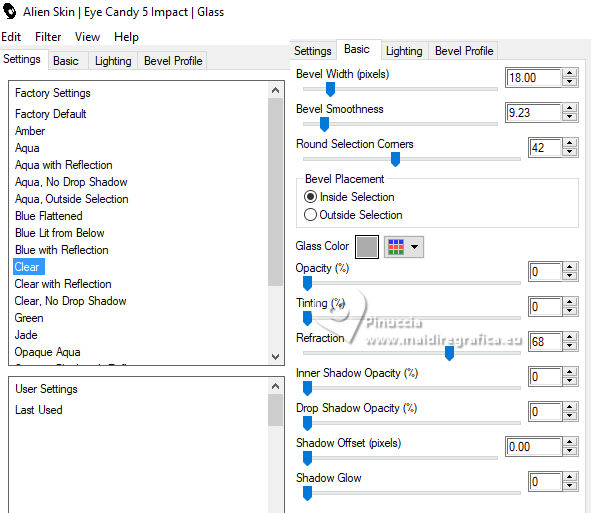 qui puoi trovare qualche risposta ai tuoi dubbi. Se l'argomento che ti interessa non è presente, ti prego di segnalarmelo. Questo tutorial è stato realizzato con PSP2020 e tradotto con PSPX9, ma può essere realizzato anche con le altre versioni di PSP. Dalla versione X4, il comando Immagine>Rifletti è stato sostituito con Immagine>Capovolgi in orizzontale, e il comando Immagine>Capovolgi con Immagine>Capovolgi in verticale. Nelle versioni X5 e X6, le funzioni sono state migliorate rendendo disponibile il menu Oggetti. Con la nuova versione X7, sono tornati Rifletti>Capovolgi, ma con nuove varianti. Vedi la scheda sull'argomento qui Occorrente: 1 tube 1 tube accessorio 1 immagine di sfondo Il resto del materiale ![]() in questa pagina trovi i links ai siti dei creatori di tubes) Filtri: in caso di dubbi, ricorda di consultare la mia sezione filtri qui Filters Unlimited 2.0 qui &<Background Designer IV> - @Frame Gradient Switcher (da importare in Unlimited) qui Mehdi - Sorting Tiles qui Mura's Meister - Pole Transform qui Flaming Pear - Flexify 2 qui VM Instant Art - Tripolis qui Alien Skin Eye Candy 5 Impact - Glass qui I filtri VM Instant Art si possono usare da soli o importati in Filters Unlimited (come fare vedi qui) Se un filtro fornito appare con questa icona ![]() non esitare a cambiare modalità di miscelatura e opacità secondo i colori utilizzati. ![]() Metti trama YWN-Bkgd-006 nella cartella Trame. Metti le selezioni nella cartella Selezioni. 1. Apri una nuova immagine trasparente 900 x 900 pixels. Scegli due colori dal tuo tube. Per l'esempio: Imposta il colore di primo piano con #9f6468. e il colore di sfondo con #e1cbcb. ![]() 2. Selezione>Seleziona tutto. Apri la tua immagine di sfondo e vai a Modifica>Copia. Torna al tuo lavoro e vai a Modifica>Incolla nella selezione. Selezione>Deseleziona. 3. Effetti>Plugins>Mehdi - Sorting Tiles. ![]() 4. Effetti>Effetti di immagine>Motivo unico, con i settaggi standard. ![]() 5. Effetti>Plugins>Mura's Meister - Pole Transform. ![]() Livelli>Duplica. Immagine>Rifletti>Rifletti orizzontalmente. Abbassa l'opacità di questo livello al 50%. Livelli>Unisci>Unisci giù. 6. Livelli>Duplica. Immagine>Ruota per gradi - 90 gradi a sinistra. ![]() Abbassa l'opacità di questo livello al 50%. Livelli>Unisci>Unisci giù. 7. Effetti>Plugins>Mura's Meister - Pole Transform - Angle 0. ![]() 8. Effetti>Effetti di riflesso>Specchio rotante. ![]() Livelli>Duplica. Immagine>Rifletti>Rifletti verticalmente (Immagine>Capovolgi). Abbassa l'opacità di questo livello al 50%. Livelli>Unisci>Unisci giù. 9. Livelli>Duplica. Effetti>Plugins>Filters Unlimited 2.0 - VM Instant Art - Tripolis. ![]() 10. Selezione>Carica/Salva selezione>Carica selezione da disco. Cerca e carica la selezione 01ornament305-romana1 ![]() Selezione>Inverti. Premi sulla tastiera il tasto CANC ![]() Selezione>Deseleziona. 11. Livelli>Duplica. Effetti>Plugins>Flaming Pear - Flexify 2. ![]() 12. Selezione>Carica/Salva selezione>Carica selezione da disco. Cerca e carica la selezione 01ornament306-romana1 ![]() Premi sulla tastiera il tasto CANC ![]() Selezione>Deseleziona. Regola>Metti a fuoco>Accentua messa a fuoco. 13. Effetti>Effetti 3D>Sfalsa ombra, colore nero. ![]() 14. Livelli>Duplica. Immagine>Ruota per gradi - 90 gradi a sinistra. ![]() 15. Attiva il livello Copia di Raster 1. Effetti>Plugins>Flaming Pear - Flexify 2. ![]() 16. Selezione>Carica/Salva selezione>Carica selezione da disco. Cerca e carica la selezione 01ornament307-romana1 ![]() Selezione>Inverti. Premi sulla tastiera il tasto CANC ![]() Selezione>Deseleziona. Regola>Metti a fuoco>Accentua messa a fuoco. Effetti>Effetti 3D>Sfalsa ombra, colore nero. ![]() 17. Livelli>Nuovo livello raster. Selezione>Carica/Salva selezione>Carica selezione da disco. Cerca e carica la selezione 01ornament308-romana1 ![]() Riempi il livello con il colore di sfondo.18. Effetti>Effetti di trama>Trama - seleziona la trama YWN-Bkgd-006 ![]() 19. Effetti>Plugins>Alien Skin Eye Candy 5 Impact - Glass preset Clear con i seguenti settaggi. ![]() Effetti>Effetti 3D>Sfalsa ombra, colore nero. ![]() Selezione>Deseleziona. 20. Attiva lo strumento Testo ![]() Scrivi il tuo testo - io ho scritto Happy Valentin. Posiziona il testo sul cuore.Effetti>Effetti 3D>Sfalsa ombra, colore di primo piano #9f6468. ![]() 21. Apri il tuo tube accessorio e vai a Modifica>Copia. Torna al tuo lavoro e vai a Modifica>Incolla come nuovo livello. Immagine>Ridimensione, se necessario, tutti i livelli non selezionato. Regola>Messa a fuoco>Metti a fuoco. Sposta il tube in basso a destra.Effetti>Effetti 3D>Sfalsa ombra, colore nero. ![]() 22. Apri il tuo tube principale e vai a Modifica>Copia. Torna al tuo lavoro e vai a Modifica>Incolla come nuovo livello. Immagine>Ridimensione, se necessario, tutti i livelli non selezionato. Regola>Messa a fuoco>Metti a fuoco. Sposta il tube a sinistra.Effetti>Effetti 3D>Sfalsa ombra, colore nero. ![]() 23. Selezione>Seleziona tutto. Immagine>Aggiungi bordatura, 50 pixels, simmetriche, colore #9f6468. Selezione>Inverti. Effetti>Plugins>Filters Unilmited 2.0 - &<Background Designer IV> - @Frame Gradient Switcher ![]() 24. Regola>Tonalità e saturazione>Viraggio. ![]() 25. Effetti>Effetti 3D>Ritaglio. ![]() 26. Attiva lo strumento Testo , scegli un font,Scrivi il tuo nome, o aggiungi il tuo watermark. Effetti>Effetti 3D>Sfalsa ombra, a scelta. 27. Livelli>Unisci>Unisci tutto e salva in formato jpg. ![]() Le vostre versioni. Grazie ![]() Se hai problemi o dubbi, o trovi un link non funzionante, o anche soltanto per un saluto, scrivimi. |