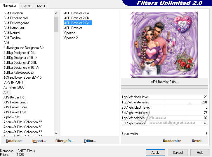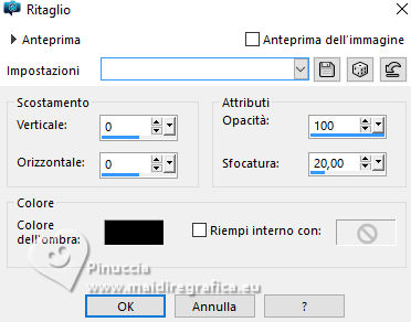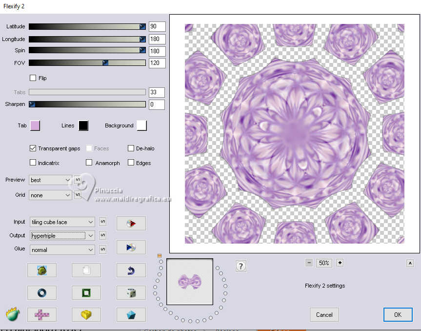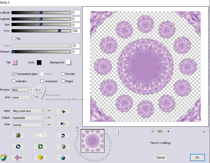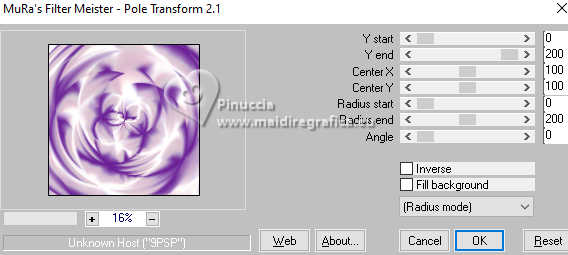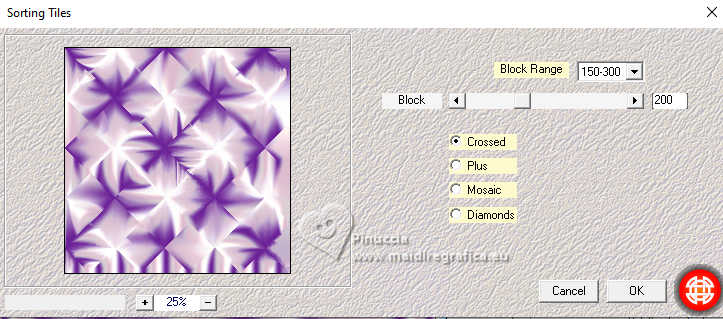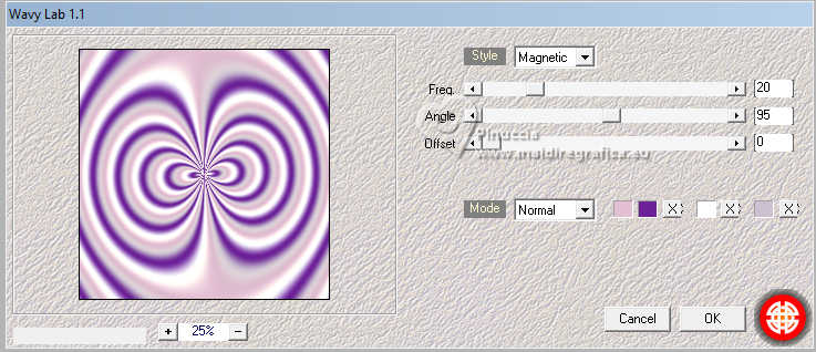 qui puoi trovare qualche risposta ai tuoi dubbi. Se l'argomento che ti interessa non è presente, ti prego di segnalarmelo. Questo tutorial è stato realizzato con PSP2020 e tradotto con PSPX9, ma può essere realizzato anche con le altre versioni di PSP. Dalla versione X4, il comando Immagine>Rifletti è stato sostituito con Immagine>Capovolgi in orizzontale, e il comando Immagine>Capovolgi con Immagine>Capovolgi in verticale. Nelle versioni X5 e X6, le funzioni sono state migliorate rendendo disponibile il menu Oggetti. Con la nuova versione X7, sono tornati Rifletti>Capovolgi, ma con nuove varianti. Vedi la scheda sull'argomento qui Occorrente: 1 tube 3 tubes accessori Il resto del materiale ![]() in questa pagina trovi i links ai siti dei creatori di tubes) Filtri: in caso di dubbi, ricorda di consultare la mia sezione filtri qui Filters Unlimited 2.0 qui Mehdi - Wavy Lab 1.1. qui Mehdi - Sorting Tiles qui Mura's Meister - Pole Transform qui Flaming Pear - Flexify 2 qui AFH - AFH Beveler 2.0c (da importare in Unlimited) qui ![]() non esitare a cambiare modalità di miscelatura e opacità secondo i colori utilizzati. ![]() Metti la selezione nella cartella Selezioni. 1. Apri una nuova immagine trasparente 900 x 900 pixels. Scegli due colori dal tuo tube. Per l'esempio: Imposta il colore di primo piano con #6c2198. e il colore di sfondo con #e2bfd3. ![]() 2. Effetti>Plugins>Mehdi - Wavy Lab 1.1. questo filtro lavora con i colori della paletta: il primo il colore di sfondo, il secondo quello di primo piano; cambia gli ultimi due colori creati dal filtro con due colori del tuo tube; per me colore 3: bianco - colore 4 #cdc0d1 ![]() 3. Effetti>Effetti di immagine>Motivo unico, con i settaggi standard. ![]() 4. Effetti>Plugins>Mehdi - Sorting Tiles ![]() 5. Effetti>Plugins>Mura's Meister - Pole Transform ![]() 6. Effetti>Effetti di riflesso>Specchio rotante ![]() Livelli>Duplica. Immagine>Rifletti>Rifletti verticalmente (Immagine>Capovolgi) Abbassa l'opacità di questo livello al 50%. Livelli>Unisci>Unisci giù. 7. Livelli>Duplica. Immagine>Ruota per gradi - 90 gradi a sinistra ![]() Abbassa l'opacità di questo livello al 50%. Livelli>Unisci>Unisci giù. Modifica>Copia. Modifica>Incolla come nuova immagine e minimizza questa immagine. 8. Livelli>Duplica. Immagine>Ridimensiona, al 65%, tutti i livelli non selezionato. 9. Effetti>Plugins>Flaming Pear - Flexify 2 ![]() 10. Selezione>Carica/Salva selezione>Carica selezione da disco. Cerca e carica la selezione 01ornament302-romana1 ![]() Selezione>Inverti. Premi sulla tastiera il tasto CANC ![]() Selezione>Deseleziona. Regola>Messa a fuoco>Accentua messa a fuoco. 11. Livelli>Duplica. Effetti>Plugins>Flaming Pear - Flexify 2 ![]() Regola>Messa a fuoco>Accentua messa a fuoco. 12. Effetti>Effetti 3D>Sfalsa ombra su entrambi i livelli ![]() 13. Apri il tuo primo tube accessorio e vai a Modifica>Copia. Torna al tuo lavoro e vai a Modifica>Incolla come nuovo livello. Immagine>Ridimensiona, se necessario. Regola>Messa a fuoco>Metti a fuoco. Sposta il tube in basso a destra, o come preferisci.Effetti>Effetti 3D>Sfalsa ombra. ![]() 14. Apri il tuo secondo tube accessorio e vai a Modifica>Copia. Torna al tuo lavoro e vai a Modifica>Incolla come nuovo livello. Immagine>Ridimensiona, se necessario. Regola>Messa a fuoco>Metti a fuoco. Sposta il tube in alto a destra, o come preferisci.Effetti>Effetti 3D>Sfalsa ombra. ![]() 15. Apri il terzo tube accessorio e vai a Modifica>Copia. Torna al tuo lavoro e vai a Modifica>Incolla come nuovo livello. Immagine>Ridimensiona, se necessario. Regola>Messa a fuoco>Metti a fuoco. Sposta il tube al centro, o come preferisci.Effetti>Effetti 3D>Sfalsa ombra. ![]() 16. Apri il tube principale e vai a Modifica>Copia. Torna al tuo lavoro e vai a Modifica>Incolla come nuovo livello. Immagine>Ridimensiona, se necessario. Regola>Messa a fuoco>Metti a fuoco. Sposta il tube a sinistra, o come preferisci.Effetti>Effetti 3D>Sfalsa ombra. ![]() 17. Selezione>Seleziona tutto. Immagine>Aggiungi bordatura, 50 pixels, simmetriche, colore #ffffff Selezione>Inverti. Attiva l'immagine di sfondo che hai minimizzato al punto 7 e vai a Modifica>Copia. Torna al tuo lavoro e vai a Modifica>Incolla nella selezione. Effetti>Plugins>Filters Unlimited 2.0 - AFH - AFH Beverler 2.0c ![]() 18. Effetti>Effetti 3D>Ritaglio. ![]() Selezione>Inverti. Ripeti Effetti>Effetti 3D>Ritaglio. ![]() Selezione>Deseleziona. 19. Attiva lo strumento Testo ![]() scrivi il tuo nome, o aggiungi il tuo watermark. Effetti>Effetti 3D>Sfalsa ombra, a scelta. 20. Livelli>Unisci>Unisci tutto e salva in formato jpg. ![]() Le vostre versioni. Grazie ![]() Se hai problemi o dubbi, o trovi un link non funzionante, o anche soltanto per un saluto, scrivimi. |