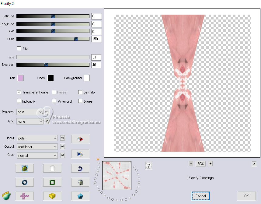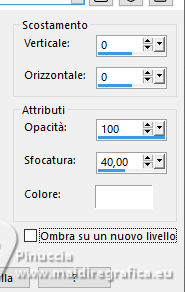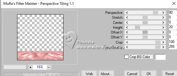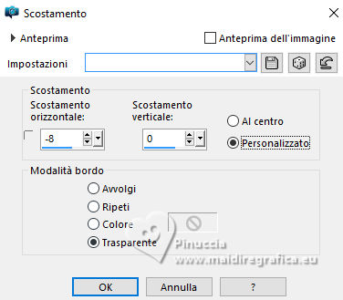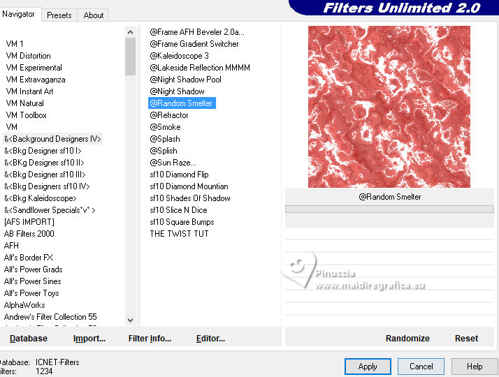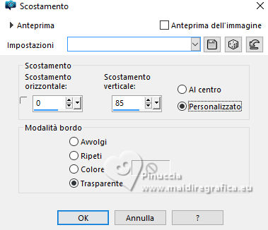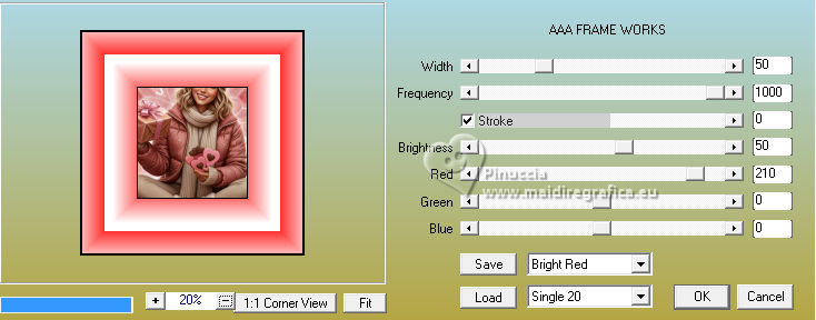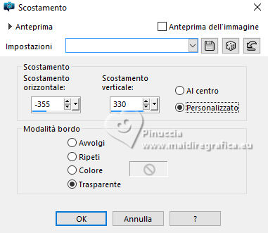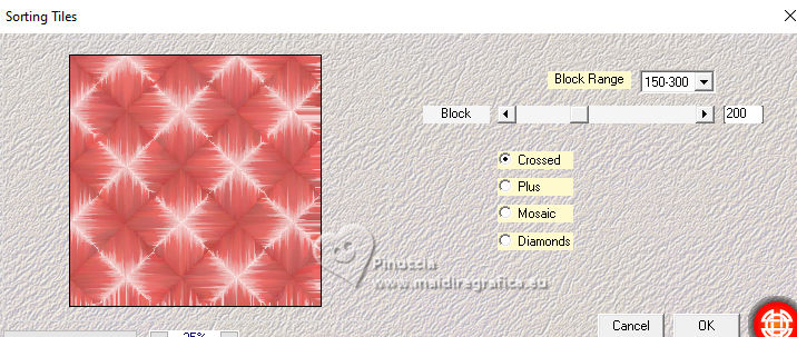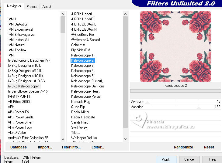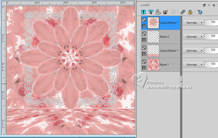 qui puoi trovare qualche risposta ai tuoi dubbi. Se l'argomento che ti interessa non è presente, ti prego di segnalarmelo. Questo tutorial è stato realizzato con PSP2020 e tradotto con PSPX9, ma può essere realizzato anche con le altre versioni di PSP. Dalla versione X4, il comando Immagine>Rifletti è stato sostituito con Immagine>Capovolgi in orizzontale, e il comando Immagine>Capovolgi con Immagine>Capovolgi in verticale. Nelle versioni X5 e X6, le funzioni sono state migliorate rendendo disponibile il menu Oggetti. Con la nuova versione X7, sono tornati Rifletti>Capovolgi, ma con nuove varianti. Vedi la scheda sull'argomento qui Occorrente: 1 tube 1 immagine di sfondo 1 tube accessorio Il resto del materiale ![]() Per il mio esempio ho usato elementi scrap Additive Pleasure, che ringrazio. in questa pagina trovi i links ai siti dei creatori di tubes) Filtri: in caso di dubbi, ricorda di consultare la mia sezione filtri qui Filters Unlimited 2.0 qui &<Background Designers IV> - @Random Smelter (da importare in Unlimited) qui &<Bkg Kaleidoscope> - Kaleidoscope 2 (da importare in Unlimited) qui Mura's Meister - Perspective Tiling qui Flaming Pear - Flexify 2 qui AAA Frames - Frame Works qui Mehdi - Sorting Tiles qui VM Instant Art - Tripolis qui Alien Skin Eye Candy 5 Textures - Stone Wall qui I filtri VM Instant Art si possono usare da soli o importati in Filters Unlimited (come fare vedi qui) Se un filtro fornito appare con questa icona ![]() non esitare a cambiare modalità di miscelatura e opacità secondo i colori utilizzati. ![]() Metti la selezione nella cartella Selezioni. Apri la maschera e il motivo argento in PSP e minimizzali con il resto del materiale. 1. Apri una nuova immagine trasparente 900 x 900 pixels. Scegli due colori dal tuo tube, per l'esempio colore di primo piano #b73b37 colore di sfondo #ffffff ![]() 2. Selezione>Seleziona tutto.br> Apri la tua immagine di sfondo e vai a Modifica>Copia. Torna al tuo lavoro e vai a Modifica>Incolla nella selezione. Selezione>Deseleziona. 3. Efftti>Plugins>Filters Unlimited 2.0 - &<Bkg Kaleidoscope> - Kaleidoscope 2, con i settaggi standard ![]() 4. Livelli>Nuovo livello raster. Riempi il livello con il colore di primo piano.Effetti>Plugins>Alien Skin Eye Candy 5 Textures - Stone Wall Preset: Stone Patio - stone color: colore di primo piano - mortar color: bianco ![]() 5. Effetti>Plugins>Mehdi - Sorting Tiles. ![]() 6. Effetti>Plugins>Filters Unlimited 2.0 - &<Background Designers IV> - @Random Smelter ![]() Abbassa l'opacità di questo livello al 50%. Livelli>Unisci>Unisci giù. 7. Effetti>Effetti di immagine>Motivo unico, con i settaggi standard. ![]() 8. Livelli>Duplica. Immagine>Ridimensiona, al 50%, tutti i livelli non selezionato. ![]() 9. Effetti>Plugins>Filters Unlimited 2.0 - VM Instant Art - Tripolis. ![]() 10. Effetti>Plugins>Flaming pear - Flexify 2. ![]() 11. Livelli>Duplica. Immagine>Ruota per gradi - 90 gradi a destra. ![]() Livelli>Unisci>Unisci giù. 12. Effetti>Effetti di immagine>Scostamento. ![]() 13. Effetti>Effetti geometrici>Cerchio. ![]() 14. Livelli>Duplica. Immagine>Ruota per gradi - 45 gradi a destra. ![]() Livelli>Unisci>Unisci giù. 15. Livelli>Duplica. Immagine>Ruota per gradi - 23 gradi a destra. ![]() 16. Attiva il livello sottostante. Immagine>Ridimensiona, all'80%, tutti i livelli non selezionato. ![]() Regola>Messa a fuoco>Accentua messa a fuoco. 17. Effetti>Effetti 3D>Sfalsa ombra, colore bianco. ![]() 18.Attiva il livello superiore. Immagine>Ridimensiona, al 55%, tutti i livelli non selezionato. ![]() Effetti>Effetti 3D>Sfalsa ombra, con i settaggi precedenti. ![]() Regola>Messa a fuoco>Accentua messa a fuoco. Livelli>Unisci>Unisci giù. 19. Effetti>Effetti di immagine>Scostamento. ![]() 20. Attiva illivello inferiore, Raster 1. Livelli>Duplica. Effetti>Plugins>Mura's Meister - Perspective Tiling. ![]() Effetti>Effetti 3D>Sfalsa ombra, colore bianco. ![]() 21. Livelli>Nuovo livello raster. Selezione>Carica/Salva selezione>Carica selezione da disco. Cerca e carica la selezione 01ornament319-romana1 ![]() 22. Passa il colore di primo piano a Motivo e seleziona il motivo argento silver(62) ![]() Riempi la selezione con il motivo argentoSelezione>Deseleziona. 23. Effetti>Effetti 3D>Sfalsa ombra, colore bianco. ![]() 24. Attiva il livello superiore, Copia di Raster 1. ![]() Livelli>Duplica. Immagine>Ridimensiona, al 25%, tutti i livelli non selezionato. ![]() Regola>Messa a fuoco>Accentua messa a fuoco. Effetti>Effetti 3D>Sfalsa ombra, colore bianco. ![]() 25. Effetti>Effetti di immagine>Scostamento. ![]() Livelli>Duplica. Immagine>Rifletti>Rifletti orizzontalmente. Livelli>Unisci>Unisci giù. 26. Livelli>Duplica. Effetti>Effetti di immagine>Scostamento. ![]() 27. Apri il tuo tube principale vai a Modifica>Copia. Torna al tuo lavoro e vai a Modifica>Incolla come nuovo livello. Immagine>Ridimensiona, se necessario. Regola>Messa a fuoco>Metti a fuoco. Posiziona il tube al centro.Effetti>Effetti 3D>Sfalsa ombra, colore bianco. ![]() 28. Apri il tuo tube accessorio vai a Modifica>Copia. Torna al tuo lavoro e vai a Modifica>Incolla come nuovo livello. Immagine>Ridimensiona, se necessario. Regola>Messa a fuoco>Metti a fuoco. Posiziona il tube a destra.Effetti>Effetti 3D>Sfalsa ombra, colore bianco. ![]() Livelli>Duplica. Immagine>Rifletti>Rifletti orizzontalmente. 29. Selezione>Seleziona tutto. Immagine>Aggiungi bordatura, 50 pixels, simmetriche, colore #ffffff. Selezione>Inverti. Effetti>Plugins>AAA Frames - Frame Works ![]() Selezione>Deseleziona. 30. Attiva lo strumento Testo ![]() Scrivi il tuo nome o il tuo watermark. Effetti>Effetti 3D>Sfalsa ombra, a scelta. 31. Livelli>Unisci>Unisci tutto e salva in formato jpg. Elementi scrap di Ai Edie's Way!, che ringrazio ![]() ![]() Le vostre versioni. Grazie ![]() Se hai problemi o dubbi, o trovi un link non funzionante, o anche soltanto per un saluto, scrivimi. |