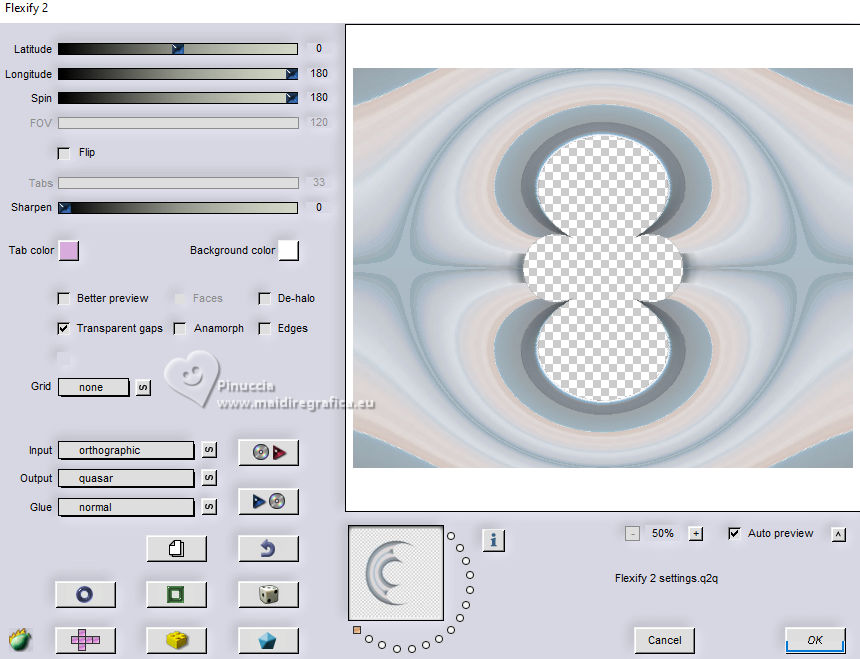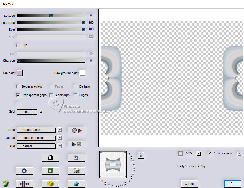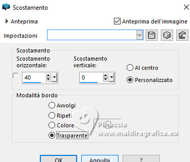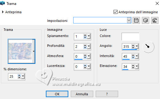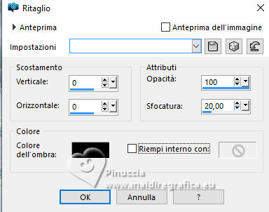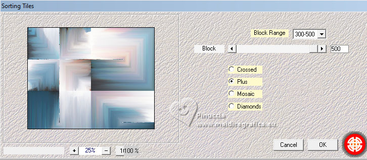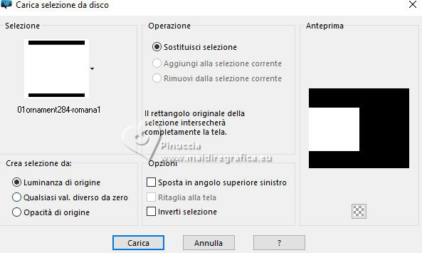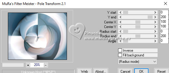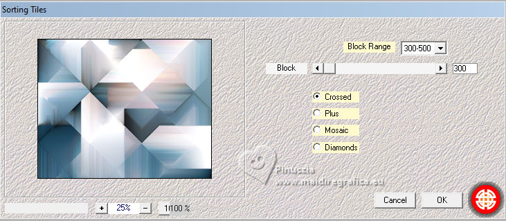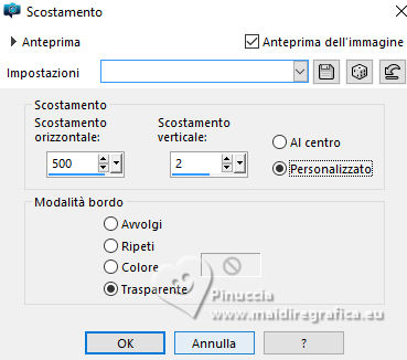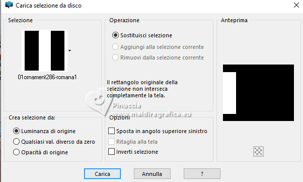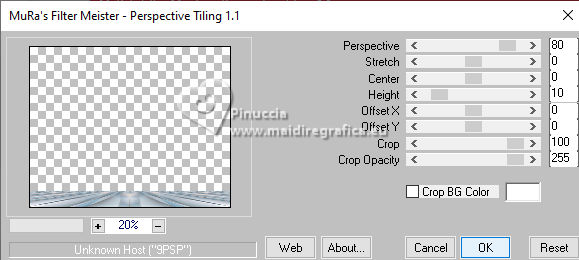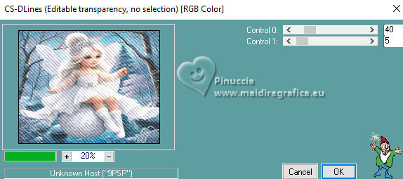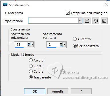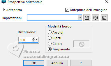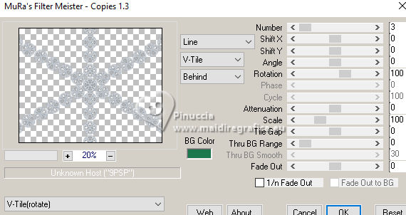 qui puoi trovare qualche risposta ai tuoi dubbi. Se l'argomento che ti interessa non è presente, ti prego di segnalarmelo. Questo tutorial è stato realizzato con PSP2020 e tradotto con PSPX9, ma può essere realizzato anche con le altre versioni di PSP. Dalla versione X4, il comando Immagine>Rifletti è stato sostituito con Immagine>Capovolgi in orizzontale, e il comando Immagine>Capovolgi con Immagine>Capovolgi in verticale. Nelle versioni X5 e X6, le funzioni sono state migliorate rendendo disponibile il menu Oggetti. Con la nuova versione X7, sono tornati Rifletti>Capovolgi, ma con nuove varianti. Vedi la scheda sull'argomento qui Occorrente: Tubes a scelta: 1 immagine di sfondo 1 tube principale 2 tubes accessori Il resto del materiale qui Esempi con miei tubes da immagini Pinterest Filtri: in caso di dubbi, ricorda di consultare la mia sezione filtri qui Filters Unlimited 2.0 qui Carolaine and Sensibility - CS-DLines, CS-LDots qui Mehdi - Sorting Tiles qui Flaming Pear - Flexify 2 qui Mura's Meister - Pole Transform, Copies, Perspective Tiling qui AAA Frames - Texture Frame qui ![]() non esitare a cambiare modalità di miscelatura e opacità secondo i colori utilizzati. ![]() Metti la trama misc 335 nella cartella Trame. Metti le selezioni nella cartella Selezioni. 1. Apri una nuova immagine trasparente 1000 x 800 pixels. Scegli due colori dal tuo tube. Imposta il colore di primo piano con #4376a1 e il colore di sfondo con il colore bianco #ffffff. ![]() 2. Selezione>Seleziona tutto. Apri la tua immagine di sfondo e vai a Modifica>Copia. Torna al tuo lavoro e vai a Modifica>Incolla nella selezione. Apri il tube principale e vai a Modifica>Copia. Torna al tuo lavoro e vai a Modifica>Incolla nella selezione. Selezione>Deseleziona. 3. Effetti>Plugins>Carolaine and Sensibility - CS-DLines ![]() 4. Effetti>Plugins>Carolaine and Sensibility - CS-LDots ![]() 5. Effetti>Plugins>Mehdi - Sorting Tiles ![]() 6. Effetti>Plugins>Mehdi - Sorting Tiles ![]() 7. Effetti>Plugins>Mura's Meister - Pole Transform. ![]() 8. Effetti>Effetti di riflesso>Specchio rotante. ![]() Livelli>Duplica. Immagine>Rifletti>Rifletti verticalmente (Immagine>Capovolgi). Abbassa l'opacità di questo livello al 50%. Livelli>Unisci>Unisci giù. 9. Effetti>Effetti di immagine>Motivo unico, con i settaggi standard. ![]() 10. Livelli>Duplica. Effetti>Effetti geometrici>Prospettiva orizzontale. ![]() Livelli>Duplica. Immagine>Rifletti>Rifletti orizzontalmente. 11. Selezione>Carica/Salva selezione>Carica selezione da disco. Cerca e carica la selezione 01ornament284-romana1 ![]() Premi sulla tastiera il tasto CANC ![]() Selezione>Deseleziona. Livelli>Unisci>Unisci giù. 12. Effetti>Effetti geometrici>Cilindro verticale. ![]() 13. Immagine>Ridimensiona, al 60%, tutti i livelli non selezionato. 14. Effetti>Plugins>Flaming Pear - Flexify 2 ![]() 15. Selezione>Carica/Salva selezione>Carica selezione da disco. Cerca e carica la selezione 01ornament285-romana1 ![]() Selezione>Inverti. Premi sulla tastiera il tasto CANC. Selezione>Deseleziona. 16. Effetti>Plugins>Flaming Pear - Flexify 2 ![]() 17. Selezione>Carica/Salva selezione>Carica selezione da disco. Cerca e carica la selezione 01ornament286-romana1 ![]() Modifica>Taglia. Selezione>Deselezione. Modifica>Incolla come nuovo livello. 18. Immagine>Rifletti>Rifletti orizzontalmente. Effetti>Effetti di immagine>Scostamento. ![]() 19. Attiva il livello sottostante. Immagine>Rifletti>Rifletti orizzontalmente. Effetti>Effetti di immagine>Scostamento. ![]() Attiva il livello superiore. Livelli>Unisci>Unisci giù. 20. Effetti>Plugins>Flaming Pear - Flexify 2 ![]() 21. Effetti>Effetti di immagine>Scostamento. ![]() Livelli>Duplica. Immagine>Rifletti>Rifletti orizzontalmente. Livelli>Unisci>Unisci giù. 22. Livelli>Duplica. Immagine>Ruota per gradi - 90 gradi a sinistra. ![]() Livelli>Unisci>Unisci giù. 23. Livelli>Duplica. Immagine>Ridimensiona, al 15%, tutti i livelli non selezionato. 24. Attiva il livello sottostante. Effetti>Effetti 3D>Sfalsa ombra, colore nero. ![]() 25. Attiva il livello superiore. Effetti>Plugins>Mura's Meister - Copies ![]() 26. Effetti>Effetti 3D>Sfalsa ombra, colore nero. ![]() 27. Attiva il livello inferiore, Raster 1. Livelli>Duplica. Effetti>Plugins>Mura's Meister - Perspective Tiling. ![]() Livelli>Disponi>Porta in alto. Effetti>Effetti 3D>Sfalsa ombra, colore nero. ![]() 28. Livelli>Nuovo livello raster. Selezione>Seleziona tutto. Apri un tube con la neve e vai a Modifica>Copia. Torna al tuo lavoro e vai a Modifica>Incolla nella selezione. Selezione>Deseleziona. Effetti>Effetti 3D>Sfalsa ombra, colore bianco. ![]() 29. Apri il tuo tube accessorio (gufi). Modifica>Copia. Torna al tuo lavoro e vai a Modifica>Incolla come nuovo livello. Immagine>Ridimensiona, se necessario. Regola>Messa a fuoco>Metti a fuoco. Sposta il tube in alto a destra.Effetti>Effetti 3D>Sfalsa ombra, colore nero. ![]() 30. Apri il tuo secondo tube accessorio (pupazzo di neve) Modifica>Copia. Torna al tuo lavoro e vai a Modifica>Incolla come nuovo livello. Immagine>Ridimensiona, se necessario. Regola>Messa a fuoco>Metti a fuoco. Sposta il tube in basso a destra.Effetti>Effetti 3D>Sfalsa ombra, colore nero. ![]() 31. Apri il testo ![]() Modifica>Copia. Torna al tuo lavoro e vai a Modifica>Incolla come nuovo livello. Se preferisci, scrivi un tuo testo con un font a scelta. Effetti>Effetti 3D>Sfalsa ombra, a scelta. 32. Selezione>Seleziona tutto. Immagine>Aggiungi bordatura, 50 pixels, simmetriche, colore #ffffff. Selezione>Inverti. Effetti>Plugins>AAA Frames - Frame Works. ![]() 33. Effetti>Effetti di trama>Trama - trama misc335 ![]() 34. Selezione>Inverti. Effetti>Effetti 3D>Ritaglio. ![]() 35. Apri il tube principale e vai a Modifica>Copia. Torna al tuo lavoro e vai a Modifica>Incolla come nuovo livello. Immagine>Ridimensiona, se necessario. Regola>Messa a fuoco>Metti a fuoco. Sposta il tube a sinistra.Effetti>Effetti 3D>Sfalsa ombra, colore nero. ![]() 36. Attiva lo strumento Testo , sceg