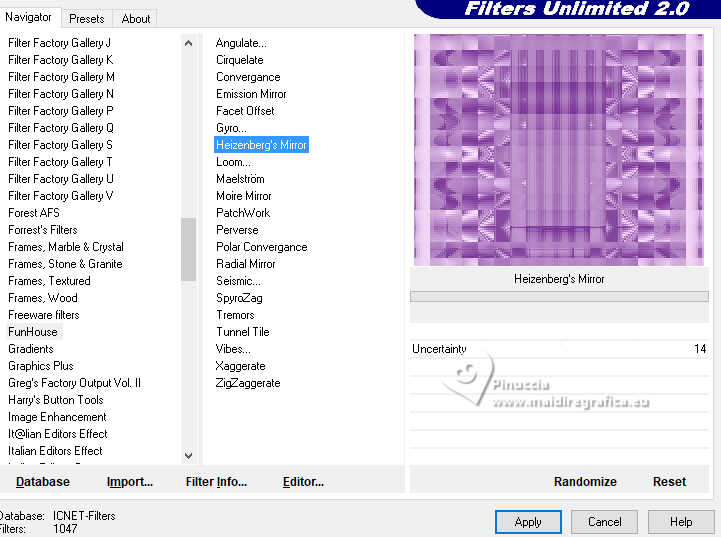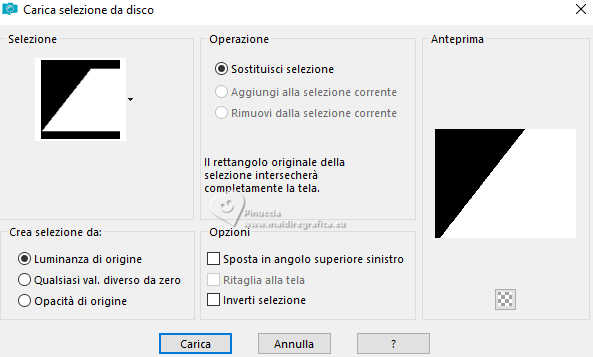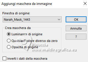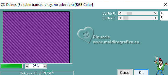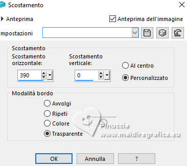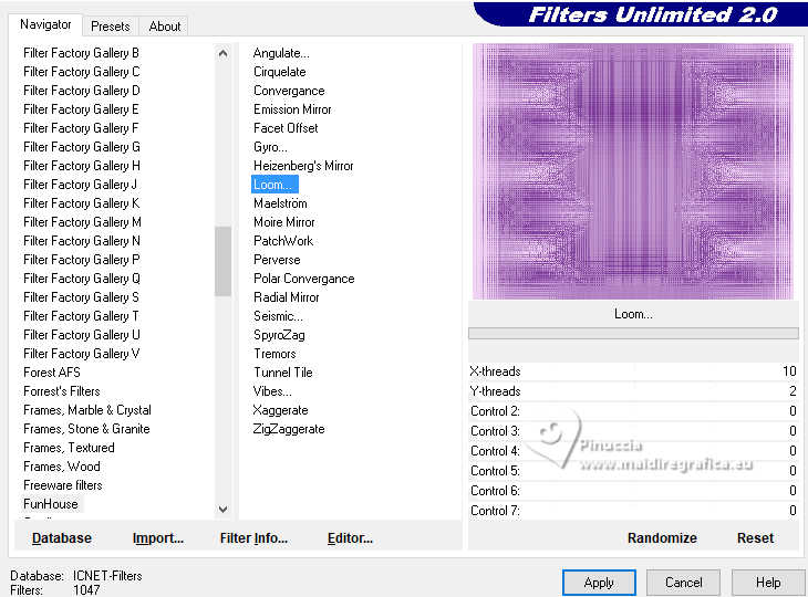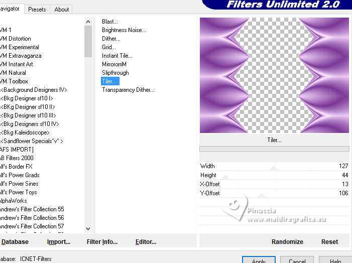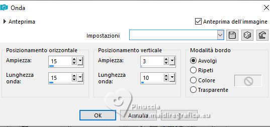 qui puoi trovare qualche risposta ai tuoi dubbi. Se l'argomento che ti interessa non è presente, ti prego di segnalarmelo. Questo tutorial è stato realizzato con PSP2020 e tradotto con PSPX9, ma può essere realizzato anche con le altre versioni di PSP. Dalla versione X4, il comando Immagine>Rifletti è stato sostituito con Immagine>Capovolgi in orizzontale, e il comando Immagine>Capovolgi con Immagine>Capovolgi in verticale. Nelle versioni X5 e X6, le funzioni sono state migliorate rendendo disponibile il menu Oggetti. Con la nuova versione X7, sono tornati Rifletti>Capovolgi, ma con nuove varianti. Vedi la scheda sull'argomento qui Occorrente: Tubes a scelta: 1 tube principale Il resto del materiale qui Per i miei esempi ho usato tubes di My Tagging Addiction. Grazie Per la maschera grazie Narah (in questa pagina trovi i links ai siti dei creatori di tubes) Filtri: in caso di dubbi, ricorda di consultare la mia sezione filtri qui Filters Unlimited 2.0 qui Funhouse - Heizenberger's Mirror qui Funhouse - Loom qui VM Toolbox - Tiler qui Carolaine and Sensibility - CS-DLines qui I filtri Funhouse e VM Toolbox si possono usare da soli o importati in Filters Unlimited (come fare vedi qui) Se un filtro fornito appare con questa icona ![]() non esitare a cambiare modalità di miscelatura e opacità secondo i colori utilizzati. Nelle ultime versioni di PSP non c'è il gradiente di primo piano/sfondo (Corel_06_029) Puoi usare i gradienti delle versioni precedenti. Trovi qui i gradienti Corel X. ![]() Metti le selezioni nella cartella Selezioni. Apri la maschera in PSP e minimizzala con il resto del materiale. 1. Apri una nuova immagine trasparente 900 x 700 pixels. Scegli due colori dal tuo tube Per l'esempio: Imposta il colore di primo piano con #621f7e, e il colore di sfondo con #f0d5f4 ![]() 2. Riempi l'immagine trasparente con il colore di primo piano.Effetti>Plugins>Carolaine and Sensibility - CS-DLines ![]() 3. Livelli>Nuovo livello raster. Riempi il livello con il colore di sfondo.Livelli>Nuovo livello maschera>Da immagine Apri il menu sotto la finestra di origine e vedrai la lista dei files aperti. Seleziona la maschera Narah_Mask_1443 ![]() Livelli>Unisci>Unisci gruppo. Livelli>Unisci>Unisci giù. 4. Passa il colore di primo piano a Gradiente di primo piano/sfondo, stile Sprazzo di luce. ![]() Livelli>Nuovo livello raster. Riempi il livello con il gradiente.5. Rimani su questo livello. Selezione>Carica/Salva selezione>Carica selezione da disco Cerca e carica la selezione 01ornament88-romana1 ![]() Premi sulla tastiera il tasto CANC ![]() Selezione>Deseleziona. Livelli>Duplica. Immagine>Rifletti>Rifletti orizzontalmente (Immagine>Rifletti) Immagine>Rifletti>Rifletti verticalmente (Immagine>Capovolgi). Livelli>Unisci>Unisci giù. 6. Effetti>Effetti di immagine>Motivo unico. ![]() Effetti>Plugins>Carolaine and Sensibility - CS-DLines, con i settaggi precedenti ![]() 7. Effetti>Effetti 3D>Sfalsa ombra, colore chiaro di sfondo. ![]() 8. Effetti>Plugins>Filters Unlimited 2.0 - VM Toolbox - Tiler. ![]() 9. Effetti>Effetti 3D>Sfalsa ombra, colore scuro di primo piano. ![]() 10. Livelli>Nuovo livello raster. Selezione>Carica/Salva selezione>Carica selezione da disco Cerca e carica la selezione 01ornament60-romana1 ![]() Riempi la selezione con il colore di sfondo.Selezione>Deseleziona. 11. Effetti>Effetti di distorsione>Onda. ![]() 12. Immagine>Ruota per gradi - 90 gradi a destra. ![]() 13. Effetti>Effetti di immagine>Scostamento. ![]() 14. Effetti>Effetti 3D>Sfalsa ombra, colore scuro di primo piano. ![]() Livelli>Duplica. Immagine>Rifletti>Rifletti orizzontalmente (Immagine>Rifletti). 15. Immagine>Aggiungi bordatura, 1 pixel, simmetriche, colore di primo piano #621f7e. Selezione>Seleziona tutto. Immagine>Aggiungi bordatura, 50 pixels, simmetriche, colore di sfondo #f0d5f4. 16. Effetti>Effetti di immagine>Motivo unico, con i settaggi standard. ![]() 17. Selezione>Inverti. Regola>Sfocatura>Sfocatura gaussiana - raggio 15. ![]() 18. Effetti>Plugins>Filters Unlimited 2.0 - Funhouse - Heizenberger's Mirror. ![]() 19. Effetti>Plugins>Filters Unlimited 2.0 - Funhouse - Loom. ![]() 20. Selezione>Inverti. Effetti>Effetti 3D>Sfalsa ombra, colore nero. ![]() Selezione>Deseleziona. 21. Apri il tuo tube e vai a Modifica>Copia. Torna al tuo lavoro e vai a Modifica>Incolla come nuovo livello. Immagine>Ridimensiona, quanto necessario, tutti i livelli non selezionato. Regola>Messa a fuoco>Metti a fuoco. Posiziona il tube al centro.Effetti>Effetti 3D>Sfalsa ombra, colore nero. ![]() 22. Attiva lo strumento Testo ![]() Scrivi il tuo nome o, se preferisci, aggiungi il tuo watermark. Effetti>Effetti 3D>Sfalsa ombra, a scelta. 23. Immagine>Aggiungi bordatura, 1 pixel, simmetriche, colore di primo piano #621f7e. Salva in formato jpg. ![]() ![]() Se hai problemi o dubbi, o trovi un link non funzionante, o anche soltanto per un saluto, scrivimi. 28 Gennaio 2025 |