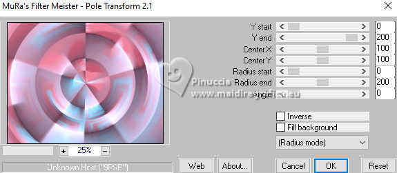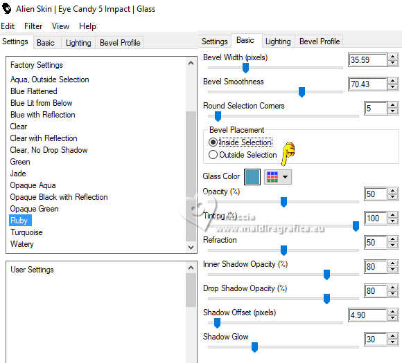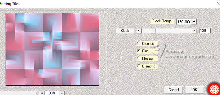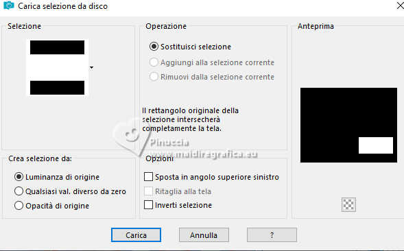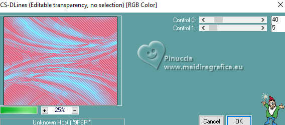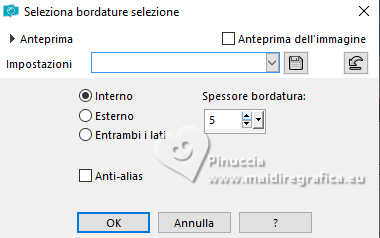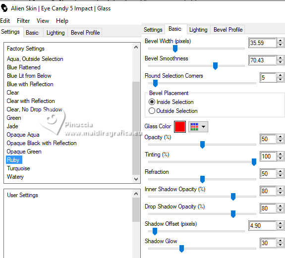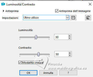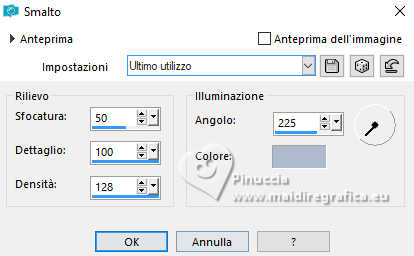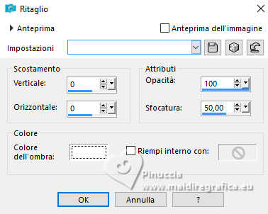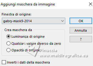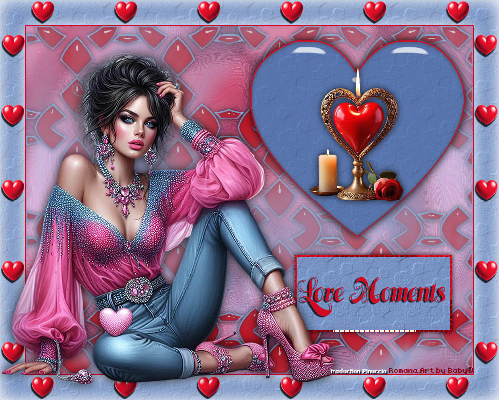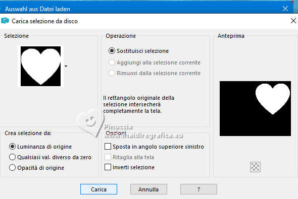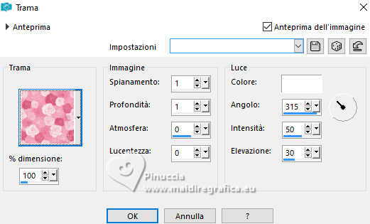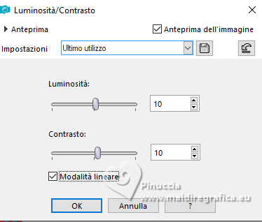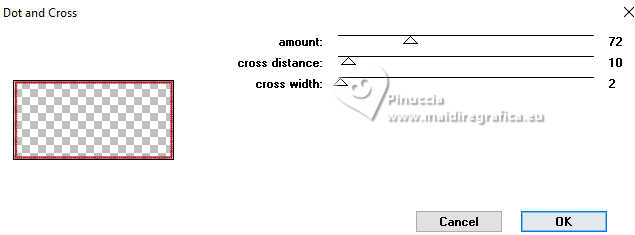 qui puoi trovare qualche risposta ai tuoi dubbi. Se l'argomento che ti interessa non è presente, ti prego di segnalarmelo. Questo tutorial è stato realizzato con PSP2020 e tradotto con PSPX9, ma può essere realizzato anche con le altre versioni di PSP. Dalla versione X4, il comando Immagine>Rifletti è stato sostituito con Immagine>Capovolgi in orizzontale, e il comando Immagine>Capovolgi con Immagine>Capovolgi in verticale. Nelle versioni X5 e X6, le funzioni sono state migliorate rendendo disponibile il menu Oggetti. Con la nuova versione X7, sono tornati Rifletti>Capovolgi, ma con nuove varianti. Vedi la scheda sull'argomento qui Occorrente: Tubes a scelta: 1 tube principale 1 tube accessorio Il resto del materiale qui Per i tubes usati grazie AigenbyCaz. Per le maschere grazie Gabry. (in questa pagina trovi i links ai siti dei creatori di tubes) Filtri: in caso di dubbi, ricorda di consultare la mia sezione filtri qui Filters Unlimited 2.0 qui Mehdi - Sorting Tiles qui Mura's Meister - Pole Transform qui Penta.com - Dot and Cross qui Alien Skin Eye Candy 5 Impact - Glass qui Carolaine and Sensibility - CS-DLines qui I filtri Penta.com si possono usare da soli o importati in Filters Unlimited (come fare vedi qui) Se un filtro fornito appare con questa icona ![]() non esitare a cambiare modalità di miscelatura e opacità secondo i colori utilizzati. ![]() Metti le selezioni nella cartella Selezioni. Metti la trama nella cartella trame. Apri le maschere in PSP e minimizzale con il resto del materiale. 1. Apri una nuova immagine trasparente 900 x 700 pixels. Scegli due colori dal tuo tube Per l'esempio: Imposta il colore di primo piano con #ba1e29, e il colore di sfondo con #4d9cbb ![]() Riempi l'immagine trasparente con il colore di sfondo.2. Livelli>Nuovo livello raster. Riempi il livello con il colore di primo piano.Livelli>Nuovo livello maschera>Da immagine. Apri il menu sotto la finestra di origine e vedrai la lista dei files aperti. Seleziona la maschera Gabry-Mask-10942 ![]() Livelli>Unisci>Unisci gruppo. 3. Eventualmente, se l'immagine ti sembra troppo scura: Regola>Luminosità e contrasto>Luminosità e contrasto ![]() 4. Effetti>Plugins>Carolaine and Sensibility - CS-DLines ![]() 5. Effetti>Plugins>Mehdi - Sorting Tiles. ![]() 6. Effetti>Plugins>Mura's Meister - Pole Transform. ![]() 7. Effetti>Effetti artistici>Smalto - per il mio esempio colore #b6bec9. ![]() 8. Livelli>Nuovo livello raster. Selezione>Carica/Salva selezione>Carica selezione da disco. Cerca e carica la selezione 01ornament83-romana1 ![]() Riempi la selezione con il colore di sfondo.Selezione>Modifica>Contrai - 3 pixels. Riempi la selezione con il colore di primo piano.9. Effetti>Plugins>Alien Skin Eye Candy 5 Impact - Glass Glass Color: colore di primo piano. ![]() Selezione>Deseleziona. 10. Effetti>Effetti 3D>Sfalsa ombra, colore nero. ![]() 11. Eventualmente, se l'immagine ti sembra troppo scura: Regola>Luminosità e contrasto>Luminosità e contrasto ![]() 12. Livelli>Nuovo livello raster. Riempi il livello con il colore di sfondo.Livelli>Nuovo livello maschera>Da immagine. Apri il menu sotto la finestra di origine e seleziona la maschera Gabry-Mask-2014 ![]() Livelli>Unisci>Unisci gruppo. 13. Effetti>Effetti 3D>Sfalsa ombra, colore bianco. ![]() 14. Livelli>Nuovo livello raster. Selezione>Carica/Salva selezione>Carica selezione da disco. Cerca e carica la selezione 01ornament84-romana1 ![]() Riempi la selezione con il colore di primo piano.Selezione>Modifica>Contrai - 3 pixels. Riempi la selezione con il colore di sfondo.15. Effetti>Effetti di trama>Trama - seleziona la trama pink flora 1B ![]() 16. Effetti>Plugins>Alien Skin Eye Candy 5 Impact - Glass, con i settaggi precedenti, ma Glass Color colore di sfondo. ![]() Selezione>Deseleziona. 17. Effetti>Effetti 3D>Sfalsa ombra, colore nero. ![]() Livelli>Nuovo livello raster. Selezione>Carica/Salva selezione>Carica selezione da disco. Cerca e carica la selezione 01ornament85-romana1 ![]() Riempi la selezione con il colore di sfondo.Effetti>Effetti di trama>Trama, con i settaggi precedenti. 19. Selezione>Modifica>Seleziona bordature selezione. ![]() Livelli>Nuovo livello raster. Riempi la selezione con il colore di primo piano.20. Effetti>Plugins>Penta.com - Dot and Cross. ![]() Effetti>Effetti di bordo>Aumenta. Effetti>Effetti 3D>Sfalsa ombra, colore nero. ![]() Selezione>Deseleziona. 21. Livelli>Nuovo livello raster. Selezione>Carica/Salva selezione>Carica selezione da disco. Cerca e carica la selezione 01ornament86-romana1 ![]() Riempi la selezione con il colore di primo piano.Selezione>Deseleziona. 22. Effetti>Effetti 3D>Sfalsa ombra, colore nero. ![]() 23. Apri il tuo tube accessorio (per me cuore-candele). Modifica>Copia. Torna al tuo lavoro e vai a Modifica>Incolla come nuovo livello. Immagine>Ridimensiona, quanto necessario, tutti i livelli non selezionato. Regola>Messa a fuoco>Metti a fuoco. Spostalo in alto a destra, nel cuoreEffetti>Effetti 3D>Sfalsa ombra, colore nero. ![]() 24. Immagine>Aggiungi bordatura, 1 pixel, simmetriche, colore di primo piano #ba1e29. Selezione>Seleziona tutto. Immagine>Aggiungi bordatura, 50 pixels, simmetriche, colore di sfondo #4d9cbb. Selezione>Inverti. Effetti>Effetti di trama>Trama, con i settaggi precedenti. ![]() 25. Effetti>Effetti 3D>Ritaglio, colore bianco. ![]() 26. Apri il tube herzframe-rom ![]() Modifica>Copia. Torna al tuo lavoro e vai a Modifica>Incolla come nuovo livello. Dovrebbe adattarsi esattamente alla cornice. Selezione>Deseleziona. 27. Apri il tuo tube e vai a Modifica>Copia. Torna al tuo lavoro e vai a Modifica>Incolla come nuovo livello. Immagine>Ridimensiona, quanto necessario, tutti i livelli non selezionato. Regola>Messa a fuoco>Metti a fuoco. Sposta il tube a sinistra.Effetti>Effetti 3D>Sfalsa ombra, colore nero. ![]() 28. Attiva lo strumento Testo ![]() Scrivi il tuo nome o, se preferisci, aggiungi il tuo watermark. Effetti>Effetti 3D>Sfalsa ombra, a scelta. 29. Immagine>Aggiungi bordatur