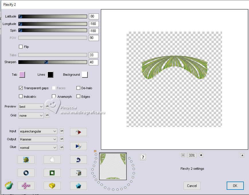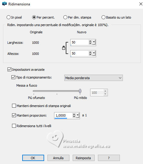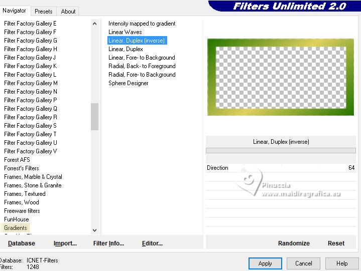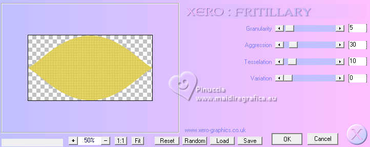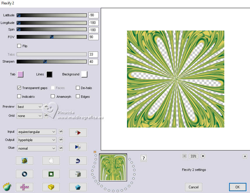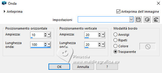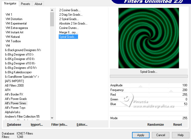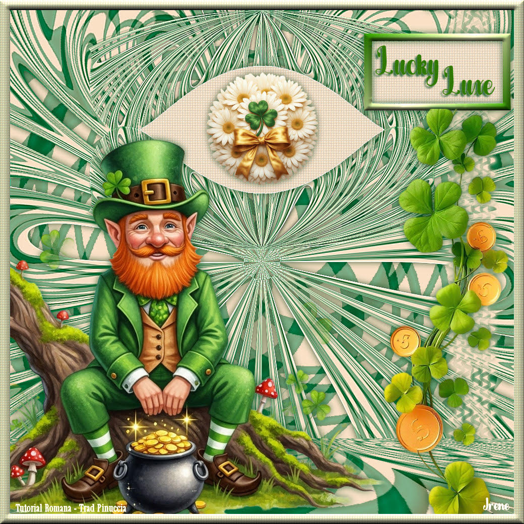 qui puoi trovare qualche risposta ai tuoi dubbi. Se l'argomento che ti interessa non è presente, ti prego di segnalarmelo. Questo tutorial è stato realizzato con PSP2020 e tradotto con PSPX9, ma può essere realizzato anche con le altre versioni di PSP. Dalla versione X4, il comando Immagine>Rifletti è stato sostituito con Immagine>Capovolgi in orizzontale, e il comando Immagine>Capovolgi con Immagine>Capovolgi in verticale. Nelle versioni X5 e X6, le funzioni sono state migliorate rendendo disponibile il menu Oggetti. Con la nuova versione X7, sono tornati Rifletti>Capovolgi, ma con nuove varianti. Vedi la scheda sull'argomento qui Occorrente: 1 tube 1 o 2 tubes accessori Eventualmente un'immagine di sfondo. Il resto del materiale ![]() Per i miei esempi ho usato miei tubes da immagini Pinterest. In questa pagina trovi i links ai siti dei creatori di tubes) Filtri: in caso di dubbi, ricorda di consultare la mia sezione filtri qui Filters Unlimited 2.0 qui Flaming Pear - Flexify 2 qui Alf's Power Sines - Spiral Grads qui Xero - Fritillary qui Mura's Meister - Perspective Tiling qui I filtri Alf's Power sines si possono usare da soli o importati in Filters Unlimited (come fare vedi qui) Se un filtro fornito appare con questa icona ![]() non esitare a cambiare modalità di miscelatura e opacità secondo i colori utilizzati. ![]() Metti le selezioni nella cartella Selezioni. 1. Apri una nuova immagine trasparente 1000 x 1000 pixels. Scegli due colori dal tuo tube, per l'esempio colore di primo piano #2f7900 colore di sfondo #e0d05f. ![]() 2. Selezione>Seleziona tutto. Apri la tua immagine di sfondo e vai a Modifica>Copia. Torna al tuo lavoro e vai a Modifica>Incolla nella selezione. Selezione>Deseleziona. Se stai utilizzando un'immagine, dovresti duplicarla. O, se preferisci, riempi l'immagine trasparente con il colore di primo piano.in ogni caso, dopo l'applicazione del filtro Spiral Grads, il risultato è lo stesso 3. Effetti>Plugins>Filters Unlimited 2.0 - Alf's Power Sines - Spiral Grads ![]() 4. Selezione>Carica/Salva selezione>Carica selezione da disco. Cerca e carica la selezione 01ornament326-romana1 ![]() Riempi la selezione con il colore di sfondo.Selezione>Deseleziona. 5. Effetti>Effetti di riflesso>Specchio rotante. ![]() Livelli>Duplica. Immagine>Rifletti>Rifletti verticalmente (Immagine>Capovolgi). Abbassa l'opacità di questo livello al 50%. Livelli>Unisci>Unisci giù. 6. Livelli>Duplica. Effetti>Effetti di distorsione>Onda. ![]() 7. Effetti>Plugins>Flaming Pear - Flexify 2. ![]() 8. Effetti>Plugins>Flaming Pear - Flexify 2. ![]() Regola>Messa a fuoco>Accentua messa a fuoco. 9. Effetti>Effetti 3D>Sfalsa ombra, colore nero. ![]() 10. Livelli>Duplica. Immagine>Ridimensiona, al 50%, tutti i livelli non selezionato. ![]() 11. Selezione>Carica/Salva selezione>Carica selezione da disco. Cerca e carica la selezione 01ornament327-romana1 ![]() Riempi la selezione con il colore di sfondo.Selezione>Innalza selezione a livello. Selezione>Deseleziona. Adesso puoi eliminare il livello sottostante, perchè non ti serve più. 12. Ritorna sul livello superiore della selezione innalzata. Effetti>Plugins>Flaming Pear - Flexify 2. ![]() Regola>Messa a fuoco>Accentua messa a fuoco. 13. Effetti>Effetti di immagine>Scostamento. ![]() 14. Livelli>Duplica. Immagine>Rifletti>Rifletti verticalmente (Immagine>Capovolgi). Effetti>Effetti di immagine>Scostamento. ![]() Livelli>Unisci>Unisci giù. 15. Livelli>Nuovo livello raster. Selezione>Carica/Salva selezione>Carica selezione da disco. Cerca e carica la selezione 01ornament328-romana1 ![]() Riempi la selezione con il colore di sfondo.16. Effetti>Plugins>Xero - Fritillary ![]() Effetti>Effetti di bordo>Aumenta. Effetti>Effetti 3D>Sfalsa ombra, colore nero. ![]() Selezione>Deseleziona. 17. Apri il tuo primo tube accessorio e vai a Modifica>Copia. Torna al tuo lavoro e vai a Modifica>Incolla come nuovo livello. Immagine>Ridimensiona, se necessario. Posiziona correttamente il tube, vedi il mio esempio.Regola>Messa a fuoco>Accentua messa a fuoco. Effetti>Effetti 3D>Sfalsa ombra, colore nero. ![]() 18. Livelli>Nuovo livello raster. Selezione>Carica/Salva selezione>Carica selezione da disco. Cerca e carica la selezione 01ornament329-romana1 ![]() Riempi la selezione con il colore di sfondo.Selezione>Deseleziona. 19. Effetti>Effetti 3D>Sfalsa ombra, colore di sfondo ![]() Selezione>Deseleziona. Livelli>Duplica. Immagine>Rifletti>Rifletti orizzontalmente. 20. Attiva il livello inferiore. Livelli>Duplica. Effetti>Plugins>Mura's Meister - Perspective Tiling 1.1. ![]() Livelli>Disponi>Porta in alto. Effetti>Effetti 3D>Sfalsa ombra, colore nero. ![]() 21. Livelli>Nuovo livello raster. Selezione>Carica/Salva selezione>Carica selezione da disco. Cerca e carica la selezione 01ornament330-romana1 ![]() Riempi la selezione con il colore di sfondo.22. Effetti>Plugins>Filters Unlimited 2.0 - Gradients - Linear Duplex (inverse) ![]() 23. Effetti>Effetti 3D>Smusso a incasso. ![]() Effetti>Effetti 3D>Sfalsa ombra, colore nero. ![]() 24. Livelli>Nuovo livello raster. Selezione>Carica/Salva selezione>Carica selezione da disco. Cerca e carica la selezione 01ornament331-romana1 ![]() Riempi la selezione con il colore di sfondo.Effetti>Plugins>Xero - Fritillary, con i settaggi precedenti. Effetti>Effetti di bordo>Aumenta. Livelli>Disponi>Sposta giù. Selezione>Deseleziona. 25. Attiva nuovamente il livello superiore. Attiva lo strumento Testo , scegli un font e scrivi il tuo testo.Io ho scritto Lucky Luxe Posiziona il testo sul banner.26. Effetti>Effetti 3D>Sfalsa ombra, colore nero. ![]() 27. Apri il tuo secondo tube accessorio e vai a Modifica>Copia. Immagine>Ridimensiona, se necessario. Sposta il tube a destra, o come preferisci - vedi il mio esempio.Regola>Messa a fuoco>Accentua messa a fuoco. Effetti>Effetti 3D>Sfalsa ombra, colore nero. ![]() se preferisci, puoi aggiungere il tube dopo i bordi 28. Selezione>Seleziona tutto. Immagine>Aggiungi bordatura, 20 pixels, simmetr