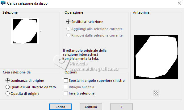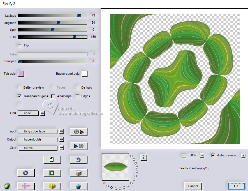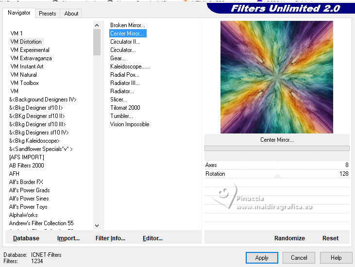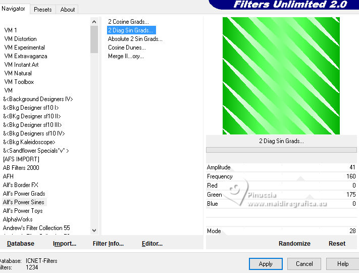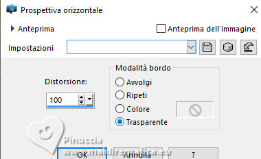qui puoi trovare qualche risposta ai tuoi dubbi. Se l'argomento che ti interessa non è presente, ti prego di segnalarmelo. Questo tutorial è stato realizzato con PSP2020 e tradotto con PSPX9, ma può essere realizzato anche con le altre versioni di PSP. Dalla versione X4, il comando Immagine>Rifletti è stato sostituito con Immagine>Capovolgi in orizzontale, e il comando Immagine>Capovolgi con Immagine>Capovolgi in verticale. Nelle versioni X5 e X6, le funzioni sono state migliorate rendendo disponibile il menu Oggetti. Con la nuova versione X7, sono tornati Rifletti>Capovolgi, ma con nuove varianti. Vedi la scheda sull'argomento qui Occorrente: 1 immagine di sfondo 1 tube 2-3 tubes accessori Il resto del materiale (una selezione) ![]() Per i tubes usati grazie Adrienne in questa pagina trovi i links ai siti dei creatori di tubes) Filtri: in caso di dubbi, ricorda di consultare la mia sezione filtri qui Filters Unlimited 2.0 qui VM Distortion - Center Mirror qui Alf's Power Sines - 2 Diag Sin Grads qui Flaming Pear - Flexify 2 qui I filtri VM Distortion e Alf's Power Sines si possono usare da soli o importati in Filters Unlimited (come fare vedi qui) Se un filtro fornito appare con questa icona ![]() non esitare a cambiare modalità di miscelatura e opacità secondo i colori utilizzati. ![]() Metti la selezione nella cartella Selezioni. 1. Apri una nuova immagine trasparente 900 x 900 pixels. Scegli due colori dal tuo tube, per l'esempio colore di primo piano #95c97f colore di sfondo #f7dea6. ![]() 2. Selezione>Seleziona tutto. Apri la tua immagine di sfondo e vai a Modifica>Copia. Torna al tuo lavoro e vai Modifica>Incolla nella selezione. Selezione>Deseleziona. 3. Effetti>Plugins>Filters Unlimited 2.0 - VM Distortion - Center Mirror. ![]() 4. Livelli>Nuovo livello raster. Riempi il livello con il colore di sfondo.Effetti>Plugins>Filters Unlimited 2.0 - Alf's Power Sines - 2Diag Sin Grads ![]() Se stai usando altri colori, dovrai sperimentare un po' i settaggi. Abbassa l'opacità di questo livello al 44%. 5. Livelli>Nuovo livello raster. Riempi il livello con il colore di primo piano.Effetti>Plugins>Filters Unlimited 2.0 - Alf's Power Sines - 2Diag Sin Grads ![]() Se stai usando altri colori, dovrai sperimentare un po' i settaggi. Immagine>Rifletti>Rifletti orizzontalmente. Abbassa l'opacità di questo livello al 44%. Livelli>Unisci>Unisci visibile. Modifica>Copia. Modifica>Incolla come nuova immagine, e minimizza l'immagine che ti servirà più tardi per i bordi. 6. Livelli>Duplica. Effetti>Effetti geometrici>Prospettiva orizzontale. ![]() 7. Effetti>Effetti geometrici>Cilindro verticale. ![]() Livelli>Duplica. Immagine>Rifletti>Rifletti orizzontalmente. Livelli>Unisci>Unisci giù. 8. Effetti>Effetti geometrici>Cerchio. ![]() 9. Effetti>Plugins>Flaming Pear - Flexify 2. ![]() 10. Selezione>Carica/Salva selezione>Carica selezione da disco. Cerca e carica la selezione 01ornament318-romana1 ![]() Selezione>Inverti. Premi sulla tastiera il tasto CANC ![]() Selezione>Deseleziona. 11. Immagine>Ridimensiona, al 55%, tutti i livelli non selezionato. Effetti>Effetti di bordo>Aumenta. 12. Effetti>Effetti 3D>Sfalsa ombra, colore nero. ![]() 13. Effetti>Effetti di immagine>Scostamento. ![]() Livelli>Duplica. Immagine>Rifletti>Rifletti orizzontalmente. 14. Copia/incolla come nuovo livello i tuoi 2-3 tubes accessori. Immagine>Ridimensiona, se necessario. Regola>Messa a fuoco>Metti a fuoco. Posiziona i tube a tuo piacimento.Effetti>Effetti 3D>Sfalsa ombra, colore nero. ![]() 15. Apri il tuo tube principale vai a Modifica>Copia. Torna al tuo lavoro e vai a Modifica>Incolla come nuovo livello. Immagine>Ridimensiona, se necessario. Regola>Messa a fuoco>Metti a fuoco. Posiziona correttamente il tube.Effetti>Effetti 3D>Sfalsa ombra, colore nero. ![]() 16. Selezione>Seleziona tutto. Immagine>Aggiungi bordatura, 50 pixels, simmetriche, colore #f7dea6. Selezione>Inverti. Attiva l'immagine che hai minimizzato al punto 5 e vai a Modifica>Copia. Torna al tuo lavoro e vai a Modifica>Incolla nella selezione. Effetti>Effetti di distorsione>Onda. ![]() 17. Effetti>Effetti 3D>Sfalsa ombra, colore nero. ![]() Selezione>Deseleziona. 18. Attiva lo strumento Testo ![]() Scrivi il tuo nome o il tuo watermark. Effetti>Effetti 3D>Sfalsa ombra, a scelta. 19. Livelli>Unisci>Unisci tutto e salva in formato jpg. ![]() ![]() Le vostre versioni. Grazie ![]() Irene ![]() Se hai problemi o dubbi, o trovi un link non funzionante, o anche soltanto per un saluto, scrivimi. |