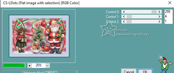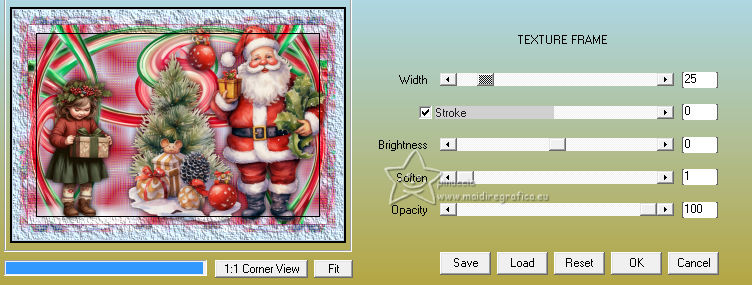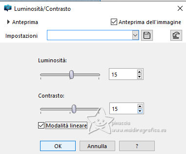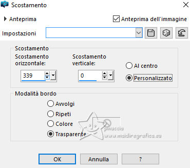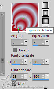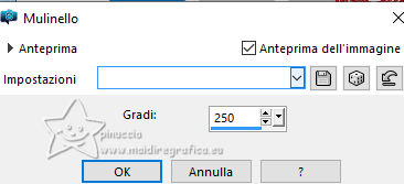 qui puoi trovare qualche risposta ai tuoi dubbi. Se l'argomento che ti interessa non è presente, ti prego di segnalarmelo. Questo tutorial è stato realizzato con PSP2020 e tradotto con PSPX9, ma può essere realizzato anche con le altre versioni di PSP. Dalla versione X4, il comando Immagine>Rifletti è stato sostituito con Immagine>Capovolgi in orizzontale, e il comando Immagine>Capovolgi con Immagine>Capovolgi in verticale. Nelle versioni X5 e X6, le funzioni sono state migliorate rendendo disponibile il menu Oggetti. Con la nuova versione X7, sono tornati Rifletti>Capovolgi, ma con nuove varianti. Vedi la scheda sull'argomento qui Occorrente: Tubes a scelta: 2 tube principale Il testo del materiale qui (in questa pagina trovi i links ai siti dei creatori di tubes) Filtri: in caso di dubbi, ricorda di consultare la mia sezione filtri qui Filters Unlimited 2.0 qui Andrew's Filter 30 - Fours Time to Grid qui AAA Frames - Texture Frame qui Carolaine and Sensibility - CS-LDots qui I filtri Andrew's si possono usare da soli o importati in Filters Unlimited (come fare vedi qui) Se un filtro fornito appare con questa icona ![]() non esitare a cambiare modalità di miscelatura e opacità secondo i colori utilizzati. Nelle ultime versioni di PSP non c'è il gradiente di primo piano/sfondo (Corel_06_029) Puoi usare i gradienti delle versioni precedenti. Trovi qui i gradienti Corel X. ![]() Metti la selezione nella cartella Selezioni. 1. Apri una nuova immagine trasparente 900 x 600 pixels. Scegli due colori dal tuo tube Per l'esempio: Imposta il colore di primo piano con #a20611, e il colore di sfondo con #bbd3e6 ![]() 2. Passa il colore di primo piano a Gradiente di primo piano/sfondo, stile Sprazzo di luce. ![]() Riempi l'immagine trasparente con il gradiente.3. Effetti>Effetti di immagine>Motivo unico, con i settaggi standard. ![]() 4. Effetti>Plugins>Filters Unlimited 2.0 - Andrew's Filter 30 - Fours Time To Grid. ![]() 5. Eventualmente, se l'immagine è troppo scura: Regola>Luminosità e contrasto>Luminosità e contrasto ![]() 6. Livelli>Nuovo livello raster. Selezione>Carica/Salva selezione>Carica selezione da disco. Cerca e carica la selezione 01ornament41-romana1 ![]() Apri la tua immagine di sfondo e vai a Modifica>Copia. Torna al tuo lavoro e vai a Modifica>Incolla nella selezione. Selezione>Deseleziona. 7. Effetti>Effetti di distorsione>Mulinello. ![]() 8. Effetti>Effetti 3D>Sfalsa ombra, colore di sfondo. ![]() 9. Livelli>Duplica. Immagine>Ridimensiona, al 70%, tutti i livelli non selezionato. ![]() 10. Immagine>Ruota per gradi - 90 gradi a sinistra. ![]() 11. Effetti>Effetti di immagine>Scostamento. ![]() Livelli>Duplica. Immagine>Rifletti>Rifletti verticalmente. Livelli>Unisci>Unisci giù. Livelli>Duplica Immagine>Rifletti>Rifletti orizzontalmente. Livelli>Unisci>Unisci giù. 12. Attiva il livello Raster 2. Effetti>Effetti di immagine>Scostamento. ![]() Livelli>Duplica. Immagine>Rifletti>Rifletti orizzontalmente. 13. Attiva il livello superiore. Copia/Incolla come nuovo livello i tuoi due tubes. Immagine>Ridimensiona, se necessario, tutti i livelli non selezionato. Regola>Messa a fuoco>Metti a fuoco. Effetti>Effetti 3D>Sfalsa ombra, colore nero. ![]() 14. Immagine>Aggiungi bordatura, 1 pixel, simmetriche, colore di primo piano #a20611. Selezione>Seleziona tutto. Immagine>Aggiungi bordatura, 50 pixels, simmetriche, colore di sfondo #bbd3e6. Selezione>Inverti. Effetti>Plugins>Caroline and Sensibility - CS LDots. ![]() 15. Effetti>Plugins>Filters Unlimited 2.0 - Andrew's Filter 30 - Fours Time To Grid, con i settaggi standard. ![]() 16. Effetti>Plugins>AAA Frames - Texture Frame. ![]() Selezione>Inverti. Effetti>Effetti 3D>Sfalsa ombra, colore nero. ![]() 17. Selezione>Seleziona tutto. Selezione>Modifica>Contrai - 25 pixels. Effetti>Effetti 3D>Sfalsa ombra, con i settaggi precedenti. ![]() Selezione>Deseleziona. 18. Attiva lo strumento Testo ![]() Scrivi il tuo nome o, se preferisci, aggiungi il tuo watermark. Effetti>Effetti 3D>Sfalsa ombra, a scelta. 19. Livelli>Unisci>Unisci tutto e salva in formato jpg. ![]() Se hai problemi o dubbi, o trovi un link non funzionante, o anche soltanto per un saluto, scrivimi. 18 Novembre 2024 |
