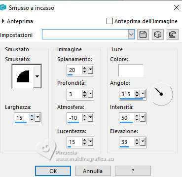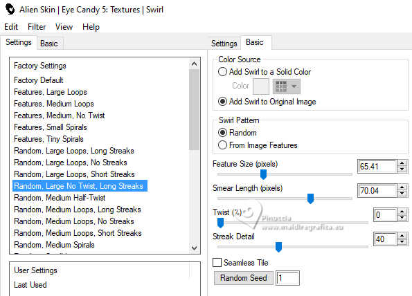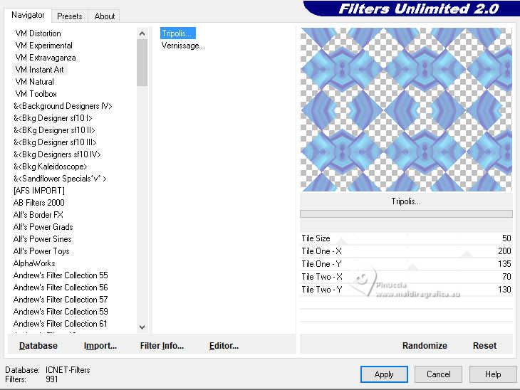 qui puoi trovare qualche risposta ai tuoi dubbi. Se l'argomento che ti interessa non è presente, ti prego di segnalarmelo. Questo tutorial è stato realizzato con PSP2020 e tradotto con PSPX9, ma può essere realizzato anche con le altre versioni di PSP. Dalla versione X4, il comando Immagine>Rifletti è stato sostituito con Immagine>Capovolgi in orizzontale, e il comando Immagine>Capovolgi con Immagine>Capovolgi in verticale. Nelle versioni X5 e X6, le funzioni sono state migliorate rendendo disponibile il menu Oggetti. Con la nuova versione X7, sono tornati Rifletti>Capovolgi, ma con nuove varianti. Vedi la scheda sull'argomento qui Occorrente: Tubes a scelta: 1 tube principale 4 tubes accessori Nessun altro materiale. Per il tube del mio esempio grazie Aprilshareables (in questa pagina trovi i links ai siti dei creatori di tubes) Filtri: in caso di dubbi, ricorda di consultare la mia sezione filtri qui Filters Unlimited 2.0 qui Mehdi - Sorting Tiles qui Flaming Pear - Flexify 2 qui VM Instant Art - Tripolis qui Alien Skin Eye Candy 5 Textures - Swirl qui I filtri VM Instant Art si possono usare da soli o importati in Filters Unlimited (come fare vedi qui) Se un filtro fornito appare con questa icona ![]() non esitare a cambiare modalità di miscelatura e opacità secondo i colori utilizzati. Nelle ultime versioni di PSP non c'è il gradiente di primo piano/sfondo (Corel_06_029) Puoi usare i gradienti delle versioni precedenti. Trovi qui i gradienti Corel X. ![]() 1. Apri una nuova immagine trasparente 900 x 700 pixels. Scegli due colori dal tuo tube Per l'esempio: Imposta il colore di primo piano con #7a5ca2, e il colore di sfondo con #7ad0e1 ![]() 2. Passa il colore di primo piano a Gradiente di primo piano/sfondo, stile Sprazzo di luce. Riempi l'immagine trasparente con il gradiente.3. Effetti>Plugins>Alien Skin Eye Candy 5 Textures - Swirl. Preset Random, Large No Twist,Long Streaks ![]() 4. Effetti>Plugins>Mehdi - Sorting Tiles. ![]() 5. Effetti>Effetti di distorsione>Coordinate polari. ![]() Livelli>Duplica. Immagine>Rifletti>Rifletti verticalmente. Abbassa l'opacità di questo livello al 50%. Livelli>Unisci>Unisci giù. Effetti>Effetti di bordo>Aumenta. 6. Eventualmente, se l'immagine ti sembra troppo scura: Regola>Luminosità e contrasto>Luminosità e contrasto ![]() 7. Livelli>Duplica. Effetti>Effetti geometrici>Pentagono. ![]() 8. Effetti>Plugins>Flaming Pear - Flexify 2. ![]() 9. Effetti>Plugins>Filters Unlimited 2.0 - VM Instant Art - Tripolis. ![]() Livelli>Duplica. Immagine>Rifletti>Rifletti orizzontalmente. Livelli>Unisci>Unisci giù. 10. Effetti>Plugins>Flaming Pear - Flexify 2. ![]() 11. Effetti>Effetti 3D>Sfalsa ombra, colore nero. ![]() 12. Livelli>Nuovo livello raster. Selezione>Seleziona tutto. Apri il tuo primo tube accessorio (per me fiocchi di neve) Modifica>Copia. Torna al tuo lavoro e vai a Modifica>Incolla nella selezione. Selezione>Deseleziona. 13. Apri il tuo secondo tube accessorio (per me: neve fresca) Modifica>Copia. Torna al tuo lavoro e vai a Modifica>Incolla come nuovo livello. Sposta Füge diese auf dein Bild ein und schiebe diese nach untenEffetti>Effetti 3D>Sfalsa ombra, colore bianco. ![]() 14. Apri il terzo tube accessorio (Lampada) Modifica>Copia. Torna al tuo lavoro e vai a Modifica>Incolla come nuovo livello. Sposta il tube in basso.Effetti>Effetti 3D>Sfalsa ombra, colore nero. ![]() 15. Apri il quarto tube accessorio (pinguino). Modifica>Copia. Torna al tuo lavoro e vai a Modifica>Incolla come nuovo livello. Sposta il tube accanto al lampione.Effetti>Effetti 3D>Sfalsa ombra, con i settaggi precedenti. ![]() 16. Apri il tube principale. Modifica>Copia. Torna al tuo lavoro e vai a Modifica>Incolla come nuovo livello. Sposta il tube a sinistra.Immagine>Ridimensiona, se necessario. Regola>Messa a fuoco>Metti a fuoco. Effetti>Effetti 3D>Sfalsa ombra, colore nero. ![]() 17. Immagine>Aggiungi bordatura, 1 pixel, simmetriche, colore di primo piano #7a5ca2. Selezione>Seleziona tutto. Immagine>Aggiungi bordatura, 1 pixel, simmetriche, colore di sfondo #7ad0e1 18. Effetti>Effetti di immagine>Motivo unico. ![]() Selezione>Inverti. 19. Regola>Sfocatura>Sfocatura gaussiana - raggio 20. ![]() 20. Regola>Aggiungi/Rimuovi disturbo>Aggiungi disturbo. ![]() 21. Effetti>Effetti 3D>Smusso a incasso. ![]() Selezione>Inverti. 23. Effetti>Effetti 3D>Ritaglio. ![]() Selezione>Deseleziona. 24. Attiva lo strumento Testo ,scegli un font e scrivi il tuo nome. O aggiungi il tuo watermark. Effetti>Effetti 3D>Sfalsa ombra, a scelta. 25. Immagine>Aggiungi bordatura, 1 pixel, simmetriche, colore di primo piano #7a5ca2. ![]() Le vostre versioni. Grazie ![]() Marygraphics ![]() Se hai problemi o dubbi, o trovi un link non funzionante, o anche soltanto per un saluto, scrivimi. 5 Novembre 2024 |
