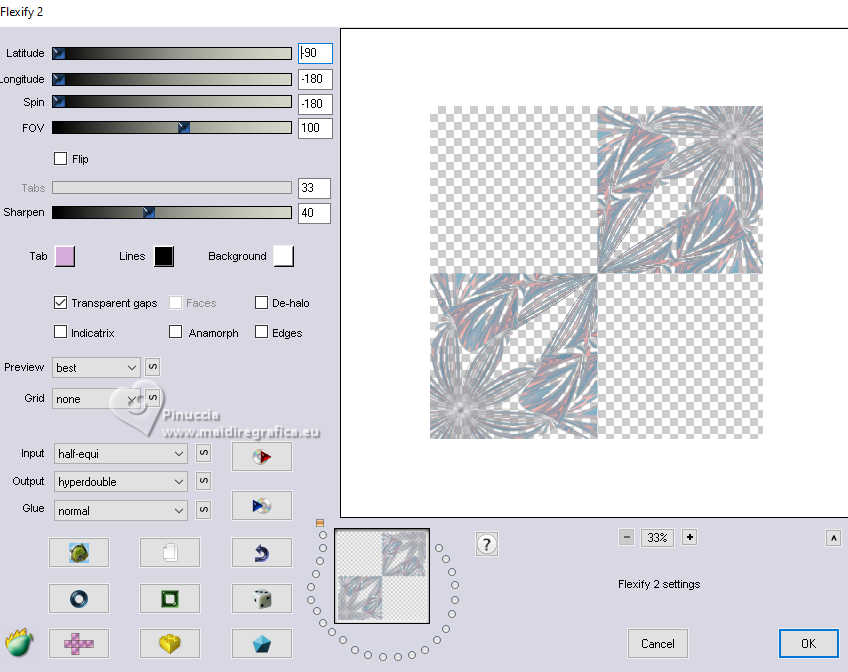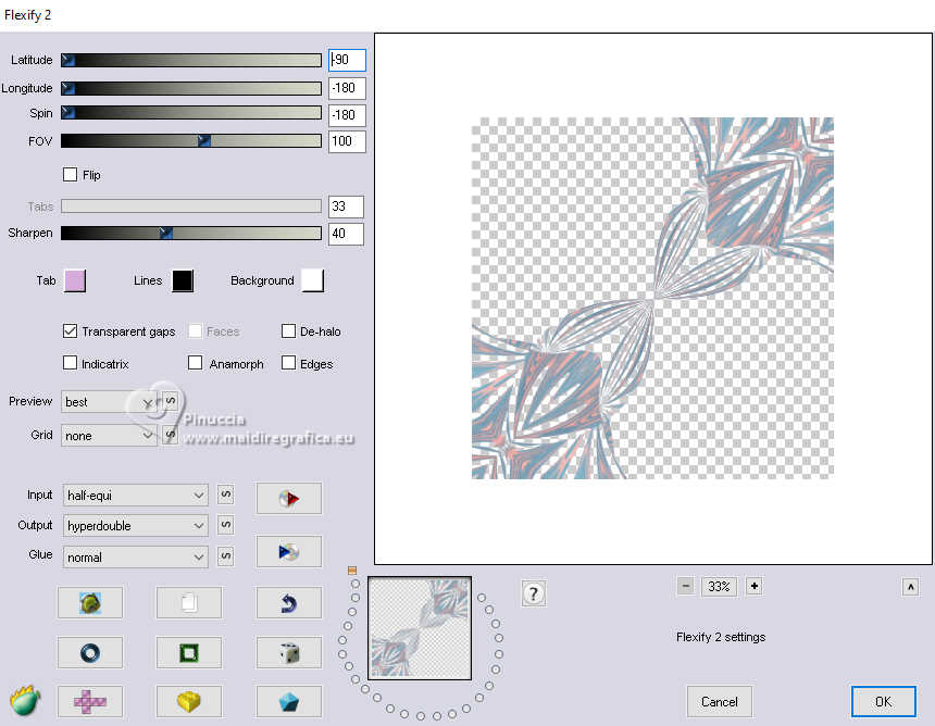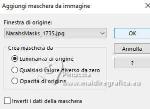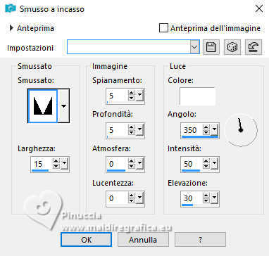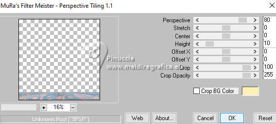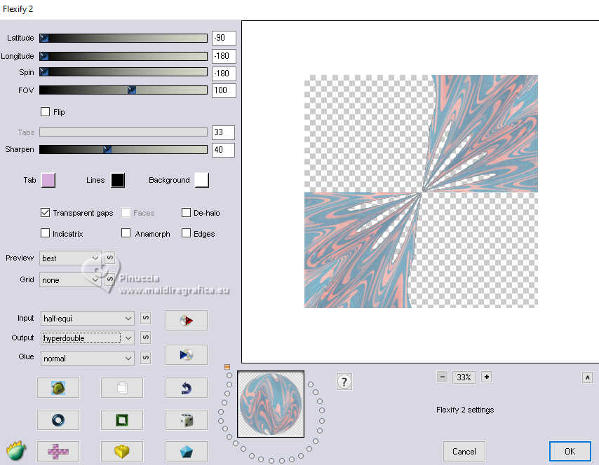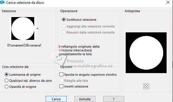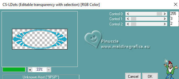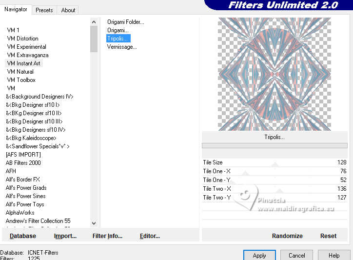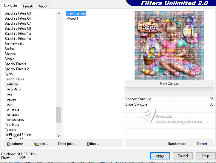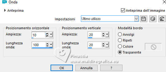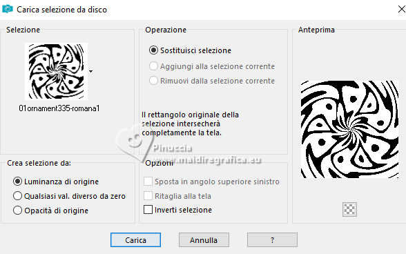 qui puoi trovare qualche risposta ai tuoi dubbi. Se l'argomento che ti interessa non è presente, ti prego di segnalarmelo. Questo tutorial è stato realizzato con PSP2020 e tradotto con PSPX9, ma può essere realizzato anche con le altre versioni di PSP. Dalla versione X4, il comando Immagine>Rifletti è stato sostituito con Immagine>Capovolgi in orizzontale, e il comando Immagine>Capovolgi con Immagine>Capovolgi in verticale. Nelle versioni X5 e X6, le funzioni sono state migliorate rendendo disponibile il menu Oggetti. Con la nuova versione X7, sono tornati Rifletti>Capovolgi, ma con nuove varianti. Vedi la scheda sull'argomento qui Occorrente: 1 Immagine 1 tube 2-3 tubes accessori Il resto del materiale ![]() Per il tube del mio esempio grazie Virginia. In questa pagina trovi i links ai siti dei creatori di tubes) Filtri: in caso di dubbi, ricorda di consultare la mia sezione filtri qui Filters Unlimited 2.0 qui VM Instant Art - Tripolis qui Flaming Pear - Flexify 2 qui Carolaine and Sensibility - CS-LDots qui Texturizer - Raw Canvas qui Mura's Meister - Perspective Tiling qui I filtri VM Instant Art si possono usare da soli o importati in Filters Unlimited (come fare vedi qui) Se un filtro fornito appare con questa icona ![]() non esitare a cambiare modalità di miscelatura e opacità secondo i colori utilizzati. ![]() Metti la trama nella cartella Trame. Metti le selezioni nella cartella Selezioni. Apri la maschera in PSP e minimizzala con il resto del materiale. 1. Apri una nuova immagine trasparente 1000 x 1000 pixels. Scegli due colori dal tuo tube, per l'esempio colore di primo piano #15a7c9 colore di sfondo #f8c3b3. ![]() 2. Selezione>Seleziona tutto. Apri la tua immagine di sfondo e vai a Modifica>Copia. Torna al tuo lavoro e vai a Modifica>Incolla nella selezione. Selezione>Deseleziona. 3. Livelli>Nuovo livello raster. Selezione>Carica/Salva selezione>Carica selezione da disco. Cerca e carica la selezione 01ornament335-romana1 ![]() Riempi la selezione con il colore di primo piano.Selezione>Inverti. Riempi la selezione con il colore di sfondo.Selezione>Deseleziona. 4. Effetti>Effetti di immagine>Motivo unico, con i settaggi standard. ![]() Abbassa l'opacità di questo livello al 50%. Livelli>Unisci>Unisci giù. Modifica>Copia. Modifica>Incolla come nuova immagine, e minimizza questa immagine. 5. Livelli>Duplica. Effetti>Effetti di distorsione>Onda. ![]() 6. Effetti>Plugins>Flaming Pear - Flexify 2. ![]() 7. Livelli>Duplica. Immagine>Ruota per gradi - 90 gradi a destra ![]() Livelli>Unisci>Unisci giù. 8. Selezione>Carica/Salva selezione>Carica selezione da disco. Cerca e carica la selezione 01ornament336-romana1 ![]() Selezione>Inverti. Premi sulla tastiera il tasto CANC ![]() Selezione>Deseleziona. 9. Effetti>Plugins>Filters Unlimited 2.0 - VM Instant Art - Tripolis ![]() 10. Effetti>Plugins>Flaming Pear - Flexify 2. ![]() 11. Livelli>Duplica. Immagine>Ruota per gradi - 90 gradi a destra. ![]() Livelli>Unisci>Unisci giù. 12. Effetti>Plugins>Flaming Pear - Flexify 2. ![]() Livelli>Duplica. Immagine>Ruota per gradi, con i settaggi precedenti. Livelli>Unisci>Unisci giù. 13. Effetti>Effetti 3D>Sfalsa ombra, colore nero. ![]() 14. Livelli>Nuovo livello raster. Riempi con il colore di sfondo.Livelli>Nuovo livello maschera>Da immagine. Apri il menu sotto la finestra di origine e vedrai la lista dei files aperti. Seleziona la maschera NarahsMasks_1735. ![]() Livelli>Unisci>Unisci gruppo. Regola>Messa a fuoco>Metti a fuoco. 15. Effetti>Effetti 3D>Sfalsa ombra, colore chiaro di sfondo #f8c3b3. ![]() 16. Copia/Incolla come nuovo livello i tuoi 2-3 tube accessori. Ridimensiona e posiziona a tuo piacimento. Regola>Messa a fuoco>Metti a fuoco. Effetti>Effetti 3D>Sfalsa ombra, colore nero. ![]() 17. Apri il tuo tube principale e vai a Modifica>Copia. Torna al tuo lavoro e vai a Modifica>Incolla come nuovo livello. Immagine>Ridimensiona, se necessario. Posiziona il tube al centro.Regola>Messa a fuoco>Metti a fuoco. Effetti>Effetti 3D>Sfalsa ombra, colore nero. ![]() 18. Apri Art Deco Frames-blk6 ![]() Modifica>Copia. Torna al tuo lavoro e vai a Modifica>Incolla come nuovo livello. Sposta la cornice dove preferisci.Attiva lo strumento Bacchetta magica , tolleranza 15, sfumatura 0,e clicca nella parte nera per selezionarla. Riempi con il colore di primo piano.19. Effetti>Plugins>Caroline and Sensibility - CS LDots ![]() Selezione>Deseleziona. 20. Livelli>Nuovo livello raster. Attiva nuovamente lo strumento Bacchetta magica , tolleranza 15, sfumatura 0,e clicca al centro della cornice per selezionarla. Selezione>Modifica>Espandi - 1 pixel. Riempi con il colore di sfondo.21. Effetti>Effetti di trama>Trama - seleziona la trama Susan_01. ![]() Selezione>Deseleziona. Livelli>Disponi>Sposta giù. 22. Attiva il livello superiore. Attiva lo strumento Testo , scegli un font,e scrivi il tuo testo. Puoi scrivere Spring Easter, secondo il tuo tube, o quello che preferisci. Naturalmente puoi usare un wordart o altro. Effetti>Effetti 3D>Sfalsa ombra, a scelta. 23. Attiva il livello inferiore, Raster 1. Livelli>Duplica. Effetti>Plugins>Mura's Meister - Perspective Tiling 1.1 ![]() Livelli>Disponi>Sposta su - 2 volte. Effetti>Effetti 3D>Sfalsa ombra, colore nero. ![]() 24. Selezione>Seleziona tutto. Immagine>Aggiungi bordatura, 30 pixels, simmetriche, colore di sfondo #f8c3b3. Selezione>Inverti. Attiva l'immagine che hai minimizzato al punto 4, e vai a modifica>Copia. Torna al tuo lavoro e vai a Modifica>Incolla nella selezione. Effetti>Plugins>Filters Unlimited 2.0 - Texturizer - Raw Canvas ![]() 25. Effetti>Effetti 3D>Smusso a incasso. ![]() 26. Selezione>Inverti. Effetti>Effetti 3D>Ritaglio. ![]() Selezione>Deseleziona. 27. Attiva lo strumento Testo ![]() Scrivi il tuo nome o il tuo watermark. Effetti>Effetti 3D>Sfalsa ombra, a scelta. 28. Livelli>Unisci>Unisci tutto e salva in formato jpg. Scrap elements Fpds. Grazie ![]() ![]() Le vostre versioni. Grazie ![]() Irene ![]() Se hai problemi o dubbi, o t