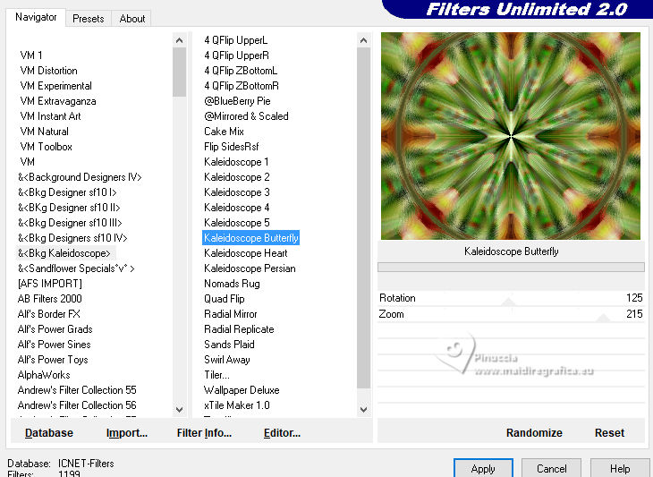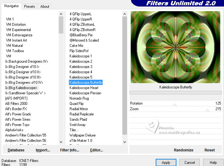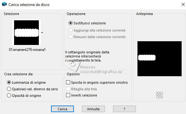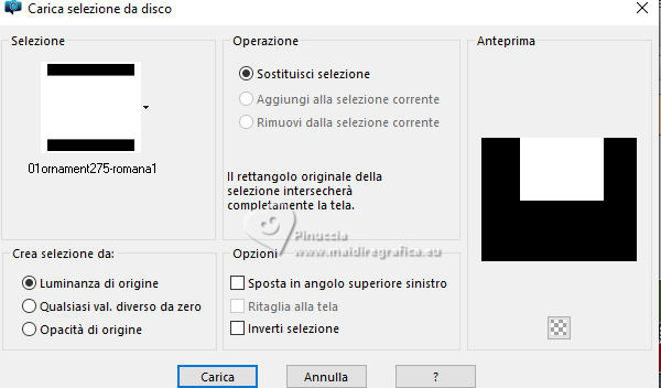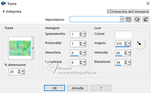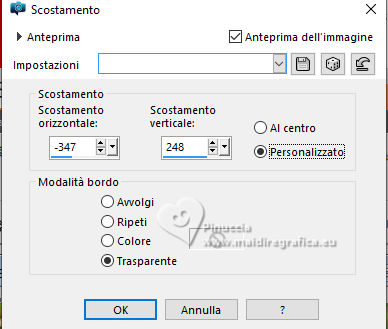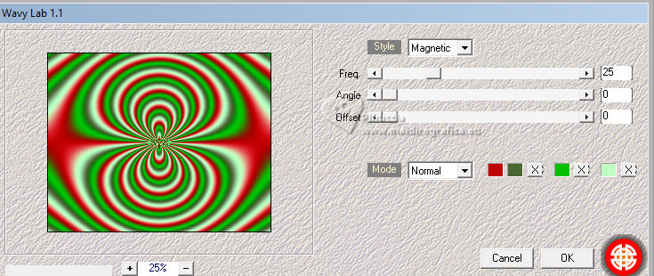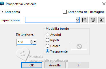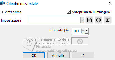 qui puoi trovare qualche risposta ai tuoi dubbi. Se l'argomento che ti interessa non è presente, ti prego di segnalarmelo. Questo tutorial è stato realizzato con PSP2020 e tradotto con PSPX9, ma può essere realizzato anche con le altre versioni di PSP. Dalla versione X4, il comando Immagine>Rifletti è stato sostituito con Immagine>Capovolgi in orizzontale, e il comando Immagine>Capovolgi con Immagine>Capovolgi in verticale. Nelle versioni X5 e X6, le funzioni sono state migliorate rendendo disponibile il menu Oggetti. Con la nuova versione X7, sono tornati Rifletti>Capovolgi, ma con nuove varianti. Vedi la scheda sull'argomento qui Occorrente: Tubes a scelta: 1 tube principale 3 tubes accessori (1 nel materiale) Il resto del materiale qui Esempi con miei tubes da immagini Pinterest Filtri: in caso di dubbi, ricorda di consultare la mia sezione filtri qui &<Bkg Kaleidoscope> - Kaleidoscope Butterfly (da importare in Unlimited) qui Mehdi - Wavy Lab 1.1 qui Mehdi - Sorting Tiles qui Flaming Pear - Flexify 2 qui Mura's Meister - Perspective Tiling qui ![]() non esitare a cambiare modalità di miscelatura e opacità secondo i colori utilizzati. ![]() Metti la trama misc345 nella cartella Trame. 1. Apri una nuova immagine trasparente 1000 x 800 pixels. Scegli due colori dal tuo tube. Per l'esempio: Imposta il colore di primo piano con #4a6732. e il colore di sfondo con #c00000. ![]() 2. Effetti>Plugins>Mehdi - Wavy Lab 1.1. Questo filtro crea gradienti con i colori della paletta: il primo è il colore di sfondo, il secondo quello di primo piano. Cambia gli ultimi due colori creati dal filtro con due colori della tua immagine; per il mio esempio colore 3 #01c000 , colore 4 #bfffbe ![]() 3. Effetti>Plugins>Mehdi - Sorting Tiles. ![]() 4. Effetti>Plugins>Filters Unlimited 2.0 - &<Bkg Kaleidoscope> - Kaleidoscope Butterfly. ![]() Livelli>Duplica. Ripeti il filtro una seconda volta. ![]() 5. Effetti>Effetti geometrici>Prospettiva verticale. ![]() Livelli>Duplica. Immagine>Rifletti>Rifletti verticalmente (Immagine>Capovolgi). 6. Selezione>Carica/Salva selezione>Carica selezione da disco. Cerca e carica la selezione 01ornament275-romana1 ![]() Premi sulla tastiera il tasto CANC ![]() Selezione>Deseleziona. Livelli>Unisci>Unisci giù. 7. Immagine>Ridimensiona, al 60%, tutti i livelli non selezionato. ![]() 8. Effetti>Effetti geometrici>Cilindro orizzontale. ![]() 9. Livelli>Duplica. Immagine>Ruota per gradi - 90 gradi a sinistra. ![]() Livelli>Unisci>Unisci giù. 10. Effetti>Plugins>Flaming Pear - Flexify 2. ![]() Immagine>Ridimensiona, al 60%, tutti i livelli non selezionato. 11. Effetti>Effetti 3D>Sfalsa ombra, colore nero. ![]() Livelli>Duplica. 12. Attiva il livello sottostante dell'originale. Effetti>Effetti di immagine>Scostamento. ![]() 13. Attiva il livello superiore della copia. Immagine>Ruota per gradi - 45 gradi a sinistra. ![]() 14. Effetti>Effetti di immagine>Scostamento. ![]() Livelli>Duplica. Immagine>Rifletti>Rifletti orizzontalmente. 15. Attiva il livello inferiore, Raster 1. Livelli>Duplica. Effetti>Plugins>Mura's Meister - Perspective Tiling. ![]() Effetti>Effetti 3D>Sfalsa ombra, colorenero. ![]() 16. Livelli>Nuovo livello raster. Selezione>Seleziona tutto. Apri il primo tube accessorio sterne1 ![]() Modifica>Copia. Torna al tuo lavoro e vai a Modifica>Incolla nella selezione. Selezione>Deseleziona. Regola>Messa a fuoco>Metti a fuoco. Effetti>Effetti 3D>Sfalsa ombra, colore bianco. ![]() 17. Attiva il livello superiore. Apri il secondo tube accessorio e vai a Modifica>Copia. Torna al tuo lavoro e vai a Modifica>Incolla come nuovo livello. Immagine>Ridimensiona, se necessario, tutti i livelli non selezionato. Regola>Messa a fuoco>Metti a fuoco. Sposta il tube in basso a sinistra.Effetti>Effetti 3D>Sfalsa ombra, colore nero. ![]() 18. Apri il tuo terzo tube accessorio e vai a Modifica>Copia. Torna al tuo lavoro e vai a Modifica>Incolla come nuovo livello. Immagine>Ridimensiona, se necessario, tutti i livelli non selezionato. Regola>Messa a fuoco>Metti a fuoco. Sposta il tube in alto a sinistra.Effetti>Effetti 3D>Sfalsa ombra, colore nero. ![]() 19. Livelli>Nuovo livello raster. Selezione>Carica/Salva selezione>Carica selezione da disco. Cerca e carica la selezione 01ornament276-romana1 ![]() Riempi la selezione con il colore di sfondo.20. Selezione>Modifica>Contrai - 5 pixels. Riempi la selezione con il colore di primo piano.Effetti>Effetti di trama>Trama - seleziona la trama 345 ![]() Effetti>Effetti 3D>Sfalsa ombra, colore nero. ![]() Selezione>Deseleziona. Effetti>Effetti 3D>Sfalsa ombra, colore nero. ![]() 21. Attiva lo strumento Testo ![]() scegli un font e scrivi il tuo testo. Io ho scritto Steampunk Christmas Effetti>Effetti 3D>Sfalsa ombra, a scelta. Sposta il testo sul riquadro.22. Apri il tube principale e vai a Modifica>Copia. Torna al tuo lavoro e vai a Modifica>Incolla come nuovo livello. Immagine>Ridimensiona, se necessario, tutti i livelli non selezionato. Regola>Messa a fuoco>Metti a fuoco. Sposta il tube a destra.Effetti>Effetti 3D>Sfalsa ombra, colore nero. ![]() 23. Immagine>Aggiungi bordatura, 5 pixels, simmetriche, colore di sfondo #c000000. Immagine>Aggiungi bordatura, 5 pixels, simmetriche, colore di primo piano #4a6732. Immagine>Aggiungi bordatura, 5 pixels, simmetriche, colore di sfondo #c000000. 24. Attiva lo strumento Testo , scegli un font,Scrivi il tuo nome, o aggiungi il tuo watermark. Effetti>Effetti 3D>Sfalsa ombra, a scelta. 25. Livelli>Unisci>Unisci tutto e salva in formato jpg. ![]() ![]() Le vostre versioni. Grazie ![]() Irene ![]() Se hai problemi o dubbi, o trovi un link non funzionante, o anche soltanto per un saluto, scrivimi. |