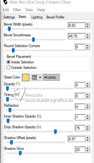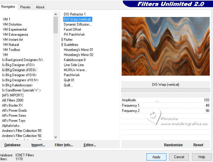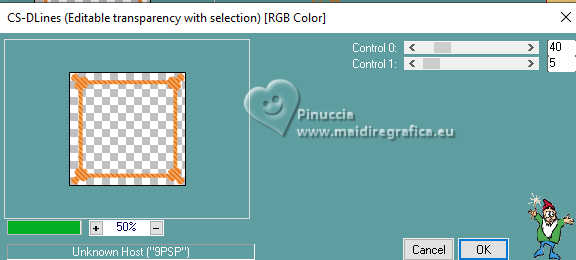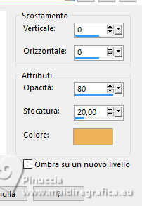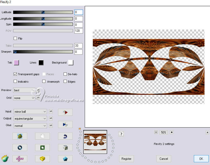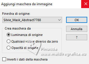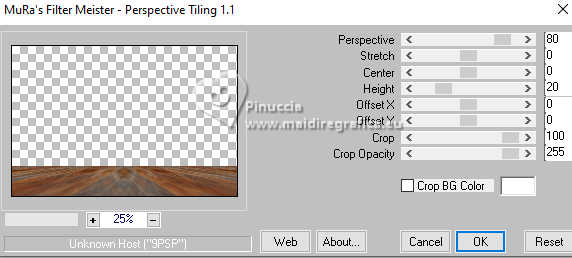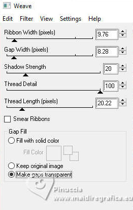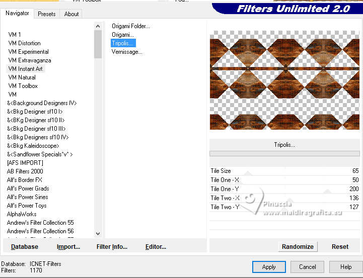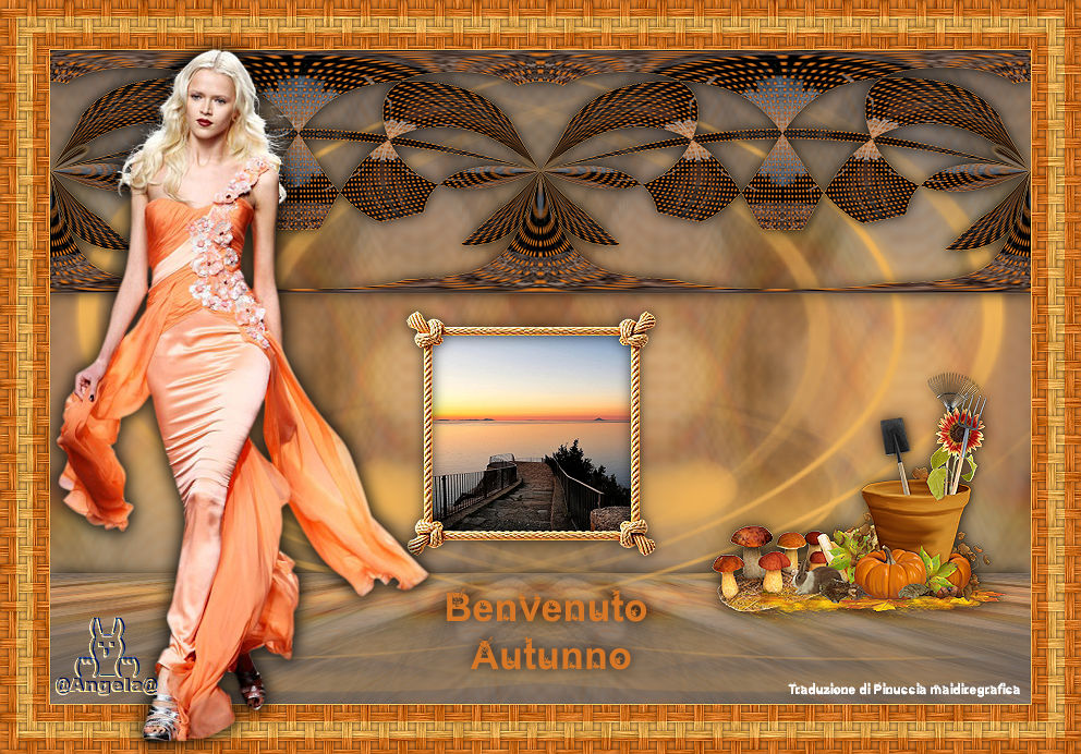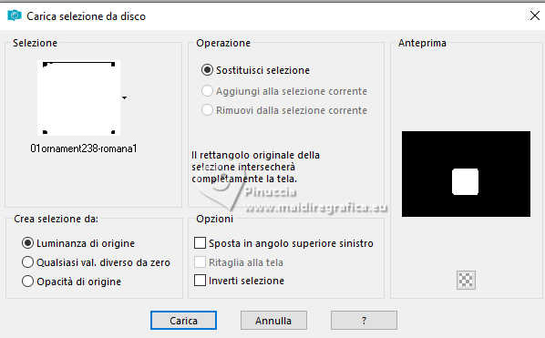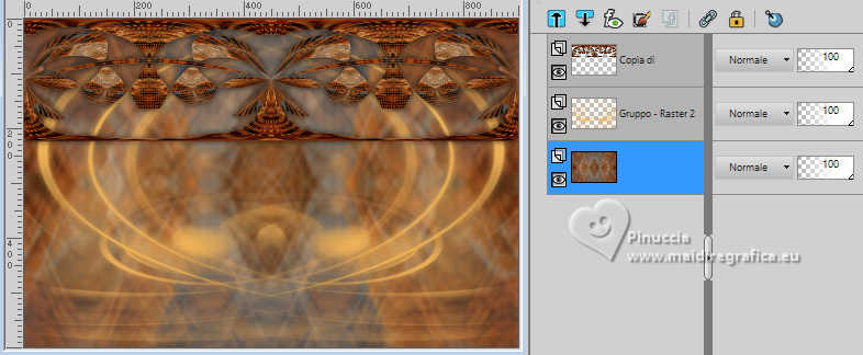 qui puoi trovare qualche risposta ai tuoi dubbi. Se l'argomento che ti interessa non è presente, ti prego di segnalarmelo. Questo tutorial è stato realizzato con PSP2020 e tradotto con PSPX9, ma può essere realizzato anche con le altre versioni di PSP. Dalla versione X4, il comando Immagine>Rifletti è stato sostituito con Immagine>Capovolgi in orizzontale, e il comando Immagine>Capovolgi con Immagine>Capovolgi in verticale. Nelle versioni X5 e X6, le funzioni sono state migliorate rendendo disponibile il menu Oggetti. Con la nuova versione X7, sono tornati Rifletti>Capovolgi, ma con nuove varianti. Vedi la scheda sull'argomento qui Occorrente: Tubes a scelta: 1 immagine 1 tube principale 1 tube accessori Il resto del materiale qui Per il tube del mio esempio grazie (in questa pagina trovi i links ai siti dei creatori di tubes) Filtri: in caso di dubbi, ricorda di consultare la mia sezione filtri qui Filters Unlimited 2.0 qui Eye Candy 4000 - Weave qui Flaming Pear - Flexify 2 qui &<Bkg Designer sf10II> - DIS Warp (vertical) (da importare in Unlimited) qui Mura's Meister - Perspective Tiling qui VM Instant Art - Tripolis qui Carolaine and Sensibility - CS-DLines qui Alien Skin Eye Candy 5 Impact - Glass qui I filtri VM Instant Art si possono usare da soli o importati in Filters Unlimited (come fare vedi qui) Se un filtro fornito appare con questa icona ![]() non esitare a cambiare modalità di miscelatura e opacità secondo i colori utilizzati. ![]() Metti le selezioni nella cartella Selezioni. Apri la maschera in PSP e minimizzala con il resto del materiale. 1. Apri una nuova immagine trasparente 900 x 600 pixels. Scegli due colori dal tuo tube Per l'esempio: Imposta il colore di primo piano con #d77725 e il colore di sfondo con #edb158 ![]() 2. Riempi l'immagine trasparente con il colore di primo piano.Selezione>Seleziona tutto. Livelli>Nuovo livello raster. Apri la tua immagine di sfondo e vai a Modifica>Copia. Torna al tuo lavoro e vai a Modifica>Incolla nella selezione. Selezione>Deseleziona. 3. Effetti>Plugins>Eye Candy 4000 - Weave ![]() Effetti>Effetti 3D>Sfalsa ombra. ![]() Livelli>Unisci>Unisci giù. 4. Livelli>Duplica. Immagine>Ridimensiona, al 60%, tutti i livelli non selezionato. ![]() 5. Effetti>Plugins>Filters Unlimited 2.0 - VM Instant Art - Tripolis. ![]() 6. Effetti>Plugins>Flaming Pear - Flexify 2. ![]() Immagine>Ridimensiona, al 50%, tutti i livelli non selezionato. 7. Effetti>Effetti di immagine>Scostamento. ![]() Livelli>Duplica. Immagine>Rifletti>Rifletti orizzontalmente. Livelli>Unisci>Unisci giù. 8. Effetti>Effetti 3D>Sfalsa ombra. ![]() 9. Attiva il livello inferiore, Raster 1. Regola>Sfocatura>Sfocatura gaussiana - raggio 5. ![]() 10. Effetti>Plugins>Filters Unlimited 2.0 - &<Bkg Designer sf10II> - DIS Warp (vertical). ![]() Livelli>Duplica. Immagine>Rifletti>Rifletti verticalmente. Abbassa l'opacità di questo livello al 50%. Livelli>Unisci>Unisci giù. Livelli>Duplica. Immagine>Rifletti>Rifletti orizzontalmente. Abbassa l'opacità di questo livello al 50%. Livelli>Unisci>Unisci giù. 11. Livelli>Nuovo livello raster. Riempi il livello con il colore di sfondo.Livelli>Nuovo livello maschera>Da immagine. Apri il menu sotto la finestra di origine e vedrai la lista dei files aperti. Seleziona la maschera Silvie_Mask_Abstract7788 ![]() Livelli>Unisci>Unisci gruppo. Livelli>Duplica. Immagine>Rifletti>Rifletti orizzontalmente. Livelli>Unisci>Unisci giù. 12. Effetti>Effetti 3D>Sfalsa ombra, colore di sfondo. ![]() Lascia questo livello sopra il livello di sfondo. 13. Attiva il livello di sfondo, Raster 1. ![]() Livelli>Duplica. Effetti>Plugins>Mura's Meister - Perspective Tiling. ![]() 14. Effetti>Effetti 3D>Sfalsa ombra. ![]() 15. Attiva il livello superiore, useremo una cornice già pronta. Livelli>Nuovo livello raster. Selezione>Carica/Salva selezione>Carica selezione da disco. Cerca e carica la selezione 01ornament237-romana1 ![]() attenzione, per la traduzione, ho apportato una variante, dopo aver confrontato il risultato con la versione originale di Romana, che vedi qui sotto ![]() Se vuoi seguire il mio esempio, vai al punto 15b Riempi la selezione con il colore di primo piano.16. Effetti>Plugins>Carolaine and Sensibility - CS_DLines ![]() 17. Effetti>Plugins>Eye Candy 5 Impact - Glass. ![]() Selezione>Deseleziona. ***** 15b Per chi vuole seguire il mio esempio, questo passaggio sostituisce i punti 15-16-17 Livelli>Nuovo livello raster. Selezione>Carica/Salva selezione>Carica selezione da disco. Cerca e carica la selezione 01ornament237-romana1 ![]() Apri la cornice che ho realizzato e aggiunto al materiale ![]() Modifica>Copia. Torna al tuo lavoro e vai a Modifica>Incolla nella selezione. Selezione>Deseleziona. Colorizza, se stai usando altri colori ***** 18. Livelli>Nuovo livello raster. Selezione>Carica/Salva selezione>Carica selezione da disco. Cerca e carica la selezione 01ornament238-romana1 ![]() Attiva nuovamente la tua immagine di sfondo e vai a Modifica>Copia. Torna al tuo lavoro e vai a Modifica>Incolla nella selezione. Regola>Messa a fuoco>Metti a fuoco. Selezione>Deseleziona. Livelli>Disponi>Sposta giù. 19. Attiva il livello superiore. Effetti>Effetti 3D>Sfalsa ombra. ![]() 20. Apri il tuo tube accessorio e vai a Modifica>Copia. Torna al tuo lavoro e vai a Modifica>Incolla come nuovo livello. Immagine>Ridimensiona, se e quanto necessario. Regola>Messa a fuoco>Metti a fuoco. Sposta il tube in basso a destra.Effetti>Effetti 3D>Sfalsa ombra. ![]() 21. immagine>Aggiungi bordatura, 1 pixel, simmetriche, colore di sfondo #edb158. Selezione>Seleziona tutto. Immagine>Aggiungi bordatura, 15 pixels, simmetriche, colore di primo piano #d77725. Immagine>Aggiungi bordatura, 15 pixels, simmetriche, colore di sfondo #edb158. Immagine>Aggiungi bordatura, 15 pixels, simmetriche, colore di primo piano #d77725. Selezione>Inverti. 22. Livelli>Duplica. Effetti>Plugins>Eye Candy 4000 - Weave, con i settaggi precedenti. ![]() Selezione>Deseleziona. Effetti>Effetti 