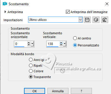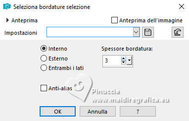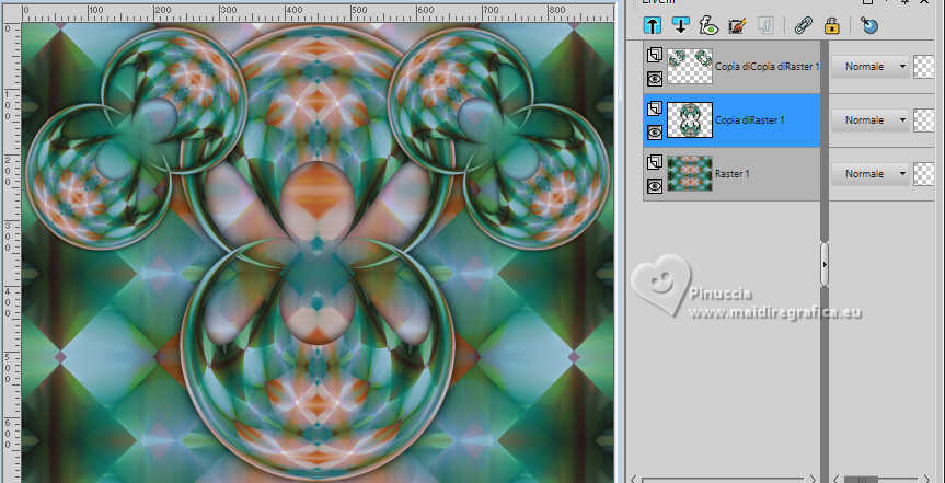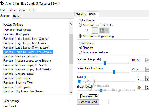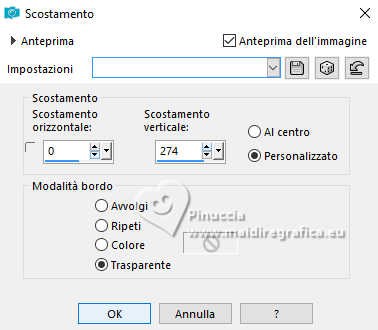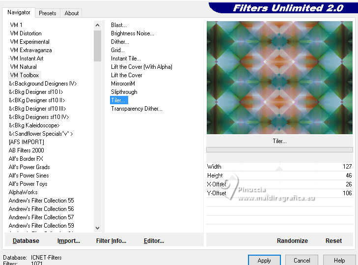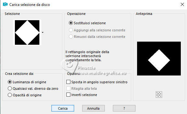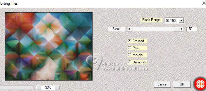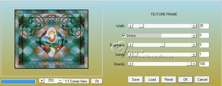 qui puoi trovare qualche risposta ai tuoi dubbi. Se l'argomento che ti interessa non è presente, ti prego di segnalarmelo. Questo tutorial è stato realizzato con PSP2020 e tradotto con PSPX9, ma può essere realizzato anche con le altre versioni di PSP. Dalla versione X4, il comando Immagine>Rifletti è stato sostituito con Immagine>Capovolgi in orizzontale, e il comando Immagine>Capovolgi con Immagine>Capovolgi in verticale. Nelle versioni X5 e X6, le funzioni sono state migliorate rendendo disponibile il menu Oggetti. Con la nuova versione X7, sono tornati Rifletti>Capovolgi, ma con nuove varianti. Vedi la scheda sull'argomento qui Occorrente: Tubes a scelta: 1 tube principale 1 immagine di sfondo. Il resto del materiale qui Per i miei esempi ho usato tubes di Mentali e Kamil. Grazie. (in questa pagina trovi i links ai siti dei creatori di tubes) Filtri: in caso di dubbi, ricorda di consultare la mia sezione filtri qui Filters Unlimited 2.0 qui Flaming Pear - Flexify 2 qui Mehdi - Sorting Tiles qui Alien Skin Eye Candy 5 Textures - Swirl qui VM Toolbox - Tiler qui AAA Frames - Texture Frame qui I filtri VM Toolbox si possono usare da soli o importati in Filters Unlimited (come fare vedi qui) Se un filtro fornito appare con questa icona ![]() non esitare a cambiare modalità di miscelatura e opacità secondo i colori utilizzati. ![]() Metti le selezioni nella cartella Selezioni. 1. Apri una nuova immagine trasparente 900 x 700 pixels. Scegli due colori dal tuo tube Per l'esempio: Imposta il colore di primo piano con #202020, e il colore di sfondo con #50b8c8 ![]() 2. Selezione>Seleziona tutto. Apri la tua immagine di sfondo e vai a Modifica>Copia. Torna al tuo lavoro e vai a Modifica>Incolla nella selezione. Selezione>Deseleziona. 3. Effetti>Plugins>Alien Skin Eye Candy 5 Textures - Swirl. ![]() 4. Effetti>Plugins>Mehdi - Sorting Tiles. ![]() 5. Effetti>Plugins>Filters Unlimited 2.0 - VM Toolbox - Tiler. ![]() 6. Se trovi l'immagine troppo scura: Regola>Luminoistà e contrasto>Luminosità e contrasto ![]() 7. Livelli>Duplica. Immagine>Ridimensiona, al 70%, tutti i livelli non selezionato. Effetti>Plugins>Flaming Pear - Flexify 2. ![]() 8. Immagine>Ridimensiona, al 60%, tutti i livelli non selezionato. Effetti>Effetti di immagine>Scostamento. ![]() Livelli>Duplica. Immagine>Rifletti>Rifletti verticalmente. Livelli>Unisci>Unisci giù. 9. Effetti>Effetti 3D>Sfalsa ombra, colore nero. ![]() 10. Livelli>Duplica. Immagine>Ridimensiona, al 55%, tutti i livelli non selezionato. Immagine>Ruota per gradi - 45 gradi a destra. ![]() Effetti>Effetti di immagine>Scostamento. ![]() 11. Livelli>Duplica. Immagine>Rifletti>Rifletti orizzontalmente. Livelli>Unisci>Unisci giù. 12. Attiva il livello sottostante. ![]() 13. Immagine>Ridimensiona, 2 volte al 55% tutti i livelli non selezionato. Immagine>Ruota per gradi - 90 gradi a destra ![]() Effetti>Effetti di immagine>Scostamento. ![]() 14. Livelli>Nuovo livello raster. Selezione>Carica/Salva selezione>Carica selezione da disco. Cerca e carica la selezione 01ornament109-romana1 ![]() Modifica>Incolla nella selezione - l'immagine di sfondo è sempre in memoria. Ridimensiona, se necessario Regola>Messa a fuoco>Metti a fuoco. 15. Selezione>Modifica>Seleziona bordature selezione. ![]() Riempi la selezione con il colore di sfondo.Effetti>Effetti 3D>Sfalsa ombra, colore nero. ![]() Selezione>Deseleziona. 16. Livelli>Nuovo livello raster. Selezione>Carica/Salva selezione>Carica selezione da disco. Cerca e carica la selezione 01ornament110-romana1 ![]() Riempi la selezione con il colore di primo piano.Selezione>Modifica>Contrai - 2 pixels. Riempi la selezione con il colore di sfondo.Selezione>Deseleziona. 17. Effetti>Effetti 3D>Sfalsa ombra, colore nero. ![]() 18. Immagine>Aggiungi bordatura, 1 pixel, simmetriche, colore di primo piano #202020. Selezione>Seleziona tutto. Immagine>Aggiungi bordatura, 50 pixels, simmetriche, colore di sfondo #50b8c8. Effetti>Effetti di immagine>Motivo unico, con i settaggi standard. ![]() Selezione>Inverti. 19. Regola>Sfocatura>Sfocatura gaussiana - raggio 25. ![]() 20. Effetti>Plugins>Alien Skin Eye Candy 5 Textures - Swirl. ![]() 21. Effetti>Plugins>AAA Frames - Texture Frame. ![]() Selezione>Inverti. Effetti>Effetti 3D>Sfalsa ombra, colore nero. ![]() 22. Selezione>Seleziona tutto. Selezione>Modifica>Contrai - 25 pixels. Effetti>Effetti 3D>Sfalsa ombra, con i settaggi precedenti. ![]() Selezione>Deseleziona. 23. Apri il tuo tube e vai a Modifica>Copia. Torna al tuo lavoro e vai a Modifica>Incolla come nuovo livello. Immagine>Ridimensiona, se e quanto necessario, tutti i livelli non selezionato. Regola>Messa a fuoco>Metti a fuoco. Spostalo a sinistra, o dove preferisci.Effetti>Effetti 3D>Sfalsa ombra, colore nero. ![]() 24. Attiva lo strumento Testo ![]() Scrivi il tuo nome o, se preferisci, aggiungi il tuo watermark. Effetti>Effetti 3D>Sfalsa ombra, a scelta. 25. Immagine>Aggiungi bordatura, 1 pixel, simmetriche, colore di primo piano #202020. Salva in formato jpg. Per il tube di questo esempio grazie AnaRidzi ![]() ![]() Le vostre versioni. Grazie ![]() Marygraphics ![]() Kamelius ![]() Se hai problemi o dubbi, o trovi un link non funzionante, o anche soltanto per un saluto, scrivimi. 15 Febbraio 2025 |