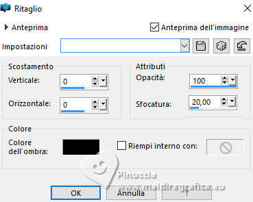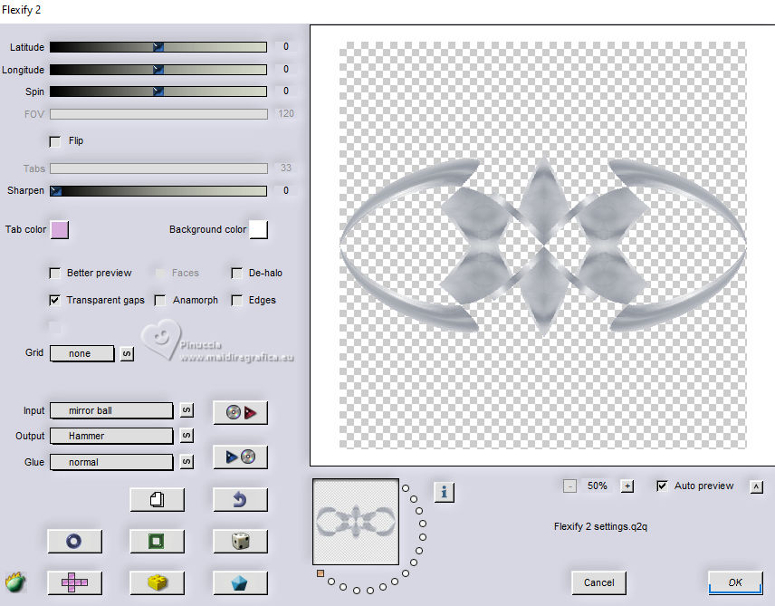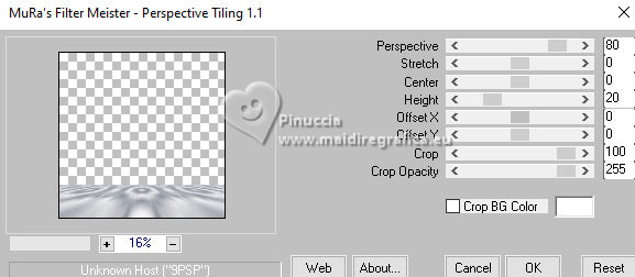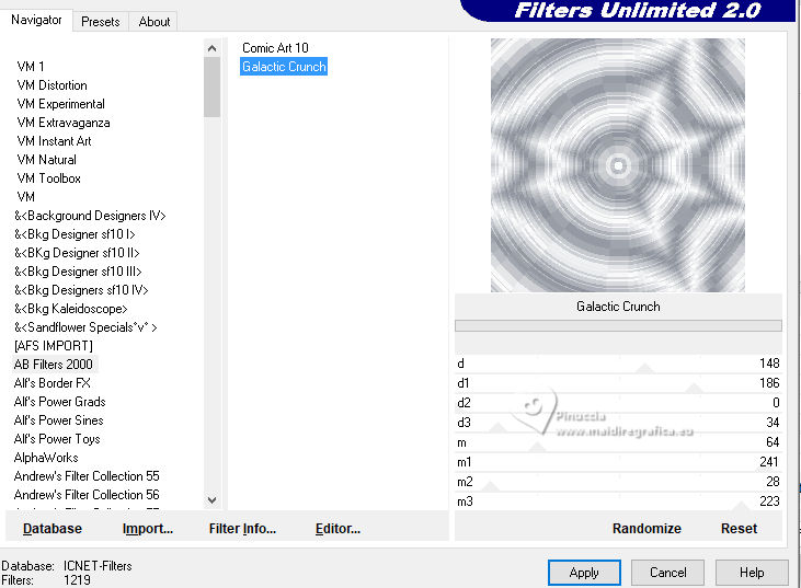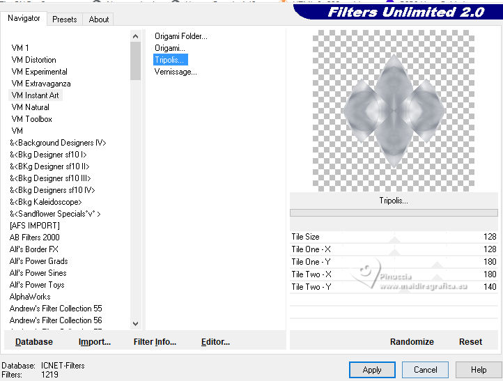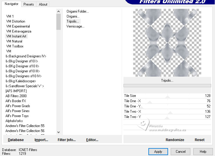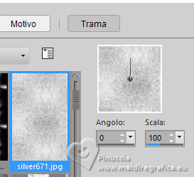 qui puoi trovare qualche risposta ai tuoi dubbi. Se l'argomento che ti interessa non è presente, ti prego di segnalarmelo. Questo tutorial è stato realizzato con PSP2020 e tradotto con PSPX9, ma può essere realizzato anche con le altre versioni di PSP. Dalla versione X4, il comando Immagine>Rifletti è stato sostituito con Immagine>Capovolgi in orizzontale, e il comando Immagine>Capovolgi con Immagine>Capovolgi in verticale. Nelle versioni X5 e X6, le funzioni sono state migliorate rendendo disponibile il menu Oggetti. Con la nuova versione X7, sono tornati Rifletti>Capovolgi, ma con nuove varianti. Vedi la scheda sull'argomento qui Occorrente: 1 tube a scelta Il resto del materiale ![]() in questa pagina trovi i links ai siti dei creatori di tubes) Filtri: in caso di dubbi, ricorda di consultare la mia sezione filtri qui Filters Unlimited 2.0 qui AB Filters 2000 - Galactic Crunch (da importare in Unlimited) qui Mura's Meister - Perspective Tiling qui Flaming Pear - Flexify 2 qui VM Instant Art - Tripolis qui AFH - AFH Beveler 2.0b (da importare in Unlimited) qui I filtri VM Instant Art si possono usare da soli o importati in Filters Unlimited (come fare vedi qui) Se un filtro fornito appare con questa icona ![]() non esitare a cambiare modalità di miscelatura e opacità secondo i colori utilizzati. ![]() Metti la selezione nella cartella Selezioni. Apri la maschera e il motivo argento in PSP e minimizzali con il resto del materiale 1. Apri una nuova immagine trasparente 900 x 900 pixels. Scegli due colori dal tuo tube. Per l'esempio: Imposta il colore di primo piano con #8c919b. e il colore di sfondo con #ffffff. ![]() 2. Passa il colore di primo piano a Gradiente di primo piano/sfondo, stile Rettangolare. ![]() Riempi l'immagine trasparente con il gradiente.3. Effetti>Plugins>Filters Unlimited 2.0 - AB Filters 2000 - Galactic Crunch ![]() Livelli>Duplica. Immagine>Rifletti>Rifletti orizzontalmente. Abbassa l'opacità di questo livello al 50%. Livelli>Unisci>Unisci giù. 4. Livelli>Duplica. Immagine>Ruota per gradi - 90 gradi a sinistra. ![]() Abbassa l'opacità di questo livello al 50%. Livelli>Unisci>Unisci giù. 5. Livelli>Nuovo livello raster. Passa il colore di primo piano a Colore. Riempi il livello con il colore di primo piano.Livelli>Nuovo livello maschera>Da immagine Apri il menu sotto la finestra di origine e vedrai la lista dei files aperti. Seleziona la maschera Gabry-mask-21654 ![]() Livelli>Unisci>Unisci gruppo. Livelli>Unisci>Unisci giù. Regola>Messa a fuoco>Metti a fuoco. 6. Livelli>Duplica. Immagine>Ridimensiona, al 70%, tutti i livelli non selezionato. 7. Effetti>Effetti geometrici>Cilindro orizzontale. ![]() 8. Effetti>Effetti geometrici>Cerchio. ![]() 9. Effetti>Plugins>Filters Unlimited 2.0 - VM Instant Art - Tripolis ![]() 10. Livelli>Duplica. Effetti>Plugins>Filters Unlimited 2.0 - VM Instant Art - Tripolis, con i settaggi standard. ![]() 11. Effetti>Plugins>Flaming Pear - Flexify 2. ![]() 12. Immagine>Ridimensiona, al 50%, tutti i livelli non selezionato. 13. Immagine>Ruota per gradi - 45 gradi a sinistra. ![]() 14. Effetti>Effetti di immagine>Scostamento. ![]() Regola>Messa a fuoco>Accentua messa a fuoco. 15. Effetti>Effetti 3D>Sfalsa ombra, colore nero. ![]() Livelli>Duplica. Immagine>Rifletti>Rifletti orizzontalmente. 16. Attiva il livello Raster 1. Livelli>Duplica. 17. Effetti>Plugins>Mura's Meister - Perspective Tiling ![]() Effetti>Effetti 3D>Sfalsa ombra, con i settaggi precedenti. ![]() 18. Livelli>Nuovo livello raster. Selezione>Carica/Salva selezione>Carica selezione da disco. Cerca e carica la selezione 01ornament301-romana1 ![]() 19. Passa il colore di primo piano a Motivi e seleziona il motivo silver671 ![]() Riempi la selezione con il motivo argento.Selezione>Deseleziona. 20. Effetti>Effetti 3D>Sfalsa ombra, colore nero. ![]() 21. Attiva il livello superiore. Apri il tube principale e vai a Modifica>Copia. Torna al tuo lavoro e vai a Modifica>Incolla come nuovo livello. Immagine>Ridimensione, se necessario, tutti i livelli non selezionato. Regola>Messa a fuoco>Metti a fuoco. Posiziona correttamente il tube.Effetti>Effetti 3D>Sfalsa ombra, colore nero. ![]() 22. Attiva lo strumento Testo , scegli un font,e scrivi il tuo testo - io ho scritto I'm a white Tiger Lady Effetti>Effetti 3D>Sfalsa ombra, a scelta. Posiziona il testo come preferisci.23. Selezione>Seleziona tutto. Immagine>Aggiungi bordatura, 50 pixels, simmetriche, colore #8c919b. Selezione>Inverti. Effetti>Plugins>Filters Unlimited 2.0 - AFH - AFH Beveler 2.0b ![]() Selezione>Inverti. 24. Effetti>Effetti 3D>Ritaglio ![]() Selezione>Deseleziona. 25. Attiva lo strumento Testo , scegli un font,Scrivi il tuo nome, o aggiungi il tuo watermark. Effetti>Effetti 3D>Sfalsa ombra, a scelta. 26. Livelli>Unisci>Unisci tutto e salva in formato jpg. ![]() ![]() Le vostre versioni. Grazie ![]() Marygraphics ![]() Irene ![]() Se hai problemi o dubbi, o trovi un link non funzionante, o anche soltanto per un saluto, scrivimi. |