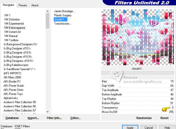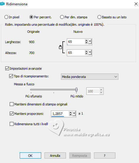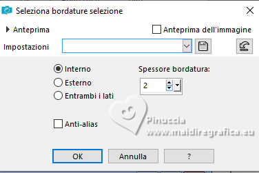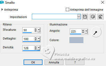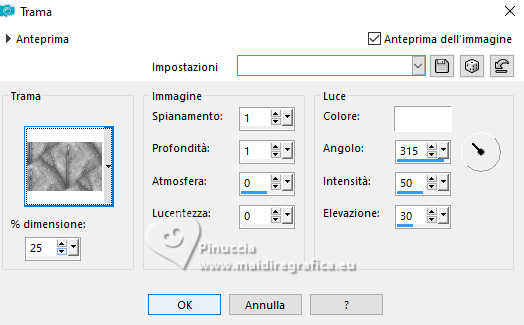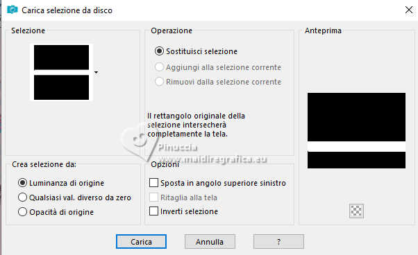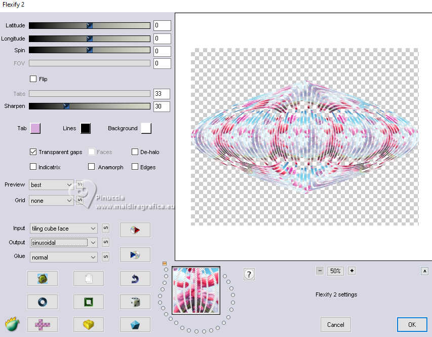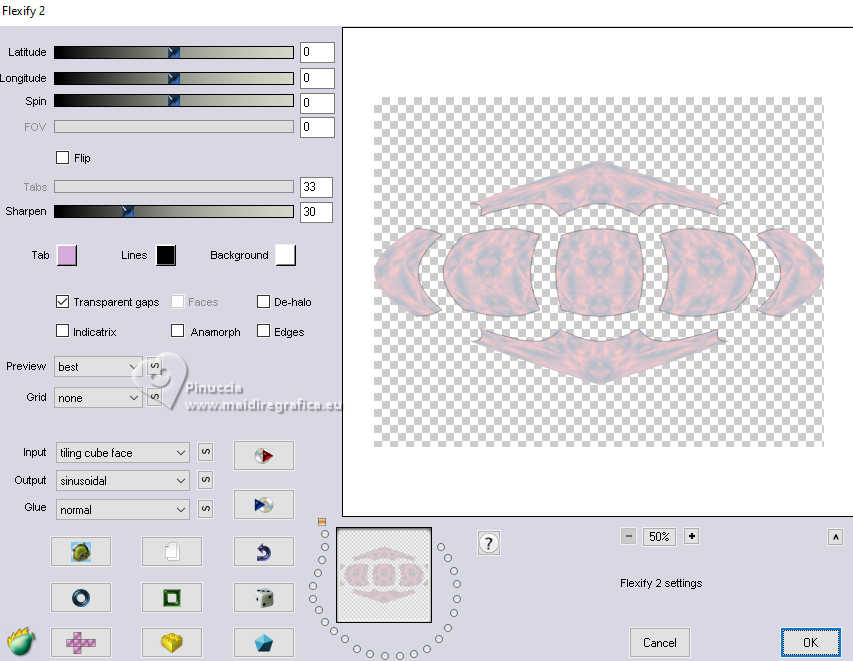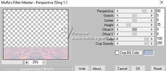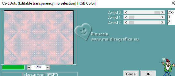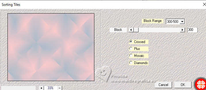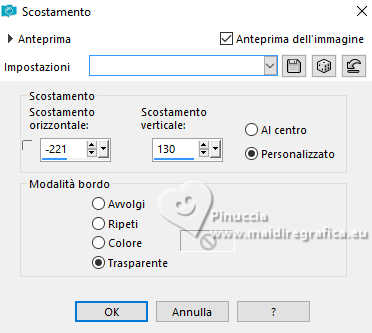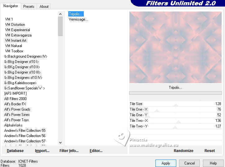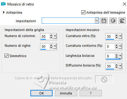 qui puoi trovare qualche risposta ai tuoi dubbi. Se l'argomento che ti interessa non è presente, ti prego di segnalarmelo. Questo tutorial è stato realizzato con PSP2020 e tradotto con PSPX9, ma può essere realizzato anche con le altre versioni di PSP. Dalla versione X4, il comando Immagine>Rifletti è stato sostituito con Immagine>Capovolgi in orizzontale, e il comando Immagine>Capovolgi con Immagine>Capovolgi in verticale. Nelle versioni X5 e X6, le funzioni sono state migliorate rendendo disponibile il menu Oggetti. Con la nuova versione X7, sono tornati Rifletti>Capovolgi, ma con nuove varianti. Vedi la scheda sull'argomento qui Occorrente: Tubes a scelta: 1 tube principale 1 tube accessorio 1 immagine di sfondo Il resto del materiale qui Per i tubes usati grazie Wieske e AigenbyCaz (in questa pagina trovi i links ai siti dei creatori di tubes) Filtri: in caso di dubbi, ricorda di consultare la mia sezione filtri qui Filters Unlimited 2.0 qui Mehdi - Sorting Tiles qui VM Instant Art - Tripolis qui Flaming Pear - Flexify 2 qui VM Extravaganza - Shoutin qui Simple - Zoom out and flip qui Carolaine and Sensibility - CS-LDots qui Mura's Meister - Perspective Tiling qui I filtri VM Extravaganza, Simple e VM Instant Art si possono usare da soli o importati in Filters Unlimited (come fare vedi qui) Se un filtro fornito appare con questa icona ![]() non esitare a cambiare modalità di miscelatura e opacità secondo i colori utilizzati. Nelle ultime versioni di PSP non c'è il gradiente di primo piano/sfondo (Corel_06_029) Puoi usare i gradienti delle versioni precedenti. Trovi qui i gradienti Corel X. ![]() Metti la selezione nella cartella Selezioni. 1. Apri una nuova immagine trasparente 900 x 700 pixels. Scegli due colori dal tuo tube Per l'esempio: Imposta il colore di primo piano con #ffcbc9, e il colore di sfondo con #acbcccc ![]() 2. Passa il colore di primo piano a Gradiente di primo piano/sfondo, stile Sprazzo di luce. ![]() Riempi l'immagine trasparente con il gradiente.3. Effetti>Effetti di riflesso>Specchio rotante. ![]() Livelli>Duplica. Immagine>Rifletti>Rifletti verticalmente (Immagine>Capovolgi). Abbassa l'opacità di questo livello al 50%. Livelli>Unisci>Unisci giù. 4. Effetti>Plugins>Mehdi - Sorting Tiles. ![]() 5. Effetti>Plugins>Filters Unlimited 2.0 - Simple - Zoom Out and Flip. ![]() 6. Effetti>Plugins>Filters Unlimited 2.0 - VM Instant Art - Tripolis. ![]() Effetti>Effetti di bordo>Aumenta di più. 7. Livelli>Nuovo livello raster. Selezione>Seleziona tutto. Apri l'immagine di sfondo e vai a Modifica>Copia. Torna al tuo lavoro e vai a Modifica>Incolla nella selezione. Selezione>Deseleziona. Effetti>Plugins>Filters Unlimited 2.0 - VM Extravaganza - Shoutin ![]() 8. Effetti>Plugins>Flaming Pear - Flexify 2. ![]() 9. Attiva il livello Raster 1. Livelli>Duplica. Livelli>Disponi>Porta in alto. Immagine>Ridimensiona, al 70%, tutti i livelli non selezionato. 10. Effetti>Plugins>Flaming Pear - Flexify ![]() Livelli>Unisci>Unisci giù. 11. Attiva il livello Raster 1. Effetti>Plugins>Carolaine and Sensibility - CS-LDots ![]() 12. Attiva nuovamente il livello superiore. Effetti>Effetti 3D>Sfalsa ombra. ![]() 13. Immagine>Ridimensiona, al 65%, tutti i livelli non selezionato. ![]() 14. Immagine>Ruota per gradi - 45 gradi a sinistra. ![]() 15. Effetti>Effetti di immagine>Scostamento. ![]() Livelli>Duplica. Immagine>Rifletti>Rifletti orizzontalmente. 16. Attiva il livello Raster 1. Modifica>Copia Livelli>Nuovo livello raster. Selezione>Carica/Salva selezione>Carica selezione da disco. Cerca e carica la selezione 01ornament76-romana1 ![]() Modifica>Incolla nella selezione 17. Effetti>Effetti artistici>Smalto, colore di sfondo. ![]() Regola>Messa a fuoco>Metti a fuoco. 18. Selezione>Modifica>Seleziona bordature selezione. ![]() Riempi la selezione con il colore di sfondo.Effetti>Effetti 3D>Sfalsa ombra, con i settaggi precedenti. ![]() Selezione>Deseleziona. 19. Attiva il livello Raster 1. Livelli>Duplica. Effetti>Plugins>Mura's Meister - Perspective Tiling. ![]() Effetti>Effetti 3D>Sfalsa ombra, colore nero. ![]() 20. Attiva nuovamente il livello superiore. Attiva lo strumento Testo ![]() Scrivi il tuo testo - io ho scritto Love. Effetti>Effetti 3D>Sfalsa ombra, colore nero. ![]() Io ho ruotato il testo: Immagine>Ruota per gradi - 30 gradi a sinistra. Sposta questo testo in alto a sinistra.21. Attiva nuovamente lo strumento Testo ![]() Scrivi il tuo testo - io ho scritto ancora Love Effetti>Effetti 3D>Sfalsa ombra, colore nero. ![]() Io ho ruotato il testo: Immagine>Ruota per gradi - 30 gradi a destra. Posizione il testo in alto a sinistra, vedi il mio esempio.22. Apri il tuo tube e vai a Modifica>Copia. Torna al tuo lavoro e vai a Modifica>Incolla come nuovo livello. Immagine>Ridimensiona, quanto necessario, tutti i livelli non selezionato. Regola>Messa a fuoco>Metti a fuoco. Sposta il tube a destra.Effetti>Effetti 3D>Sfalsa ombra, colore nero. ![]() 23. Apri il tuo tube accessorio e vai a Modifica>Copia. Torna al tuo lavoro e vai a Modifica>Incolla come nuovo livello. Sposta il tube a sinistra.Effetti>Effetti 3D>Sfalsa ombra, con i settaggi precedenti. ![]() 24. Immagine>Aggiungi bordatura, 1 pixel, simmetriche, colore di sfondo #acbccc. Selezione>Seleziona tutto. Immagine>Aggiungi bordatura, 50 pixels, simmetriche, colore di primo piano #ffcbc9. Selezione>Inverti. 25. Effetti>Effetti di trama>Mosaico di vetro. ![]() 26. Effetti>Effetti di trama>Trama - trama a scelta ![]() 27. Effetti>Effetti 3D>Smusso a incasso. ![]() Selezione>Deseleziona. 28. Attiva lo strumento Testo ![]() Scrivi il tuo nome o, se preferisci, aggiungi il tuo watermark. Effetti>Effetti 3D>Sfalsa ombra, a scelta. 29. Immagine>Aggiungi bordatura, 1 pixel, simmetriche, colore di sfondo #acbccc. Salva in formato jpg. ![]() Le vostre versioni. Grazie ![]() Angela ![]() Se hai problemi o dubbi, o trovi un link non funzionante, o anche soltanto per un saluto, scrivimi. 18 Gennaio 2025 |
