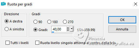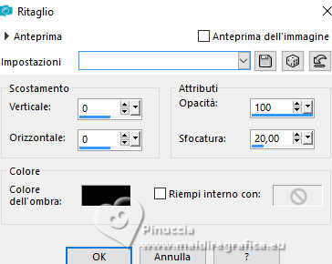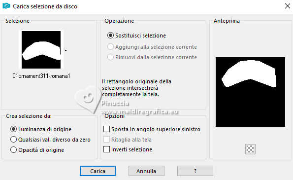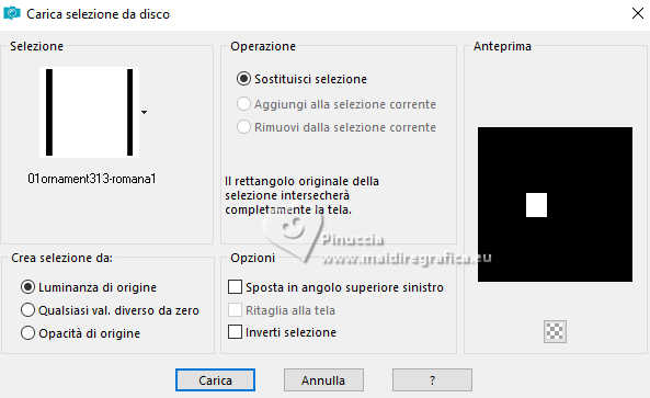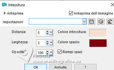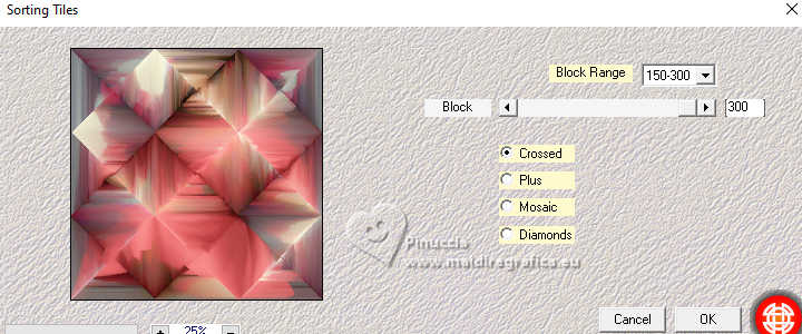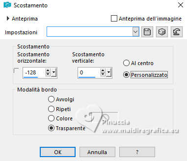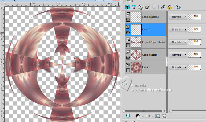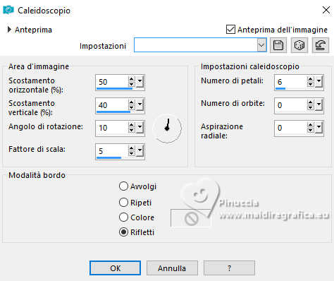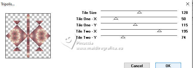 qui puoi trovare qualche risposta ai tuoi dubbi. Se l'argomento che ti interessa non è presente, ti prego di segnalarmelo. Questo tutorial è stato realizzato con PSP2020 e tradotto con PSPX9, ma può essere realizzato anche con le altre versioni di PSP. Dalla versione X4, il comando Immagine>Rifletti è stato sostituito con Immagine>Capovolgi in orizzontale, e il comando Immagine>Capovolgi con Immagine>Capovolgi in verticale. Nelle versioni X5 e X6, le funzioni sono state migliorate rendendo disponibile il menu Oggetti. Con la nuova versione X7, sono tornati Rifletti>Capovolgi, ma con nuove varianti. Vedi la scheda sull'argomento qui Occorrente: 1 tube 2 tubes accessori 1 immagine di sfondo Il resto del materiale ![]() Il tube e gli elementi scrap del mio esempio sono di Additive Pleasures. Grazie. in questa pagina trovi i links ai siti dei creatori di tubes) Filtri: in caso di dubbi, ricorda di consultare la mia sezione filtri qui Filters Unlimited 2.0 qui Mehdi - Sorting Tiles qui Flaming Pear - Flexify 2 qui VM Instant Art - Tripolis qui I filtri VM Instant Art si possono usare da soli o importati in Filters Unlimited (come fare vedi qui) Se un filtro fornito appare con questa icona ![]() non esitare a cambiare modalità di miscelatura e opacità secondo i colori utilizzati. ![]() Metti le selezioni nella cartella Selezioni. 1. Apri una nuova immagine trasparente 900 x 900 pixels. Scegli due colori dal tuo tube, per l'esempio colore di primo piano #ef7977 colore di sfondo #f5e0cd. ![]() 2. Selezione>Seleziona tutto. Apri la tua immagine e vai a Modifica>Copia. Torna al tuo lavoro e vai a Modifica>Incolla nella selezione. Apri il tuo tube e vai a Modifica>Copia. Torna al tuo lavoro e vai a Modifica>Incolla nella selezione. Selezione>Deseleziona. 3. Effetti>Plugins>Mehdi - Sorting Tiles. ![]() 4. Effetti>Effetti di riflesso>Caleidoscopio. ![]() 5. Effetti>Effetti di immagine>Motivo unico, con i settaggi standard. ![]() 6. Livelli>Duplica. Immagine>Ridimensiona, al 60%, tutti i livelli non selezionato. 7. Effetti>Plugins>VM Instant Art - Tripolis ![]() ho rifatto il tutorial moltissime volte perchè mai soddisfatta della resa dei colori. Per questo ho usato il filtro da solo, per non reimpostare i settaggi, perchè Unlimited non li tiene in memoria ![]() 8. Effetti>Plugins>Flaming Pear - Flexify 2 img src="valentin26//flexify.jpg"> 9. Immagine>Ruota per gradi - 40 gradi a destra ![]() Livelli>Duplica. Immagine>Rifletti>Rifletti verticalmente (Immagine>Capovolgi). Livelli>Unisci>Unisci giù. 10. Livelli>Duplica. Immagine>Ruota per gradi - 90 gradi a destra ![]() 11. Selezione>Carica/Salva Selezione>Carica Selezione da disco. Cerca e carica la selezione 01ornament311-romana1 ![]() Premi sulla tastiera il tasto CANC ![]() 12. Selezione>Carica/Salva Selezione>Carica Selezione da disco. Cerca e carica la selezione 01ornament312-romana1 la nuova selezione sostituirà la precedente ![]() Premi sulla tastiera il tasto CANC. Selezione>Deseleziona. 13. Attiva il livello sottostante. Selezione>Carica/Salva Selezione>Carica Selezione da disco. Cerca e carica la selezione 01ornament313-romana1 ![]() Modifica>Copia. Selezione>Deseleziona. 14. Attiva il livello superiore. Modifica>Incolla come nuovo livello. Effetti>Effetti di immagine>Scostamento. ![]() Livelli>Duplica. Immagine>Rifletti>Rifletti orizzontalmente. 15. Effetti>Effetti>Effetti 3D>Sfalsa ombra, colore nero. ![]() Attiva il livello sottostante: Modifica>Ripeti Sfalsa ombra. Se chiudi il livello inferiore, dovresti avere questo. ![]() 16. Attiva il livello superiore. Apri il tuo primo tube accessorio e vai a Modifica>Copia. Torna al tuo lavoro e vai a Modifica>Incolla come nuovo livello. Immagine>Ridimensiona, se necessario. Regola>Messa a fuoco>Accentua messa a fuoco. Sposta il tube in alto a sinistra.Effetti>Effetti 3D>Sfalsa ombra, colore nero. ![]() 17. Apri il tuo secondo tube accessorio e vai a Modifica>Copia. Torna al tuo lavoro e vai a Modifica>Incolla come nuovo livello. Immagine>Ridimensiona, se necessario. Regola>Messa a fuoco>Accentua messa a fuoco. Sposta il tube in basso a sinistra.Effetti>Effetti 3D>Sfalsa ombra, colore nero. ![]() 18. Apri il tuo tube e vai a Modifica>Copia. Torna al tuo lavoro e vai a Modifica>Incolla come nuovo livello. Immagine>Ridimensiona, se necessario. Regola>Messa a fuoco>Metti a fuoco. Sposta il tube a destra.Effetti>Effetti 3D>Sfalsa ombra, colore nero. ![]() 19. Selezione>Seleziona tutto. Immagine>Aggiungi bordatura, 50 pixels, simmetriche, colore di primo piano #ef7977. Selezione>Inverti. Effetti>Effetti di trama>Intessitura colore intessitura: colore chiaro di primo piano colore spazio: per il mio esempio ho usato un colore un po' più scuro del colore di sfondo. ![]() Regola>Messa a fuoco>Metti a fuoco. 20. Selezione>Inverti. Effetti>Effetti 3D>Ritaglio. ![]() Selezione>Deseleziona. 21. Attiva lo strumento Testo ![]() Scrivi il tuo nome o aggiungi il tuo watermark. Effetti>Effetti 3D>Sfalsa ombra, a scelta. 22. Livelli>Unisci>Unisci tutto. Salva in formato jpg. ![]() Le vostre versioni. Grazie ![]() Se hai problemi o dubbi, o trovi un link non funzionante, o anche soltanto per un saluto, scrivimi. |