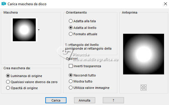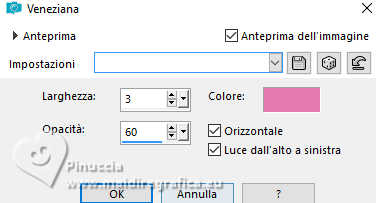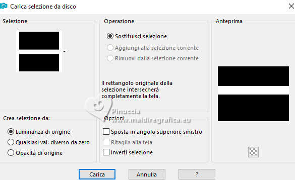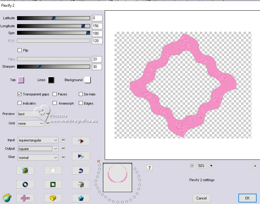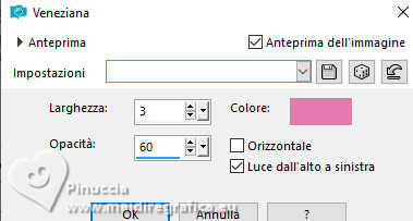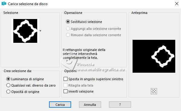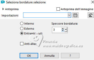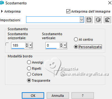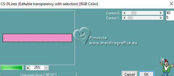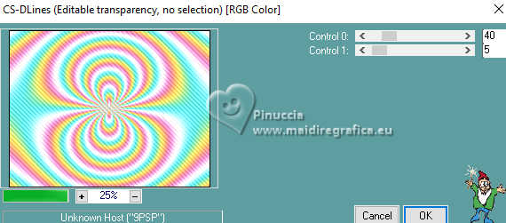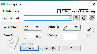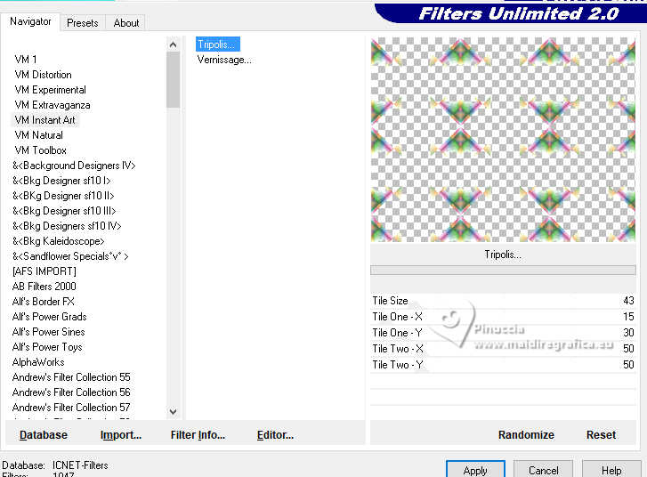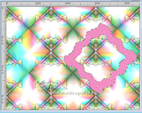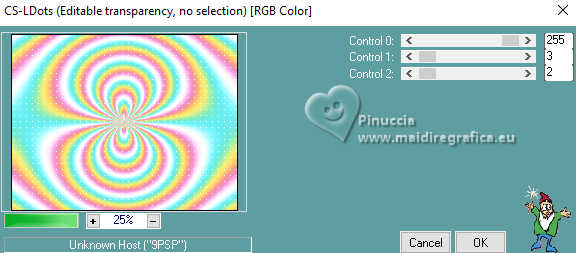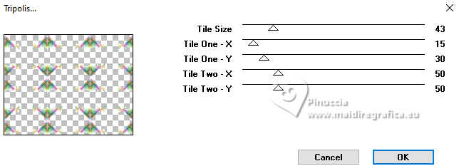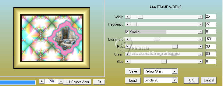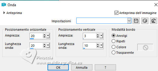 qui puoi trovare qualche risposta ai tuoi dubbi. Se l'argomento che ti interessa non è presente, ti prego di segnalarmelo. Questo tutorial è stato realizzato con PSP2020 e tradotto con PSPX9, ma può essere realizzato anche con le altre versioni di PSP. Dalla versione X4, il comando Immagine>Rifletti è stato sostituito con Immagine>Capovolgi in orizzontale, e il comando Immagine>Capovolgi con Immagine>Capovolgi in verticale. Nelle versioni X5 e X6, le funzioni sono state migliorate rendendo disponibile il menu Oggetti. Con la nuova versione X7, sono tornati Rifletti>Capovolgi, ma con nuove varianti. Vedi la scheda sull'argomento qui Occorrente: Tubes a scelta: 1 immagine di sfondo 1 tube principale Il resto del materiale qui Per il mio esempio ho usato un tube di Tammy's Welt. Grazie. (in questa pagina trovi i links ai siti dei creatori di tubes) Filtri: in caso di dubbi, ricorda di consultare la mia sezione filtri qui Filters Unlimited 2.0 qui Mehdi - Wavy Lab 1.1. qui Mehdi - Sorting Tiles qui Flaming Pear - Flexify 2 qui VM Instant Art - Tripolis qui Carolaine and Sensibility - CS-LDots, CS-DLines qui AAA Frames - Frame Works qui I filtri VM Instant Art si possono usare da soli o importati in Filters Unlimited (come fare vedi qui) Se un filtro fornito appare con questa icona ![]() non esitare a cambiare modalità di miscelatura e opacità secondo i colori utilizzati. ![]() Metti le selezioni nella cartella Selezioni. Metti la maschera nella cartella Maschere. 1. Apri una nuova immagine trasparente 900 x 700 pixels. Scegli due colori dal tuo tube Per l'esempio: Imposta il colore di primo piano con #e47aad, e il colore di sfondo con #52d9db ![]() 2. Effetti>Plugins>Mehdi - Wavy Lab 1.1. Questo filtro crea gradienti con i colori della paletta: il primo è il colore di sfondo, il secondo quello di primo piano. Cambia gli ultimi due colori creati dal filtri con colori a tuo piacimento; per l'esempio colore 3 #f7d057, colore 4 bianco #ffffff ![]() 3. Effetti>Plugins>Carolaine and Sensibility - CS-DLines ![]() 4. Effetti>Plugins>Carolaine and Sensibility - CS-LDots ![]() 5. Effetti>Plugins>Mehdi - Sorting Tiles. ![]() Livelli>Duplica. 6. Effetti>Effetti artistici>Topografia. ![]() 7. Attiva lo strumento Bacchetta magica , sfumatura e tolleranza 0,e clicca nelle parti bianche dell'immagine per selezionarle. ![]() Premi sulla tastiera il tasto CANC ![]() Selezione>Deseleziona. 8. Immagine>Ridimensiona, al 50%, tutti i livelli non selezionato. ![]() 9. Effetti>Plugins>VM Instant Art - Tripolis. ![]() se vuoi, puoi usare il filtro in Unlimited, che però non tiene in memoria i settaggi, quando non sono settaggi standard. Per questo, poiché rifaccio sempre il tutorial, preferisco usare il filtro solo ![]() 10. Effetti>Effetti 3D>Sfalsa ombra, colore nero. ![]() 11. Livelli>Nuovo livello raster. Selezione>Carica/Salva selezione>Carica selezione da disco Cerca e carica la selezione 01ornament41-romana1 ![]() Riempi la selezione con il colore di primo piano.12. Effetti>Plugins>Carolaine and Sensibility - CS-DLines, con i settaggi precedenti ![]() Selezione>Deseleziona. 13. Effetti>Effetti di distorsione>Onda. ![]() 14. Effetti>Plugins>Flaming Pear - Flexify 2. ![]() 15. Immagine>Ridimensiona, al 70%, tutti i livelli non selezionato. ![]() 16. Effetti>Effetti di immagine>Scostamento. ![]() 17. Livelli>Nuovo livello raster. Selezione>Carica/Salva selezione>Carica selezione da disco Cerca e carica la selezione 01ornament87-romana1 ![]() Se tutto è ok ![]() 18. Selezione>Modifica>Seleziona bordature selezione. ![]() Riempi la selezione con il colore di sfondo.Effetti>Effetti 3D>Sfalsa ombra, colore nero. ![]() Selezione>Deseleziona. 19. Apri la tua immagine di sfondo. Livelli>Carica/Salva maschera>Carica maschera da disco. Cerca e carica la maschera 20-20. ![]() Livelli>Unisci>Unisci gruppo. Modifica>Copia. Torna al tuo lavoro e vai a Modifica>Incolla come nuovo livello. Immagine>Ridimensiona, quanto necessario. Posiziona il tube nella cornice.Livelli>Disponi>Sposta giù. 20. Immagine>Aggiungi bordatura, 1 pixel, simmetriche, colore di primo piano #e47aad. Selezione>Seleziona tutto. Immagine>Aggiungi bordatura, 50 pixels, simmetriche, colore di sfondo #52d9db. 21. Effetti>Effetti di immagine>Motivo unico, con i settaggi standard. ![]() 22. Selezione>Inverti. Regola>Sfocatura>Sfocatura gaussiana - raggio 15. ![]() 23. Effetti>Effetti di trama>Veneziana, colore di primo piano ![]() Ripeti l'Effetto Veneziana, orizzontale non selezionato. ![]() 24. Effetti>Plugins>AAA Frames - AAA Frame Works. ![]() 25. Selezione>Inverti. Effetti>Effetti 3D>Ritaglio, colore di sfondo. ![]() Effetti>Effetti 3D>Sfalsa ombra, colore nero. ![]() Selezione>Deseleziona. 26. Apri il tuo tube e vai a Modifica>Copia. Torna al tuo lavoro e vai a Modifica>Incolla come nuovo livello. Immagine>Ridimensiona, quanto necessario, tutti i livelli non selezionato. Regola>Messa a fuoco>Metti a fuoco. Sposta il tube a sinistra.Effetti>Effetti 3D>Sfalsa ombra, colore nero. ![]() 27. Attiva lo strumento Testo ![]() Scrivi il tuo nome o, se preferisci, aggiungi il tuo watermark. Effetti>Effetti 3D>Sfalsa ombra, a scelta. 28. Livelli>Unisci>Unisci tutto e salva in formato jpg. Per i tubes di questo esempio grazie ElFairy ![]() ![]() Se hai problemi o dubbi, o trovi un link non funzionante, o anche soltanto per un saluto, scrivimi. 28 Gennaio 2025 |