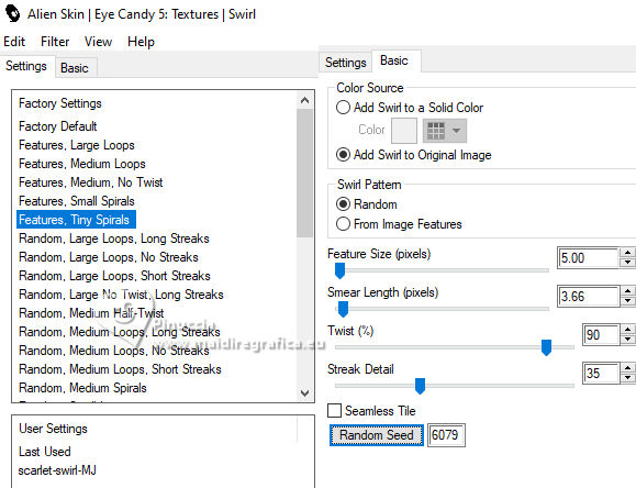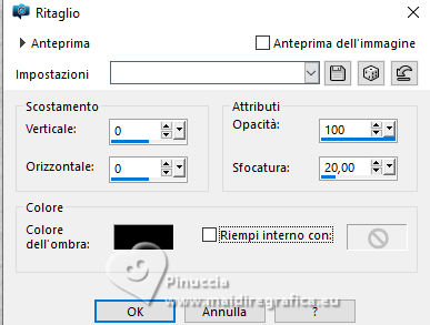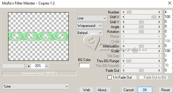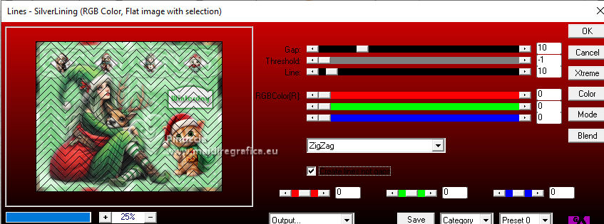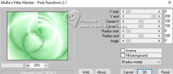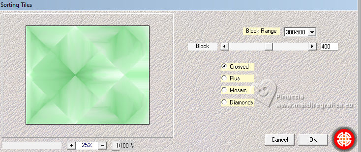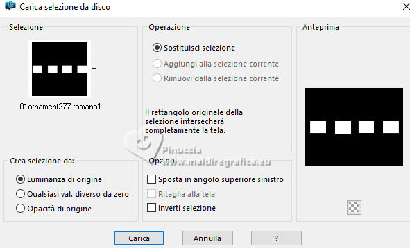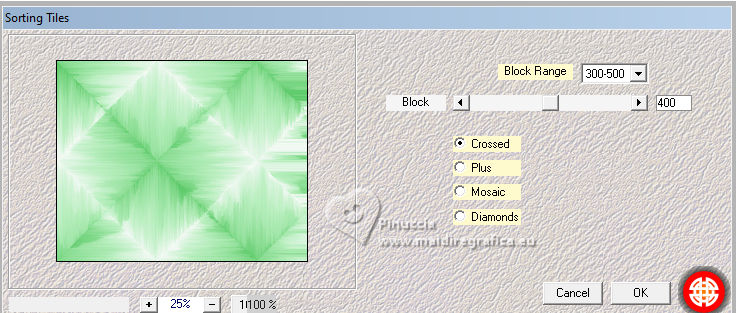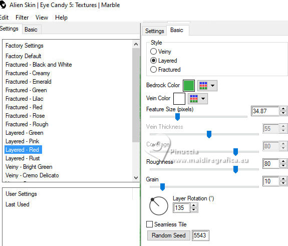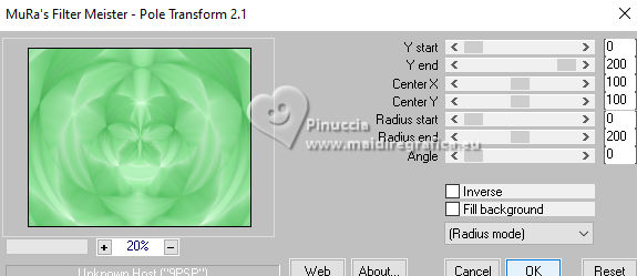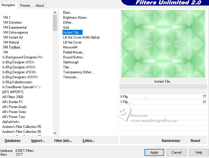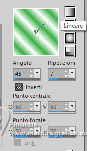 qui puoi trovare qualche risposta ai tuoi dubbi. Se l'argomento che ti interessa non è presente, ti prego di segnalarmelo. Questo tutorial è stato realizzato con PSP2020 e tradotto con PSPX9, ma può essere realizzato anche con le altre versioni di PSP. Dalla versione X4, il comando Immagine>Rifletti è stato sostituito con Immagine>Capovolgi in orizzontale, e il comando Immagine>Capovolgi con Immagine>Capovolgi in verticale. Nelle versioni X5 e X6, le funzioni sono state migliorate rendendo disponibile il menu Oggetti. Con la nuova versione X7, sono tornati Rifletti>Capovolgi, ma con nuove varianti. Vedi la scheda sull'argomento qui Occorrente: Tubes a scelta: 1 tube principale 5 tubes accessori Il resto del materiale qui Esempi con miei tubes da immagini Pinterest Filtri: in caso di dubbi, ricorda di consultare la mia sezione filtri qui Alien Skin Eye Candy 5 Texture - Marble, Swirl qui Flaming Pear - Flexify 2 qui Mura's Meister - Copies, Pole Transform, Perspective Tiling qui Mehdi - Sorting Tiles qui Carolaine and Sensibility - CS-LDots, CS-DLines qui AP 01 [Innovations] qui VM Toolbox - Instant Tile qui Xero - Fritillary qui ![]() non esitare a cambiare modalità di miscelatura e opacità secondo i colori utilizzati. Nelle ultime versioni di PSP non c'è il gradiente di primo piano/sfondo (Corel_06_029) Puoi usare i gradienti delle versioni precedenti. Trovi qui i gradienti Corel X. ![]() Metti le selezioni nella cartella Selezioni. Apri la maschera in PSP e minimizzala con il resto del materiale. 1. Apri una nuova immagine trasparente 1000 x 800 pixels. Scegli due colori dal tuo tube. Per l'esempio: Imposta il colore di primo piano con #2ea83b. e il colore di sfondo con #ffffff. ![]() 2. Passa il colore di primo piano a Gradiente di primo piano/sfondo, stile Lineare. ![]() Riempi l'immagine trasparente con il gradiente.3. Effetti>Plugins>Alien Skin Eye Candy 5 Textures - Marble. Bedrock Color: colore di primo piano Vein Color: colore di sfondo bianco ![]() Livelli>Duplica. Immagine>Rifletti>Rifletti orizzontalmente Abbassa l'opacità di questo livello al 50%. Livelli>Unisci>Unisci giù. 4. Effetti>Effetti di immagine>Motivo unico, con i settaggi standard. ![]() 5. Effetti>Plugins>Carolaine and Sensibility - CS-DLines ![]() 6. Effetti>Plugins>Carolaine and Sensibility - CS-LDots ![]() 7. Effetti>Plugins>Mehdi - Sorting Tiles ![]() 8. Effetti>Plugins>Mura's Meister - Pole Transform. ![]() 9. Effetti>Effetti di riflesso>Specchio rotante. ![]() 10. Livelli>Duplica. Immagine>Rifletti>Rifletti verticalmente (Immagine>Capovolgi). Abbassa l'opacità di questo livello al 50%. Livelli>Unisci>Unisci giù. Effetti>Plugins>Mehdi - Sorting Tiles, con i settaggi precedenti. ![]() 11. Effetti>Plugins>Filters Unlimited 2.0 - VM Toolbox - Instant Tile. ![]() 12. Effetti>Plugins>Mura's Meister - Pole Transform. ![]() Livelli>Duplica. Immagine>Rifletti>Rifletti orizzontalmente Abbassa l'opacità di questo livello al 50%. Livelli>Unisci>Unisci giù. 13. Livelli>Duplica. Immagine>Ridimensiona, al 45%, tutti i livelli non selezionato. ![]() 14. Effetti>Effetti geometrici>Inclina. ![]() Livelli>Duplica. Immagine>Rifletti>Rifletti orizzontalmente Livelli>Unisci>Unisci giù. 15. Effetti>Effetti geometrici>Cilindro orizzontale. ![]() 16. Livelli>Duplica. Effetti>Plugins>Flaming Pear - Flexify 2 ![]() 17. Livelli>Duplica. Effetti>Plugins>Flaming Pear - Flexify 2. ![]() potresti avere un risultato differente 18. Immagine>Ridimensiona, al 40%, tutti i livelli non selezionato. ![]() 19. Effetti>Plugins>Mura's Meister - Copies. ![]() 20. Livelli>Nuovo livello raster. Selezione>Carica/Salva selezione>Carica selezione da disco. Cerca e carica la selezione 01ornament277-romana1 ![]() Riempi la selezione con il colore di sfondo.21. Effetti>Plugins>Xero - Fritillary ![]() Regola>Messa a fuoco>Accentua messa a fuoco. Selezione>Deseleziona. Livelli>Disponi>Sposta giù. 22. Copia/incolla come nuovo livello i tuoi 4 tubes accessori. Ridimensionali a tuo piacimento. Posiziona i tube nei riquadri uno alla volta, vedi il mio esempio.Regola>Messa a fuoco>Metti a fuoco. Effetti>Effetti 3D>Sfalsa ombra, colore nero. ![]() Attiva il livello superiore dei quattro tubes. Livelli>Unisci>Unisci giù - 4 volte e avrai i tube e lo sfondo bianco in un unico livello. 23. Attiva il livello superiore. Effetti>Effetti 3D>Sfalsa ombra, colore nero. ![]() Livelli>Unisci>Unisci giù. 24. Effetti>Effetti di immagine>Scostamento. ![]() 25. Attiva il livello inferiore, Raster 1. Livelli>Duplica. Effetti>Plugins>Mura's Meister - Perspective Tiling. ![]() Effetti>Effetti 3D>Sfalsa ombra, colore nero. ![]() 26. Attiva il livello superiore. Selezione>Seleziona tutto. Apri l'immagine della neve ![]() Modifica>Copia. Torna al tuo lavoro e vai a Modifica>Incolla nella selezione. Selezione>Deseleziona. Effetti>Effetti 3D>Sfalsa ombra, colore bianco. ![]() 27. Apri il quinto tube accessorio e vai a Modifica>Copia. Torna al tuo lavoro e vai a Modifica>Incolla come nuovo livello. Immagine>Ridimensiona, se necessario. Regola>Messa a fuoco>Metti a fuoco. Sposta il tube in basso a destra.Effetti>Effetti 3D>Sfalsa ombra, colore nero. ![]() 28. Apri il tuo tube principale e vai a Modifica>Copia. Torna al tuo lavoro e vai a Modifica>Incolla come nuovo livello. Immagine>Ridimensiona, se necessario. Regola>Messa a fuoco>Metti a fuoco. Sposta il tube a sinistra.Effetti>Effetti 3D>Sfalsa ombra, colore nero. ![]() 29. Livelli>Nuovo livello raster. Selezione>Carica/Salva selezione>Carica selezione da disco. Cerca e carica la selezione 01ornament278-romana1 ![]() Passa il colore di primo piano a Colore. Riempi la selezione con il colore di primo piano.Selezione>Modifica>Contrai - 5 pixels. Riempi la selezione con il colore di sfondo.Effetti>Effetti 3D>Sfalsa ombra, colore nero. ![]() 30. Effetti>Plugins>Alien Skin Eye Candy 5 Texture - Swirl ![]() Selezione>Deseleziona. Effetti>Effetti 3D>Sfalsa ombra, colore nero. ![]() 31. Attiva lo strumento Testo ![]() scegli un