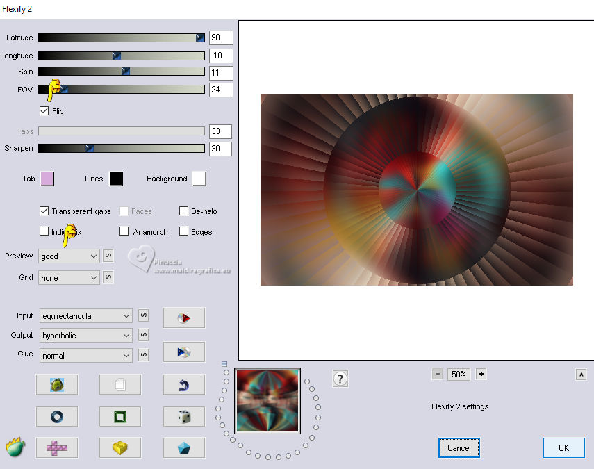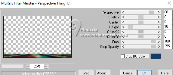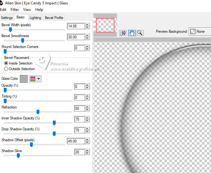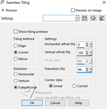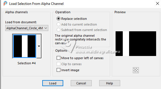 For this tutorial, you will need: ![]() The tube is by AnaMariaC. (The links of the tubemakers here). Plugins consult, if necessary, my filter section here Filters Unlimited 2.0 here Alien Skin Eye Candy 5 Impact - Glass here Mura's Meister - Perspective Tiling here Flaming Pear - Flexify 2 here Toadies - Weaver here Filters Toadies can be used alone or imported into Filters Unlimited. (How do, you see here) If a plugin supplied appears with this icon ![]() You can change Blend Modes according to your colors. In the newest versions of PSP, you don't find the foreground/background gradient (Corel_06_029). You can use the gradients of the older versions. The Gradient of CorelX here ![]() 1. Choose 2 colors to work. For me: Set your foreground color to #214774, and your background color to #ffdebd. ![]() Set your foreground color to a Foreground/Background Gradient, style Linear. ![]() 2. Open AlphaChannel_Circle This image, that will be the basis of your work, is not empty, but contains the selections saved to alpha channel. Flood Fill the transparent image with your Gradient.3. Selections>Select All. Open your tube TubeWoman_TubedAnaMaria ![]() Edit>Copy. Go back to your work and go to Edit>Paste Into Selection. Selections>Select None. 4. Effects>Image Effects>Seamless Tiling. ![]() 5. Adjust>Blur>Gaussian Blur, radius 10. ![]() 6. Effects>Plugins>Toadies - Weaver ![]() 7. Layers>Duplicate. Effects>Plugins>Flaming Pear- Flexify 2 Attention, please: Flip is checked ![]() 8. Effects>Edge Effects>Enhance More. Selections>Load/Save Selections>Load Selection From Alpha Channel. The selection Selection #1 is immediately available. You just have to click Load. ![]() 9. Selections>Promote Selection to Layer. Selections>Select None. Effects>Reflection Effects>Rotating Mirror, default settings ![]() 10. Effects>Plugins>Alien Skin Eye Candy 5 Impact - Glass. ![]() 11. Selections>Load/Save Selections>Load Selection From Alpha Channel Open the Selections Menu and load the selection Selection #2 ![]() ![]() Press CANC on the keyboard ![]() Selections>Invert. Selections>Promote Selection to Layer. Selections>Select None. Image>Mirror>Mirror Vertical. Layers>Merge>Merge Down. 12. Layers>New Raster Layer. Selections>Load/Save Selections>Load Selection From Alpha Channel. Open the Selections Menu and load the selection Selection #3 ![]() Again Effects>Plugins>Alien Skin Eye Candy 5 Impact - Glass, same settings. ![]() 13. Selections>Select None. We have this ![]() 14. Layers>Merge>Merge Down. Effects>Image Effects>Seamless Tiling ![]() 15. Activate the layer Copy of Raster 1. ![]() Effects>Image Effects>Seamless Tiling ![]() 16. Effects>Image Effects>Seamless Tiling, default settings. ![]() 17. Adjust>Sharpness>Sharpen More. Selections>Load/Save Selections>Load Selection From Alpha Channel. Open the Selections Menu and load the selection Selection #4 ![]() ![]() 18. Selections>Promote Selection to Layer. Selections>Select None. Effects>3D Effects>Drop Shadow, Color #000000 ![]() 19. Layers>Duplicate. Image>Mirror>Mirror Horizontal. Layers>Merge>Merge Down. Adjust>Sharpness>Sharpen More. Change the Blend Mode of this layer to Screen, opacity 100 We have this ![]() 20. Activate your bottom layer, Raster 1. Layers>Arrange>Bring to Top. Effects>Plugins>Mura's Meister - Perspective Tiling ![]() 21. Effects>Reflection Effects>Rotating Mirror. ![]() 22. Activate your Magic Wand Tool , Tolerance 0 and Feather 30.![]() Click on the transparent part to select it. Press 5 times CANC on the keyboard ![]() Don't forget to set again the Feather to 0. Selections>Select None. Adjust>Sharpness>Sharpen More. Effects>3D Effects>Drop Shadow - Color #000000 ![]() 23. Your tag and the layers: ![]() 24. Edit>Copy Special>Copy Merged. Image>Add Borders, 1 pixel, symmetric, color #000000. Selections>Select All. 25. Image>Add Borders, 50 pixels, symmetric, whatever color. Selection>Invert. Edit>Paste Into Selection. 26. Adjust>Blur>Gaussian Blur - radius 20. ![]() Selection>Invert. Selections>Promote Selection to Layer. Selections>Select None. 27. Selections>Load/Save Selections>Load Selection From Alpha Channel. Load again the selection Selection #1 ![]() 28. Selections>Promote Selection to Layer. Selections>Select None. Layers>Arrange>Move Down. Effects>Image Effects>Seamless Tiling, default settings ![]() Effects>3D Effects>Drop Shadow, color #000000 ![]() Your tag and the layers ![]() 29. Activate the top layer, Promoted Selection. Effects>3D Effects>Drop Shadow, color #000000. ![]() Edit>Repeat Drop Shadow. 30. Activate again the tube TubeWoman_TubedAnaMaria ![]() Edit>Copy. Go back to your work and go to Edit>Paste As New Layer. Move the tube to the left side.Effects>3D Effects>Drop Shadow, color #000000. ![]() 31. Open TituloCircle_byAnaMaria-Marcinha ![]() Edit>Copy. Go back to your work and go to Edit>Paste As New Layer. Move the tube to the right side.Effects>3D Effects>Drop Shadow, background color. ![]() 32. Image>Add Borders, 1 pixel, symmetric, color #000000. 33. Image>Resize, if you want. Sign your work or add your watermark and save as jpg. For the tube of this version thanks Kamil. ![]() ![]() Your versions. Thanks![]() Baby ![]() Baby2 ![]() Vanpires ![]() ![]() If you have problems or doubts, or you find a not worked link, or only for tell me that you enjoyed this tutorial, write to me. |