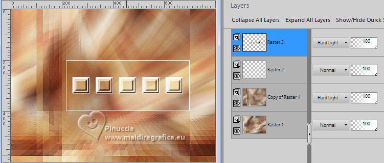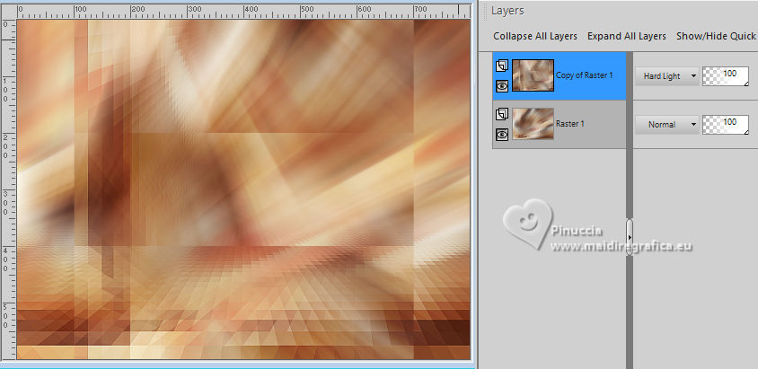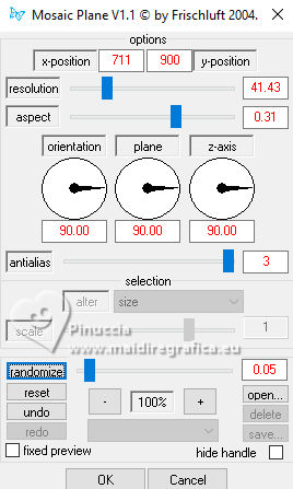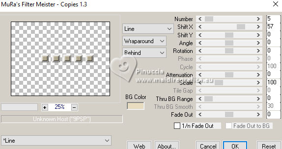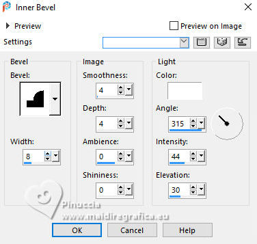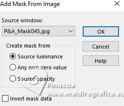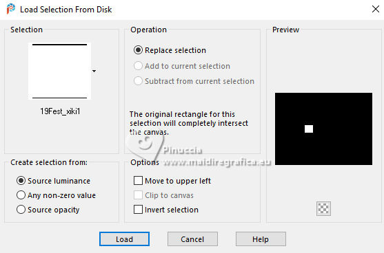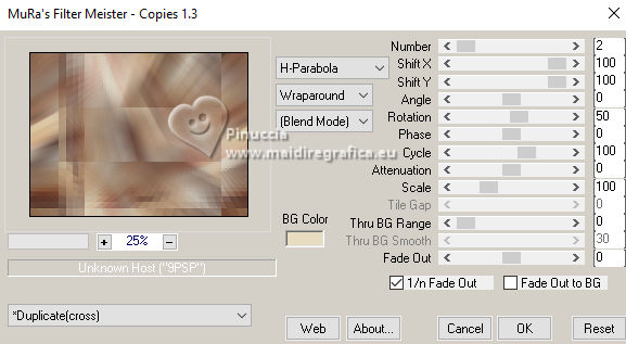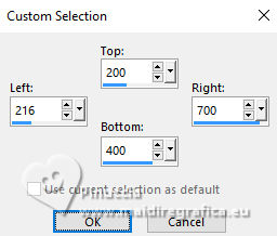 For this tutorial, you will need: ![]() (The links of the tubemakers here). ![]() consult, if necessary, my filter section here Frischluft - Mosaic Plane here Mura's Meister - Copies here You can also follow the video tutorial created by Soxikibem ![]() You can change Blend Modes according to your colors. In the newest versions of PSP, you don't find the foreground/background gradient (Corel_06_029). You can use the gradients of the older versions. The Gradient of CorelX here ![]() Copy the selection in the Selections Folder. Open the mask in PSP and minimize it with the rest of the material. 1.Choose 3 colors to work. Foreground: #34150f Background: #e8dcc0 ![]() Color 3: #ffffff 2. Open a new transparent image 800 x 600 pixels. Flood Fill the transparent image with your foreground color.Selections>Select All. 3. Open your tube or misted in the Carnival theme 018_TubeA_carnaval ![]() Erase the watermark and go to Edit>Copy. Go back to your work and go to Edit>Paste into Selection. Selections>Select None. 4. Effects>Image Effects>Seamless Tiling, default settings ![]() 5. Adjust>Blur>Radial Blur. ![]() 6. Effects>Plugins>Frischluft - Mosaic Plane V1.1 ![]() 7. Effects>Edge Effects>Enhance. 8. Layers>Duplicate. Effects>Plugins>Mura's Meister - Copies. ![]() 9. Layers>Properties>General>Blend Mode: Hard Light. author's note: in the second version I used Dodge ![]() 10. Activate the layer Raster 1. Adjust>Add/Remove Noise>Add Noise. ![]() 11. Activate the layer Copy of Raster 1. 12. Activate your Selection Tool ![]() (no matter the type of selection, because with the custom selection your always get a rectangle) clic on the Custom Selection ![]() and set the following settings. ![]() 13. Layers>New Raster Layer. Set your foreground color to white ![]() Flood Fill the layer with color white.14. Selections>Modify>Contract - 2 pixels. Press CANC on the keyboard ![]() Selections>Select None. 15. Layers>New Raster Layer. Selections>Load/Save Selections>Load Selection From Disk. Look for and load the selection 19Fest_xiki1 ![]() 16. Flood Fill the selection with color white.Selections>Modify>Contract - 10 pixels. Flood Fill the selection with your background color.17. Effects>3D Effects>Inner Bevel. ![]() Selections>Select None. 18. Effects>3D Effects>Inner Bevel, same settings. 19. Effects>Plugins>Mura's Meister - Copies. ![]() 20. Layers>Properties>General>Blend Mode: Hard Light. ![]() 21. Layers>Duplicate. Image>Resize, 30%, resize all layers not checked. Adjust>Sharpness>Sharpen. Pick Tool ![]() Position X: 226,00 - Position Y: 208,00. ![]() 22. Layers>Duplicate. Position X: 559,00 - Position Y: 372,00. ![]() 23. Activate the layer Copy of Raster 1. ![]() Layers>New Raster Layer. Flood Fill the selection with color white.24. Layers>New Mask layer>From image Open the menu under the source window and you'll see all the files open. Select the mask P&A_Mask045. ![]() Layers>Merge>Merge Group. Layers>Properties>General>Blend Mode: Dodge - Opacity: 70%. ![]() 25. Activate your top layer, Copy (2) of Raster 3. Edit>Paste as New Layer - your tube is still in memory. 26. Image>Resize, if necessary, for the supplied tube to 40%. Adjust>Sharpness>Sharpen. Move the tube to your likingfor me: Pick Tool ![]() Position X: 3,00 - Position Y: 237,00. ![]() 27. Layers>Duplicate. Adjust>Blur>Gaussian Blur - radius 30. ![]() Layers>Arrange>Move Down. Layers>Properties>General>Blend Mode: Dissolve or to your liking. 28. Activate your top layer. Open 19Fest_titulo_Xiki or 19Fest_tituloPT_Xiki ![]() Erase the watermark and go to Edit>Copy. Go back to your work and go to Edit>Paste as New Layer. I've included the title in both French and Portuguese, but I've also included the source. If you'd like to write your own title... 29. Pick Tool ![]() Position X: 218,00 - Position Y: 467,00. ![]() 30. Effects>3D Effects>Drop Shadow, color black. ![]() 31. Open 19Fest_Decor1 ![]() Erase the watermark and go to Edit>Copy. Go back to your work and go to Edit>Paste a New Layer. 32. Pick Tool ![]() Position X: 78,00 - Position Y: 0,00. ![]() 33. For the borders, set again your foreground color to #34150f. ![]() Image>Add Borders, 1 pixel, symmetric, foreground color. Image>Add Borders, 10 pixels, symmetric, color white. Image>Add Borders, 3 pixels, symmetric, foreground color. Image>Add Borders, 10 pixels, symmetric, color white. Image>Add Borders, 1 pixel, symmetric, foreground color. Image>Add Borders, 40 pixels, symmetric, color white. Image>Add Borders, 1 pixel, symmetric, foreground color. 34. Open Credit-Tutorial_bySoxikibem and go to Edit>Copy. Go back to your work and go to Edit>Paste as new layer. Don't forget your translator's watermark. Sign your work on a new layer. Layers>Merge>Merge All and save as jpg. Version with my tube from Pinterest ![]() ![]() Your versions. Thanks ![]() If you have problems or doubts, or you find a not worked link, or only for tell me that you enjoyed this tutorial, write to me. |