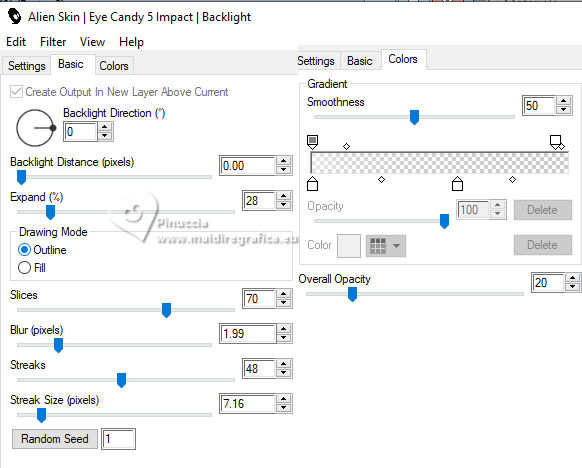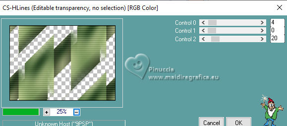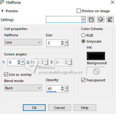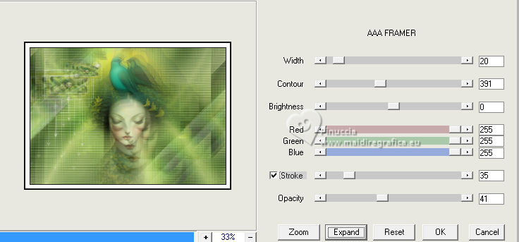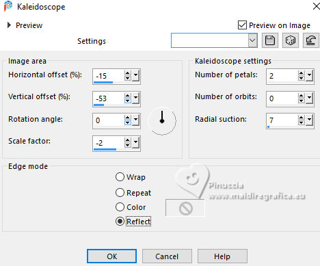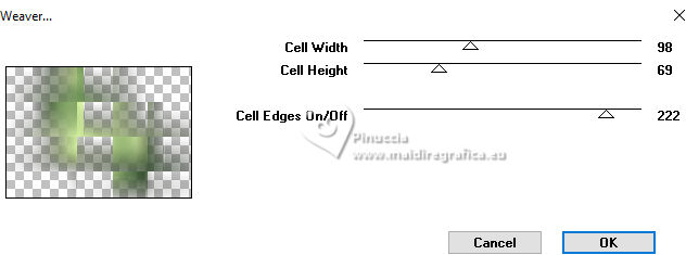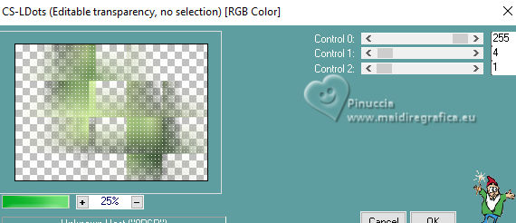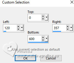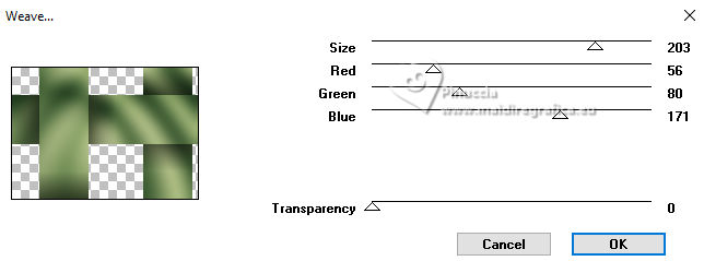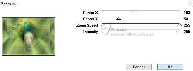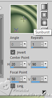 For this tutorial, you will need: ![]() Thanks for the tube PqnaAlice. (The links of the tubemakers here). ![]() consult, if necessary, my filter section here Filters Unlimited 2.0 here Alien Skin Eye Candy 5 Impact - Backlight here Carolaine and Sensibility - CS_HLines, CS_LDots here Filter Factory Gallery A - Spotlight, Weave, Zoom in here Toadies - Weaver here AAA Filters - AAA Framer here Filters Factory Gallery and Toadies can be used alone or imported into Filters Unlimited. (How do, you see here) If a plugin supplied appears with this icon ![]() You can change Blend Modes according to your colors. In the newest versions of PSP, you don't find the foreground/background gradient (Corel_06_029). You can use the gradients of the older versions. The Gradient of CorelX here ![]() Copy the selections in the Selections Folder. 1. Choose 4 colors to work. Foreground: #2b442d Background: #c5ce9f ![]() Color 3: #9fa322 Color 4: #ffffff Set your foreground color to a Foreground/Background Gradient, style Sunburst. ![]() 2. Open a new transparent image 850 x 600 pixels. Flood Fill the transparent image with your Gradient.3. Layers>Duplicate. Image>Mirror>Mirror Horizontal. Layers>Properties>General>Blend Mode: Soft Light. Layers>Merge>Merge Down. 4. Layers>Duplicate. Adjust>Blur>Gaussian Blur, radius 25. ![]() Effects>Plugins>Filters Factory Gallery A - Weave ![]() 5. Effects>Reflection Effects>Rotating Mirror. ![]() 6. Activate your Selection Tool ![]() (no matter the type of selection, because with the custom selection your always get a rectangle) clic on the Custom Selection ![]() and set the following settings. ![]() Selections>Promote Selection to Layer. Selections>Select None. 7. Effects>Plugins>Filters Factory Gallery A - Spotlight ![]() 8. Layers>Duplicate. Image>Mirror>Mirror Horizontal. Image>Mirror>Mirror Vertical. Layers>Merge>Merge Down. Effects>Plugins>Toadies - Weaver ![]() 9. Effects>Plugins>Carolaine and Sensibility - CS_LDots. ![]() Layers>Properties>General>Blend Mode: Overlay. 10. Activate the layer Copy of Raster 1. Effects>Geometric Effects>Skew. ![]() 11. Effects>Image Effect>Seamless Tiling - Default. ![]() Effects>Plugins>Carolaine and Sensibility - CS_HLines. ![]() Layers>Properties>General>Blend Mode: Lighten. Adjust>Sharpeness>Sharpen More. 12. Activate the layer Raster 1. Effects>Reflection Effects>Kaleidoscope. ![]() 13. Effects>Artistic Effects>Halftone. ![]() 14. Activate your top layer, Promoted Selection. Layers>New Raster Layer. Selections>Load/Save Selections>Load Selection From Alpha Channel. Open the selection menu and load the selection 296_Xiki1 ![]() Set your foreground color to the color 3, and your background color to white ![]() Flood Fill the selection with the new foreground color.Selections>Modify>Contract - 2 pixels. 15. Reduce the opacity of your Flood Fill Tool to 40%. Flood Fill the selection with your white background color.Selections>Select None. Layers>Duplicate. Image>Mirror>Mirror Horizontal. Image>Mirror Mirror Vertical. Layers>Merge>Merge Down. 16. Effects>Plugins>Alien Skin Eye Candy 5 Impact - Backlight. ![]() Layers>Properties>General>Blend Mode: Luminance (L). 17. Open the tube 1283MulherByPqnaAlice ![]() Erase the watermark and go to Edit>Copy. Go back to your work and go to Edit>Paste as new layer. Image>Resize, if necessary, for the provided tube to 65%. Apply the effect which you prefer; I only used Sharpen because I needed to resize it. 18. Edit>Copy Special>Copy Merged. Layers>New Raster Layer. Selections>Load/Save Selections>Load Selection From Alpha Channel. Open the selection menu and load the selection 296_Xiki2 ![]() Set again the opacity of your Flood Fill to 100. Flood Fill the selection with your white background color.Selections>Modify>Contract - 2 pixels. Press CANC on the keyboard. Selections>Modify>Contract - 10 pixels. Reduce the opacity of your Flood Fill tool to 50%. Flood Fill the selection with your white background color.Selections>Modify>Contract - 10 pixels. Press CANC on the keyboard. Selections>Modify>Contract - 2 pixels. Set again the opacity of your Flood Fill Tool to 100. Flood Fill the selection with your white background color.Selections>Modify>Contract - 2 pixels. Edit>Paste Into Selection Adjust>Sharpness>Sharpen. Selections>Select None. 19. Layers>Duplicate. Image>Resize, to 60%, resize all layers not checked. Adjust>Sharpness>Sharpen. Pick Tool ![]() Position X: 191,00 - Position Y: 73,00. ![]() 20. Open Decor296_Xiki ![]() Erase the watermark and go to Edit>Copy. Go back to your work and go to Edit>Paste as New Layer. Pick Tool ![]() Position X: 113,00 - Position Y: 76,00. ![]() 21. Image>Add Borders, 1 pixels, symmetric, color 3 (now foreground color). Image>Add Borders, 8 pixels, symmetric, color white Image>Add Borders, 1 pixels, symmetric, color 3 (now foreground color). Image>Add Borders, 3 pixels, symmetric, color white Image>Add Borders, 1 pixels, symmetric, color 3 (now foreground color). 22. Layers>Duplicate. Image>Resize, to 85%, resize all layers not checked. Adjust>Sharpness>Sharpen. 23. Activate your background layer. Effects>Plugins>Filters Factory Gallery A - Zoom In ![]() 24. Effects>Plugins>AAA Filters - AAA Framer ![]() 25. Activate your top layer, Copy of Background. Open TituloBS_Xiki ![]() Erase the watermark and go to Edit>Copy. Go back to your work and go to Edit>Paste as New Layer. Pick Tool ![]() Position X: 493,00 - Position Y: 263,00. ![]() 26. Sign your work and save as jpg. Version with my tube from a Pinterest image ![]() ![]() Your versions. Thanks ![]() Luna ![]() If you have problems or doubts, or you find a not worked link, or only for tell me that you enjoyed this tutorial, write to me. |