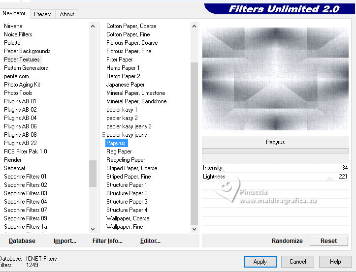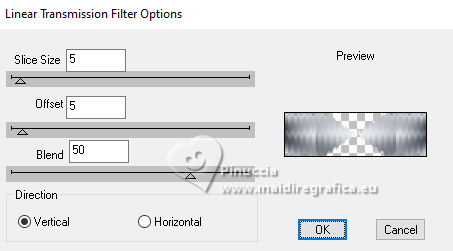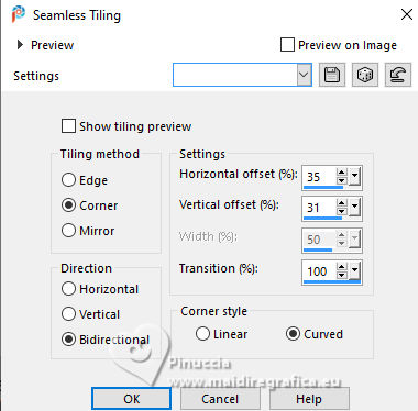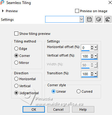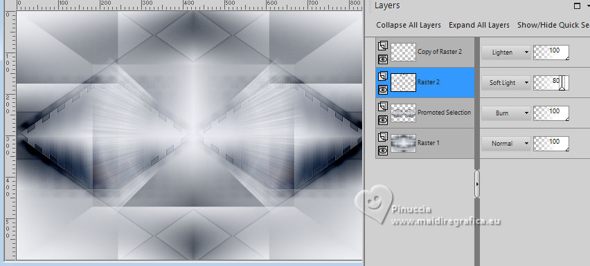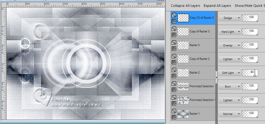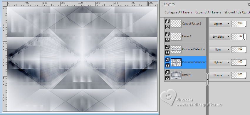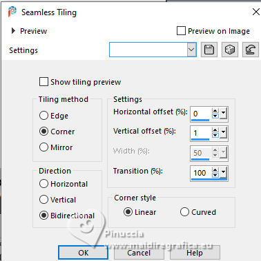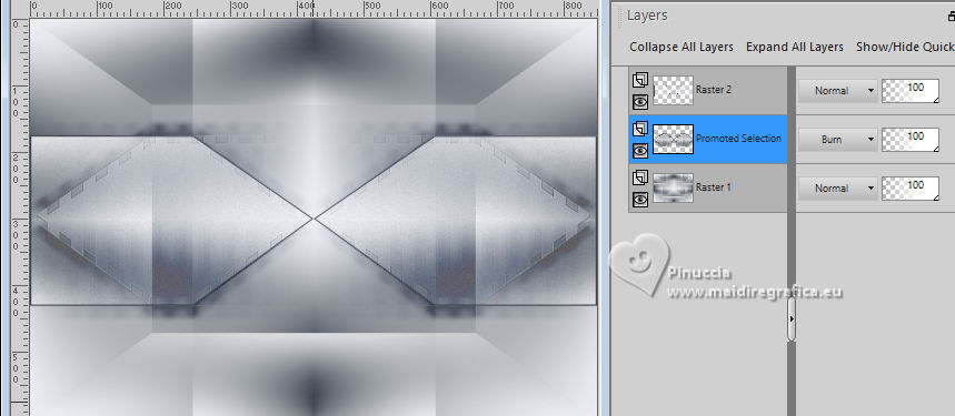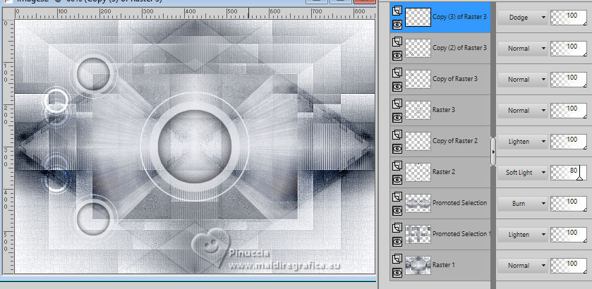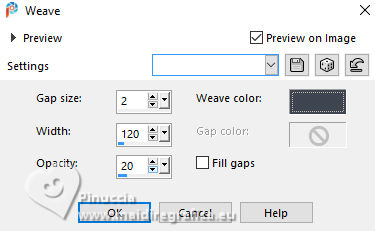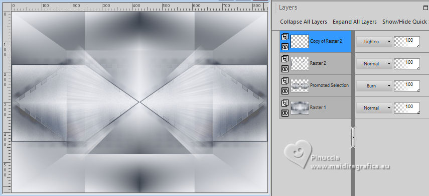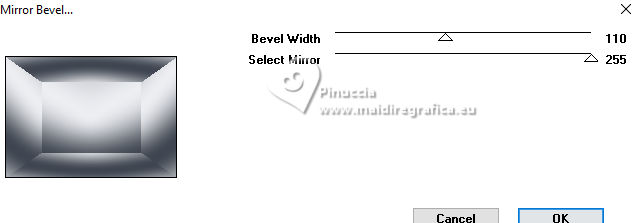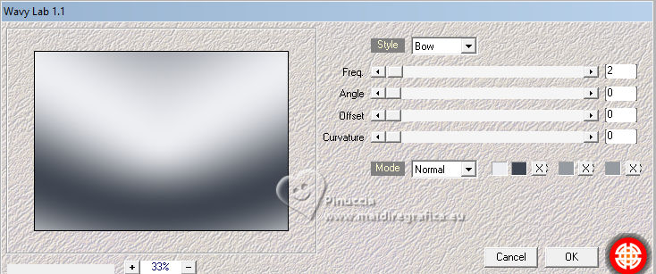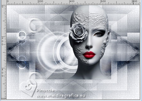 For this tutorial, you will need: ![]() A tube at your choice The rest of the material is by Soxikibem. (The links of the tubemakers here). ![]() consult, if necessary, my filter section here Filters Unlimited 2.0 here Alf's Border FX - Mirror Bevel here DSB Flux - Linear Transmission here Mehdi - Wavy Lab 1.1. here Mura's Meister - Pole Transform here Filters Alf's Border FX can be used alone or imported into Filters Unlimited. (How do, you see here) If a plugin supplied appears with this icon You can also follow the video tutorial created by Soxikibem ![]() You can change Blend Modes according to your colors. ![]() Copy the selections in the Selections Folder. 1. Choose two colors to work. Foreground: #3f4651 Background: #edeef2 ![]() 2. Open a new transparent image 850 x 600 pixels. Effects>Plugins>Mehdi - Wavy Lab 1.1. This filter creates gradients with the colors of your Materials palette. The first is your background color, the second is your foreground color. Keep the last two colors created by the filtre (#969aa1). ![]() 3. Effects>Plugins>Alf's Border FX - Mirror Bevel. ![]() 4. Effects>Image Effects>Seamless Tiling. ![]() 5. Selections>Load/Save Selections>Load Selection From Disk. Look for and load the selection 304_Xiki1 ![]() Selections>Promote Selection to Layer. Effects>Plugins>DSB Flux - Linear Transmission. ![]() Keep selected. 6. Layers>New Raster Layer. Flood Fill the selection with your foreground color.Selections>Modify>Contract - 2 pixels. Press CANC on the keyboard ![]() 7. Reduce the opacity of your Flood Fill Tool to 40%, Flood Fill the selection with your background color.Adjust>Add/Remove Noise>Add Noise. ![]() Selections>Select None. 8. Activate the layer below, Promoted Selection. Effects>Image Effects>Seamless Tiling. ![]() Effects>Edge Effects>Enhance. Effects>3D Effects>Drop Shadow, color black #000000. ![]() Repeat Effects>3D Effects>Drop Shadow, vertical -19, color black #000000. ![]() Layers>Properties>General>Blend Mode: Burn. ![]() 9. Activate again your top layer, Raster 2. Layers>Duplicate. Effects>Distortion Effects>Polar Coordinates ![]() Effects>Plugins>Mura's Meister - Pole Transform. ![]() Layers>Properties>General>Blend Mode: Lighten. ![]() Adjust>Sharpness>Sharpen More. 10. Activate again the layer Raster 2. Effects>Reflection Effects>Kaleidoscope. ![]() Layers>Properties>General>Blend Mode: Soft Light, Opacity 80%. ![]() 11. Activate your bottom layer, Raster 1. Selections>Load/Save Selections>Load Selection From Disk. Look for and load the selection 304_Xiki2 ![]() Selections>Promote Selections to Layer. Selections>Select None. Effects>Reflection Effects>Kaleisdoscope. ![]() 12. Effects>Texture Effects>Blinds - foreground color ![]() 13. Effects>Image Effects>Seamless Tiling. ![]() Adjust>Sharpness>Sharpen. Edit>Repeat Sharpen. Layers>Properties>General>Blend Mode: Lighten. ![]() 14. Activate again your bottom layer, Raster 1. Selections>Load/Save Selections>Load Selection From Disk. Look for and load the selection 304_Xiki3 ![]() Effects>Plugins>Filters Unlimited 2.0 - Paper Textures - Papyrus ![]() 15. Effects>Reflection Effects>Feedback. ![]() Effects>Edge Effects>Enhance. Selections>Select None. 16. Selections>Load/Save Selections>Load Selection From Disk. Look for and load the selection 304_Xiki4 ![]() Effects>Texture Effects>Weave - weave color: foreground color. ![]() 17. Adjust>Add/Remove Noise>Add Noise. ![]() Selections>Select None. 18. Activate your top layer, Copy of Raster 2. Layers>New Raster Layer. Selections>Load/Save Selections>Load Selection From Disk. Look for and load the selection 304_Xiki5 ![]() Set again the opacity of your Flood Fill Tool to 100. Flood Fill the selection with your background color.Selections>Modify>Contract - 3 pixels. Press CANC on the keyboard. 19. Selections>Modify>Contract - 20 pixels. Reduce the opacity of your Flood Fill tool to 60%. Flood Fill the selection with your background color.Selections>Modify>Contract - 20 pixels. Press CANC on the keyboard. don't forget to set again the opacity of your Flood Fill Tool to 100 20. Layers>New Raster Layer. Effects>3D Effects>Cutout. ![]() Selcetions>Select None. Layers>Merge>Merge Down. 21. Layers>Duplicate. Image>Resize, to 45%, resize all layers not checked. Pick Tool ![]() Position X: 127,00 - Position Y: 70,00. ![]() Layers>Duplicate. Image>Mirror>Mirror Vertical (Image>Flip). 22. Layers>Duplicate. Image>Resize, to 60%, resize all layers not checked. Pick Tool ![]() Position X: 63,00 - Position Y: 343,00 ![]() Layers>Duplicate. Image>Mirror>Mirror Vertical (Image>Flip) 23. Layers>Merge>Merge Down. Effects>Imagem Effects>Seamless Tiling. ![]() Layers>Properties>General>Blend Mode: Dodge. ![]() 24. Activate the layer below, Copy (2) of Raster 3. Layers>Merge>Merge Down. Effects>Distortion Effects>Wind - from right, strength 90. ![]() Layers>Properties>General>Blend Mode: Hard Light. 25. Activate the layer below, Raster 3. Effects>3D Effects>Dop Shadow, background color. ![]() Layers>Properties>General>Blend Mode: Overlay. 26. Activate your top layer (Copy (3) of Raster 3) ![]() Open your main tube 1381MulherByPqnaAlice ![]() Erase the watermark and go to Edit>Copy. Go back to your work and go to Edit>Paste as New Layer. Image>Resize, if necessary - for the supplied tube to 38%. Move the tube as in my example.![]() Effects>3D Effects>Drop Shadow, color black #000000, or to your liking. ![]() 27. Open TituloCracks_Xiki ![]() Erase the watermark and go to Edit>Copy. Go back to your work and go to Edit>Paste as New Layer. Pick Tool ![]() Position X: 179,00 - Position Y: 472,00. ![]() Layers>Properties>General>Opacity 70%. 28. Open DecorCracks_Xiki ![]() Erase the watermark and go to Edit>Copy. Go back to your work and go to Edit>Paste as new layer. Pick Tool ![]() Position X: 1,00 - Position Y: 225,00. ![]() Layers>Properties>General>Blend Mode: Lighten. Layers>Arrange>Move Down. 29. Open DecorCracks_Xiki2 ![]() Erase the watermark and go to Edit>Copy. go