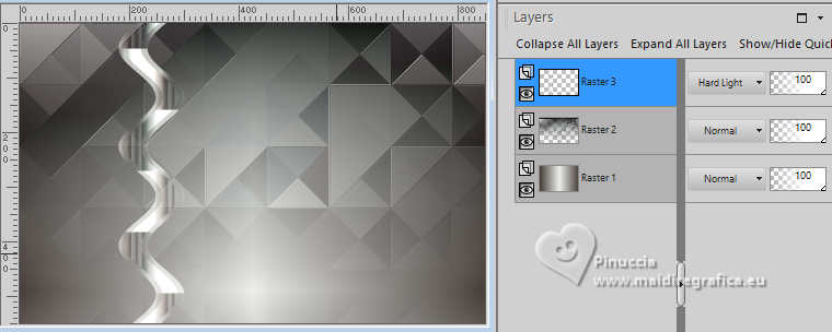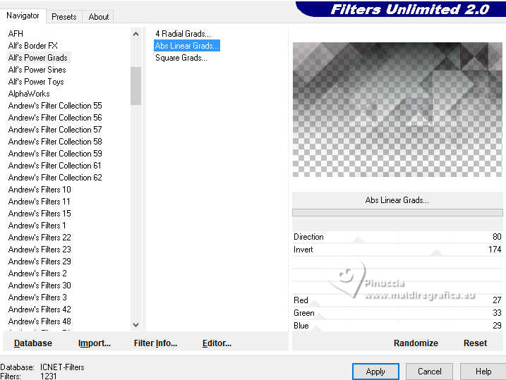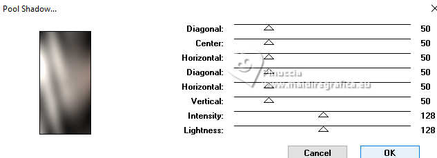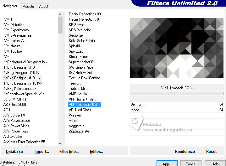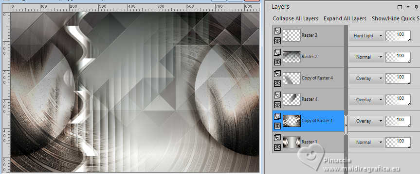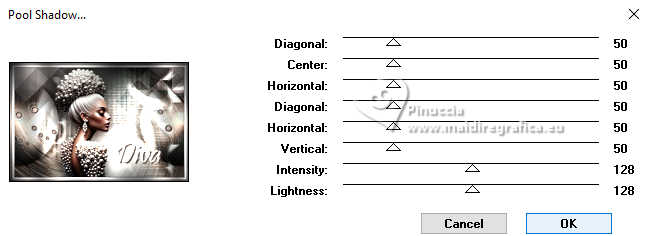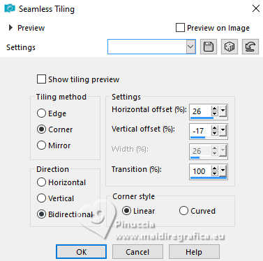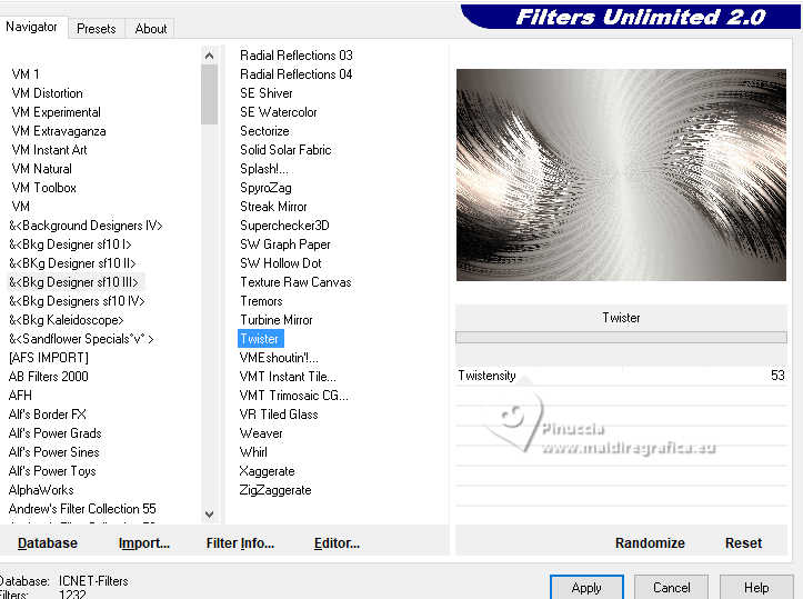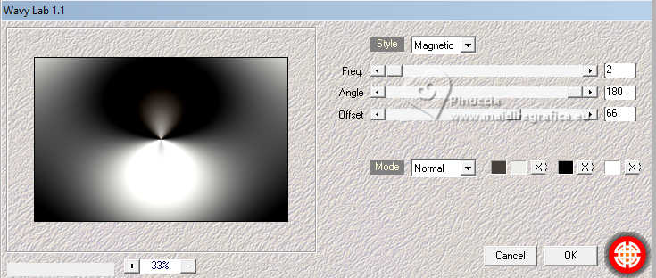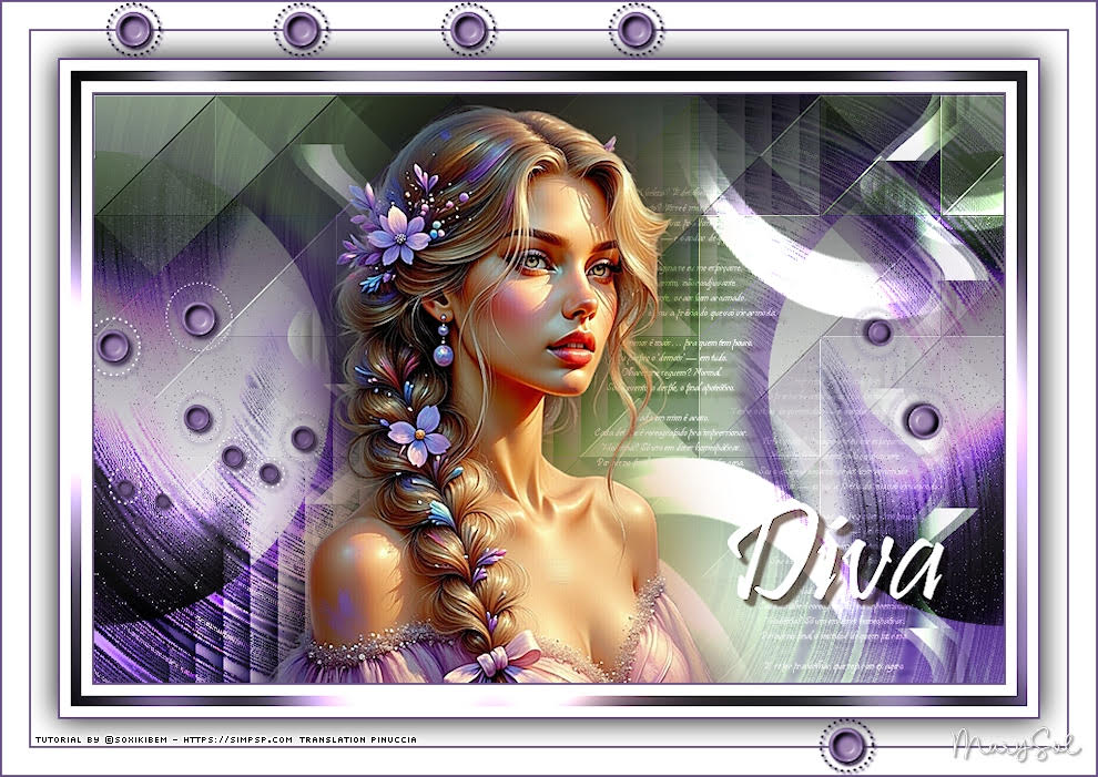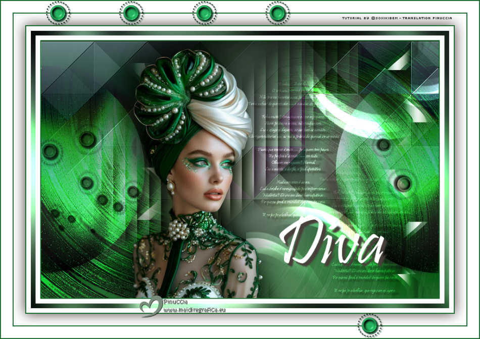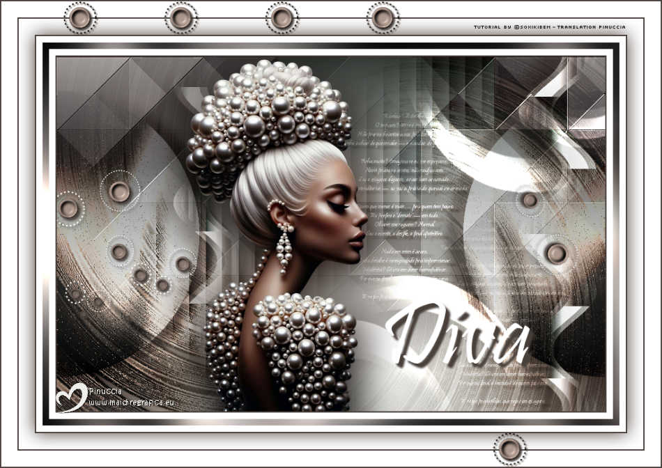 For this tutorial, you will need: ![]() A tube at your choice The rest of the material is by Soxikibem. (The links of the tubemakers here). ![]() consult, if necessary, my filter section here Filters Unlimited 2.0 here &<Bkg Designer sf10III> - VMT Trimosaic CG, Twister (to import in Unlimited) here Mehdi - Wavy Lab 1.1. here Alf's Power Grads - Abs Linear Grads here FM Tile Tools Blend Emboss here Italian Editors Effect - Effetto Fantasma here Tramages - Perforator I, Pool Shadow here Filters Alf's Power, Italian Editors and Tramages can be used alone or imported into Filters Unlimited. (How do, you see here) If a plugin supplied appears with this icon ![]() You can change Blend Modes according to your colors. In the newest versions of PSP, you don't find the foreground/background gradient (Corel_06_029). You can use the gradients of the older versions. The Gradient of CorelX here ![]() Copy the selections in the Selections Folder. 1. Choose 4 colors to work. ![]() Foreground: #483f3a Background: #eeefea ![]() color 3: #ffffff color 4: #000000 Set your foreground color to a Foreground/Backgroung Gradient, style Linear ![]() 2. Open a new transparent image 850 x 550 pixels. Flood Fill the transparent image with your Gradient.3. Layers>New Raster Layer. Effects>Plugins>Mehdi - Wavy Lab 1.1. Colors sequence: Foreground, Background, color 4 black, color 3 white ![]() 4. Effects>Plugins>Filters Unlimited 2.0 - &<Bkg Designer sf10III> - VMT Trimosaic CG ![]() 5. Effects>Plugins>Filters Unlimited 2.0 - Alf's Power Grads - Abs Linear Grads. ![]() 6. Effects>Plugins>FM Tile Tools - Blend Emboss, default setting ![]() Edit>Repeat Blen Emboss. 7. Layers>New Raster Layer. Selections>Load/Save Selections>Load Selection from Disk. Look for and load the selection 306_xiki1 ![]() Reduce the opacity of your Flood Fill Tool to 40% Flood Fill the selection with your background color.don't forget to set again the opacity of your Flood Fill Tool to 100 Effects>Plugins>Tramages - Perforator I ![]() 8. Selections>Select None. Effects>Plugins>Italian Editors Effect - Effetto Fantasma. ![]() Layers>Properties>General>Blend Mode: Hard Light. ![]() Effects>3D Effects>Drop Shadow, foreground color. ![]() 9. Activate the layer Raster 1. Open DecorDiva1_Xiki ![]() Erase the watermark and go to Edit>Copy. Go back to your work and go to Edit>Paste as new layer. 10. Pick Tool ![]() Position X: 225,00 - Position Y: 0,00 ![]() Layers>Properties>General>Blend Mode: Overlay. ![]() 11. Layers>Duplicate. Image>Mirror>Mirror Vertical (Image>Flip) Pick Tool ![]() Position X: 1,00 - Position Y: 59,00 ![]() 12. Activate the layer Raster 1. Selections>Load/Save Selections>Load Selection from Disk. Look for and load the selection 306_xiki2 ![]() Effects>Plugins>Tramages - Pool Shadow, default settings ![]() Edit>Repeat Pool Shadow. 13. Adjust>Add/Remove Noise>Add Noise. ![]() Effects>3D Effects>Drop Shadow, foreground color. ![]() Selections>Select None. 14. Effects>Reflection Effects>Rotating Mirror, default settings ![]() 15. Layers>Duplicate. Effects>Plugins>Filters Unlimited 2.0 - &<Bkg Designer sf10III> - Twister ![]() 16. Selections>Load/Save Selections>Load Selection from Disk. Look for and load the selection 306_xiki3 ![]() Press CANC on the keyboard ![]() Selections>Select None. Layers>Properties>General>Blend Mode: Overlay. 17. Activate your top layer, Raster 3. Open TextDiva_Xiki ![]() Erase the watermark and go to Edit>Copy. Go back to your work and go to Edit>Paste as new layer. Pick Tool ![]() Position X: 440,00 - Position Y: 87,00 ![]() Layers>Properties>General>Blend Mode: Overlay. 18. Activate the layer Raster 3. Effects>Image Effects>Seamless Tiling. ![]() 19. Open DecorDiva2_Xiki ![]() Erase the watermark and go to Edit>Copy. Go back to your work and go to Edit>Paste as new layer. Layers>Properties>General>Blend Mode: Dodge. Pick Tool ![]() Position X: 438,00 - Position Y: 0,00 ![]() Author's Note: In the second version, since I was working with dark colors, I clicked on Image>Negative Image to be able to enhance it in the work. 20. Activate your top layer. Open DecorDiva3_Xiki ![]() Erase the watermark and go to Edit>Copy. Go back to your work and go to Edit>Paste as new layer. Pick Tool ![]() Position X: 0,00 - Position Y: 175,00 ![]() 21. Open the tube 1393MulherByPqnaAlice ![]() Erase the watermark and go to Edit>Copy. Go back to your work and go to Edit>Paste as new layer. Image>Resize - for the provided tube to 45%, resize all layers not checked. Adjust>Sharpness>Sharpen. Pick Tool ![]() Position X: 199,00 - Position Y: 4,00 ![]() 22. Layers>Duplicate. Adjust>Blur>Gaussian Blur - radius 35 ![]() Layers>Arrange>Move Down. Layers>Properties>General>Blend Mode: Multiply. 23. Activate your top layer. Open TituloDiva_Xiki ![]() Erase the watermark and go to Edit>Copy. Go back to your work and go to Edit>Paste as new layer. Pick Tool ![]() Position X: 509,00 - Position Y: 372,00 ![]() 24. Image>Add Borders - 2 pixels, symmetric, foreground color. Edit>Copy Image>Add Borders, 10 pixels, symmetric, color 3 (white) Selections>Select All 25. Image>Add Borders, 10 pixels, whatever color. Selections>Invert. Edit>Paste Into Selection Adjust>Blur>Gaussian Blur - radius 20 ![]() 26. Effects>Plugins>Tramages - Pool Shadow, default settings. ![]() Edit>Repeat Pool Shadow. Selections>Select None. 27. Image>Add Borders, 10 pixels, symmetric, color 3 (white). Image>Add Borders, 2 pixels, symmetric, foreground color. Selections>Select All 28. Image>Add Borders, 25 pixels, symmetric, color 3 (white). Effects>3D Effects>Drop Shadow, foreground color ![]() Selections>Select None. 29. Image>Add Borders, 2 pixels, symmetric, foreground color. Image>Add Borders, 25 pixels, symmetric, color 3 (white) Image>Add Borders, 2 pixels, symmetric, foreground color. 30. Open DecorDiva4_Xiki ![]() Edit>Copy. Go back to your work and go to Edit>Paste as new layer. Pick Tool ![]() Position X: 98,00 - Position Y: 2,00 ![]() 31. Image>Resize, if y