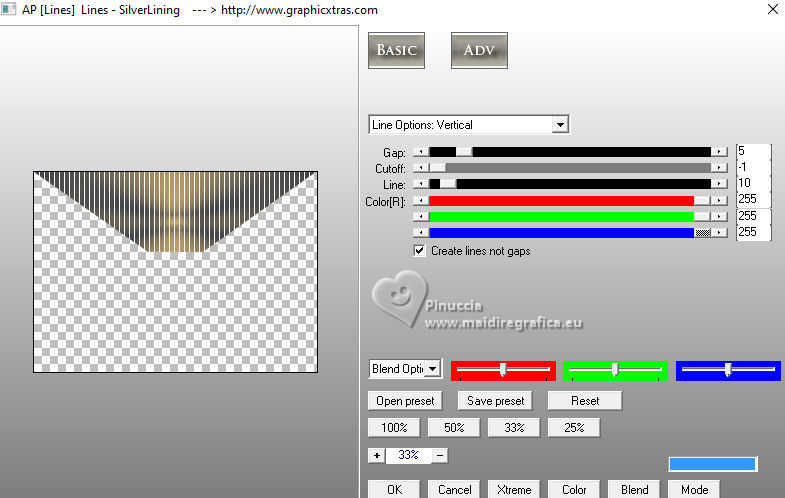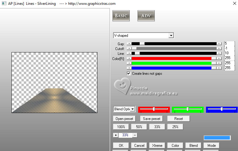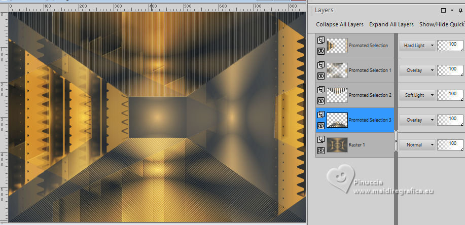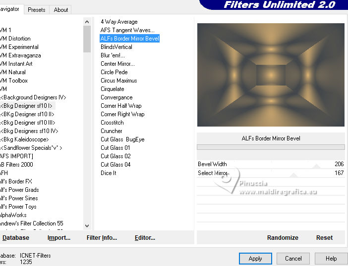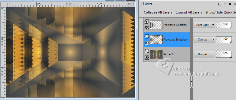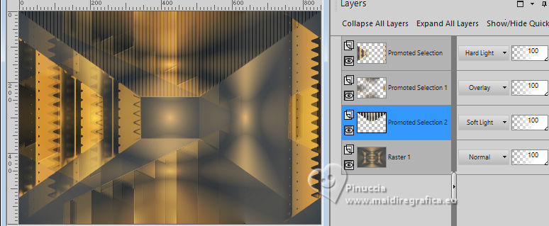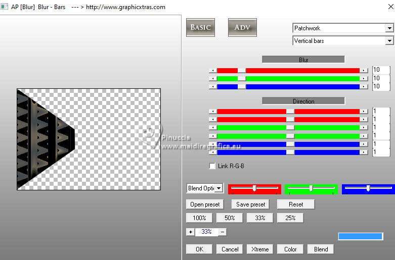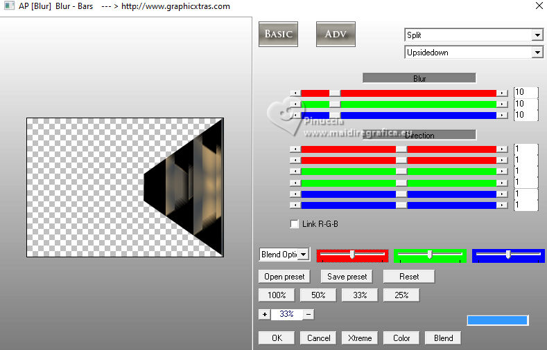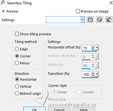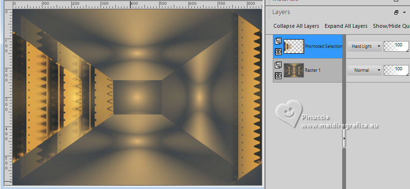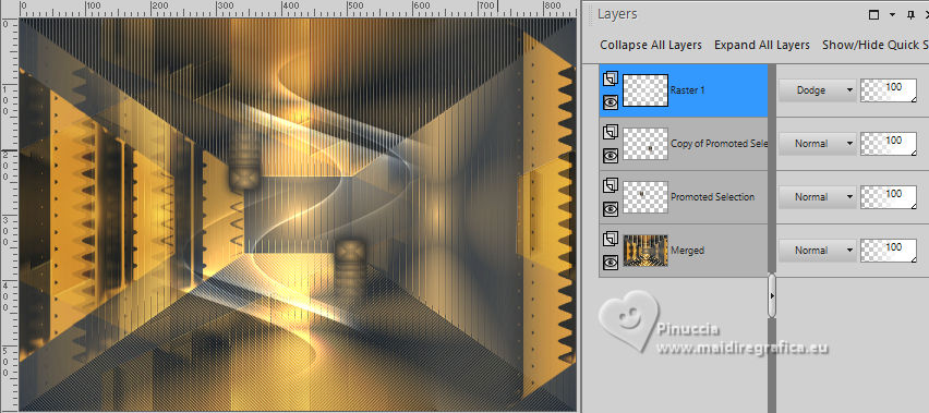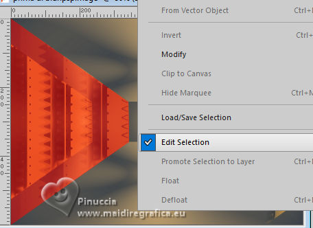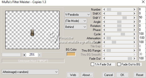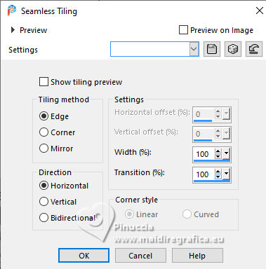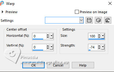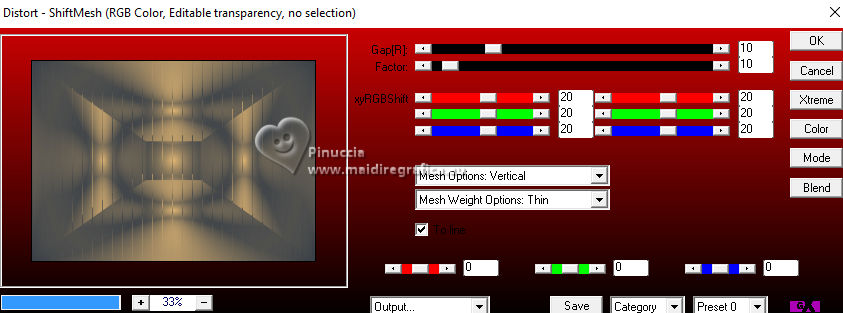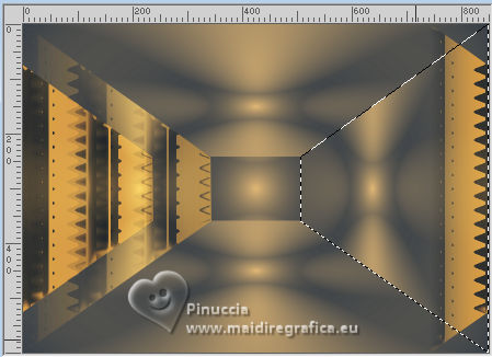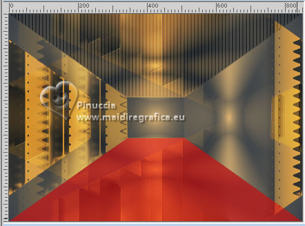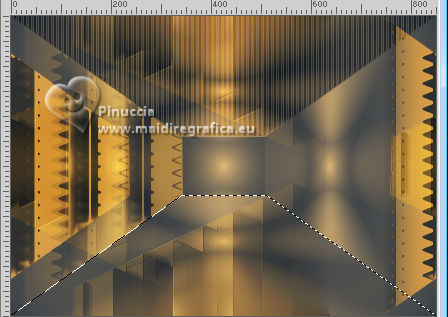 For this tutorial, you will need: ![]() (The links of the tubemakers here). ![]() consult, if necessary, my filter section here Filters Unlimited 2.0 here &<Bkg Designer sf10I> - Alf's Border Mirror Bevel (to import in Unlimited) here Alien Skin Eye Candy 5 Impact - Glass here AP [Blur] - Blur-Bars here AP [Innovations] - Distort-ShiftMesh, here AP [Lines] - Lines SilverLining here FM Tile Tools - Blend Emboss here Mura's Meister - Copies here You can also follow the video tutorial created by Soxikibem ![]() You can change Blend Modes according to your colors. In the newest versions of PSP, you don't find the foreground/background gradient (Corel_06_029). You can use the gradients of the older versions. The Gradient of CorelX here ![]() 1. Choose 3 colors to work. ![]() Foreground: #394048 Background: #e3b875 ![]() color 3 #ffffff Set your foreground color to a Foreground/Background Gradient, style Sunburst. ![]() 2. Open a new transparent image 850 x 600 pixels. Flood Fill the transparent image with your Gradient.3. Effects>Distortion Effects>Warp. ![]() 4. Effects>Plugins>Filters Unlimited 2.0 - &<Bkg Designer sf10I> - ALFs Border Mirror Bevel. ![]() 5. Selections>Load/Save Selections>Load Selection From Disk. Look for and load the selection 302_Xiki1 ![]() Selections>Promote Selection to Layer. Selections>Select None. Effects>Plugins>AP [Blur] - Blur-Bars. ![]() 6. Effects>Image Effects>Seamless Tiling. ![]() Layers>Properties>General>Blend Mode: Hard Light. ![]() Author's note: In my second version, I used Lighten 7. Activate the layer Raster 1. Selections>Load/Save Selections>Load Selection From Disk Load again the selection 302_Xiki1 ![]() Selections>Edit Selection - and the selected zone turns red. ![]() Image>Mirror>Mirror Horizontal. ![]() Selections>Edit Selection - and the red zone returns normal. ![]() Selections>Promote Selection to Layer. Selections>Select None. 8. Effects>Plugins>AP [Blur] - Blur-Bars. ![]() 9. Effects>Image Efects>Seamless Tiling. ![]() 10. Effects>Image Efects>Seamless Tiling. ![]() Effects>Plugins>FM Tile Tools - Blend Emboss, default settings. ![]() Edit>Repeat Blend Emboss. Layers>Properties>General>Blend Mode: Overlay. ![]() Author's note: In my second version, I used Exclusion. 11. Activate the layer Raster 1. Selections>Load/Save Selections>Load Selection From Disk Look for and load the selection 302_Xiki2 ![]() Selections>Promote Selection to Layer. Selections>Select None. Effects>Plugins>AP [Lines] - Lines SilverLining. ![]() Effects>Edge Effects>Enhance. Layers>Properties>General>Blend Mode: Soft Light. ![]() 12. Activate the layer Raster 1. Selections>Load/Save Selections>Load Selection From Disk Load again the selection 302_Xiki2 ![]() Selections>Edit Selection - and the selected zone turns red. ![]() Image>Mirror>Mirror Vertical (Image>Flip). ![]() Selections>Edit Selections - and the red zone returns normal. ![]() Selections>Promote Selection to Layer. Selections>Select None. Effects>Plugins>AP [Lines] - Lines SilverLining. ![]() Layers>Properties>General>Blend Mode: Overlay. ![]() 13. Activate the layer Raster 1. Effects>Plugins>AP [Distort] - Distort-ShiftMesh ![]() Adjust>Sharpness>Sharpen More. 14. Layers>Merge>Merge Visible. Selections>Load/Save Selections>Load Selection From Disk. Look for and load the selection 302_Xiki3 ![]() Selections>Promote Selection to Layer. Selections>Select None. Image>Resize, to 30%, resize all layers not checked. Adjust>Sharpness>Sharpen. Effects>Plugins>Alien Skin Eye Candy 5 Impact - Glass. ![]() 15. Effects>Plugins>Mura's Meister - Copies. ![]() 16. Pick Tool ![]() Position X: 300,00 - Position Y: 148,00 ![]() Layers>Duplicate. Image>Mirror>Mirror Horizontal. Image>Mirror>Mirror Vertical. 17. Open Decor302_Xiki ![]() Erase the watermark and go to Edit>Copy. Go back to your work and go to Edit>Paste as new layer. Layers>Properties>General>Blend Mode: Dodge. ![]() 18. Image>Add Borders, 2 pixels, symmetric, foreground color. Image>Add Borders, 1 pixel, symmetric, background color. Image>Add Borders, 2 pixels, symmetric, foreground color. Image>Add Borders, 25 pixels, symmetric, color white. Image>Add Borders, 2 pixels, symmetric, foreground color. Image>Add Borders, 2 pixels, symmetric, color white. Image>Add Borders, 2 pixels, symmetric, foreground color. Selections>Select All. Image>Add Borders, 35 pixels, symmetric, color white. 19. Effects>3D Effects>Drop Shadow, color black. ![]() Selections>Select None. Open your main tube 1359MulherByPqnaAlice ![]() Erase the watermark and go to Edit>Copy. Go back to your work and go to Edit>Paste as New Layer. Image>Resize, if necessary, for the supplied tube to 65%. Position and effect to your liking. 20. Open TituloEN_Xiki ![]() Erase the watermark and go to Edit>Copy. Go back to your work and go to Edit>Paste as New Layer. Place the tube to your liking. 21. Image>Add Borders, 2 pixels, symmetric, foreground color. 22. Sign your work. Image>Resize, if you want. Save as jpg. Version with my tube from Pinterest image ![]() ![]() Your versions. Thanks ![]() Irene ![]() If you have problems or doubts, or you find a not worked link, or only for tell me that you enjoyed this tutorial, write to me. |