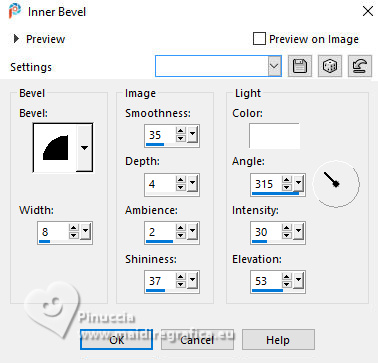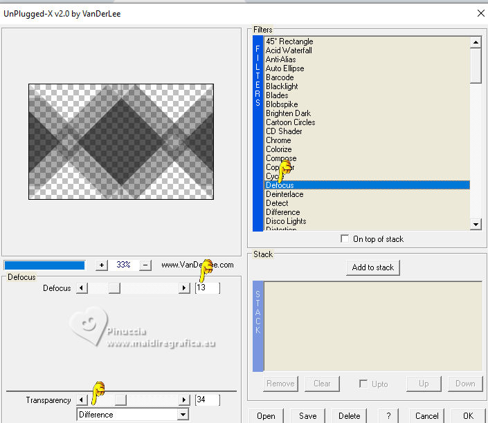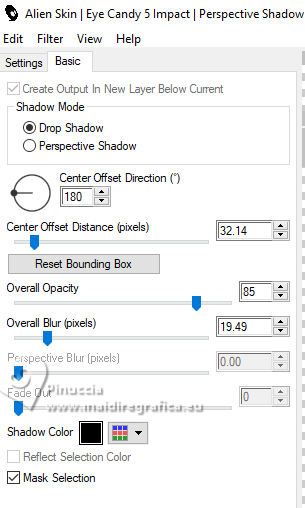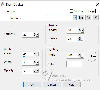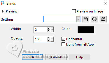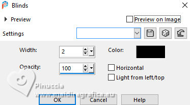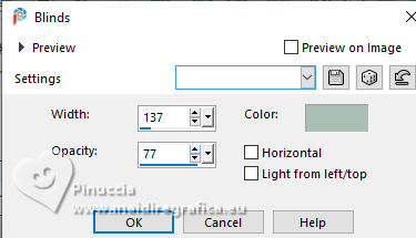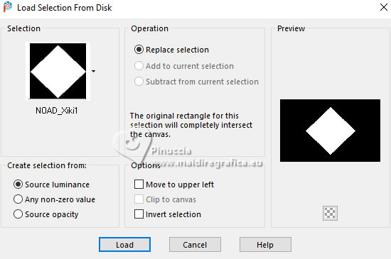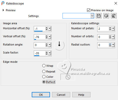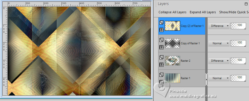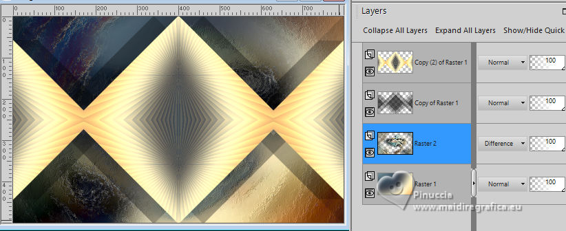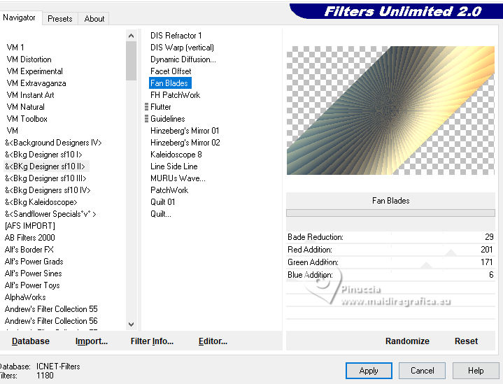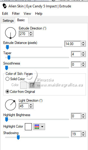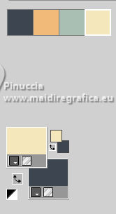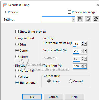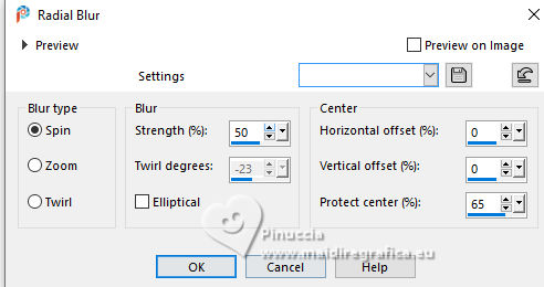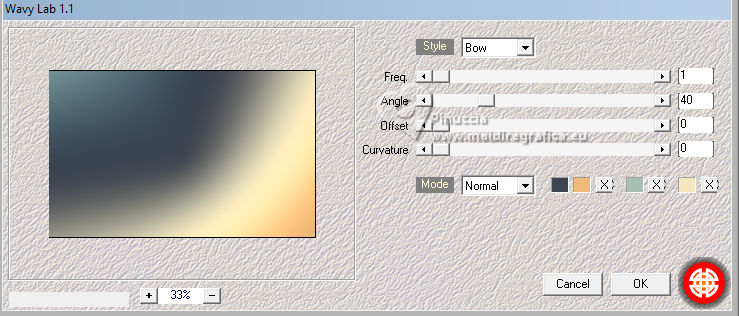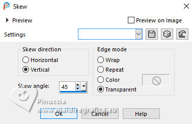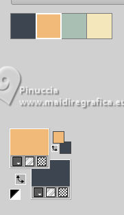 For this tutorial, you will need: ![]() Thanks for the tubes and the mask PqnaAlice and Narah. (The links of the tubemakers here). ![]() consult, if necessary, my filter section here Filters Unlimited 2.0 here &<Bkg Designer sf10II> - Fan Blades (to import in Unlimited) here Alien Skin Eye Candy 5 Impact - Perspective Shadow - Extrude here Mehdi - Wavy Lab 1.1. here VanDerLee - Unplugged-X here ![]() You can change Blend Modes according to your colors. In the newest versions of PSP, you don't find the foreground/background gradient (Corel_06_029). You can use the gradients of the older versions. The Gradient of CorelX here ![]() Copy the Selection in the Selections Folder. ![]() 1. Choose 2 colors to work. Set your foreground color to color 2 #f0ba78, and your background color to color 1 #3d4550 ![]() color 3 #a9bfb3 color 4 #f5e7bc 2. Open a new transparent image 800 x 500 pixels. Effects>Plugins>Mehdi - Wavy Lab 1.1. This filter creates gradients with the colors of your Materials palette. The first is your background color #3d4550, the second is your foreground color #f0ba78. Change the last two colors created by the filtre: the third color with color 3 #09bfb3 and the fourth color with color 4 #f5e7bc. ![]() 3. Layers>Duplicate. Effects>Geometric Effects>Skew. ![]() 4. Effects>Plugins>Filters unlimited 2.0 - &<Bkg Designer sf10II> - Fan Blades. ![]() 5. Effects>Reflection Effects>Kaleidoscope. ![]() 6. Layers>Duplicate. Activate the layer below, Copy of Raster 1. Effects>Plugins>VanDerLee - Unplugged-X - Defocus ![]() 7. Activate the layer Raster 1. Layers>New Raster Layer. Selections>Select All. Open the tube 100DiversosByPqnaAlice ![]() Erase the watermark and go to Edit>Copy. Minimize the tube Go back to your work and go to Edit>Paste Into Selection. Selections>Select None. 8. Effects>Image Effects>Seamless Tiling, default settings. ![]() Adjust>Blur>Radial Blur. ![]() 9. Effects>Art Media Effects>Brush Strokes. ![]() Layers>Properties>General>Blend Mode: Difference. ![]() 10. Activate the layer Raster 1. Effects>Texture Effects>Blinds - color 3 #09bfb3, or one of your colors, according to your work. ![]() 11. Effects>Edge Effects>Enhance. Activate again the layer Copy (2) of Raster 1. Effects>Image Effects>Seamless Tiling. ![]() Layers>Properties>General>Blend Mode: Difference. Note of the author: in my second version I used Hard Light ![]() 12. Selections>Load/Save Selections>Load Selection From Disk. Look for and load the selection NOAD_Xiki1 ![]() Layers>New Raster Layer. Flood fill the selection with your dark background color #3d4550.Selections>Modify>Contract - 20 pixels. Press CANC on the keyboard ![]() 13. Layers>New Raster Layer. Set your foreground color to the color 4. ![]() Reduce the opacity of your Flood Fill Tool to 50%.Flood Fill the selection with your foreground color.Set again the opacity of your Flood Fill Tool to 100. Open the misted 031CasalByPqnaAlice ![]() Edit>Copy. Go back to your work and go to Edit>Paste Into Selection. Adjust>Sharpness>Sharpen. Selections>Select None. 14. Activate the layer Raster 3. Selections>Select All. Selections>Float. Selections>Defloat. Effects>Art Media Effects>Brush Strokes, last settings. ![]() 15. Effects>3D Effects>Inner Bevel. ![]() Selections>Select None. 16. Activate the layer Raster 4. Layers>Merge>Merge Down. Edit>Copy. Edit>Paste as New Image. Minimize this image: you'll use it later. 17. Open DecorNOAD_Xiki ![]() Erase the watermark and go to Edit>Copy. Go back to your work and go to Edit>Paste as New Layer. Don't move it. 18. Effects>Plugins>Alien Skin Eye Candy 5 Impact - Perspective Shadow. ![]() 19. Activate the layer Raster 3. Effects>Plugins>Alien Skin Eye Candy 5 Impact - Perspective Shadow. Shadow color: color black, or your dark background color. ![]() 20. Repeat Effects>Plugins>Alien Skin Eye Candy 5 Impact - Perspective Shadow. Change Center Offset Direction to 0 ![]() 21. Image>Add Borders, 1 pixel, symmetric, dark background color. Image>Add Borders, 5 pixels, symmetric, color #ffffff. Image>Add Borders, 1 pixel, symmetric, dark background color. Selections>Select All. Image>Add Borders, 15 pixels, symmetric, color #ffffff. Selections>Invert. 22. Effects>Art Media Effects>Brush Strokes, last settings. ![]() Selections>Select None. 23. Image>Add Borders, 1 pixel, symmetric, dark background color. Image>Add Borders, 5 pixels, symmetric, color #ffffff. Image>Add Borders, 1 pixel, symmetric, dark background color. Selections>Select All. Image>Add Borders, 45 pixels, symmetric, color #ffffff. 24. Effects>3D Effects>Drop Shadow, color #000000. ![]() Selections>Select All. Image>Add Borders>3 pixels, symmetric, color #ffffff. Selections>Invert. 25. Effects>Texture Effects>Blinds. ![]() Repeat Effects>Texture Effects>Blinds, Horizontal checked. ![]() Selections>Select None. 26. Image>Add Borders, 1 pixel, symmetric, dark background color. 26. Open minimized at step 16 ![]() Edit>Copy. Go back to your work and go to Edit>Paste as new layer. Image>Resize, to 20%, resize all layers not checked. Adjust>Sharpness>Sharpen. 28. Effects>Plugins>Alien Skin Eye Candy 5 Impact - Extrude. ![]() 29. Pick Tool ![]() Position X: 169,00 - Position Y: 19,00. ![]() Layers>Duplicate. Position X: 209,00 - Position Y: 19,00. ![]() Layers>Duplicate. Position X: 249,00 - Position Y: 19,00. ![]() 30. Activate again the tube 100DiversosByPqnaAlice ![]() Erase the watermark and go to Edit>Copy. Go back to your work and go to Edit>Paste as New Layer. Image>Mirror>Mirror Horizontal. Image>Resize, to 59%, resize all layers not checked. Move the tube tu the right side.Effects>3D Effects>Drop shadow, at your choice. 31. open TituloNOAD_Xiki ![]() Erase the watermark and go to Edit>Copy. Go back to your work and go to Edit>Paste as New Layer. Move the text to your liking.32. Sign your work and save as jpg. The misted of this version is mine ![]() ![]() Your versions. Thanks ![]() If you have problems or doubts, or you find a not worked link, o