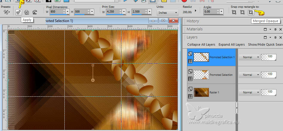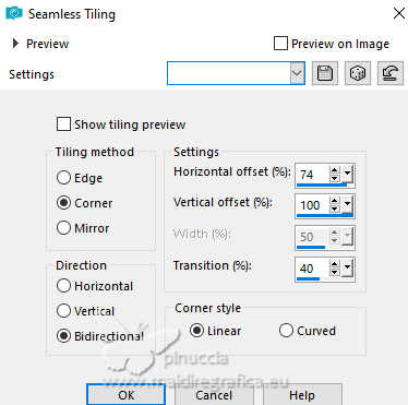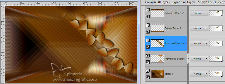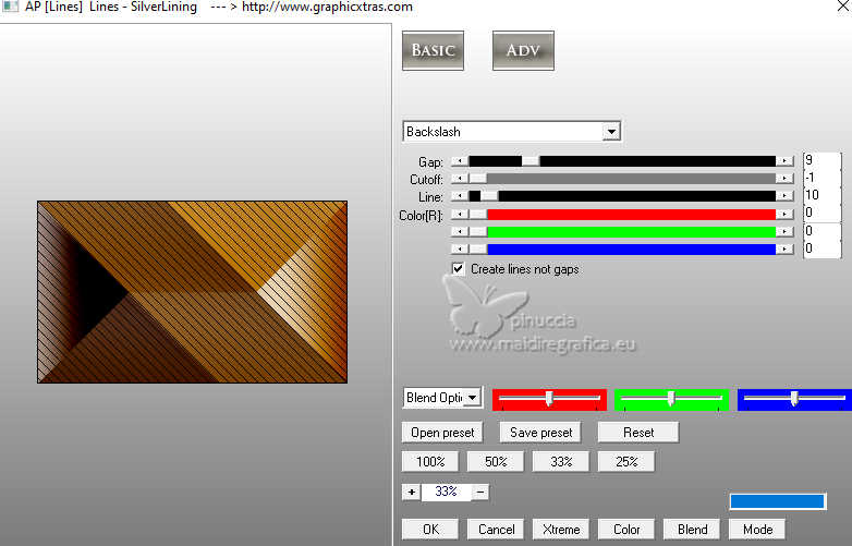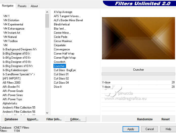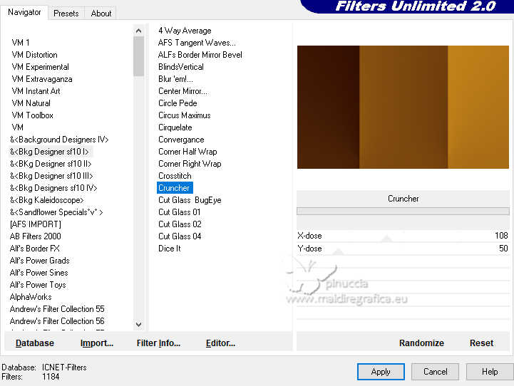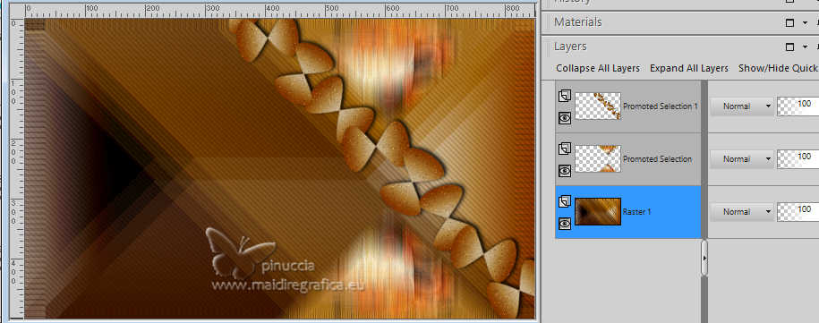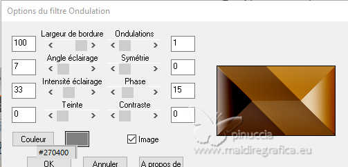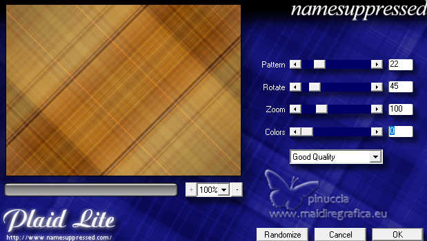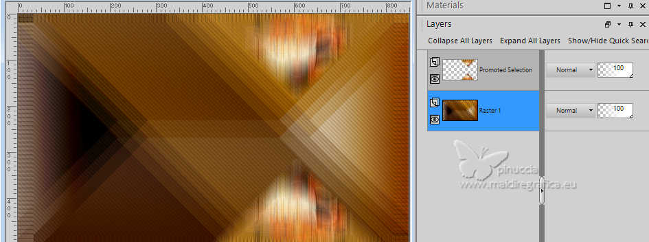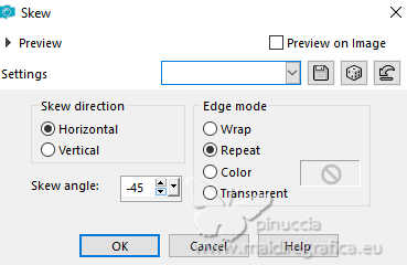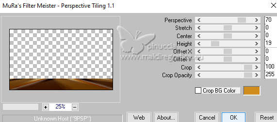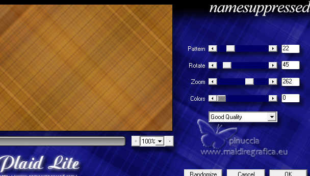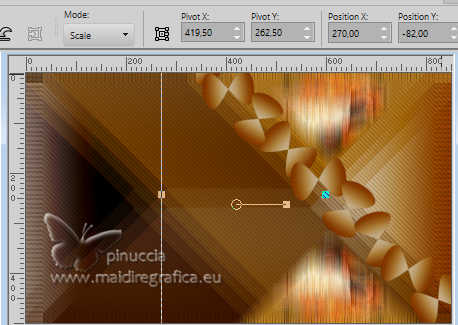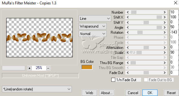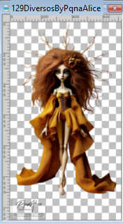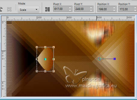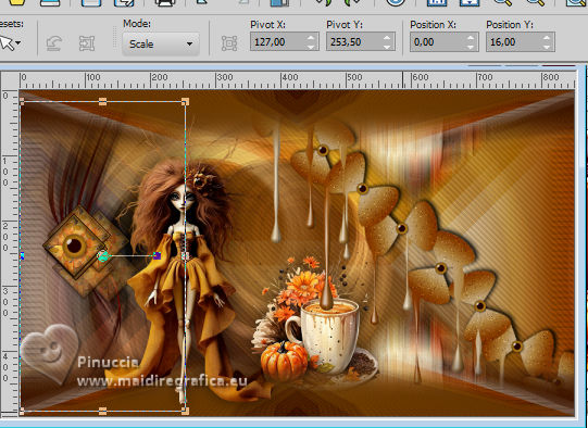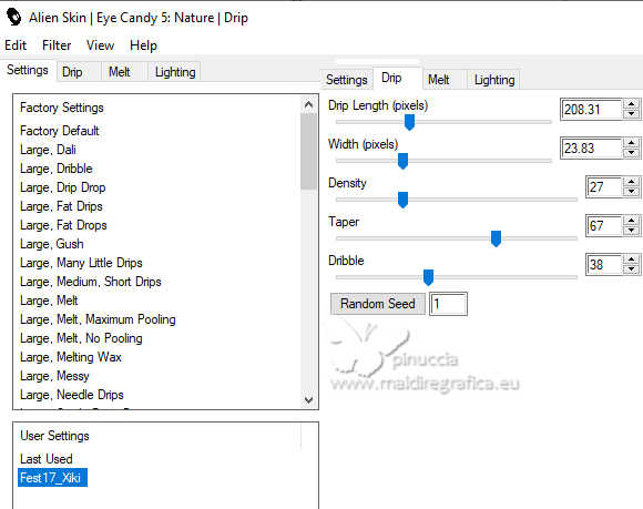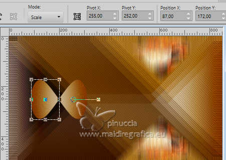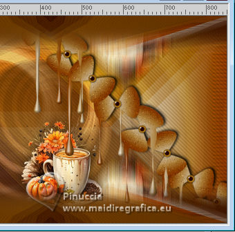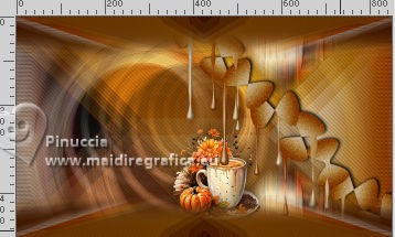 For this tutorial, you will need: ![]() Thanks for the tubes and the mask PqnaAlice and Narah. (The links of the tubemakers here). ![]() consult, if necessary, my filter section here Filters Unlimited 2.0 here &<Bkg Designer sf10I> - Cruncher (to import in Unlimited) here Alien Skin Eye Candy 5 Nature - Drip here AP Lines - Lines SilverLining here Borduremania - Ondulation here Mura's Meister - Copies, Perspective Tiling here Namesuppressed - Plaid Lite here ![]() You can change Blend Modes according to your colors. In the newest versions of PSP, you don't find the foreground/background gradient (Corel_06_029). You can use the gradients of the older versions. The Gradient of CorelX here Copy the preset One or two clic on the file (it depends by your settings), automatically the preset will be copied in the right folder. why one or two clic see here ![]() Copy the Selections in the Selections Folder. 1. Choose 3 colors to work. ![]() Set your foreground color to #270400, and your background color to #d08c1c ![]() color 3 #f1e6cf Set your foreground color to a Foreground/Background Gradient, style Radial. ![]() 2. Open a new transparent image 850 x 500 pixels. Flood Fill the transparent image with your Gradient.3. Effects>Plugins>Filters Unlimited 2.0 - &<Bkg Designer sf10 I> - Cruncher. ![]() 4. Effects>Geometric Effects>Skew. ![]() 5. Effects>Plugins>Borduremania (nvr) - Ondulation Color: foreground color. ![]() 6. Effects>Plugins>AP Lines - Lines SilverLining. ![]() 7. Effects>Plugins>Filters Unlimited 2.0 - &<Bkg Designer sf10 I> - Cruncher, default settings. ![]() 8. Selections>Load/Save Selections>Load Selection From Disk. Look for and load the selection Fest17_Xiki1 ![]() Selections>Promote Selection to Layer. Open the tube 126DiversosByPqnaAlice ![]() Erase the watermark and go to Edit>Copy. Go back to your work and go to Edit>Paste Into Selection. 9. Adjust>Blur>Motion Blur. ![]() Effects>Edge Effects>Enhance. Edit>Repeat Enhance Edges. Selections>Select None. 10. Effects>Reflection Effects>Rotating Mirror. ![]() 11. Activate the layer Raster 1. ![]() Selections>Load/Save Selections>Load Selection From Disk. Look for and load the selection Fest17_Xiki2 ![]() Selections>Promote Selection to Layer. Layers>Arrange>Bring to Top. Selections>Select None. 12. Effects>Geometric Effects>Circle ![]() Pick Tool ![]() Position X: 199,00 - Position Y: 172,00. ![]() Layers>Duplicate. Image>Flip>Flip Horizontal. Position X: 87,00 - Position Y: 172,00. ![]() Layers>Merge>Merge Down. 13. Image>Resize, to 50%, resize all layers not checked. Effects>Plugins>Mura's Meister - Copies ![]() AUTHOR'S NOTE: Since I used Line (random rotate), each time you apply it, even with the same settings, the positions will be random. 14. Image>Free Rotate - 45 degrees to right ![]() Position X: 270,00 - Positon Y: -82,00. ![]() 15. Activate your Crop Tool and click in Merged Opaque, then click on Apply ![]() 16. Adjust>Add/Remove Noise>Add Noise. ![]() Effects>3D Effects>Drop Shadow, color black #000000. ![]() 17. Activate the layer Raster 1. ![]() Layers>Duplicate. Layers>Arrange>Bring to Top. Effects>Plugins>Mura's Meister - Perspective Tiling. ![]() 18. Activate your Magic Wand Tool tolerance 0 and feather 60![]() and click in the transparent part to select it. Press 5 times CANC on the keyboard ![]() Selections>Select None. Effects>Reflection Effects>Rotating Mirror, default settings. ![]() 19. Layers>Duplicate. Image>Mirror>Mirror Vertical. 20. Activate the layer Pomoted Selection 1. ![]() Effects>Plugins>Alien Skin Eye Candy 5 Nature - Drip Select the preset Fest17_Xiki ![]() 21. Activate the layer below, Promoted Selection. Activate again the tube 126DiversosByPqnaAlice and go to Edit>Copy. Go back to your work and go to Edit>Paste as new layer. Image>Resize, is necessary, for the provided tube to 30%, resize all layers not checked. Image>Mirror>Mirror Horizontal. Adjust>Sharpness>Sharpen. Effects>3D Effects>Drop shadow, at your choice. Position the tube as shown in the screenshot, giving the impression that the Drip effect is falling into the cup. Part of the image was below the Copy of Raster 1 layer effect; leave it that way to create a somewhat mysterious feel. ![]() 22. Activate the layer Raster 1. Layers>New Raster Layer. Set your foreground color to the color 3 ![]() Flood Fill the layer with your foreground color.Layers>New Mask Layer>from Image Open the menu under the source window and you'll see all the files open. Select the mask Narah_Mask_1047 ![]() Layers>Merge>Merge Group. Adjust>Sharpness>Sharpen More. Layers>Properties>General>Blend Mode: Overlay. 23. Layers>Duplicate. Effects>Image Effects>Seamless Tiling. ![]() Layers>Arrange>Move Down. Layers>Properties>General>Blend Mode: Luminance (L), Opacity: 60%. author's note: in my second version I used Blend Mode: Dodge. 24. Activate the top layer, Copy (2) of Raster 1. Open the tube 129DiversosByPqnaAlice ![]() Erase the watermark and go to Edit>Copy. Go back to your work and go to Edit>Paste as New Layer. Image>Resize, if necessary, for the provided tube, to 40%. Adjust>Sharpness>Sharpen. Move a little to the left.Effects>3D Effects>Drop Shadow, at your choice. 25. Activate the layer Promoted Selection 1. Open Decor1_Xiki ![]() Erase the watermark and go to Edit>Copy. Go back to your work and go to Edit>Paste as New Layer. Move the deco it so it fits in the middle of the effect.*Note: If you can't get Decor1 to fit correctly, use Decor1_1_Xiki ![]() and duplicate it and fit it in the middle of the effects, as shown in the screenshot below. ![]() 26. Activate the tube's layer, Layer Raster 3. Open Decor2_Xiki ![]() Erase the watermark and go to Edit>Copy. Go back to your work and go to Edit>Paste as New Layer. Pick Tool ![]() Position X: 0,00 - Position Y: 16,00. ![]() Layers>Arrange>Move Down. This layer must be under the tube's layer. 27. For the borders, set again your foreground color to #270400, and set your background color to the color 3 #f