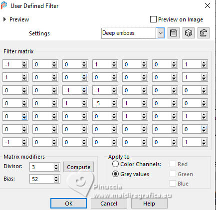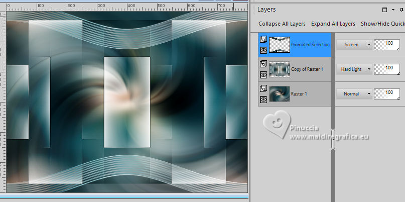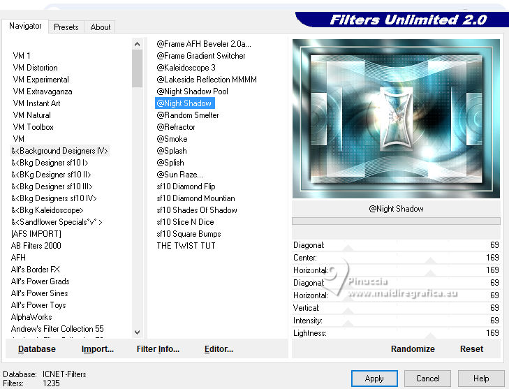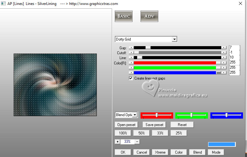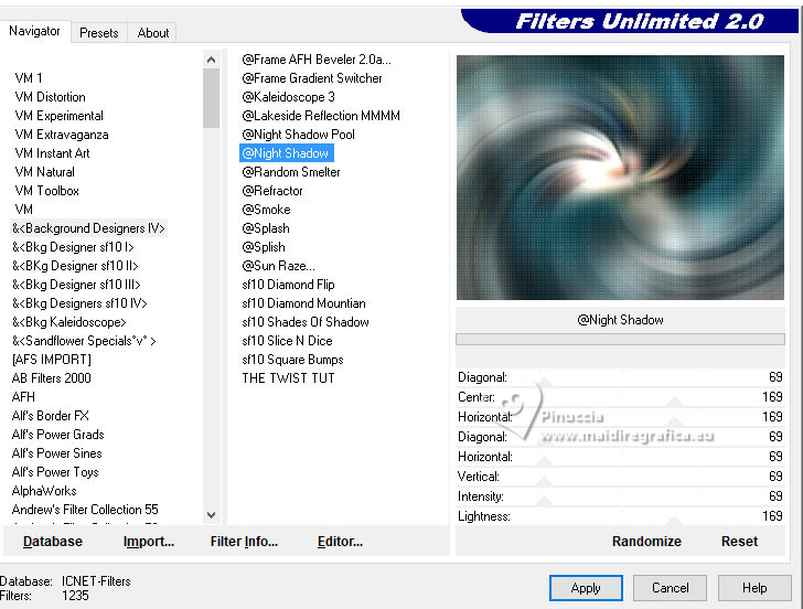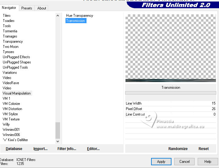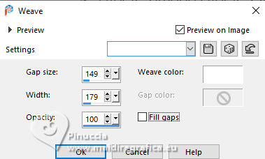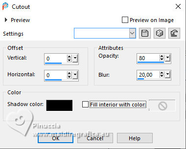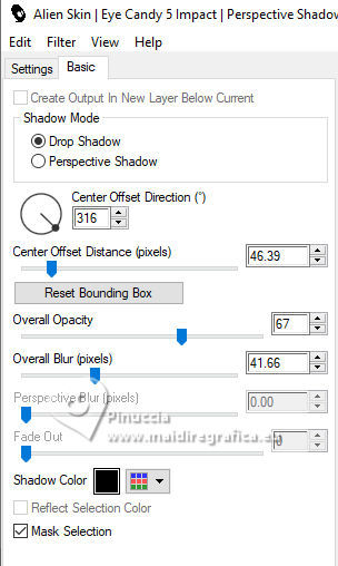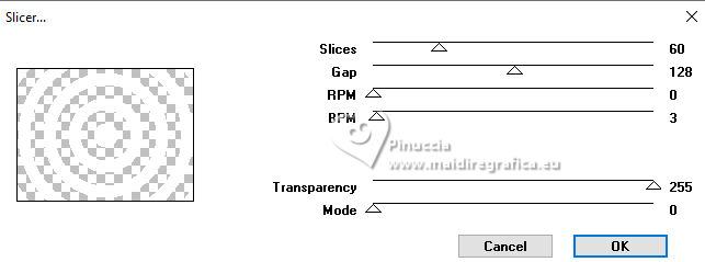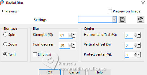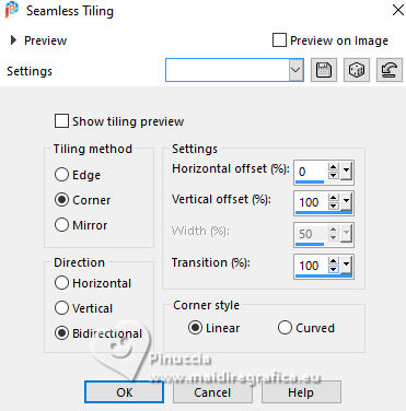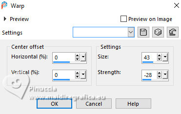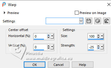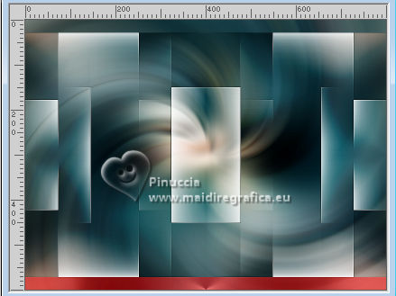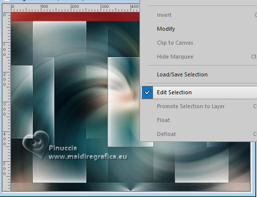 For this tutorial, you will need: ![]() For the tubes thanks PqnaAlice The rest of the material is by Soxikibem. (The links of the tubemakers here). ![]() consult, if necessary, my filter section here Filters Unlimited 2.0 here &<Background Designers IV> - @Night Shadow, (to import in Unlimited) here Alien Skin Eye Candy 5 Impact - Perspective Shadow here AP Lines - Lines Silverlining here Visual Manipulation - Transmission here VM Distortion - Slicer, Radiator II here Filters Visual Manipulation and VM Distortion can be used alone or imported into Filters Unlimited. (How do, you see here) If a plugin supplied appears with this icon You can also follow the video tutorial created by Soxikibem ![]() You can change Blend Modes according to your colors. ![]() Copy the preset Deep Emboss in the Presets Folder. 1. Choose 2 colors to work. Foreground: #063741 Background: #c2c8be ![]() 2. Open a new transparent image 800 x 600 pixels. Flood Fill the transparent image with your foreground color.Selections>Select All. Open the woman's tube 218FlorByPqnaAlice ![]() Erase the watermark and go to Edit>Copy. Minimize the tube. Go back to your work and go to Edit>Paste Into Selection. Selections>Select None. 3. Effects>Image Effects>Seamless Tiling, default settings. ![]() Adjust>Blur>Radial Blur. ![]() 4. Layers>Duplicate. Adjust>Blur>Gaussian Blur - radius 30. ![]() Effects>Texture Effects>Weave - weave color: white #ffffff ![]() 5. Effects>Image Effects>Seamless Tiling, default settings ![]() 6. Effects>Reflection Effects>Rotating Mirror, default settings. ![]() Repeat Effects>Reflection Effects>Rotating Mirror, Rotating Angle 90. ![]() Layers>Properties>General>Blend Mode: Hard Light. ![]() Effects>Edge Effects>Enhance. 7. Activate your Selection Tool ![]() (no matter the type of selection, because with the custom selection your always get a rectangle) clic on the Custom Selection ![]() and set the following settings. ![]() Press CANC on the keyboard ![]() Selections>Edit Selection - and the selected zone turns red ![]() Image>Mirror>Mirror Vertical (Image>Flip) ![]() Selections>Edit Selection - and the red zone returns normal. ![]() Press CANC on the keyboard. Keep selected 8. Activate the layer Raster 1. Selections>Promote Selection to Layer. Layers>Arrange>Bring to Top. Selections>Select None. Effects>Plugins>Filters Unlimited 2.0 - Visual Manipulation - Transmission. ![]() Effects>Edge Effects>Enhance. Layers>Duplicate. Image>Mirror>Mirror>Vertical. Layers>Merge>Merge Down. 9. Effects>Distortion Effects>Warp. ![]() Layers>Properties>General>Blend Mode: Screen. ![]() 10. Layers>New Raster Layer. Effects>Plugins>VM Distortion - Slicer ![]() 11. Image>Resize, to 60%, resize all layers not checked. Activate your Magic Wand Tool , tolerance 0, feather 40,and click in the transparent part to select it. Press 3 times CANC on the keyboard. Selections>Select None. don't forget to set again the feather to 0 Effects>Image Effects>Seamless Tiling. ![]() Layers>Arrange>Move Down - 2 times. ![]() 12. Effects>User Defined Filter - Deep emboss. ![]() Layers>Properties>General>Blend Mode: Overlay. ![]() 13. Activate the layer Raster 1. Effects>Plugins>AP [Lines] - Lines>Silverlining: Dotty Grid. ![]() 14. Effects>Plugins>Filters Unlimited 2.0 - &<Background Designers IV> - @Night Shadow. ![]() 15. Activate your top layer, Promoted Selection. Layers>New Raster Layer. Custom Selection ![]() ![]() Edit>Copy Special>Copy Merged. Edit>Paste Into Selection. 16. Layers>New Raster Layer. Activate again your woman's tube and go to Edit>Copy. Go back to your work and go to Edit>Paste Into Selection. Layers>Properties>General>Opacity: 40%. Layers>Merge>Merge Down. 17. Selections>Modify>Select Selection Borders. ![]() Set your foreground color to white #ffffff. Layers>New Raster Layer. Flood Fill the selection with your foreground color #ffffff.Selections>Select None. set again your foreground color to the first #063741. 18. Activate your Magic Wand Tool , tolerance and feather 0,and click in the rectangle to select it. Effects>3D Effects>Cutout. ![]() Selections>Select None. Layers>Merge>Merge Down. 19. Effects>Distortion Effects>Warp. ![]() Effects>3D Effects>Drop Shadow, color black #000000. ![]() 20. Layers>Merge>Merge Visibile. Layers>Duplicate. Image>Resize, to 90%, resize all layers not checked. Adjust>Sharpness>Sharpen. Effects>3D Effects>Drop Shadow, color black #000000. ![]() Effects>3D Effects>Drop Shadow, color black #000000. ![]() 21. Activate the layer Merged. Adjust>Blur>Gaussian Blur - radius 15. ![]() Effects>Plugins>VM Distortion - Radiator II. ![]() 22. Edit>Copy Image>Add Borders, 2 pixels, symmetric, foreground color. Image>Add Borders, 5 pixels, symmetric, bacground color. Selections>Select All. Image>Add Borders, 30 pixels, symmetric, whatever color. Selections>Invert. 23. Edit>Paste Into Selections - the image copied in sted 22 is in memory. Effects>Plugins>Filters Unlimited 2.0 - &< Background Designers IV> - @Night Shadow, default settings. ![]() Selections>Select None. Image>Add Borders, 2 pixels, symmetric, foreground color. Image>Add Borders, 15 pixels, symmetric, bacground color. 24. Activate again your woman's tube and go to Edit>Copy. Go back to your work and go to Edit>Paste as New Layer. Move the tube to the left side.Effects>Plugins>Alien Skin Eye Candy 5 Impact - Perspective Shadow. ![]() 25. Open TituloV_Xiki ![]() Erase the watermark and go to Edit>Copy. Go back to your work and go to Edit>Paste as New Layer. Pick Tool ![]() Position X: 597,00 - Position Y: 133,00. ![]() 26. Image>Add Borders>2 pixels, symmetric, foreground color. 27. Image>Resize, if you want. Sign your work and save as jpg. Version with my tube from Pinterest ![]() ![]() Your versions. Thanks ![]() If you have problems or doubts, or you find a not worked link, or only for tell me that you enjoyed this tutorial, write to me. |