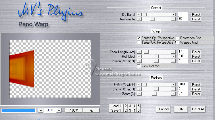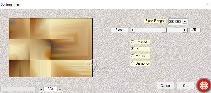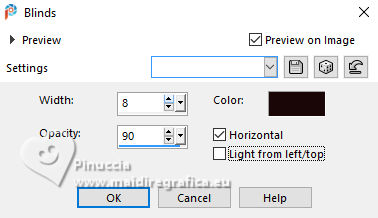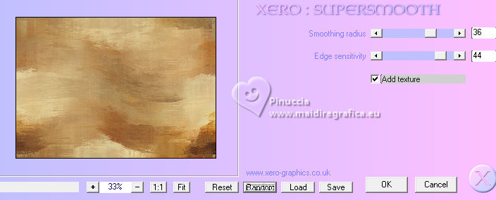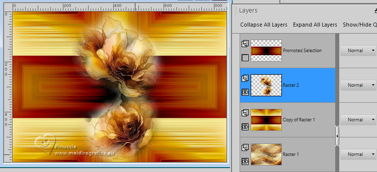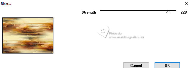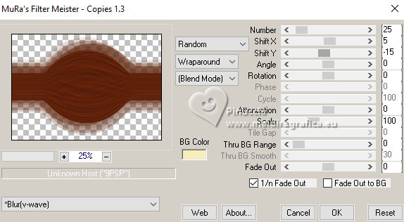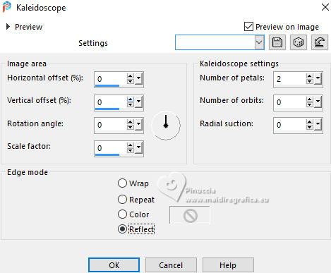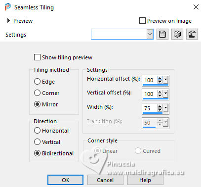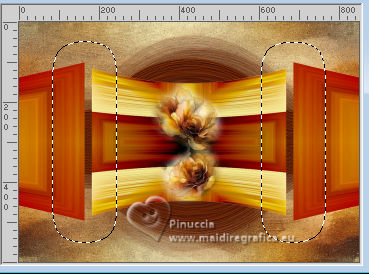 For this tutorial, you will need: ![]() Thanks for the tubes PqnaAlice. (The links of the tubemakers here). ![]() consult, if necessary, my filter section here Filters Unlimited 2.0 here Mehdi - Sorting Tiles here MV's Plugins - Panowarp here VM Toolbox - Blast here Mura's Meister - Copies here Xero - Super Smooth here Filters VM Toolbox can be used alone or imported into Filters Unlimited. (How do, you see here) If a plugin supplied appears with this icon ![]() You can change Blend Modes according to your colors. ![]() Copy the Selection in the Selections Folder. 1. Choose 3 colors to work. For the example: ![]() Set your foreground color to #1c0809, and your background color to #f8eeb9. ![]() color 3 #95380d 2. Open a new transparent image 850 x 600 pixels. Flood Fill the transparent image with your background color.Selections>Select All. Open your misted 212FlorByPqnaAlice ![]() Erase the watermark and go to Edit>Copy. Go back to your work and go to Edit>Paste Into Selection. Selections>Select None. 3. Effects>Image Effects>Seamless Tiling, default settings. ![]() Effects>Plugins>VM Toolbox - Blast. ![]() 4. Effects>Distortion Effects>Wave ![]() 5. Effects>Image Effects>Seamless Tiling. ![]() 6. Layers>Duplicate. Effects>Plugins>Mehdi - Sorting Tiles. ![]() 7. Effects>Reflection Effects>Kaleidoscope. ![]() 8. Layers>Duplicate. Layers>Properties>General> Blend Mode: Burn. in my second version I used Hard Light. ![]() Layers>Merge>Merge Down. Activate your Selection Tool , tolerance and feather 0,et select the rectangle effect ![]() Selections>Promote Selection to Layer. Selections>Select None. 9. Chiudi il livello Promoted Selection. Activate the layer below Copy of Raster 1. Edit>Paste as new layer - the floral misted is still in memory ![]() 10. Layers>Merge>Merge Down. Effects>Plugins>MV's Plugins - PanoWarp ![]() 11. Image>Resize, to 70%, resize all layers not checked. Activate your Selection Tool ![]() (no matter the type of selection, because with the custom selection your always get a rectangle) clic on the Custom Selection ![]() and set the following settings. ![]() Activate the layer Raster 1. Layers>New Raster Layer. Set your foreground color to the color 3 ![]() Flood Fill the selection with the color 3.Selections>Select None. Set again your foreground color with the color 1 ![]() 12. Effects>Texture Effects>Blinds - foreground color. ![]() 13. Effects>Distortion Effects>Warp. ![]() 14. Effects>Plugins>Mura's Meister - Copies ![]() 15. Effects>Edge Effects>Enhance. Activate the layer Raster 1. Effects>Plugins>Xero - Super Smooth ![]() 16. Adjust>Add/Remove Noise>Add Noise. ![]() 17. Open and activate the layer Promoted Selection. Effects>Plugins>MV's Plugins - PanoWarp ![]() 18. Pick Tool ![]() Position X: -96,00 - Position Y: 100,00. ![]() Layers>Duplicate. Image>Mirror>Mirror Horizontal. Layers>Merge>Merge Down. 19. Activate your Crop Tool ![]() click in Merge Opaque Layer ![]() and on Apply to apply the crop.20. Layers>Merge>Merge Down. Selections>Load/Save Selections>Load Selection From Disk. Look for and load the selection 284_Xiki_1 ![]() ![]() Press 5 times CANC on the keyboard .![]() Selections>Select None. 21. Effects>3D Effects>Drop Shadow, color black #000000 ![]() 22. Open TituloWOT_Xiki ![]() Erase the watermark and go to Edit>Copy. Go back to your work and go to Edit>Paste a New Layer. Pick Tool ![]() Position X: 93,00 - Position Y: 43,00. ![]() 23. Activate the layer Raster 1. Edit>Copy 24. Image>Add Borders - 1 pixel, symmetric, foreground color. Selections>Select All. Image>Add Borders - 10 pixels, symmetric, whatever color. Selections>Invert. Edit>Paste Into Selection. Selections>Select None. 25. Image>Add Borders, 1 pixel, symmetric, foreground color. Selections>Select All. Image>Add Borders, 50 pixels, symmetric, whatever color. Selections>Invert. Edit>Paste Into Selection 26. Selections>Invert. Effects>3D Effects>Drop Shadow, color black #000000. ![]() Selections>Select None. 27. Image>Add Borders, 2 pixels, symmetric, foreground color. 28. Open your main tube 090DiversosByPqnaAlice ![]() Erase the watermark and go to Edit>Copy. Go back to your work and go to Edit>Paste as New Layer. Image>Mirror>Mirror Horizontal. Place correctly the tube to the right side.Effects>3D Effects>Drop shadow, at your choice. 29. Sign your work and save as jpg. For the tubes of this version thanks Lady Valella and PqnaAlice ![]() ![]() Your versions. Thanks ![]() Irene ![]() Kika ![]() JMercedes ![]() Lynnette ![]() Marion ![]() If you have problems or doubts, or you find a not worked link, or only for tell me that you enjoyed this tutorial, write to me. |