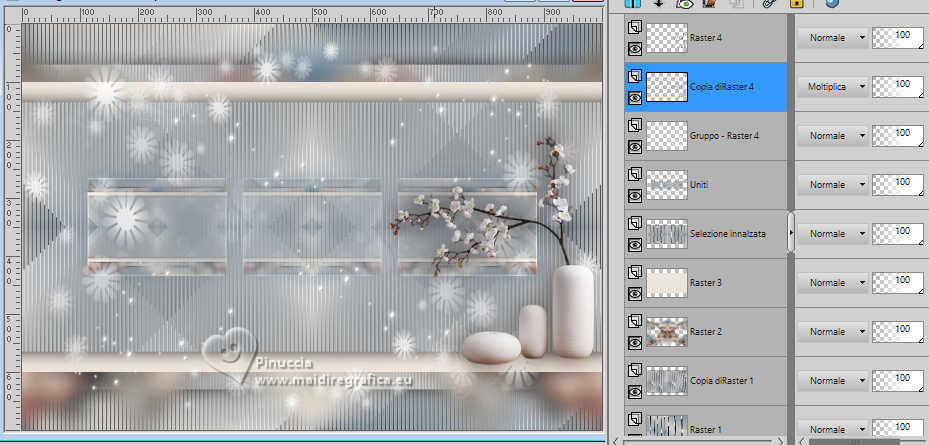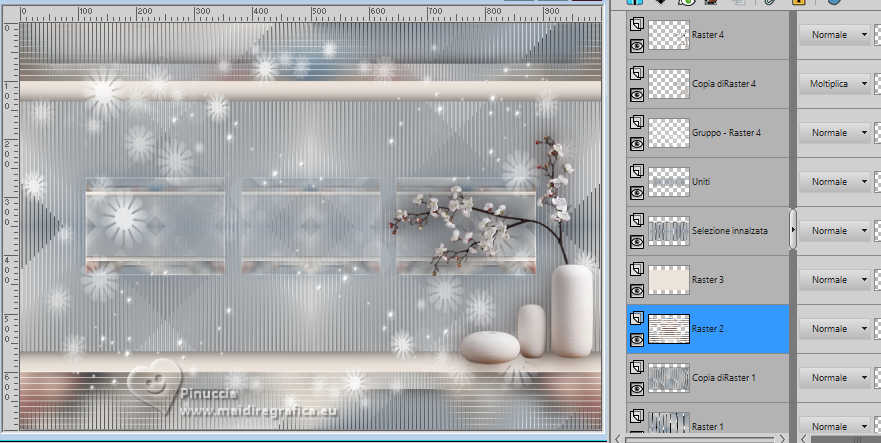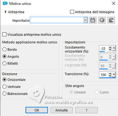 qui puoi trovare qualche risposta ai tuoi dubbi. Se l'argomento che ti interessa non è presente, ti prego di segnalarmelo. Questo tutorial è stato realizzato con PSP2020 e tradotto con PSPX9 e PSP2020, ma può essere eseguito anche con le altre versioni di PSP. Dalla versione X4, il comando Immagine>Rifletti è stato sostituito con Immagine>Capovolgi in orizzontale, e il comando Immagine>Capovolgi con Immagine>Capovolgi in verticale. Nelle versioni X5 e X6, le funzioni sono state migliorate rendendo disponibile il menu Oggetti. Con la nuova versione X7, sono tornati Rifletti>Capovolgi, ma con nuove varianti. Vedi la scheda sull'argomento qui traduzione in francese/traduction en français qui/ici traduzione in inglese/english translation qui/here Versioni/Versions qui![]() Occorrente: ![]() Per i tubes e la maschera grazie Silvie, Beatriz e Narah. Il resto del materiale è di Yedralina (in questa pagina trovi i links ai siti dei creatori di tubes) Filtri: se hai problemi con i filtri, consulta la mia sezione filtri qui Filters Unlimited 2.0 qui AP 01 [Innovations] - Lines SilverLining qui Mura's Seamless - Emboss at alpha qui Simple - Top Left Mirror qui Tramages - Tow the line qui AAA Filters - Custom qui I filtri Mura's Seamless, Simple e Tramages si possono usare da soli o importati in Filters Unlimited (come fare vedi qui) Se un filtro fornito appare con questa icona ![]() non esitare a cambiare modalità di miscelatura e opacità secondo i colori utilizzati. Nelle ultime versioni di PSP non c'è il gradiente di primo piano/sfondo (Corel_06_029) Puoi usare i gradienti delle versioni precedenti. Trovi qui i gradienti Corel X. ![]() Apri la maschera in PSP e minimizzala con il resto del materiale. Imposta il colore di primo piano con #ece3da, e il colore di sfondo con #758696 ![]() Passa il colore di primo piano a Gradiente di primo piano/sfondo, stile Radiale. ![]() 1. Apri una nuova immagine trasparente 1000 x 700 pixels, e riempila con il gradiente.2. Regola>Sfocatura>Sfocatura gaussiana - raggio 20. ![]() 3. Effetti>Plugins>Filters Unlimited 2.0 - Tramages - Tow the line, con i settaggi standard. ![]() 4. Effetti>Effetti di immagine>Motivo unico. ![]() Livelli>Duplica. Immagine>Ridimensiona, all'80%, tutti i livelli non selezionato. 5. Effetti>Effetti di immagine>Motivo unico, orizzontale selezionato. ![]() Immagine>Rifletti>Rifletti orizzontalmente. Effetti>Effetti 3D>Sfalsa ombra, colore nero. ![]() 6. Livelli>Nuovo livello raster. Selezione>Seleziona tutto. Apri il tube principale Black_Beauty85W_Silvie_29.04.2025 ![]() Modifica>Copia. Torna al tuo lavoro e vai a Modifica>Incolla nella selezione. Selezione>Deseleziona. 7. Effetti>Effetti di immagine>Motivo unico, con i settaggi standard. ![]() Regola>Sfocatura>Sfocatura gaussiana - raggio 15 ![]() Effetti>Effetti di riflesso>Specchio rotante, con i settaggi standard. ![]() Di nuovo Effetti>Effetti di riflesso>Specchio rotante, angolo 180. ![]() 8. Livelli>Nuovo livello raster. Attiva lo strumento Selezione ![]() (non importa il tipo di selezione impostato, perchè con la selezione personalizzata si ottiene sempre un rettangolo) clicca sull'icona Selezione personalizzata ![]() e imposta i seguenti settaggi. ![]() Passa il colore di primo piano a Colore. Riempi la selezione con il colore di primo piano.9. Attiva il livello Raster 1. Di nuovo Selezione personalizzata ![]() (la nuova selezione sostituirà la precedente) ![]() Selezione>Innalza selezione a livello. Livelli>Disponi>Porta in alto. 10. Effetti>Plugins>Filters Unlimited 2.0 - Simple - Top Left Mirror ![]() Effetti>Effetti 3D>Sfalsa ombra, colore nero. ![]() Selezione>Deseleziona. 11. Effetti>Effetti di immagine>Motivo unico. ![]() Livelli>Unisci>Unisci visibile a nuovo livello se stai usando una versione precedente. Modifica>Copia Speciale>Copia Unione Modifica>Incolla come nuovo livello 12. Immagine>Ridimensiona, al 30%, tutti i livelli non selezionato. Effetti>Effetti di immagine>Motivo unico. ![]() 13. Effetti>Effetti di riflesso>Specchio rotante, con i settaggi standard. ![]() Di nuovo Immagine>Ridimensiona, all'80%, tutti i livelli non selezionato. Regola>Messa a fuoco>Accentua messa a fuoco. Effetti>Effetti 3D>Sfalsa ombra, con i settaggi precedenti, ma con il colore di sfondo. ![]() 14. Livelli>Nuovo livello raster. Imposta il colore di primo piano con il colore bianco. Riempi il livello con il colore bianco.Livello>Nuovo livello maschera>Da immagine. Apri il menu sotto la finestra di origine e vedrai la lista dei files aperti. Seleziona l'immagine Narah_Mask_1240 ![]() Livelli>Unisci>Unisci gruppo. 15. Livelli>Duplica. Immagine>Rifletti>Rifletti orizzontalmente. Immagine>Rifletti>Rifletti verticalmente (Immagine>Capovolgi) Livelli>Unisci>Unisci giù. 16. Effetti>Plugins>Mura's Seamless - Emboss at Alpha, con i settaggi standard. ![]() 17. Apri il tube 3672-still life-LB TUBES ![]() Modifica>Copia. Torna al tuo lavoro e vai a Modifica>Incolla come nuovo livello. Immagine>Ridimensiona, se necessario, per il tube fornito all'85; tutti i livelli non selezionato. Sposta il tube a destra.18. Livelli>Duplica. Regola>Sfocatura>Sfocatura gaussiana - raggio 20. ![]() Cambia la modalità di miscelatura di questo livello in Moltiplica. Livelli>Disponi>Sposta giù. ![]() 19. Attiva il livello Raster 2. Effetti>Plugins>AP 01 [Innovations] - Lines SilverLining ![]() Risultato: ![]() 20. Immagine>Aggiungi bordatura, 2 pixels, simmetriche, colore di sfondo. Selezione>Seleziona tutto. Modifica>Copia 21. Immagine>Aggiungi bordatura, 50 pixels, simmetriche, con un colore qualsiasi. Selezione>Inverti. 22.Modifica>Incolla nella selezione - l'immagine in memoria. Regola>Sfocatura>Sfocatura gaussiana - raggio 15. ![]() Effetti>Effetti 3D>Sfalsa ombra, colore nero. ![]() Selezione>Deseleziona. 23. Attiva nuovamente il tube principale e vai a Modifica>Copia. Torna al tuo lavoro e vai a Modifica>Incolla come nuovo livello. Immagine>Ridimensiona, se necessario, per il tube fornito al 95; t
