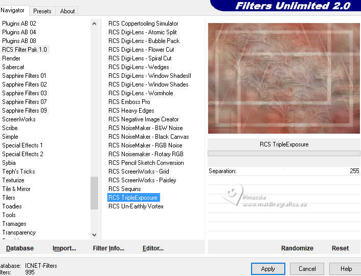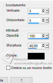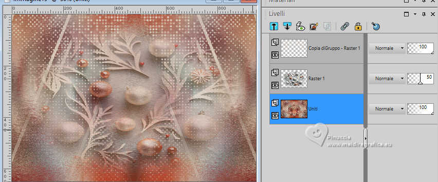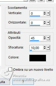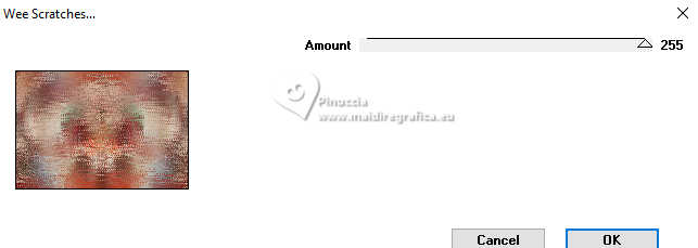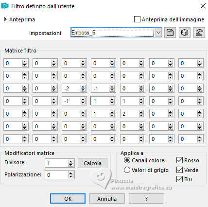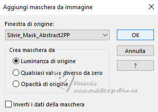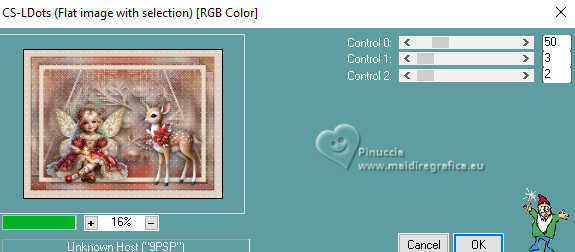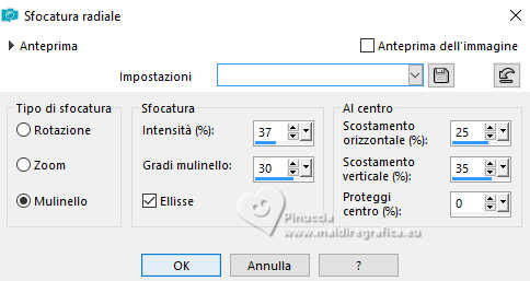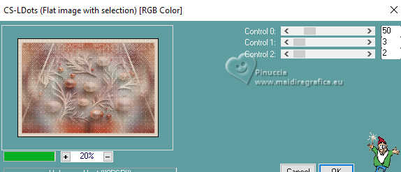 qui puoi trovare qualche risposta ai tuoi dubbi. Se l'argomento che ti interessa non è presente, ti prego di segnalarmelo. Questo tutorial è stato realizzato con PSP2020 e tradotto con PSPX9 e PSP2020, ma può essere eseguito anche con le altre versioni di PSP. Dalla versione X4, il comando Immagine>Rifletti è stato sostituito con Immagine>Capovolgi in orizzontale, e il comando Immagine>Capovolgi con Immagine>Capovolgi in verticale. Nelle versioni X5 e X6, le funzioni sono state migliorate rendendo disponibile il menu Oggetti. Con la nuova versione X7, sono tornati Rifletti>Capovolgi, ma con nuove varianti. Vedi la scheda sull'argomento qui traduzione in francese/traduction en français qui/ici traduzione in inglese/english translation qui/here Versioni/Versions qui![]() Occorrente: ![]() Grazie per i tubes Virginia, Mentali e per la maschera Silvie. (in questa pagina trovi i links ai siti dei creatori di tubes) Filtri: se hai problemi con i filtri, consulta la mia sezione filtri qui Filters Unlimited 2.0 qui Tramages - Wee Scratches qui Carolaine and Sensibility - CS-LDots qui RCS Filter Pak 1.0 - RCS-Triple Exposure qui Alien Skin Eye Candy 5 Impact - Glass qui I filtri Tramages e RCS Filter Pak si possono usare da soli o importati in Filters Unlimited (come fare vedi qui) Se un filtro fornito appare con questa icona ![]() ![]() non esitare a cambiare modalità di miscelatura e opacità secondo i colori utilizzati. Nelle ultime versioni di PSP non c'è il gradiente di primo piano/sfondo (Corel_06_029) Puoi usare i gradienti delle versioni precedenti. Trovi qui i gradienti Corel X. Metti il preset Cliccando sul file una o due volte (a seconda delle tue impostazioni), automaticamente il preset si installerà nella cartella corretta. perchè uno o due clic vedi qui ![]() Metti il preset Emboss 6 nella cartella Impostazioni predefinite. Apri la maschera in PSP e minimizzala con il resto del materiale. Colori ![]() 1. Imposta il colore di primo piano con #b63d24, e il colore di sfondo con #dfd3c3. ![]() Passa il colore di primo piano a Gradiente di primo piano/sfondo, stile Lineare. ![]() 2. Apri una nuova immagime trasparente 950 x 650 pixels. Riempi l'immagine trasparente con il gradiente.3. Livelli>Nuovo livello raster. Selezione>Seleziona tutto. Apri il tube principale CS_Noel_00029 ![]() Cancella il watermark e vai a Modifica>Copia. Minimizza il tube. Torna al tuo lavoro e vai a Modifica>Incolla nella selezione. Selezione>Deseleziona. 4. Effetti>Effetti di immagine>Motivo unico, con i settaggi standard. ![]() 5. Regola>Sfocatura>Sfocatura radiale. ![]() 6. Effetti>Filtro definito dall'utente - seleziona il preset Emboss 6 e ok. ![]() 7. Effetti>Effetti di riflesso>Specchio rotante, con i settaggi standard. ![]() 8. Livelli>Unisci>Unisci visibile. 9. Modifica>Copia. Modifica>Incolla come nuova immagine, e minimizza l'immagine per il momento. 10. Torna al tuo lavoro. Livelli>Nuovo livello raster. Riempi il livello con il colore chiaro di sfondo.Livelli>Nuovo livello maschera>Da immagine. Apri il menu sotto la finestra di origine e vedrai la lista dei files aperti. Seleziona la maschera Silvie_Mask_Abstract2PP ![]() Livelli>Unisci>Unisci gruppo. Livelli>Duplica. 11. Effetti>Effetti di riflesso>Specchio rotante. ![]() Livelli>Disponi>Sposta giù. Torna al livello superiore, Gruppo-Maschera 1. 12. Effetti>Effetti di riflesso>Specchio rotante, con i settaggi standard. ![]() Livelli>Unisci>Unisci giù. 13. Livelli>Nuovo livello raster. Selezione>Seleziona tutto. Apri il misted mentali-misted2764 ![]() Modifica>Copia. Torna al tuo lavoro e vai a Modifica>Incolla nella selezione. Selezione>Deseleziona. Abbassa l'opacità di questo livello al 50%, o secondo il tuo tube. Livelli>Disponi>Sposta giù. 14. Attiva il livello di sfondo, Uniti. Effetti>Plugins>Tramages - Wee Scratches, con i settaggi standard. ![]() 15. Dovresti avere questo ![]() 16. Immagine>Aggiungi bordatura, 1 pixel, simmetriche, colore di sfondo. Immagine>Aggiungi bordatura, 1 pixel, simmetriche, colore di primo piano. 17. Selezione>Seleziona tutto. Immagine>Aggiungi bordatura, 25 pixels, simmetriche, colore di sfondo. Selezione>Inverti. 18. Effetti>Plugins>Caroline and Sensibility - CS-LDots, con i settaggi standard. ![]() Effetti>Effetti di bordo>Dilata. Selezione>Deseleziona. 19. Di nuovo: Immagine>Aggiungi bordatura, 1 pixel, simmetriche, colore di primo piano. Immagine>Aggiungi bordatura, 1 pixel, simmetriche, colore di sfondo. 20. Selezione>Seleziona tutto. Immagine>Aggiungi bordatura, 50 pixels, simmetriche, con un colore qualsiasi. 21. Selezione>Inverti. Attiva l'immagine che hai minimizzato al punto 9 ![]() Modifica>Copia. Minimizza ancora l'immagine. Torna al tuo lavoro e vai a Modifica>Incolla nella selezione. 22. Effetti>Plugins>RCS Filter Pak 1.0 - RCS-TripleExposure. ![]() Effetti>Effetti di bordo>Aumenta di più. Selezione>Deseleziona. 23. Attiva nuovamente il tube principale e vai a Modifica>Copia. Torna al tuo lavoro e vai a Modifica>Incolla come nuovo livello. Immagine>Ridimensiona, se necessario - per il mio esempio ho ridimensionato al 60%, tutti i livelli non selezionato. Se ridimensioni: Regola>Messa a fuoco>Metti a fuoco. Sposta il tube a sinistra.24. Effetti>Effetti 3D>Sfalsa ombra, colore nero. ![]() 25. Apri il tube CV_Noel_00053 ![]() Cancella la firma e vai a Modifica>Copia. Torna al tuo lavoro e vai a Modifica>Incolla come nuovo livello. Immagine>Ridimensiona, se necessario - per il mio esempio non ho ridimensionato - tutti i livelli non selezionato. Se ridimensioni: Regola>Messa a fuoco>Metti a fuoco. Sposta il tube a destra.26. Effetti>Effetti 3D>Sfalsa ombra, con i settaggi precedenti. ![]() 27. Selezione>Seleziona tutto. Immagine>Aggiungi bordatura, 40 pixels, simmetriche, colore di sfondo. Selezione>Inverti. 28. Effetti>Plugins>Caroline and Sensibility - CS-LDots, con i settaggi precedenti. ![]() Effetti>Effetti di bordo>Dilata. 29. Selezione>Inverti. Effetti>Effetti 3D>Sfalsa ombra, colore ne