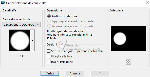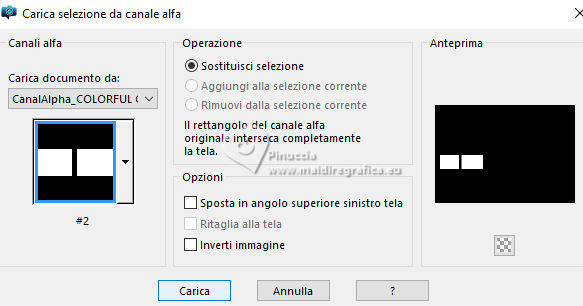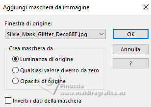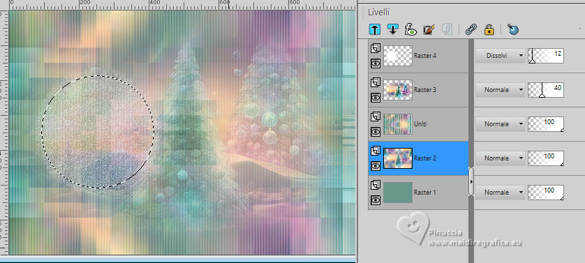 qui puoi trovare qualche risposta ai tuoi dubbi. Se l'argomento che ti interessa non è presente, ti prego di segnalarmelo. Questo tutorial è stato realizzato con PSP2020 e tradotto con PSPX9 e PSP2020, ma può essere eseguito anche con le altre versioni di PSP. Dalla versione X4, il comando Immagine>Rifletti è stato sostituito con Immagine>Capovolgi in orizzontale, e il comando Immagine>Capovolgi con Immagine>Capovolgi in verticale. Nelle versioni X5 e X6, le funzioni sono state migliorate rendendo disponibile il menu Oggetti. Con la nuova versione X7, sono tornati Rifletti>Capovolgi, ma con nuove varianti. Vedi la scheda sull'argomento qui traduzione in francese/traduction en français qui/ici traduzione in inglese/english translation qui/here Versioni/Versions qui![]() Occorrente: ![]() Grazie per i tubes Colybrix e Mentali, e per la maschera Silvie Il resto del materiale è di Yedralina (in questa pagina trovi i links ai siti dei creatori di tubes) Filtri: se hai problemi con i filtri, consulta la mia sezione filtri qui Filters Unlimited 2.0 qui Two Moon- Wish it would Rain qui Mehdi - Sorting Tiles qui RCS Filter Pak 1.0 - RCS TripleExposure qui Alien Skin Eye Candy 5 Impact - Glass, Perspective Shadow qui AAA Filters - Custom / AAA Frames - Foto Frame qui I filtri Two Moon e RCS Filter Pak si possono usare da soli o importati in Filters Unlimited (come fare vedi qui) Se un filtro fornito appare con questa icona ![]() ![]() non esitare a cambiare modalità di miscelatura e opacità secondo i colori utilizzati. Metti i presets Cliccando sul file una o due volte (a seconda delle tue impostazioni), automaticamente il preset si installerà nella cartella corretta. perchè uno o due clic vedi qui ![]() Apri la maschera in PSP e minimizzala con il resto del materiale. Se hai problemi con il canale alfa, apri una nuova immagine trasparente 1000 x 700 pixels e usa le selezioni da disco. Scegli dal tuo misted un colore possibilmente abbinato al tube principale. Per l'esempio: imposta il colore di primo piano con #68988b, e il colore di sfondo con il colore bianco #ffffff. ![]() colore 3 (usato per lo Sfalsa ombra) #3d606c 1. Apri CanalAlpha_COLORFUL CHRISTMAS Finestra>Duplica o sulla tastiera maiuscola+D per fare una copia. ![]() Chiudi l'originale. La copia, che sarà la base del tuo lavoro, non è vuota, ma contiene le selezioni salvate sul canale alfa. Riempi l'immagine trasparente con il colore di primo piano.2. Livelli>Nuovo livello raster. Selezione>Seleziona tutto. Apri il misted mentali-misted2782 ![]() Modifica>Copia. Torna al tuo lavoro e vai a Modifica>Incolla nella selezione. Selezione>Deseleziona. Regola>Sfocatura>Sfocatura gaussiana - raggio 10 ![]() Effetti>Effetti di immagine>Motivo unico, con i settaggi standard. ![]() 3. Livelli>Unisci>Unisci visibile a nuovo livello. nelle versioni meno recenti: Modifica>Copia Speciale>Copia Unione. Modifica>Incolla come nuovo livello 4. Effetti>Plugins>Mehdi - Sorting Tiles. ![]() 5. Effetti>Plugins>Filters Unlimited 2.0 - Two Moon - Wish it would rain. ![]() 6. Effetti>Plugins>Filters Unlimited 2.0 - RCS Filter Pak 1.0 - RCS TripleExposure, con i settaggi standard. ![]() 7. Effetti>Effetti di riflesso>Specchio rotante. ![]() 8. Immagine>Rifletti>Rifletti orizzontalmente. Qui, il risultato può essere un po' differente, perchè dipende dal tube usato 9. Effetti>Plugins>AAA Filters - Custom - Landscape e ok. ![]() 10. Modifica>Incolla come nuovo livello - il tuo misted è ancora in memoria. Immagine>Ridimensiona, se necessario. Nel mio caso, ho ridimensionato soltanto il terzo lavoro all'80%. Regola>Messa a fuoco>Metti a fuoco Abbassa l'opacità di questo livello al 40%. Effetti>Effetti di bordo>Aumenta. Rimani su questo livello. 11. Livelli>Nuovo livello raster. Selezione>Carica/Salva selezione>Carica selezione da canale alfa. La selezione #1 è subito disponibile. Devi soltanto cliccare Carica (selezione da disco ©Yedralina_Sel0927). ![]() 12. Riempi la selezione con il colore bianco di sfondo(clicca 4 volte, per riempire bene). Selezione>Modifica>Contrai - 35 pixels. Cambia la modalità di miscelatura di questo livello in Dissolvi, e abbassa l'opacità +/-12%, a tuo piacimento. Mantieni selezionato. 13. Attiva il livello Raster 2 (sotto il livello Uniti). ![]() Selezione>Innalza selezione a livello. Livelli>Disponi>Porta in alto. Mantieni sempre selezionato. 14. Modifica>Incolla nella selezione - il misted è sempre in memoria. Abbassa l'opacità di questo livello +/-75%, secondo il tube. Regola>Messa a fuoco>Metti a fuoco. 15. Effetti>Plugins>Alien Skin Eye Candy 5 Impact - Glass Seleziona il preset ©Yedralina_Glass2 ![]() Selezione>Deseleziona. 16. Selezione>Carica/Salva selezione>Carica selezione da canale alfa. Apri il menu delle selezioni e carica la selezione #2 (da disco Sel0126). ![]() Attiva il livello Raster 2. Selezione>Innalza selezione a livello. Livelli>Disponi>Porta in alto. 17. Attiva il tuo misted. Immagine>Rifletti>Rifletti orizzontalmente. Modifica>Copia. 18. Torna al tuo lavoro e vai a Modifica>Incolla nella selezione. Regola>Messa a fuoco>Metti a fuoco. 19. Effetti>Plugins>AAA Frames - Foto Frame. ![]() 20. Effetti>Effetti 3D>Sfalsa ombra, colore nero. ![]() Selezione>Deseleziona. 21. Attiva il livello del misted, Raster 3. Livelli>Nuovo livello raster. Riempi il livello con il colore bianco.Livelli>Nuovo livello maschera>Da immagine. Apri il menu sotto la finestra di origine e vedrai la lista dei files aperti. Seleziona la maschera Silvie_Mask_Glitter_Deco88T ![]() Livelli>Unisci>Unisci gruppo. 22. Immagine>Rifletti>Rifletti orizzontalmente. Regola>Messa a fuoco>Metti a fuoco. Cambia la modalità di miscelatura di questo livello in Filtra. 23. Selezione>Seleziona tutto. Immagine>Aggiungi bordatura, 45 pixels, simmetriche, colore bianco. 24. Effetti>Plugins>Alien Skin Eye Candy 5 Impact - Perspective Shadow. Seleziona il preset EC5-DS3-©Yedralina ![]() Selezione>Deseleziona. 25. Apri il tube Deco00157©Yedralin