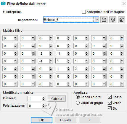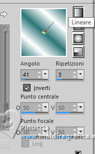 qui puoi trovare qualche risposta ai tuoi dubbi. Se l'argomento che ti interessa non è presente, ti prego di segnalarmelo. Questo tutorial è stato realizzato con PSP2020 e tradotto con PSPX9 e PSP2020, ma può essere eseguito anche con le altre versioni di PSP. Dalla versione X4, il comando Immagine>Rifletti è stato sostituito con Immagine>Capovolgi in orizzontale, e il comando Immagine>Capovolgi con Immagine>Capovolgi in verticale. Nelle versioni X5 e X6, le funzioni sono state migliorate rendendo disponibile il menu Oggetti. Con la nuova versione X7, sono tornati Rifletti>Capovolgi, ma con nuove varianti. Vedi la scheda sull'argomento qui traduzione in francese/traduction en français qui/ici traduzione in inglese/english translation qui/here Versioni/Versions qui![]() Occorrente: ![]() Per il tube grazie Lady Valella. Materiale di Yedralina. (in questa pagina trovi i links ai siti dei creatori di tubes) Filtri: se hai problemi con i filtri, consulta la mia sezione filtri qui Filters Unlimited 2.0 qui Mehdi - Sorting Tiles qui Graphics Plus - Vertical Mirror qui Alien Skin Eye Candy 5 Impact - Glass qui Mura's Meister - Perspective Tiling, Copies qui AAA Frames - Foto Frame qui I filtri Graphics Plus si possono usare da soli o importati in Filters Unlimited (come fare vedi qui) Se un filtro fornito appare con questa icona ![]() non esitare a cambiare modalità di miscelatura e opacità secondo i colori utilizzati. Nelle ultime versioni di PSP non c'è il gradiente di primo piano/sfondo (Corel_06_029) Puoi usare i gradienti delle versioni precedenti. Trovi qui i gradienti Corel X. Metti il preset Cliccando sul file una o due volte (a seconda delle tue impostazioni), automaticamente il preset si installerà nella cartella corretta. perchè uno o due clic vedi qui ![]() Metti il preset Emboss 6 nella cartella Impostazioni predefinite. Metti la maschera 20_21 nella cartella Maschere. Se hai problemi con il canale alfa, apri una nuova immagine trasparente 1000 x 700 pixels, e usa le selezioni da disco (da mettere nella cartella Selezioni). Colori ![]() Imposta il colore di primo piano con il colore bianco #ffffff e il colore di sfondo con #2e7579. ![]() colore 3 #a2dadc colore 4 #153739 Passa il colore di primo piano a Gradiente di primo piano/sfondo, stile Lineare. ![]() 1. Apri CanalAlpha Franie Questa immagine non è vuota, ma contiene le selezioni salvate sul canale alfa. Selezione>Seleziona tutto. 2. Apri l'immagine in jpg flor Franie ![]() Modifica>Copia. Torna al tuo lavoro e vai a Modifica>Incolla nella selezione. Selezione>Deseleziona. 3. Effetti>Effetti di immagine>Motivo unico, con i settaggi standard. ![]() 4. Effetti>Plugins>Mehdi - Sorting Tiles. ![]() 5. Effetti>Effetti di riflesso>Specchio rotante, con i settaggi standard. ![]() 6. Effetti>Effetti di immagine>Motivo unico. ![]() 7. Livelli>Duplica. Effetti>Plugins>Mura's Meister - Perspective Tiling. ![]() 8. Attiva lo strumento Bacchetta magica , tolleranza 0, sfumatura 40,e clicca nella parte trasparente per selezionarla. Premi 3/5 volte CANC sulla tastiera ![]() Selezione>Deseleziona. non dimenticare di riportare la sfumatura a 0 9. Livelli>Nuovo livello raster. Selezione>Seleziona tutto. Modifica>Incolla nella seleziona - l'immagine jpg è ancora in memoria. Selezione>Deseleziona. 10. Livelli>Carica/Salva maschera>Carica maschera da disco. Cerca e carica la maschera 20_21 ![]() Livelli>Duplica - 2 volte ![]() Livelli>Unisci>Unisci gruppo. 12. Abbassa l'opacità di questo livello +/-72%, secondo il tuo tube. 13. Andiamo ad aggiungere il deco maschera questo tube è stato realizzato a partire dalla maschera 1250182443_nikita_masque aggiunta nel materiale Apri Deco_mask_y ![]() Modifica>Copia. Torna al tuo lavoro e vai a Modifica>Incolla come nuovo livello. Non spostarlo. 14. Abbassa l'opacità di questo livello +/-40%, secondo i colori della tua immagine. 15. Effetti>Filtro definito dall'utente - seleziona il preset Emboss 6 ![]() Effetti>Effetti di riflesso>Specchio rotante, con i settaggi standard. ![]() 16. Effetti>Effetti 3D>Sfalsa ombra, colore 4 #153739. ![]() Attiva il livello sottostante del misted. 17. Selezione>Carica/Salva selezione>Carica selezione da canale alfa. La selezione #1 è subito disponibile. Devi soltanto cliccare Carica (o selezione da disco ©Yedralina_Sel0921. ![]() Selezione>Innalza selezione a livello. 18. Livelli>Disponi>Sposta su. 19. Cambia la modalità di miscelatura di questo livello in Moltiplica. Selezione>Inverti. 20. Effetti>Effetti 3D>Sfalsa ombra, con i settaggi precedenti ancora in memoria. ![]() Selezione>Deseleziona. 21. Livelli>Nuovo livello raster. Selezione>Carica/Salva selezione>Carica selezione da canale alfa. Apri il menu delle selezioni e carica la selezione #2 (selezione ©Yedralina_Sel0922). ![]() Passa il colore di primo piano a Colore. Riempi la selezione con il colore bianco.22. Selezione>Modifica>Contrai - 2 pixels. Riempi la selezione con il colore di sfondo.23. Selezione>Modifica>Contrai - 5 pixels. Riempi la selezione con il colore bianco.24. Selezione>Modifica>Contrai - 2 pixels. Riempi la selezione con il colore di sfondo.25. Effetti>Plugins>Alien Skin Eye Candy 5 Impact - Glass Preset ©Yedralina_Glass6 ![]() Selezione>Deseleziona. 26. Effetti>Effetti di riflesso>Specchio rotante, con i settaggi standard. ![]() 27. Effetti>Effetti di immagine>Scostamento. ![]() 28. Apri Deco_lineas_y ![]() Modifica>Copia. Torna al tuo lavoro e vai a Modifica>Incolla come nuovo livello. Effetti>Effetti di immagine>Scostamento. ![]() 29. Attiva il livello di sfondo. Effetti>Plugins>Filters Unlimited 2.0 - Graphics Plus - Vertical Mirror, con i settaggi standard. ![]() 30. Sposta il livello del misted sopra il livello di sfondo. Dovresti avere questo. ![]() 31. Immagine>Aggiungi bordatura, 2 pixels, simmetriche, colore bianco. Immagine>Aggiungi bordatura, 2 pixels, simmetriche, colore 3 #a2dadc. Immagine>Aggiungi bordatura, 2 pixels, simmetriche, colore di sfondo 32. Modifica>Cop