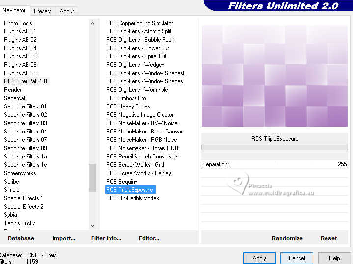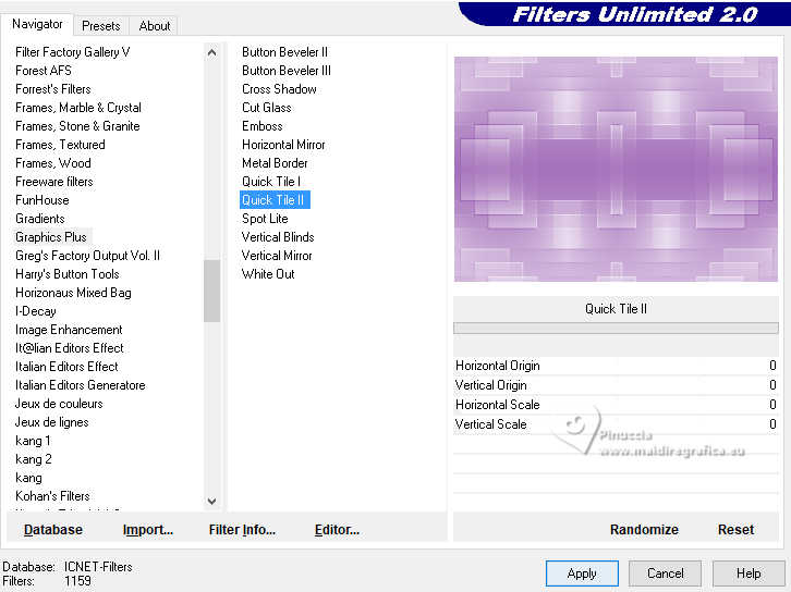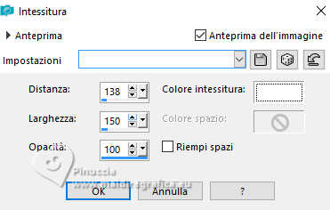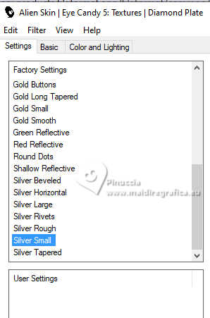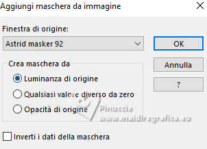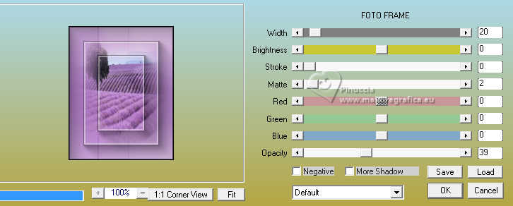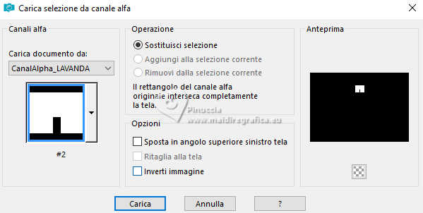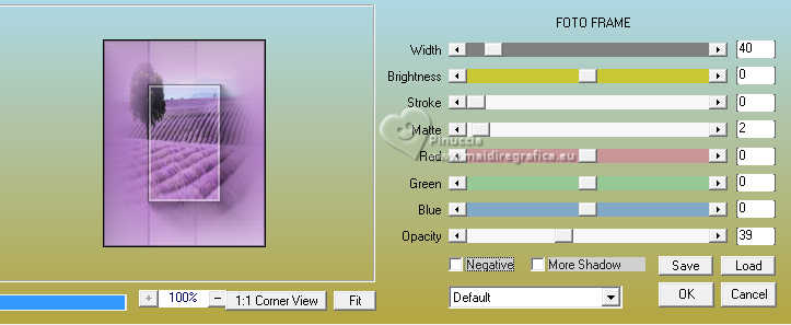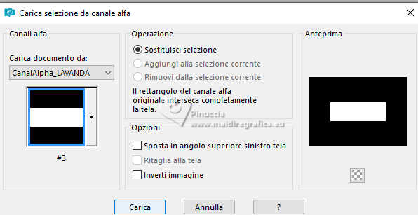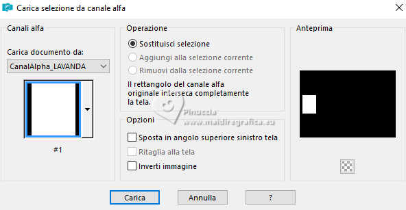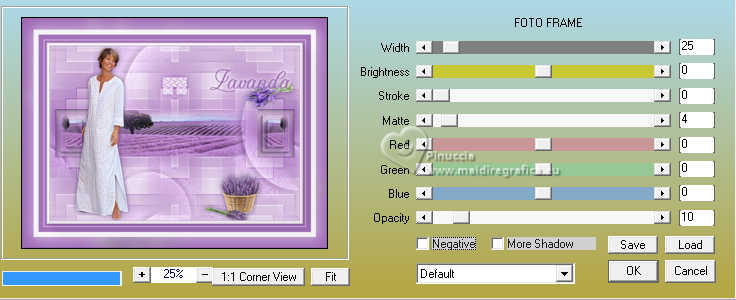 qui puoi trovare qualche risposta ai tuoi dubbi. Se l'argomento che ti interessa non è presente, ti prego di segnalarmelo. Questo tutorial è stato realizzato con PSP2020 e tradotto con PSPX9 e PSP2020, ma può essere eseguito anche con le altre versioni di PSP. Dalla versione X4, il comando Immagine>Rifletti è stato sostituito con Immagine>Capovolgi in orizzontale, e il comando Immagine>Capovolgi con Immagine>Capovolgi in verticale. Nelle versioni X5 e X6, le funzioni sono state migliorate rendendo disponibile il menu Oggetti. Con la nuova versione X7, sono tornati Rifletti>Capovolgi, ma con nuove varianti. Vedi la scheda sull'argomento qui traduzione in francese/traduction en français qui/ici traduzione in inglese/english translation qui/here Versioni/Versions qui![]() Occorrente: ![]() Per il tube grazie Coly. Il resto del materiale è di Yedralina. (in questa pagina trovi i links ai siti dei creatori di tubes) Filtri: se hai problemi con i filtri, consulta la mia sezione filtri qui Filters Unlimited 2.0 qui RCS Filter Pak 1.0 - RCS TripleExposure qui Graphics Plus - Quick Tile II qui Alien Skin Eye Candy 5 Textures - Diamond Plate qui AAA Frames - Foto Frame qui I filtri RCS Filter Pak e Graphics Plus si possono usare da soli o importati in Filters Unlimited (come fare vedi qui) Se un filtro fornito appare con questa icona ![]() non esitare a cambiare modalità di miscelatura e opacità secondo i colori utilizzati. Nelle ultime versioni di PSP non c'è il gradiente di primo piano/sfondo (Corel_06_029) Puoi usare i gradienti delle versioni precedenti. Trovi qui i gradienti Corel X. ![]() Metti il preset Emboss 6 nella cartella Impostazioni predefinite. Apri la maschera in PSP e minimizzala con il resto del materiale. Se hai problemi con il canale alfa, apri una nuova immagine trasparente 1000 x 700 pixels, e usa le selezioni da disco (da mettere nella cartella Selezioni). Colori ![]() Imposta il colore di primo piano con il colore #a36eb9, e il colore di sfondo con il colore bianco #ffffff ![]() colore 3 #322541 (che servirà per l'Effetto Sfalsa ombra) Passa il colore di primo piano a Gradiente di primo piano/sfondo, stile Lineare. ![]() Passa il colore di sfondo a Gradiente di primo piano/sfondo, stile Lineare. ![]() 1. Apri CanalAlpha_LAVANDA Questa immagine non è vuota, ma contiene le selezioni salvate sul canale alfa. Riempi l'immagine trasparente con il gradiente Lineare di sfondo.2. Effetti>Effetti di trama>Intessitura. Colore intessitura #ffffff ![]() 3. Effetti>Plugins>RCS Filter Pak 1.0 - RCS TripleExposure, con i settaggi standard. ![]() 4. Effetti>Effetti di riflesso>Specchio rotante. ![]() Effetti>Effetti di riflesso>Specchio rotante. ![]() 5. Effetti>Filtro definito dall'utente - seleziona il preset Emboss 6 ![]() 6. Effetti>Plugins>Graphics Plus - Quick Tile II, con i settaggi standard. ![]() 7. Selezione>Carica/Salva selezione>Carica selezione da canale alfa. La selezione #1 è subito disponibile. Devi soltanto cliccare Carica (o selezione da disco ©Yedralina_Sel096). ![]() Selezione>Innalza selezione a livello. 8. Apri il misted 3570©Yedralina ![]() Cancella il watermark e vai a Modifica>Copia. Torna al tuo lavoro e vai a Modifica>Incolla nella selezione. 9. Effetti>Plugins>AAA Frames - Foto Frame. ![]() 10. Di nuovo Effetti>Plugins>AAA Frames - Foto Frame - width 20. ![]() Selezione>Deseleziona. 11. Effetti>Effetti di riflesso>Specchio rotante. ![]() 12. Livelli>Nuovo livello raster. Selezione>Carica/Salva selezione>Carica selezione da canale alfa. Apri il menu delle selezioni e carica la selezione #2 (selezione ©Yedralina_Sel101). ![]() Riempi la selezione con il gradiente Lineare di primo piano.13. Effetti>Plugins>Alien Skin Eye Candy 5 Textures - Diamond Plate (Silver Small). ![]() 14. Effetti>Effetti 3D>Sfalsa ombra, colore 3 #322541. ![]() Cambia la modalità di miscelatura di questo livello in Sovrapponi o Luminanza, a tuo piacimento. 15. Livelli>Nuovo livello raster. Selezione>Carica/Salva selezione>Carica selezione da canale alfa. Apri il menu delle selezioni e carica la selezione #3 (selezione ©Yedralina_Sel098). ![]() 16. Modifica>Incolla nella selezione - il misted è ancora in memoria. Selezione>Deseleziona. 17. Attiva il livello di sfondo. Livelli>Nuovo livello raster. Passa il colore di sfondo a Colore. Riempi il livello con il colore bianco di sfondo.18. Livello>Nuovo livello maschera>Da immagine. Apri il menu sotto la finestra di origine e vedrai la lista dei files aperti. Seleziona la maschera Astrid masker 92 ![]() Livelli>Unisci>Unisci gruppo. 19. Immagine>Rifletti>Rifletti orizzontalmente. Cambia la modalità di miscelatura di questo livello in Luminanza (esistente). 20. Attiva il livello superiore. Apri il tube principale femme659-coly ![]() Cancella il watermark e vai a Modifica>Copia. Torna al tuo lavoro e vai a Modifica>Incolla come nuovo livello. Immagine>Ridimensiona, se necessario, per il tube fornito all'85%, tutti i livelli non selezionato. Sposta il tube a sinistra21. Effetti>Effetti 3D>Sfalsa ombra, a tuo piacimento. Io ho applicato l'ombra già in memoria. 22. Apri il tube cesta_lavanda ![]() Modifica>Copia. Torna al tuo lavoro e vai a Modifica>Incolla come nuovo livello. Immagine>Rifletti>Rifletti orizzontalmente. Immagine>Ridimensiona, se necessario - per il tube fornito al 45%, tutti i livelli non selezionato. Sposta il tube in basso a destra.Effetti>Effetti 3D>Sfalsa ombra, a tuo piacimento. Io ho applicato l'ombra già in memoria. 23. Apri il testo Titulo_Lavanda ![]() Modifica>Copia. Torna al tuo lavoro e vai a Modifica>Incolla come nuovo livello. 24. Tasto K per attivare lo strumento Puntatore ![]() Posizione X: 622,00 - Posizione Y: 68,00. ![]() 25. Attiva il livello di sfondo. Modifica>Copia 26. Immagine>Aggiungi bordatura, 1 pixel, simmetriche, colore di primo piano. Immagine>Aggiungi bordatura, 1 pixel, simmetriche, colore di sfondo. Immagine>Aggiungi bordatura, 1 pixel, simmetriche, colore di primo piano. 27. Immagi