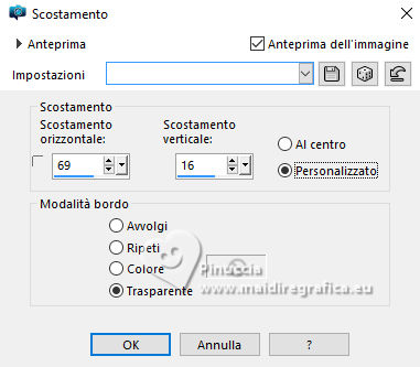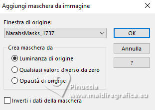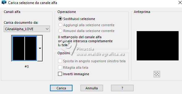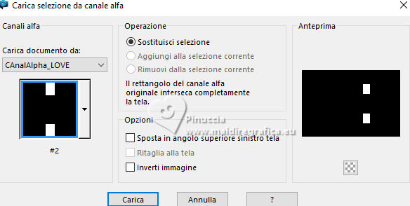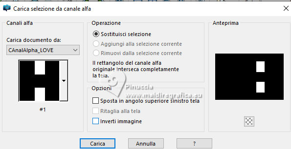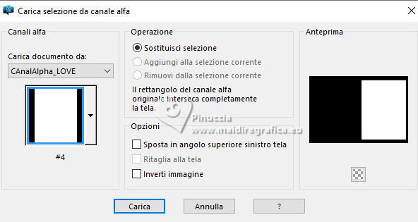 qui puoi trovare qualche risposta ai tuoi dubbi. Se l'argomento che ti interessa non è presente, ti prego di segnalarmelo. Questo tutorial è stato realizzato con PSP2020 e tradotto con PSPX9 e PSP2020, ma può essere eseguito anche con le altre versioni di PSP. Dalla versione X4, il comando Immagine>Rifletti è stato sostituito con Immagine>Capovolgi in orizzontale, e il comando Immagine>Capovolgi con Immagine>Capovolgi in verticale. Nelle versioni X5 e X6, le funzioni sono state migliorate rendendo disponibile il menu Oggetti. Con la nuova versione X7, sono tornati Rifletti>Capovolgi, ma con nuove varianti. Vedi la scheda sull'argomento qui traduzione in francese/traduction en français qui/ici traduzione in inglese/english translation qui/here Versioni/Versions qui![]() Occorrente: ![]() Grazie per il tube Kad e per la maschera Narah. (in questa pagina trovi i links ai siti dei creatori di tubes) Filtri: se hai problemi con i filtri, consulta la mia sezione filtri qui AAA Frames - Foto Frame qui Alien Skin Eye Candy 5 Textures - Weave qui ![]() non esitare a cambiare modalità di miscelatura e opacità secondo i colori utilizzati. Nelle ultime versioni di PSP non c'è il gradiente di primo piano/sfondo (Corel_06_029) Puoi usare i gradienti delle versioni precedenti. Trovi qui i gradienti Corel X. Metti il preset Cliccando sul file una o due volte (a seconda delle tue impostazioni), automaticamente il preset si installerà nella cartella corretta. perchè uno o due clic vedi qui Se preferisci, puoi importare direttamente il preset nel corso del tutorial Come fare vedi la scheda del filtro Eye Candy qui ![]() Metti il pennello nella cartella Pennelli. Attenzione, il pennello è composto da due files che non devono essere separati. Il pennello è stato creato con PSPX9; se nella tua versione non funziona, apri il file in jpg ed esportalo come Pennello personalizzato (File>Esporta>Pennello personalizzato) Vedi gli appunti sui Pennelli qui Metti il preset Emboss 3 nella cartella Impostazioni predefinite. Apri la maschera in PSP e minimizzala con il resto del materiale. 1. Imposta il colore di primo piano con #941515, e il colore di sfondo con #ffffff. ![]() Passa il colore di primo piano a Gradiente di primo piano/sfondo, stile Rettangolare. ![]() Apri CanalAlpha_LOVE. Questa immagine, che sarà la base del tuo lavoro, non è vuota, ma contiene le selezioni salvate sul canale alfa. Riempi l'immagine trasparente con il gradiente rettangolare.Regola>Sfocatura>Sfocatura gaussiana - raggio 15. ![]() 2. Effetti>Plugins>AAA Frames - Foto Frame. ![]() Livelli>Duplica. 3. Effetti>Plugins>Alien Skin Eye Candy 5 Textures - Weave Seleziona il preset EC5T_Weave01_Yedra e ok. ![]() Effetti>Effetti 3D>Sfalsa ombra, colore nero. ![]() 4. Effetti>Effetti di immagine>Motivo unico. ![]() 5. Effetti>Effetti di riflesso>Specchio rotante. ![]() 6. Selezione>Carica/Salva selezione>Carica selezione da canale alfa. La selezione #1 è subito disponibile. Devi soltanto cliccare Carica. ![]() Livelli>Nuovo livello raster. Selezione>Inverti. Effetti>Effetti 3D>Sfalsa ombra, colore nero. ![]() Selezione>Inverti. Selezione>Modifica>Contrai - 25 pixels. Riempi la selezione con il colore bianco.Selezione>Modifica>Contrai - 1 pixel. Premi sulla tastiera il tasto CANC .7. Selezione>Carica/Salva selezione>Carica selezione da canale alfa. Apri il menu delle selezioni e carica la selezione #2 ![]() Apri il misted KaD_MistedPeople1 ![]() Cancella il watermark e vai a Modifica>Copia. Torna al tuo lavoro e vai a Modifica>Incolla come nuovo livello. Posiziona il tube sulla selezione, a tuo piacimento.![]() 8. Selezione>Inverti. Premi sulla tastiera il tasto CANC ![]() Selezione>Deseleziona. 9. Livelli>Disponi>Sposta giù. Attiva nuovamente il livello superiore delle cornici. Cambia la modalità di miscelatura di questo livello in Luminanza (esistente). 10. Livelli>Nuovo livello raster. Riempi il livello con il colore bianco.Livelli>Nuovo livello maschera>Da immagine. Apri il menu sotto la finestra di origine e vedrai la lista dei files aperti. Seleziona la maschera NarahsMasks_1737 ![]() Livelli>Unisci>Unisci gruppo. 11. Immagine>Rifletti>Rifletti orizzontalmente. Effetti>Filtro definito dall'utente - seleziona il preset Emboss 3 e ok. ![]() Livelli>Disponi>Sposta giù - 2 volte. Attiva nuovamente il livello superiore. 12. Modifica>Incolla come nuovo livello - il tuo tube principale è ancora in memoria. Immagine>Ridimensiona, se necessario. Per il tube fornito al 120%, tutti i livelli non selezionato. Spostalo a sinistra, come preferisci; per me![]() 13. Attiva il livello di sfondo. Selezione>Seleziona tutto. Attiva nuovamente il livello del tube. Immagine>Ritaglia la selezione. 14. Selezione>Carica/Salva selezione>Carica selezione da canale alfa. Apri il menu delle selezioni e carica la selezione #3 ![]() Premi sulla tastiera il tasto CANC. Selezione>Deseleziona. 15. Apri il testo VDay013 ![]() Modifica>Copia. Torna al tuo lavoro e vai a Modifica>Incolla come nuovo livello. Immagine>Ridimensiona, al 150%, tutti i livelli non selezionato. Effetti>Effetti di immagine>Scostamento. ![]() 16. Selezione>Seleziona tutto. Selezione>Mobile. Selezione>Immobilizza. Premi sulla tastiera il tasto CANC (per eliminare il colore). Riempi la selezione con il colore di primo piano (2 o 3 click, a tuo piacimento).Selezione>Deseleziona. 17. Livelli>Nuovo livello raster. Selezione>Carica/Salva selezione>Carica selezione da canale alfa. Apri il menu delle selezioni e carica la selezione #4 ![]() 18. Attiva lo strumento Pennello ,Cerca e seleziona il pennello Petalos ![]() Applica il pennello sulla selezione, cliccando con il tasto destro del mouse, per usare il colore bianco di sfondo. ![]() Selezione>Deseleziona. Cambia la modalità di miscelatura di questo livello in Luce diffusa. Livelli>Disponi>Sposta giù - 5 volte, sopra il livello Copia di Raster 1. 19. Passa nuovamente il colore di primo piano a Gradiente, e cambia i settaggi, stile Lineare
