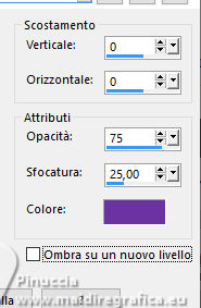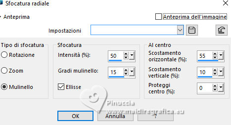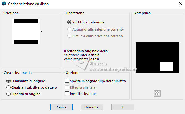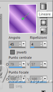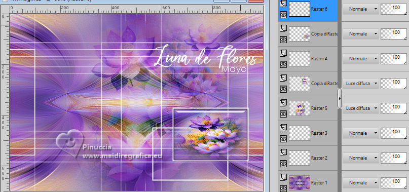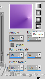 qui puoi trovare qualche risposta ai tuoi dubbi. Se l'argomento che ti interessa non è presente, ti prego di segnalarmelo. Questo tutorial è stato realizzato con PSP2020 e tradotto con PSPX9 e PSP2020, ma può essere eseguito anche con le altre versioni di PSP. Dalla versione X4, il comando Immagine>Rifletti è stato sostituito con Immagine>Capovolgi in orizzontale, e il comando Immagine>Capovolgi con Immagine>Capovolgi in verticale. Nelle versioni X5 e X6, le funzioni sono state migliorate rendendo disponibile il menu Oggetti. Con la nuova versione X7, sono tornati Rifletti>Capovolgi, ma con nuove varianti. Vedi la scheda sull'argomento qui traduzione in francese/traduction en français qui/ici traduzione in inglese/english translation qui/here Versioni/Versions qui![]() Occorrente: ![]() Per i tubes grazie Virginia. Il resto del materiale è di Yedralina. (in questa pagina trovi i links ai siti dei creatori di tubes) Filtri: se hai problemi con i filtri, consulta la mia sezione filtri qui Filters Unlimited 2.0 qui Two Moon - Emboston qui Alien Skin Eye Candy 5 Impact - Glass qui AAA Foto Frame - Foto Frame /AAA Filters - Custom qui I filtri Two Moon si possono usare da soli o importati in Filters Unlimited (come fare vedi qui) Se un filtro fornito appare con questa icona ![]() non esitare a cambiare modalità di miscelatura e opacità secondo i colori utilizzati. Nelle ultime versioni di PSP non c'è il gradiente di primo piano/sfondo (Corel_06_029) Puoi usare i gradienti delle versioni precedenti. Metti il preset Cliccando sul file una o due volte (a seconda delle tue impostazioni), automaticamente il preset si installerà nella cartella corretta. perchè uno o due clic vedi qui Trovi qui i gradienti Corel X. ![]() Metti il preset nella cartella Impostazioni predefinite. Metti la selezione nella cartella Selezioni. Imposta il colore di primo piano con #e7b4f5 e il colore di sfondo con #6c32a2. ![]() colore 3 #ffffff Prepara il colore di primo piano con un Gradiente di primo piano/sfondo, stile Radiale. ![]() Prepara il colore di sfondo con un Gradiente di primo piano/sfondo, stile Lineare. ![]() ![]() 1. Apri una nuova immagine trasparente 1000 x 700 pixels. Riempi l'immagine trasparente con il gradiente radiale.2. Livelli>Nuovo livello raster. Selezione>Seleziona tutto. 3. Apri il tuo misted CV_2203_001 ![]() Cancella il watermark e vai a Modifica>Copia. Minimizza il tube Torna al tuo lavoro e vai a Modifica>Incolla nella selezione. Selezione>Deseleziona. 4. Effetti>Effetti di immagine>Motivo unico. ![]() 5. Regola>Sfocatura>Sfocatura radiale. ![]() 6. Effetti>Effetti di riflesso>Specchio rotante, con i settaggi standard. ![]() 7. Effetti>Effetti di bordo>Aumenta di più. Livelli>Unisci>Unisci giù. 8. Effetti>Plugins>Filters Unlimited 2.0 - Two Moon - Emboston, con i settaggi standard. ![]() Effetti>Effetti di riflesso>Specchio rotante. ![]() 9. Apri il tube Deco00364©Yedralina ![]() Modifica>Copia. Torna al tuo lavoro e vai a Modifica>Incolla come nuovo livello. Non serve spostarlo. Apri il tube Deco00365©Yedralina ![]() Modifica>Copia. Torna al tuo lavoro e vai a Modifica>Incolla come nuovo livello. Non serve spostarlo. 10. Livelli>Nuovo livello raster. Selezione>Carica/Salva selezione>Carica selezione da disco. Cerca e carica la selezione ©Yedralina_Sel0900 ![]() Imposta il colore di primo piano con il colore bianco. ![]() Riempi la selezione con il colore bianco.11. Selezione>Modifica>Contrai - 4 pixels. Premi sulla tastiera il tasto CANC ![]() Selezione>Deseleziona. 12. Livelli>Duplica. Tasto K per attivare lo strumento Puntatore ![]() Posizione X: 643,00 - Posizione Y: 371,00. ![]() 13. Attiva lo strumento Bacchetta magica , sfumatura e tolleranza 0,e clicca nell'ultimo rettangolo per selezionarlo. ![]() 14. Attiva nuovamente il tuo misted e vai a Modifica>Copia. Torna al tuo lavoro e vai a Modifica>Incolla nella selezione. 15. Effetti>Plugins>AAA Filter - Custom (Fracture) ![]() Mantieni selezionato. 16. Effetti>Plugins>Alien Skin Eye Candy 5 Impact - Glass. Seleziona il preset ©Yedralina_Glass4 ![]() Selezione>Deseleziona. 17. Modifica>Incolla come nuovo livello - il tuo misted è sempre in memoria. Immagine>Ridimensiona, se necessario. Nel mio caso non ho ridimensionato, ma l'ho spostato un po' più in basso.18. Cambia la modalità di miscelatura di questo livello in Luce diffusa, o abbassa l'opacità +/-75/80%, secondo i colori del tube. Livelli>Disponi>Sposta giù - 2 volte. 19. Livelli>Duplica. Immagine>Ridimensiona, al 50%, tutti i livelli non selezionato. Spostalo in alto a destra:Posizione X: 590,00 - Posizione Y: -13,00 ![]() Immagine>Capovolgi>Capovolgi orizzontale. Questo comando riflette l'immagine, ma la mantiene nella stessa posizione. Se non hai questo comando nel tuo PSP: Immagine>Rifletti e posiziona come prima ![]() Modalità di miscelatura o opacità come nel punto precedente 20. Apri il testo Text-LUNA DE FLORES_MAYO_Yedra ![]() Modifica>Copia. Torna al tuo lavoro e vai a Modifica>Incolla come nuovo livello. Se vuoi scrivere il testo nella tua lingua utilizzando e adattando il testo Luna de Flores Font: Rabelan, dimensioni 95 pixels, colore bianco. ![]() MAYO Font Gothic (attenzione, in PSP può apparire come Century Gothic), dimensioni 40 pixels, colore bianco. ![]() Sposta il tube come nel mio esempio,o Posizione X: 568,00 - Posizione Y: 120,00. ![]() 21. Dovresti avere questo: ![]() 22. Attiva il livello di sfondo. Modifica>Copia **Per sicurezza, puoi incollare questo livello come una nuova immagine e metterlo da parte. 23. Imposta nuovamente il colore di primo piano con il colore iniziale, per riavere il gradiente Lineare di sfondo che hai preparato prima di iniziare. ![]() Immagine>Aggiungi bordatura, 1 pixel, simmetriche, colore di sfondo. Immagine>Aggiungi bordatura, 1 pixel, simmetriche, colore di primo piano. Selezione>Seleziona tutto. 24. Immagine>Aggiungi bordatura, 50 pixels, simmetriche, con un colore qualunque. Selezione>Inverti. Riempi