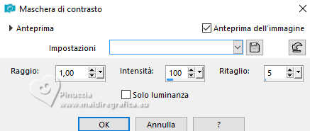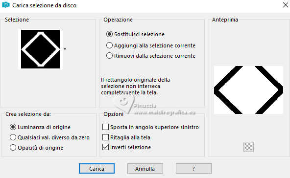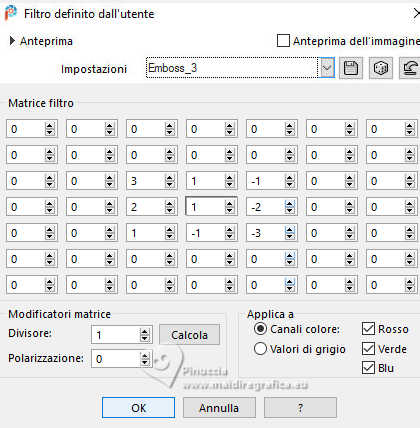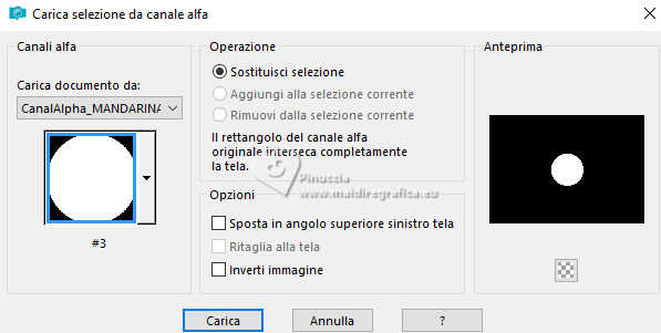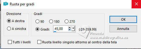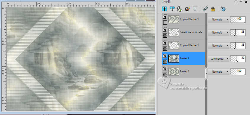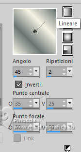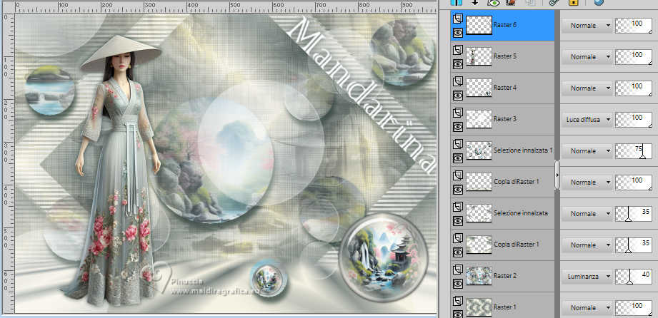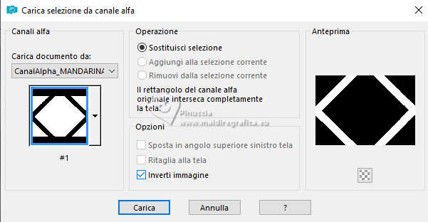 qui puoi trovare qualche risposta ai tuoi dubbi. Se l'argomento che ti interessa non è presente, ti prego di segnalarmelo. Questo tutorial è stato realizzato con PSP2020 e tradotto con PSPX9 e PSP2020, ma può essere eseguito anche con le altre versioni di PSP. Dalla versione X4, il comando Immagine>Rifletti è stato sostituito con Immagine>Capovolgi in orizzontale, e il comando Immagine>Capovolgi con Immagine>Capovolgi in verticale. Nelle versioni X5 e X6, le funzioni sono state migliorate rendendo disponibile il menu Oggetti. Con la nuova versione X7, sono tornati Rifletti>Capovolgi, ma con nuove varianti. Vedi la scheda sull'argomento qui traduzione in francese/traduction en français qui/ici traduzione in inglese/english translation qui/here Versioni/Versions qui![]() Occorrente: ![]() Per il misted grazie Virginia. Il resto del materiale è di Yedralina (in questa pagina trovi i links ai siti dei creatori di tubes) Filtri: se hai problemi con i filtri, consulta la mia sezione filtri qui Filters Unlimited 2.0 qui Visual Manipulation - Transmission qui Unplugged Shapes - Rotocube qui Alien Skin Eye Candy 5 Impact - Glass qui Simple - Top Left Mirror qui Mura's Meister - Perspective Tiling qui Sybia - ZIGZAGGE qui AAA Frames - Foto Frame qui I filtri Visual Manipulation, Unplugged Shapes, Simple e Sybia si possono usare da soli o importati in Filters Unlimited (come fare vedi qui) Se un filtro fornito appare con questa icona ![]() non esitare a cambiare modalità di miscelatura e opacità secondo i colori utilizzati. Nelle ultime versioni di PSP non c'è il gradiente di primo piano/sfondo (Corel_06_029) Puoi usare i gradienti delle versioni precedenti. Trovi qui i gradienti Corel X. Metti il preset Cliccando sul file una o due volte (a seconda delle tue impostazioni), automaticamente il preset si installerà nella cartella corretta. perchè uno o due clic vedi qui ![]() Metti il preset Emboss 7 nella cartella Impostazioni predefinite. Se hai problemi con il canale alfa, apri una nuova immagine trasparente 1000x700 pixels e usa le selezioni da disco (da mettere nella cartella Selezioni) Imposta il colore di primo piano con #697573, e il colore di sfondo con #f6f3e4 ![]() colore 3 extra (per l'ombra) #30433c. Passa il colore di sfondo a Gradiente di primo piano/sfondo, stile Rettangolare. ![]() Passa il colore di sfondo a Gradiente di primo piano/sfondo, stile Lineare. ![]() 1. Apri CanalAlpha_MANDARINA. Questa immagine non è vuota, ma contiene le selezioni salvate sul canale alfa. Riempi con il gradiente rettangolare di primo piano.2. Effetti>Effetti di immagine>Motivo unico. ![]() 3. Immagine>Rifletti>Rifletti verticalmente (Immagine>Capovolgi). 4. Livelli>Duplica. Chiudi questo livello e attiva il livello inferiore, Raster 1. 5. Effetti>Plugins>Sybia - ZIGZAGGE, con i settaggi standard. ![]() 6. Effetti>Effetti di bordo>Aumenta. 7. Effetti>Effetti di riflesso>Specchio rotante. ![]() 8. Livelli>Duplica. 9. Effetti>Plugins>Filters Unlimited 2.0 - Unplugged Shapes - Rotocube, con i settaggi standard. ![]() 10. Attiva lo strumento Bacchetta magica , tolleranza e sfumatura 0,e clicca nel rombo bianco per selezionarlo. Premi sulla tastiera il tasto CANC ![]() Selezione>Deseleziona. 11. Effetti>Plugins>Filters Unlimited 2.0 - Visual Manipulation - Transmission, con i settaggi standard ![]() 12. Selezione>Carica/Salva selezione>Carica selezione da canale alfa. La selezione #1 è subito disponibile. Devi soltanto cliccare Carica. Assicurati che sia selezionato Inverti immagine. ![]() Oppure carica la selezione da disco Sel0919 ![]() ![]() Selezione>Innalza selezione a livello. Selezione>Deseleziona. 13. Effetti>Effetti 3D>Sfalsa ombra, colore 3 #30433c. ![]() Abbassa l'opacità di questo livello +/-35%. Attiva il livello sottostante e abbassa anche qui l'opacità +/-35%. 14. Livelli>Nuovo livello raster. Selezione>Seleziona tutto. 15. Apri il misted CV_Asia_044 ![]() Cancella il watermark e vai a Modifica>Copia. Minimizza il tube, perchè ti servirà ancora. Torna al tuo lavoro e vai a Modifica>Incolla nella selezione. Selezione>Deseleziona. 16. Effetti>Effetti di immagine>Motivo Unico - Fianco a Fianco ![]() Effetti>Effetti di immagine>Motivo unico . ![]() 17. Modifica>Copia. Modifica>Incolla come nuova immagine, e minimizza questa immagine che ti servirà per i bordi. 18. Torna al tuo lavoro. Sullo stesso livello, abbassa l'opacità +/-40%, secondo i tuoi colori. Livelli>Disponi>Sposta giù Cambia la modalità di miscelatura in Luminanza. ![]() Rimani sempre su questo livello. 19. Selezione>Carica/Salva selezione>Carica selezione da canale alfa. Apri il menu delle selezioni e carica la selezione #2 o ©Yedralina_Sel0918. Ricorda di deselezionare Inverti. ![]() Selezione>Innalza selezione a livello. Livelli>Disponi>Porta in alto. 20. Effetti>Effetti 3D>Sfalsa ombra, colore 3 #30433c. ![]() Selezione>Deseleziona. Abbassa l'opacità di questo livello +/-75%. ![]() 21. Apri il tube Deco00366©Yedralina ![]() Modifica>Copia. Torna al tuo lavoro e vai a Modifica>Incolla come nuovo livello. Non è necessario spostarlo. Cambia la modalità di miscelatura di questo livello in Luce diffusa. 22. Effetti>Filtro definito dall'utente, seleziona il preset Emboss 7 ![]() 23. Riapri e attiva il livello Copia di Raster 1. 24. Effetti>Plugins>Mura's Meister - Perspective Tiling. ![]() 25. Attiva lo strumento Bacchetta magica , tolleranza 0 e sfumatura 40,e clicca nella parte trasparente per selezionarla. Premi +/-5 volte sulla tastiera il tasto CANC ![]() Selezione>Deseleziona. non dimenticare di riportare la sfumatura a 0 27. Dovresti avere questo ![]() Livelli>Nuovo livello raster. Livelli>Disponi>Porta in alto. Riempi il livello con il gradiente lineare di sfondo.28. Effetti>Effetti geometrici>Cerchio. ![]() Immagine>Ridimensiona, al 30%, tutti i livelli non selezionato. 29. Selezione>Carica/Salva selezione>Carica selezione da canale alfa. Apri il menu delle selezioni e carica la selezione #3 o ©Yedrali