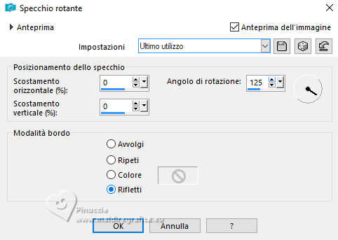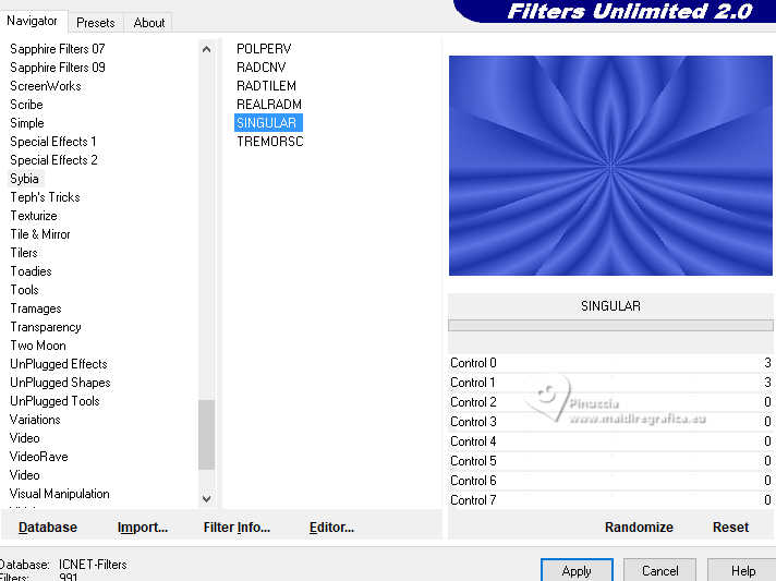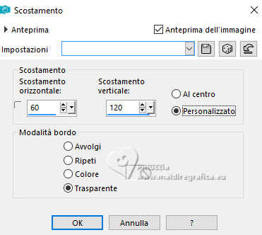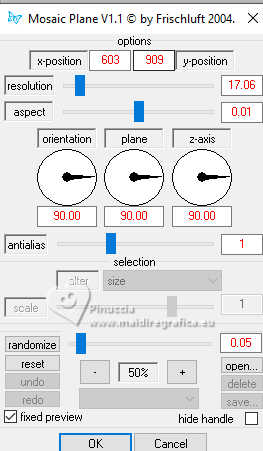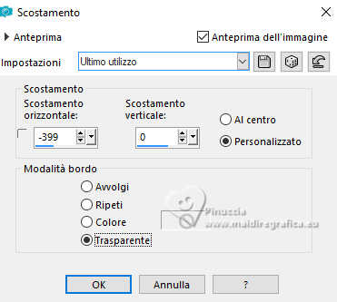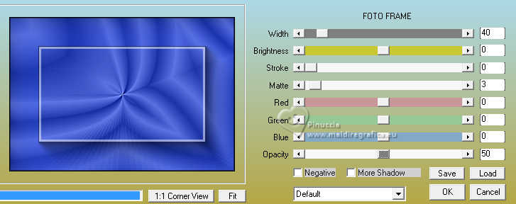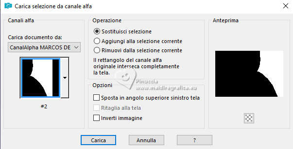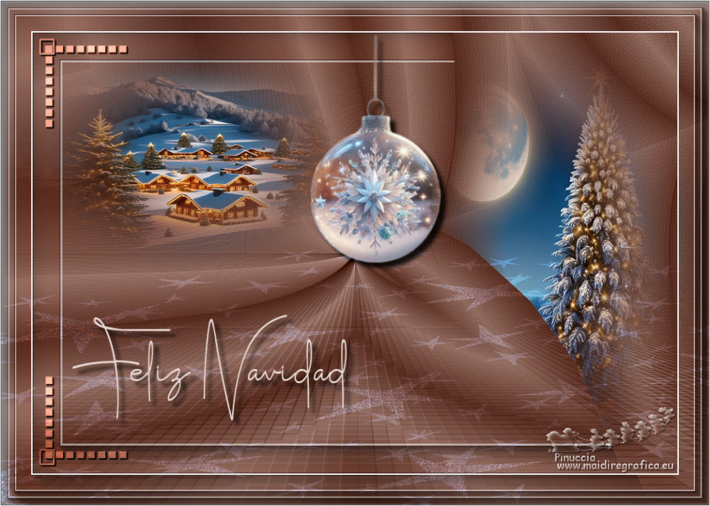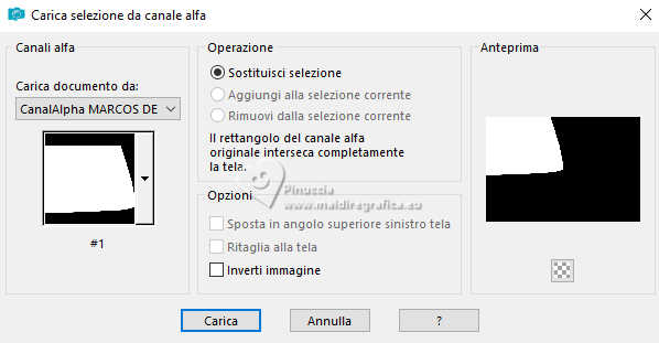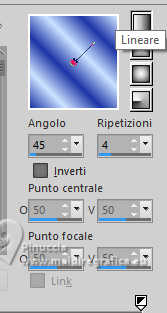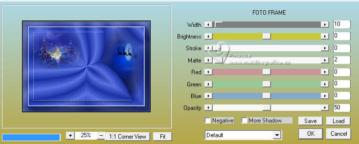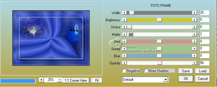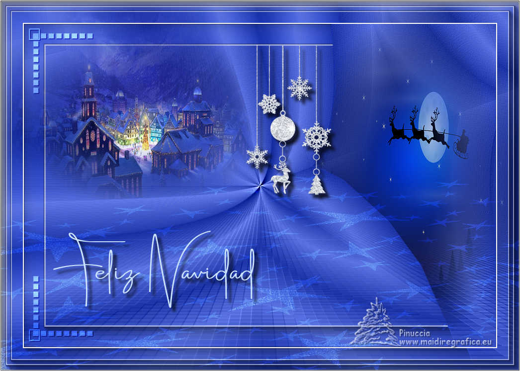 qui puoi trovare qualche risposta ai tuoi dubbi. Se l'argomento che ti interessa non è presente, ti prego di segnalarmelo. Questo tutorial è stato realizzato con PSP2020 e tradotto con PSPX9 e PSP2020, ma può essere eseguito anche con le altre versioni di PSP. Dalla versione X4, il comando Immagine>Rifletti è stato sostituito con Immagine>Capovolgi in orizzontale, e il comando Immagine>Capovolgi con Immagine>Capovolgi in verticale. Nelle versioni X5 e X6, le funzioni sono state migliorate rendendo disponibile il menu Oggetti. Con la nuova versione X7, sono tornati Rifletti>Capovolgi, ma con nuove varianti. Vedi la scheda sull'argomento qui traduzione in francese/traduction en français qui/ici traduzione in inglese/english translation qui/here Versioni/Versions qui![]() Occorrente: ![]() Grazie per i tubes Mery, Vera Mendes e Linda. (in questa pagina trovi i links ai siti dei creatori di tubes) Filtri: se hai problemi con i filtri, consulta la mia sezione filtri qui Filters Unlimited 2.0 qui Sybia - Singular qui Frischluft - Mosaic Plane qui AAA Frames - Foto Frame qui I filtri Sybia si possono usare da soli o importati in Filters Unlimited (come fare vedi qui) Se un filtro fornito appare con questa icona ![]() ![]() non esitare a cambiare modalità di miscelatura e opacità secondo i colori utilizzati. Nelle ultime versioni di PSP non c'è il gradiente di primo piano/sfondo (Corel_06_029) Puoi usare i gradienti delle versioni precedenti. Trovi qui i gradienti Corel X. ![]() Metti il preset Emboss 5 nella cartella Impostazioni predefinite. Colori ![]() Imposta il colore di primo piano con #1d35a7, e il colore di sfondo con #5b73e3. ![]() Prepara il colore di primo piano con un gradiente di primo piano/sfondo, stile Lineare. ![]() 1. Apri CanalAlpha MARCOS DE NAVIDAD Finestra>Duplica o sulla tastiera maiuscola+D per fare una copia. ![]() Chiudi l'originale. La copia, che sarà la base del tuo lavoro, non è vuota, ma contiene le selezioni salvate sul canale alfa. Riempi l'immagine trasparente con il gradiente lineare.2. Effetti>Plugins>Filters Unlimited 2.0 - Sybia - Singular, con i settaggi standard. ![]() 3. Effetti>Effetti di riflesso>Specchio rotante. ![]() Regola>Messa a fuoco>Metti a fuoco. 4. Effetti>Plugins>Frischluft - Mosaic Plane. ![]() *** Potrebbe essere necessario attendere alcuni secondi perché questo effetto termini l'esecuzione. Se riscontri problemi con questo filtro, puoi utilizzare il livello allegato al materiale: Capa Frischluft. Copia/Incolla come nuovo livello, cambia la modalità di miscelatura in Luminanza (esistente), e poi Livelli>Unisci>Unisci giù 5. Effetti>Filtro definito dall'utente - seleziona il preset Emboss 5 e ok. ![]() 6. Livelli>Nuovo livello raster. Selezione>Carica/Salva selezione>Carica selezione da canale alfa. La selezione #1 è subito disponibile. Devi soltanto cliccare Carica. ![]() 7. Apri il misted merydesign_mist Noël_12 ![]() Modifica>Copia. Torna al tuo lavoro e vai a Modifica>Incolla nella selezione. Regola>Messa a fuoco>Metti a fuoco. 8. Attiva il livello di sfondo. Selezione>Carica/Salva selezione>Carica selezione da canale alfa. Apri il menu delle selezioni e carica la selezione #2. ![]() Selezione>Innalza selezione a livello. 8. Apri il tube 180-vmtubes ![]() Modifica>Copia. Torna al tuo lavoro e vai a Modifica>Incolla nella selezione. Regola>Messa a fuoco>Metti a fuoco. Selezione>Deseleziona. 10. Attiva nuovamente il livello di sfondo, Raster 1. Effetti>Plugins>AAA Frames - Foto Frame. ![]() 11. Immagine>Aggiungi bordatura, 2 pixels, simmetriche, colore bianco. Modifica>Copia. Modifica>Incolla come nuova immagine, e minimizza questa immagine. 12. Torna al tuo lavoro. Selezione>Seleziona tutto. Immagine>Aggiungi bordatura, 45 pixels, simmetriche, con un colore quasiasi. Selezione>Inverti. Modifica>Incolla nella selezione - l'immagine che hai minimizzato è ancora in memoria. Mantieni selezionato. 13. Effetti>Plugins>AAA Frames - Foto Frame. ![]() Ripeti Effetti>Plugins>AAA Frames - Foto Frame, width 10. ![]() Selezione>Deseleziona. 14. Apri il tube pngfind.com-estrellas-blancas-png-5372889 ![]() Modifica>Copia. Torna al tuo lavoro e vai a Modifica>Incolla come nuovo livello. Immagine>Rifletti>Rifletti orizzontalmente. Oggetti>Allinea>Inferiore, tasto K per attivare lo strumento Puntatore ![]() Posizione X: -323,00 - Posizione Y: 185,00. ![]() Per il mio esempio, ho abbassato un po' di più il tube. ![]() Cambia la modalità di miscelatura di questo livello in Sovrapponi. 15. Apri il tube LF-ChristmasDeco-4 ![]() Cancella la firma e vai a Modifica>Copia. Torna al tuo lavoro e vai a Modifica>Incolla come nuovo livello. Immagine>Capovolgi>Capovolgi in orizzontale. Posiziona il tube in modo tale che il centro dello strato inferiore sia coperto.Effetti>Effetti di immagine>Scostamento. ![]() 16. Effetti>Effetti 3D>Sfalsa ombra, colore nero. ![]() 17. Chiudi il colore di primo piano, e imposta il colore di sfondo con il colore 3 #cce3ff. ![]() 18. Attiva lo strumento Testo ![]() font Dalton White ![]() Scrivi Feliz Navidad, o quello che preferisci nella tua lingua. Livelli>Converti in livello raster. Effetti>Effetti 3D>Sfalsa ombra, con i settaggi precedenti. Strumento Puntatore ![]() Posizione X: 105,00 - Posizione Y: 463,00 ![]() 19. Apri il tube Deco00351©Yedralina ![]() Modifica>Copia. Torna al tuo lavoro e vai a Modifica>Incolla come nuovo livello. Effetti>Effetti di immagine>Scostamento. ![]() Cambia la modalità di miscelatura di questo livello in Sovrapponi. 20. Effetti>Effetti 3D>Sfalsa ombra, colore nero. ![]() 21. Immagine>Aggiungi bordatura, 1 pixel, simmetriche, colore bianco. Facoltativo: Immagine>Ridimensiona, 1000 pixels di larghezza, tutti i livelli selezionato. Nel tutorial originale è rimasto 1046 x 746 pixels. 22. Firma il tuo lavoro su un nuovo livello. Livelli>Unisci>Unisci tutto e salva in formato jpg. Per i tubes di questo esempio grazie Yedralina ![]() ![]() Puoi scrivermi se hai problemi o dubbi, o trovi u