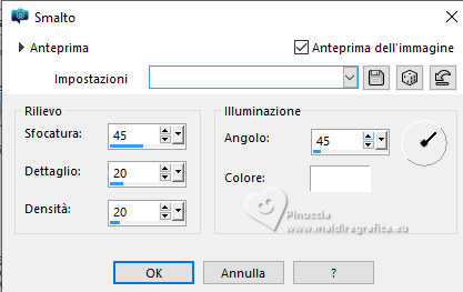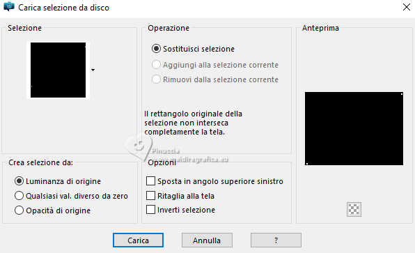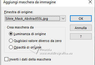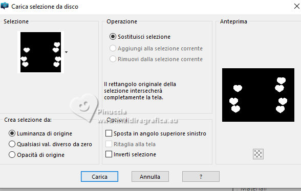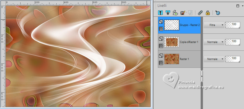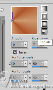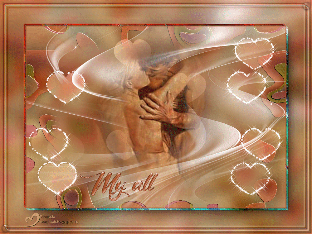 qui puoi trovare qualche risposta ai tuoi dubbi. Se l'argomento che ti interessa non è presente, ti prego di segnalarmelo. Questo tutorial è stato realizzato con PSP2020 e tradotto con PSPX9 e PSP2020, ma può essere eseguito anche con le altre versioni di PSP. Dalla versione X4, il comando Immagine>Rifletti è stato sostituito con Immagine>Capovolgi in orizzontale, e il comando Immagine>Capovolgi con Immagine>Capovolgi in verticale. Nelle versioni X5 e X6, le funzioni sono state migliorate rendendo disponibile il menu Oggetti. Con la nuova versione X7, sono tornati Rifletti>Capovolgi, ma con nuove varianti. Vedi la scheda sull'argomento qui traduzione in francese/traduction en français qui/ici traduzione in inglese/english translation qui/here Versioni/Versions qui![]() Occorrente: ![]() Grazie per la maschera Silvie Il resto del materiale è di Yedralina (in questa pagina trovi i links ai siti dei creatori di tubes) ![]() Filtri: se hai problemi con i filtri, consulta la mia sezione filtri qui Filters Unlimited 2.0 qui Filter Factory Gallery S - Itsa Edge Thing qui Lokas Software - Aqua qui se hai problemi con il filtro Lokas Artistic, vedi le mie note qui Alien Skin Eye Candy 5 Impact - Glass qui AAA Frames - Foto Frame qui Alien Skin Xenofex 2 - Constellation qui I filtri Factory Gallery si possono usare da soli o importati in Filters Unlimited (come fare vedi qui) Se un filtro fornito appare con questa icona Animation Shop qui ![]() non esitare a cambiare modalità di miscelatura e opacità secondo i colori utilizzati. Nelle ultime versioni di PSP non c'è il gradiente di primo piano/sfondo (Corel_06_029) Puoi usare i gradienti delle versioni precedenti. Trovi qui i gradienti Corel X. Metti il preset Cliccando sul file una o due volte (a seconda delle tue impostazioni), automaticamente il preset si installerà nella cartella corretta. perchè uno o due clic vedi qui ![]() Metti le selezioni nella cartella Selezioni. Apri la maschera in PSP e minimizzala con il resto del materiale. Imposta il colore di primo piano con #b0522a, e il colore di sfondo con #cc9c6f. ![]() colore 3: #ffffff. Passa il colore di primo piano a Gradiente di primo piano/sfondo, stile Radiale. ![]() 1. Apri una nuova immagine trasparente 1000 x 700 pixels. Riempi l'immagine trasparente con il gradiente.2. Effetti>Effetti di riflesso>Specchio rotante. ![]() Regola>Sfocatura>Sfocatura gaussiana - raggio 20. ![]() 3. Selezione>Seleziona tutto. Apri il misted 1932©Yedralina ![]() Cancella il watermark e vai a Modifica>Copia. Minimizza il tube. Torna al tuo lavoro e vai a Modifica>Incolla nella selezione. Selezione>Deseleziona. 3. Effetti>Effetti di immagine>Motivo unico, con i settaggi standard. ![]() Effetti>Effetti di immagine>Motivo unico, Fianco a fianco ![]() 5. Regola>Sfocatura>Sfocatura gaussiana - raggio 20. ![]() 6. Effetti>Effetti artistici>Smalto ![]() 7. Livelli>Duplica. Immagine>Ridimensiona, all'80%, tutti i livelli non selezionato. Regola>Sfocatura>Sfocatura gaussiana - raggio 20. ![]() 8. Imposta il colore di primo piano con il colore bianco. Livelli>Nuovo livello raster. Riempi il livello con il colore bianco.Livelli>Nuovo livello maschera>Da immagine. Apri il menu sotto la finestra di origine e vedrai la lista dei files aperti. Seleziona la maschera Silvie_Mask_Abstract55L ![]() Livelli>Unisci>Unisci gruppo. 9. Cambia la modalità di miscelatura di questo livello in Filtra. ![]() 10. Apri il tube DecoCorazones_yedra ![]() Modifica>Copia. Torna al tuo lavoro e vai a Modifica>Incolla come nuovo livello. Non è necessario spostarlo. Mantieni il livello in modalità Luminanza (esistente) e abbassa l'opacità +/-65%. 11. Attiva nuovamente il misted e vai a Modifica>Copia. Torna al tuo lavoro e vai a Modifica>Incolla come nuovo livello. Immagine>Ridimensiona, se necessario, per il tube fornito non è stato necessario; per il secondo tube ho ridimensionato al 65%. 12. Modifica>Copia Speciale>Copia Unione. Modifica>Incolla come nuova immagine e minimizza questa immagine. 13. Torna al tuo lavoro. Abbiamo questo ![]() 14. Per i bordi imposta nuovamente il colore di primo piano con #b0522a. Immagine>Aggiungi bordatura, 2 pixels, simmetriche, colore scuro di primo piano. Selezione>Seleziona tutto. 15. Immagine>Aggiungi bordatura, 100 pixels, simmetriche, con un colore qualsiasi. Selezione>Inverti. Modifica>Incolla nella selezione - l'immagine minimizzata al punto 12 è ancora in memoria. Regola>Sfocatura>Sfocatura gaussiana - raggio 20. ![]() 16. Effetti>Plugins>AAA Frames - Foto Frame ![]() Selezione>Inverti 17. Effetti>Effetti 3D>Sfalsa ombra, colore nero. ![]() Selezione>Inverti. 18. Effetti>Plugins>Filters Unlimited 2.0 - Filter Factory Gallery S - itsa Edge thing, con i settaggi standard. ![]() 19. Effetti>Effetti di bordo>Aumenta. Selezione>Deseleziona. 20. Livelli>Nuovo livello raster. Selezione>Carica/Salva selezione>Carica selezione da disco. Cerca e carica la selezione ©Yedralina_Sel09387). ![]() se ti sembra di non vedere nulla è perchè le selezioni sono tanto piccole; guarda in alto a destra e in basso a sinistra Riempi la selezione con il colore scuro di primo piano.21. Effetti>Plugins>Alien Skin Eye Candy 5 Impact - Glass seleziona il preset ©Yedralina_Glass10 ![]() Selezione>Deseleziona. 22. Apri il testo Text My All_yedra ![]() Modifica>Copia. Torna al tuo lavoro e vai a Modifica>Incolla come nuovo livello. 23. Effetti>Plugins>Lokas Software - Aqua - color #b0522a. ![]() se hai problemi con il filtro Lokas Artistic, vedi le mie note qui 24. Tasto K per attivare lo strumento Puntatore ![]() Posizione X: 307,00 - Posizione Y: 662,00. ![]() Tasto M per deselezionare lo strumento. 25. Effetti>Effetti 3D>Sfalsa ombra, con i settaggi precedenti, ma colore bianco. ![]() 26. Immagine>Ridimensiona, 1000 pixels di larghezza, tutti i livelli selezionato. 27. Firma il tuo lavoro su un nuovo livello. Livelli>Unisci>Unisci tutto e salva in formato jpg. ![]() 28. Se vuoi realizzare l'animazione. Livel