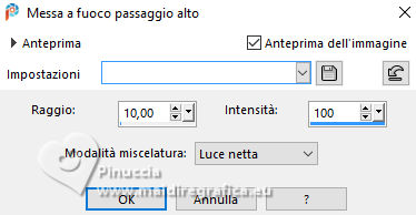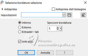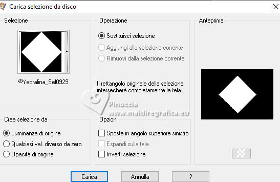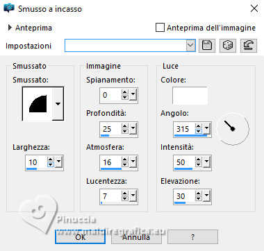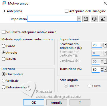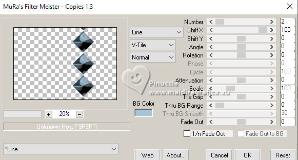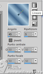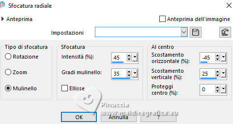 qui puoi trovare qualche risposta ai tuoi dubbi. Se l'argomento che ti interessa non è presente, ti prego di segnalarmelo. Questo tutorial è stato realizzato con PSP2020 e tradotto con PSPX9 e PSP2020, ma può essere eseguito anche con le altre versioni di PSP. Dalla versione X4, il comando Immagine>Rifletti è stato sostituito con Immagine>Capovolgi in orizzontale, e il comando Immagine>Capovolgi con Immagine>Capovolgi in verticale. Nelle versioni X5 e X6, le funzioni sono state migliorate rendendo disponibile il menu Oggetti. Con la nuova versione X7, sono tornati Rifletti>Capovolgi, ma con nuove varianti. Vedi la scheda sull'argomento qui traduzione in francese/traduction en français qui/ici traduzione in inglese/english translation qui/here Versioni/Versions qui![]() Occorrente: ![]() Per i tubes grazie Vera Mendes Il resto del materiale è di Yedralina (in questa pagina trovi i links ai siti dei creatori di tubes) ![]() Filtri: se hai problemi con i filtri, consulta la mia sezione filtri qui Filters Unlimited 2.0 qui Mehdi - Wavy Lab 1.1. qui Mura's Meister - Copies qui Nik Software - Color Efex Pro qui AAA Filters - Custom / AAA Frames - Foto Frame qui RCS Filter Pak 1.0 - RCS Un-Earthly Vortex, RCS TripleExposure qui VanDerLee - Unplugged-X qui Toadies - What are you qui Filter Meister - FM Sample ConvoLine qui I filtri RCS e Toadies si possono usare da soli o importati in Filters Unlimited (come fare vedi qui) Se un filtro fornito appare con questa icona ![]() non esitare a cambiare modalità di miscelatura e opacità secondo i colori utilizzati. Nelle ultime versioni di PSP non c'è il gradiente di primo piano/sfondo (Corel_06_029) Puoi usare i gradienti delle versioni precedenti. Trovi qui i gradienti Corel X. ![]() Se hai problemi con il canale alfa, apri una nuova immagine trasparente 1000 x 700 pixels, e usa le selezioni da disco. Colori ![]() Per il filtro Mehdi: Imposta il colore di primo piano con il colore 2 #a6c5d9, e il colore di sfondo con il colore 1 #41678b ![]() colore 3 #0b3a6b colore 4 #9d7456. 1. Apri Canal Alpha Questa immagine, che sarà la base del tuo lavoro, non è vuota, ma contiene le selezioni salvate sul canale alfa. 2. Effetti>Plugins>Mehdi - Wavy Lab 1.1. Questo filtro crea gradienti con i colori della paletta: il primo è il colore di sfondo, il secondo quello di primo piano. Cambia gli ultimi due colori creati dal filtro: il terzo con il colore 3 #0b3a6b, il quarto con il colore 4 #9d7456. ![]() 3. Regola>Sfocatura>Sfocatura radiale. ![]() 4. Effetti>Effetti di riflesso>Specchio rotante. ![]() 5. Effetti>Plugins>Filters Unlimited 2.0 - Toadies - What are you, con i settaggi standard. ![]() 6. Effetti>Plugins>Filters Unlimited 2.0 - RCS Filter Pak 1.0 - RCS TripleExposure, con i settaggi standard. ![]() 7. Regola>Messa a fuoco>Messa a fuoco passaggio alto. ![]() 8. Effetti>Effetti di bordo>Aumenta di più. 9. Effetti>Effetti di immagine>Motivo unico. ![]() 10. Effetti>Effetti di riflesso>Specchio rotante. ![]() 11. Effetti>Effetti di riflesso>Specchio rotante. ![]() 12. Effetti>Plugins>Filter Meister - FM Sample ConvoLine ![]() 13. Effetti>Plugins>VanDerLee - Unplugged-X - Deinterlace. ![]() 14. Selezione>Carica/Salva selezione>Carica selezione da disco. La selezione #1 è subito disponibile. Devi soltanto cliccare Carica. ![]() (o Selezione da disco Sel 0929) ![]() 15. Selezione>Innalza selezione a livello. 16. Effetti>Plugins>Filters Unlimited 2.0 - RCS Filter Pak 1 - RCS Un-Earthly Vortex ![]() Ripeti l'Effetto una seconda volta. ![]() ho notato che questo effetto dà risultati differenti, forse a causa della versione di PSP, o dei colori della paletta o altro. Puoi verificare controllando quelli delle altre traduzioni 17. Selezione>Modifica>Contrai - 20 pixels. ![]() 18. Selezione>Modifica>Seleziona bordature selezione. ![]() 19. Effetti>Effetti 3D>Smusso a incasso. ![]() 20. Effetti>Effetti 3D>Sfalsa ombra, colore 3 #0b3a6b. ![]() Selezione>Deseleziona. 21. Immagine>Ridimensiona, al 40%, tutti i livelli non selezionato. 22. Tasto K per attivare lo strumento Puntatore ![]() Posizione X: 572,00 - Posizione Y: 31,00. ![]() 23. Effetti>Plugins>Mura's Meister - Copies. ![]() 24. Effetti>Effetti 3D>Sfalsa ombra, colore 3 #0b3a6b. ![]() Cambia la modalità di questo livello in Luminanza (esistente), o come preferisci. 25. Adesso per cancellare i piccoli segni in alto e in basso: Selezione>Carica/Salva selezione>Carica selezione da canale alfa. Apri il menu delle selezioni e carica la selezione #2 (da disco ©Yedralina Sel 0931). ![]() ![]() Premi sulla tastiera il tasto CANC ![]() Selezione>Deseleziona. 26. Apri il misted 1903-vmtubes ![]() Cancella il watermark e vai a Modifica>Copia. Torna al tuo lavoro e vai a Modifica>Incolla come nuovo livello. Immagine>Ridimensiona, se necessario - per il tube fornito non lo è. Posiziona correttamente il tube, vedi l'esempio finale.Abbassa l'opacità di questo livello +/-65%. Livelli>Disponi>Sposta giù. 27. Imposta il colore di primo piano con il colore 1 #41678b, e il colore di sfondo con il colore 2 #a6c5d9 ![]() Passa il colore di primo piano a Gradiente di primo piano/sfondo, stile Lineare. ![]() Immagine>Aggiungi bordatura, 2 pixels, simmetriche, colore 3 #0b3a6b. Selezione>Seleziona tutto. 28. Immagine>Aggiungi bordatura, 100 pixels, simmetriche, colore 3 #0b3a6b. Selezione>Inverti. Riempi la selezione con il gradiente.29. Effetti>Effetti 3D>Sfalsa ombra, con i settaggi precedenti. ![]() 30. Selezione>Seleziona tutto. Selezione>Modifica>Contrai - 20 pixels. Ripeti Effetti>Effetti 3D>Sfalsa ombra, con i settaggi precedenti. Di nuovo Selezione>Modifica>Contrai - 35 pixels. Effetti>Effetti 3D>Sfalsa ombra, con i settaggi precedenti. Ancora: Selezione>Modifica>Contrai - 35 pixels. Effetti>Effetti 3D>Sfalsa ombra, con i settaggi precedenti. Selezione>Deseleziona. 31. Effetti>Plugins>AAA Frames - Foto Frame. ![]() 32. Apri il testo Deco00375©Yedralina ![]() Modifica>Copia. Torna al tuo lavoro e vai a Modifi