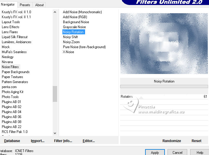 Effects>Plugins>Filters Unlimited 2.0 - Noise filters - Noisy rotation, default settings.