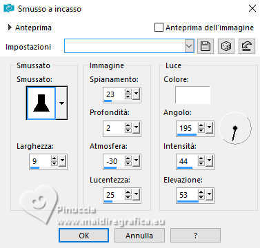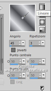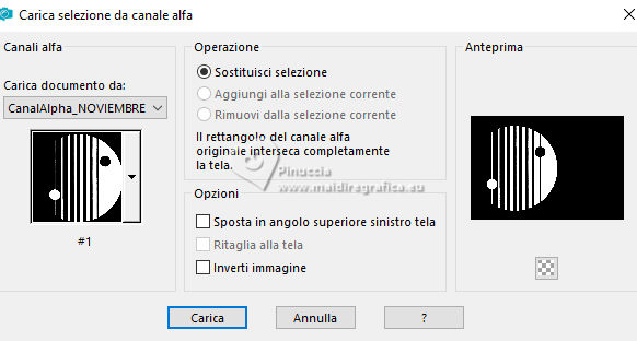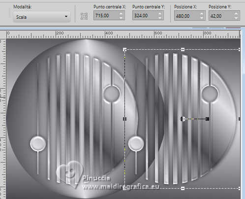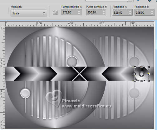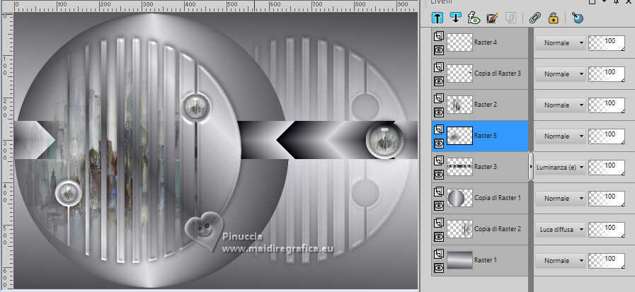 qui puoi trovare qualche risposta ai tuoi dubbi. Se l'argomento che ti interessa non è presente, ti prego di segnalarmelo. Questo tutorial è stato realizzato con PSP2020 e tradotto con PSPX9 e PSP2020, ma può essere eseguito anche con le altre versioni di PSP. Dalla versione X4, il comando Immagine>Rifletti è stato sostituito con Immagine>Capovolgi in orizzontale, e il comando Immagine>Capovolgi con Immagine>Capovolgi in verticale. Nelle versioni X5 e X6, le funzioni sono state migliorate rendendo disponibile il menu Oggetti. Con la nuova versione X7, sono tornati Rifletti>Capovolgi, ma con nuove varianti. Vedi la scheda sull'argomento qui traduzione in francese/traduction en français qui/ici traduzione in inglese/english translation qui/here Versioni/Versions qui![]() Occorrente: ![]() Per i tubes grazie Kamil, Lana e Yvonne. Il resto del materiale è di Yedralina (in questa pagina trovi i links ai siti dei creatori di tubes) Filtri: se hai problemi con i filtri, consulta la mia sezione filtri qui Filters Unlimited 2.0 qui Alien Skin Eye Candy 5 Impact - Glass qui Simple - Top Left Mirror qui Toadies - Metallic Onion, Sucking Toad Bevel III qui I filtri Simple e Toadies si possono usare da soli o importati in Filters Unlimited (come fare vedi qui) Se un filtro fornito appare con questa icona ![]() non esitare a cambiare modalità di miscelatura e opacità secondo i colori utilizzati. Nelle ultime versioni di PSP non c'è il gradiente di primo piano/sfondo (Corel_06_029) Puoi usare i gradienti delle versioni precedenti. Trovi qui i gradienti Corel X. Metti il preset Cliccando sul file una o due volte (a seconda delle tue impostazioni), automaticamente il preset si installerà nella cartella corretta. perchè uno o due clic vedi qui ![]() Se hai problemi con il canale alfa, apri una nuova immagine trasparente 950 x 650 pixels e usa le selezioni da disco. Imposta il colore di primo piano con #4b4b51, e il colore di sfondo con #e0e1e5. ![]() Prepara il colore di primo piano con un gradiente di primo piano/sfondo, stile Lineare. ![]() Prepara il colore di sfondo con un gradiente di primo piano/sfondo, stile Lineare. ![]() 1. Apri CanalAlpha_NOVIEMBRE Finestra>Duplica o sulla tastiera maiuscola+D per fare una copia. ![]() Chiudi l'originale. La copia, che sarà la base del tuo lavoro, non è vuota, ma contiene le selezioni salvate sul canale alfa. Riempi l'immagine trasparente con il gradiente di sfondo.2. Livelli>Duplica. Effetti>Effetti geometrici>Cerchio. ![]() 3. Immagine>Ruota per gradi - 90 gradi a destra ![]() Oggetti>Allinea>Sinistra. 4. Livelli>Nuovo livello raster. Selezione>Carica/Salva selezione>Carica selezione da canale alfa. La selezione #1 è subito disponibile. Devi soltanto cliccare Carica (selezione da disco ©Yedralina_Sel0111). ![]() Riempi la selezione con il gradiente di primo piano.5. Effetti>Effetti 3D>Smusso a incasso. ![]() 6. Effetti>Effetti 3D>Sfalsa ombra, colore nero. ![]() Selezione>Deseleziona. 7. Livelli>Duplica. Oggetti>Allinea>Destra o tasto K per attivare lo strumento Puntatore ![]() Posizione X: 480,00 - Posizione Y: 42,00. ![]() 8. Effetti>Effetti di riflesso>Specchio rotante. ![]() Cambia la modalità di miscelatura di questo livello in Luce diffusa. 9. Livelli>Disponi>Sposta giù - 2 volte (sopra il livello di sfondo) 10. Livelli>Nuovo livello raster. Selezione>Carica/Salva selezione>Carica selezione da canale alfa. Apri il menu delle selezioni e carica la selezione #2 (da disco ©Yedralina_Sel0112) ![]() 11. Livelli>Disponi>Porta in alto, per vedere meglio. Riempi la selezione con il gradiente di primo piano.Mantieni selezionato. Effetti>Plugins>Filters Unlimited 2.0 - Simple - Top Left Mirror. ![]() 12. Livelli>Duplica. Attiva il livello sottostante, Raster 3. 13. Effetti>Plugins>Filters Unlimited 2.0 - Toadies - Metallic Onion, con i settaggi standard. ![]() Cambia la modalità di miscelatura di questo livello in Luminanza. Livelli>Disponi>Sposta giù. Mantieni selezionato. 14. Attiva il livello superiore, Copia di Raster 3. Effetti>Plugins>Filters Unlimited 2.0 - Toadies - Sucking Toad Bevel III, con i settaggi standard. ![]() Selezione>Deseleziona. 15. Tasto K per attivare lo strumento Puntatore ![]() Posizione X: 828,00 - Posizione Y: 256,00. ![]() Tasto M per deselezionare lo strumento. 16. Effetti>Effetti 3D>Sfalsa ombra, con i settaggi precedenti. ![]() 17. Livelli>Nuovo livello raster. Selezione>Carica/Salva selezione>Carica selezione da canale alfa. Apri il menu delle selezioni e carica la selezione #3 (da disco ©Yedralina_Sel0113) ![]() 18. Apri il misted yld-misted-abstract-cityscape ![]() Modifica>Copia. Torna al tuo lavoro e vai a Modifica>Incolla nella selezione. Regola>Messa a fuoco>Metti a fuoco. 19. Effetti>Plugins>Alien Skin Eye Candy 5 Impact - Glass seleziona il preset ©Yedralina_Glass2 ![]() Selezione>Deseleziona. 20. Modifica>Copia Rimani su questo livello. 21. Selezione>Carica/Salva selezione>Carica selezione da canale alfa. Apri il menu delle selezioni e carica la selezione #4 (da disco ©Yedralina_Sel0114) ![]() Modifica>Incolla nella selezione - l'immagine copiata al punto 20. Regola>Messa a fuoco>Metti a fuoco. 22. Continua su questo livello. Selezione>Carica/Salva selezione>Carica selezione da canale alfa. Apri il menu delle selezioni e carica la selezione #5 (da disco ©Yedralina_Sel0115) ![]() 23. Attiva nuovamente il misted yld-misted-abstract-cityscape e vai a Modifica>Copia. Torna al tuo lavoro e vai a Modifica>Incolla nella selezione. Regola>Messa a fuoco>Metti a fuoco. 24. Effetti>Plugins>Alien Skin Eye Candy 5 Impact - Glass - preset ©Yedralina_Glass2 Selezione>Deseleziona. 25. Livelli>Nuovo livello raster. Selezione>Carica/Salva selezione>Carica selezione da canale alfa. Apri il menu delle selezioni e carica la selezione #6 (da disco ©Yedralina_Sel0116) ![]() 26. Modifica>Incolla nella selezione - il misted è sempre in memoria. Selezione>Deseleziona. 27. Livelli>Disponi>Sposta giù - 3 volte. Regola>Mess