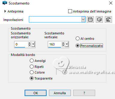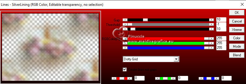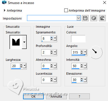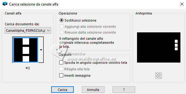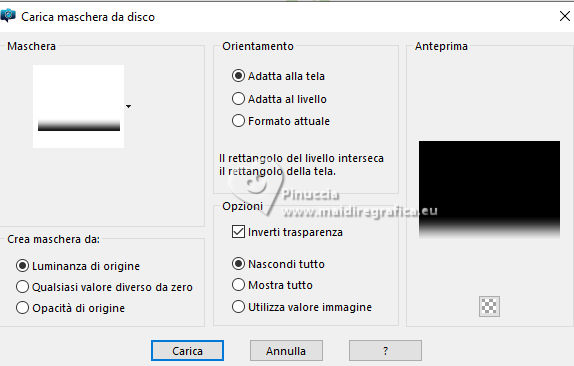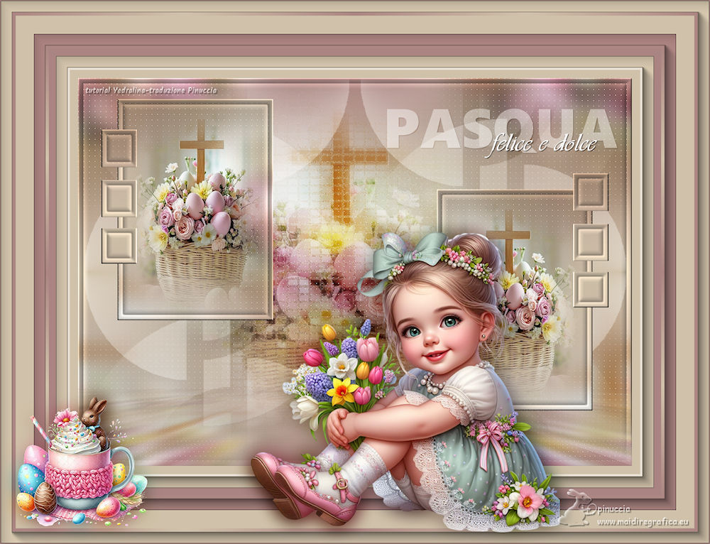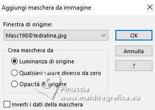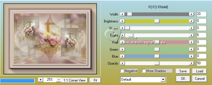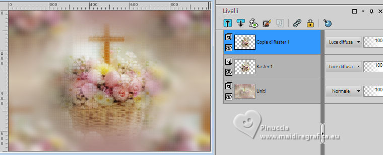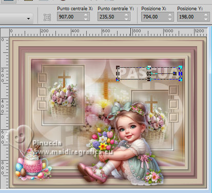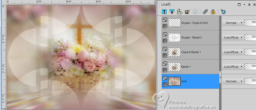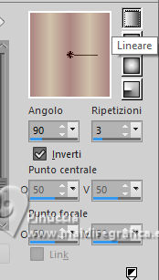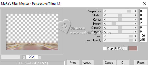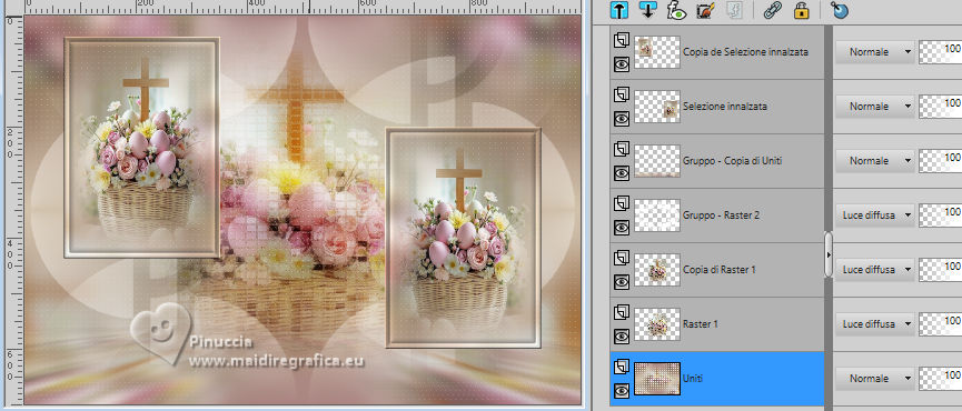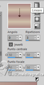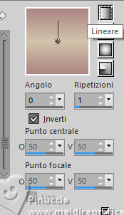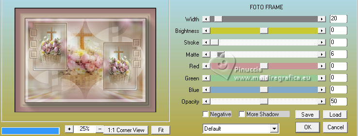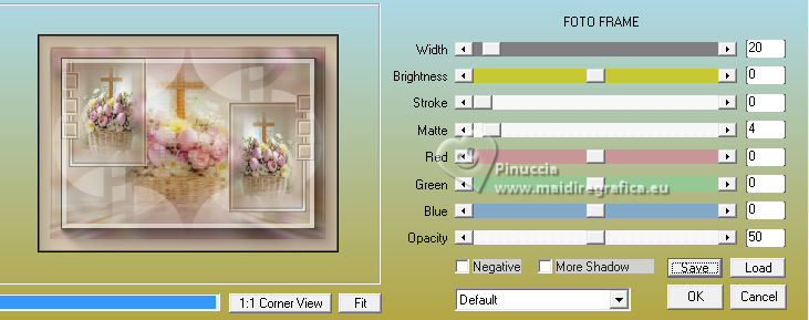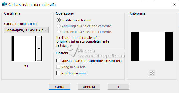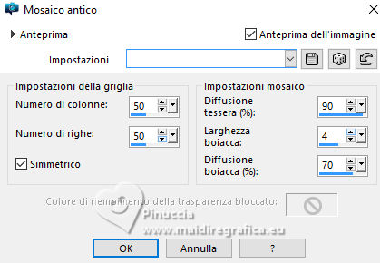 qui puoi trovare qualche risposta ai tuoi dubbi. Se l'argomento che ti interessa non è presente, ti prego di segnalarmelo. Questo tutorial è stato realizzato con PSP2020 e tradotto con PSPX9 e PSP2020, ma può essere eseguito anche con le altre versioni di PSP. Dalla versione X4, il comando Immagine>Rifletti è stato sostituito con Immagine>Capovolgi in orizzontale, e il comando Immagine>Capovolgi con Immagine>Capovolgi in verticale. Nelle versioni X5 e X6, le funzioni sono state migliorate rendendo disponibile il menu Oggetti. Con la nuova versione X7, sono tornati Rifletti>Capovolgi, ma con nuove varianti. Vedi la scheda sull'argomento qui traduzione in francese/traduction en français qui/ici traduzione in inglese/english translation qui/here Versioni/Versions qui![]() Occorrente: ![]() Per il tube grazie Virginia. Il resto del materiale è di Yedralina (in questa pagina trovi i links ai siti dei creatori di tubes) ![]() Filtri: se hai problemi con i filtri, consulta la mia sezione filtri qui AP 01 [Innovations] - Lines SilverLining qui Mura's Meister - Perspective Tiling qui AAA Frames - Foto Frame qui ![]() non esitare a cambiare modalità di miscelatura e opacità secondo i colori utilizzati. Nelle ultime versioni di PSP non c'è il gradiente di primo piano/sfondo (Corel_06_029) Puoi usare i gradienti delle versioni precedenti. Trovi qui i gradienti Corel X. ![]() Metti la maschera Masque Fade Suave nella cartella Maschere. Apri la seconda maschera in PSP e minimizzala con il resto del materiale. Se hai problemi con il canale alfa, apri una nuova immagine trasparente 1000 x 700 pixels, e usa le selezioni da disco. Imposta il colore di primo piano con #d1c3ab, e il colore di sfondo con #ab8582. ![]() colore 3: #ffffff Passa il colore di primo piano a gradiente di primo piano/sfondo, stile Lineare. ![]() 1. Apri Canal Alpha_FDPASCUA Questa immagine, che sarà la base del tuo lavoro, non è vuota, ma contiene le selezioni salvate sul canale alfa. Riempi l'immagine trasparente con il gradiente.2. Livelli>Nuovo livello raster. Selezione>Seleziona tutto. Apri il misted 4461©Yedralina ![]() Cancella il watermark e vai a Modifica>Copia. Torna al tuo lavoro e vai a Modifica>Incolla nella selezione. Selezione>Deseleziona. 3. Effetti>Effetti di immagine>Motivo unico. ![]() Regola>Sfocatura>Sfocatura gaussiana - raggio 15. ![]() 4. Effetti>Plugins>AP 01 [Innovations] - Lines SilverLining ![]() Livelli>Unisci>Unisci visibile. 5. Livelli>Nuovo livello raster. Selezione>Carica/Salva selezione>Carica selezione da canale alfa. La selezione #1 è subito disponibile. Devi soltanto cliccare Carica o da disco ©Yedralina_Sel0885 ![]() 6. Modifica>Incolla nella selezione - il misted è ancora in memoria. Selezione>Deseleziona. 7. Livelli>Duplica. Chiudi questo livello e attiva il livello sottostante dell'originale. 8. Effetti>Effetti di trama>Mosaico antico. ![]() Cambia la modalità di miscelatura di questo livello in Luce diffusa. 9. Riapri e attiva il livello superiore della copia. Cambia la modalità di miscelatura di questo livello in Luce diffusa. ![]() 10. Imposta il colore di primo piano con il colore bianco. Livelli>Nuovo livello raster. Riempi il livello con il colore bianco.Livelli>Nuovo livello maschera>Da immagine. Apri il menu sotto la finestra di origine e vedrai la lista dei files aperti. Seleziona la maschera Masc198©Yedralina ![]() Livelli>Unisci>Unisci gruppo. 11. Effetti>Effetti di immagine>Motivo unico, con i settaggi precedenti. ![]() Cambia la modalità di miscelatura di questo livello in Luce diffusa. 12. Attiva il livello di sfondo. Livelli>Duplica. Livelli>Disponi>Porta in alto. 13. Effetti>Plugins>Mura's Meister - Perspective Tiling. ![]() 14. Livelli>Carica/Salva maschera>Carica maschera da disco. Cerca e carica la maschera Masque-Fade-Suave ![]() Livelli>Unisci>Unisci gruppo. Regola>Messa a fuoco>Metti a fuoco. 15. Attiva nuovamente il livello di sfondo. ![]() Selezione>Carica/Salva selezione>Carica selezione da canale alfa. Apri il menu delle selezioni e carica la selezione #2 (da disco ©Yedralina_Sel0908) ![]() 16. Selezione>Innalza selezione a livello. Livelli>Disponi>Porta in alto. 17. Modifica>Incolla nella selezione - il misted è sempre in memoria. Regola>Messa a fuoco>Metti a fuoco. 18. Effetti>Effetti 3D>Smusso a incasso. ![]() Selezione>Deseleziona. 19. Effetti>Effetti di immagine>Scostamento. ![]() 20. Livelli>Duplica. Immagine>Rifletti>Rifletti orizzontalmente. Effetti>Effetti di immagine>Scostamento. ![]() 21. Di nuovo, attiva il livello di sfondo. ![]() Selezione>Carica/Salva selezione>Carica selezione da canale alfa. Apri il menu delle selezioni e carica la selezione #3 (da disco ©Yedralina_Sel0110) ![]() Selezione>Innalza selezione a livello. Livelli>Disponi>Porta in alto. 23. Effetti>Effetti 3D>Smusso a incasso, con i settaggi precedenti. Selezione>Deseleziona. Tasto K per attivare lo strumento Puntatore ![]() Posizione X: 894,00 - Posizione Y: 172,00. ![]() 24. Livelli>Duplica. Immagine>Rifletti>Rifletti orizzontalmente. Posizione X: 42,00 - Posizione Y: 93,00. ![]() 25. Attiva ancora il livello di sfondo. Effetti>Effetti 3D>Smusso a incasso, con i settaggi precedenti. 26. Per i bordi: imposta nuovamente il colore di primo piano con #d1c3ab. ![]() Passa il colore di primo piano a Gradiente di primo piano/sfondo, stile Lineare e cambia i settaggi ![]() Selezione>Seleziona tutto. Immagine>Aggiungi bordatura, 40 pixels, simmetriche, colore di primo piano. Selezione>Inverti. 27. Effetti>Plugins>AAA Frames - Foto Frame. ![]() Selezione>Seleziona tutto. 28. Immagine>Aggiungi bordatura, 40 pixels, simmetriche, colore di sfondo. Selezione>Inverti. 29. Effetti>Plugins>AAA Frames - Foto Frame - Matte 6. ![]() Selezione>Deseleziona. 30. Attiva lo strumento Bacchetta magica , sfumatura e tolleranza 0e clicca nel bordo bianco per selezionarlo. Riempi la selezione con il gradiente.31. Selezione>Seleziona tutto. Immagine>Aggiungi bordatura, 60 pixels, simmetriche, c