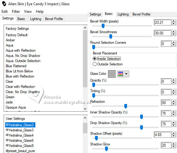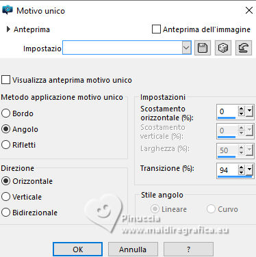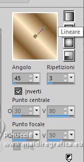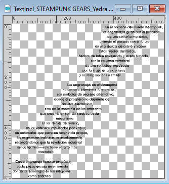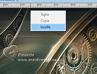 qui puoi trovare qualche risposta ai tuoi dubbi. Se l'argomento che ti interessa non è presente, ti prego di segnalarmelo. Questo tutorial è stato realizzato con PSP2020 e tradotto con PSPX9 e PSP2020, ma può essere eseguito anche con le altre versioni di PSP. Dalla versione X4, il comando Immagine>Rifletti è stato sostituito con Immagine>Capovolgi in orizzontale, e il comando Immagine>Capovolgi con Immagine>Capovolgi in verticale. Nelle versioni X5 e X6, le funzioni sono state migliorate rendendo disponibile il menu Oggetti. Con la nuova versione X7, sono tornati Rifletti>Capovolgi, ma con nuove varianti. Vedi la scheda sull'argomento qui traduzione in francese/traduction en français qui/ici traduzione in inglese/english translation qui/here Versioni/Versions qui![]() Occorrente: ![]() Per i tubes grazie Lady Valella e Mentali. Il resto del materiale è di Yedralina (in questa pagina trovi i links ai siti dei creatori di tubes) Filtri: se hai problemi con i filtri, consulta la mia sezione filtri qui Alien Skin Eye Candy 5 Impact - Glass, Extrude qui ![]() non esitare a cambiare modalità di miscelatura e opacità secondo i colori utilizzati. Nelle ultime versioni di PSP non c'è il gradiente di primo piano/sfondo (Corel_06_029) Puoi usare i gradienti delle versioni precedenti. Trovi qui i gradienti Corel X. Metti i preset Cliccando sul file una o due volte (a seconda delle tue impostazioni), automaticamente il preset si installerà nella cartella corretta. perchè uno o due clic vedi qui ![]() Metti il preset Emboss 6 nella cartella Impostazioni predefinite. Metti le selezioni nella cartella Selezioni. Colori: cambia i colori dell'immagine JPG1 per abbinarli ai tuoi tube. Scegli due colori dalla tua immagine, e imposta il colore di primo piano con il colore scuro, per me #7f562d, e il colore di sfondo con il colore chiaro, per me #feebc6. Scegli infine un terzo colore con una tonalità più chiara del tuo colore di primo piano, per me #234a49. ![]() Imposta il colore di primo piano con il colore scuro #7f562d, e il colore di sfondo con il colore chiaro #feebc6. ![]() Prepara il colore di primo piano con un Gradiente di primo piano/sfondo, stile Lineare. ![]() 1. Apri una nuova immagine trasparente 1000 x 700 pixels. 2. Selezione>Seleziona tutto. Apri l'immagine JPG1 ![]() (puoi cambiare il colore secondo i tuoi tubes) Modifica>Copia. Torna al tuo lavoro e vai a Modifica>Incolla nella selezione. Selezione>Deseleziona. 3. Effetti>Effetti di immagine>Motivo unico. ![]() 4. Effetti>Effetti di riflesso>Specchio rotante, con i settaggi standard. ![]() Effetti>Effetti di riflesso>Specchio rotante. ![]() 5. Livelli>Nuovo livello raster. Riempi il livello con il gradiente.6. Apri l'immagine JPG2 ![]() Minimizza l'immagine. Livelli>Nuovo livello maschera>da immagine Apri il menu sotto la finestra di origine e vedrai la lista dei files aperti. Seleziona l'immagine JPG2. ![]() Livelli>Unisci>Unisci gruppo. 7. Effetti>Filtro definito dall'utente - seleziona il preset Emboss 6 e ok. ![]() 8. Livelli>Nuovo livello raster. Selezione>Carica/Salva selezione>Carica selezione da disco. Cerca e carica la selezione ©Yedralina_Sel0902 ![]() Attiva l'immagine JPG1 e vai a Modifica>Copia. Torna al tuo lavoro e vai a Modifica>Incolla nella selezione. 10. Effetti>Plugins>Alien Skin Eye Candy 5 Impact - Glass. Seleziona il preset ©Yedralina_Glass2 ![]() Selezione>Deseleziona. 11. Effetti>Plugins>Alien Skin eye Candy 5 Impact - Extrude. Seleziona il preset EC5_Extr_006-Yedra - Solid Color: colore 3 #234a49. ![]() 12. Attiva il livello di sfondo. Regola>Sfocatura>Sfocatura radiale. ![]() Effetti>Filtro definito dall'utente - Emboss 6. ![]() 13. Livelli>Nuovo livello raster. Selezione>Carica/Salva selezione>Carica selezione da disco. Cerca e carica la selezione ©Yedralina_Sel0903 ![]() Imposta il colore di primo piano con il colore 3 #234a49. ![]() Abbassa l'opacità dello strumento Riempimento al 20%. Riempi la selezione con il colore di primo piano.Selezione>Deseleziona. non dimenticare di riportare l'opacità dello strumento Riempimento a 100 14. Apri Textincl_STEAMPUNK GEARS_Yedra ![]() Modifica>Copia. Torna al tuo lavoro e vai a Modifica>Incolla come nuovo livello. Tasto K per attivare lo strumento Puntatore ![]() Posizione X: 29,00 - Posizione Y: 37,00. ![]() ![]() Tasto M per deselezionare lo strumento. Livelli>Disponi>Porta in alto. Se i colori della tua immagine sono scuri, e preferisci il testo in bianco, vai a Immagine>Immagine negativa ***** Se preferisci scrivere il testo nella tua lingua, fai così. Livelli>Nuovo livello raster. Selezione>Carica/Salva selezione>Carica selezione da disco. Carica nuovamente la selezione ©Yedralina_Sel0903 ![]() Attiva lo strumento Testo , font Tw Cen MTdimensione 16 - colore di sfondo: colore chiaro. ![]() Nel materiale trovi il testo in un file txt. l'ho tradotto in italiano, francese, e inglese Seleziona il testo nella tua lingua. Modifica>Copia. Torna al tuo lavoro. Attiva lo strumento Testo e Incolla. ![]() Livelli>Converti in livello raster. Selezione>Deseleziona. Tasto K per attivare lo strumento Puntatore ![]() Posizione X: 29,00 - Posizione Y: 37,00. ![]() ***** Abbassa l'opacità di questo livello al 65%, o cambia la modalità di miscelatura in Luce diffusa, come preferisci. 15. Apri Titulo_STEAMPUNK GEARS_Yedra ![]() Modifica>Copia. Torna al tuo lavoro e vai a Modifica>Incolla come nuovo livello. Tasto K per attivare lo strumento Puntatore ![]() Posizione X: 28,00 - Posizione Y: 29,00. ![]() Tasto M per deselezionare lo strumento. Questi i settaggi usati: Font Stencil, dimensione 72 - colore di sfondo: gradiente con i colori 2 e 3 ![]() ![]() Abbiamo questo: ![]() Livelli>Unisci>Unisci visibile. 16. Selezione>Seleziona tutto. Selezione>Modifica>Contrai - 20 pixels. Selezione>Inverti. 17. Regola>Sfocatura>Sfocatura gaussiana - raggio 10. ![]() Selezione>Inverti. 18. Livelli>Nuovo livello raster. Riporta il colore di primo piano con il gradiente iniziale.