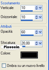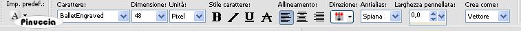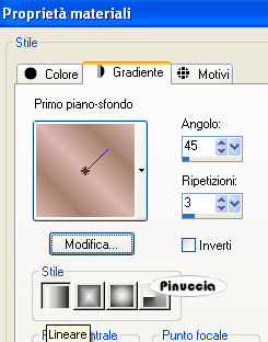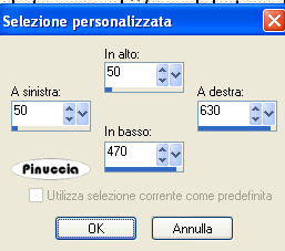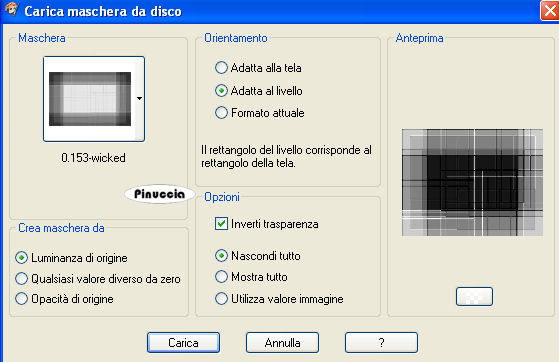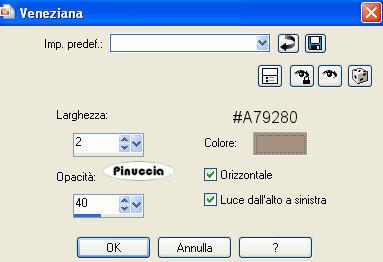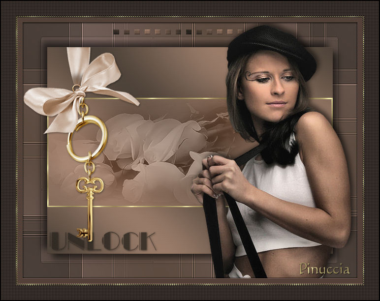 qui puoi trovare qualche risposta ai tuoi dubbi. Se l'argomento che ti interessa non è presente, ti prego di segnalarmelo. Questo tutorial è stato scritto con PSP 9, ma può essere eseguito anche con le altre versioni di PSP. Occorrente: Materiale qui I tubes che ho usato sono di Marif e HJR Designs. Per favore, rispetta il lavoro degli autori e mantieni i tubes al loro stato originale. Metti la maschera nella cartella Maschere di PSP. Metti la selezione nella cartella Selezioni di PSP. Filtri: Screenworks qui Jeux de lignes qui 1. Apri una nuova immagine trasparente 680 x 520 pixels. Imposta il colore di primo piano con #dcb6b0, e il colore di sfondo con #a3806c. Passa il colore di primo piano a Gradiente di primo piano/sfondo, con i seguenti settaggi: ![]() Riempi l'immagine trasparente con questo gradiente.Regola>Sfocatura>Sfocatura gaussiana, raggio 30. ![]() 2. Livelli>Nuovo livello raster. Imposta il colore di primo piano con #2a251f. Riempi il nuovo livello con il colore di primo piano.Livelli>Carica/Salva maschera>Carica maschera da disco. Cerca e carica la maschera "0.153-wicked". ![]() Livelli>Unisci>Unisci gruppo. 3. Attiva lo strumento Selezione ,selezione personalizzata , con i seguenti settaggi:![]() 4. Livelli>Nuovo livello raster. Con i colori impostati adesso come primo piano e sfondo crea un gradiente con i seguenti settaggi: ![]() Riempi il nuovo livello con il gradiente.Regola>Sfocatura>Sfocatura gaussiana, raggio 30. Effetti>Effetti di trama>Veneziana: ![]() 5. Effetti>Effetti 3D>Sfalsa ombra, con i seguenti settaggi: ![]() Ripeti l'Effetto Sfalsa ombra, ma cambiando verticale e orizzontale a -10. 6. Livelli>Nuovo livello raster. Selezione>Carica/Salva selezione>Carica selezione da disco. Cerca e carica la selezione "sde_butterflies_3". ![]() Riempi la selezione con il gradiente.7. Effetti>Effetti 3D>Smusso a incasso: ![]() Selezione>Nessuna selezione. 8. Livelli>Nuovo livello raster. Attiva lo strumento Selezione ,selezione personalizzata , con i seguenti settaggi:![]() Riempi la selezione con il colore di sfondo.Abbassa l'opacità di questo livello al 42%. Selezione>Modifica>Seleziona bordature selezione: ![]() 9. Livelli>Nuovo livello raster. Riempi la selezione con il motivo Gold Foil.![]() se non hai un motivo oro, clicca qui Scompatta il file, apri il motivo in PSP e cercalo nella lista dei motivi. Selezione>Nessuna selezione. 10. Apri il tube "Marif_2006_octobre_misted_fleurs088", e vai a Modifica>Copia. Torna al tuo lavoro e vai a Modifica>Incolla>Incolla come nuovo livello. Immagine>Ridimensiona, al 90%, bicubica, tutti i livelli non selezionato. ![]() Sposta il tube nel riquadro.Cambia la modalità di miscelatura di questo livello in Luminanza (esistente), e abbassa l'opacità al 52%. 11. Apri il tube "HJR_Woman6_24jun2007", e vai a Modifica>Copia. Torna al tuo lavoro e vai a Modifica>Incolla>Incolla come nuovo livello. Immagine>Ridimensiona, al 95%, bicubica, tutti i livelli non selezionato. Spostalo a destra.Effetti>Effetti 3D>Sfalsa ombra, con i seguenti settaggi: ![]() 12. Imposta il colore di sfondo con #2a251f. Attiva lo strumento Testo ![]() font BalletEngraved, con i seguenti settaggi: ![]() Effetti>Effetti 3D>Sfalsa ombra: ![]() Abbassa l'opacità di questo livello all'82%. 13. Apri il tube "Key", e vai a Modifica>Copia. Torna al tuo lavoro e vai a Modifica>Incolla>Incolla come nuovo livello. Immagine>Ridimensiona, all'85%, bicubica, tutti i livelli non selezionato. Spostalo a sinistra, contro il bordo superiore della striscia.![]() Effetti>Effetti 3D>Sfalsa ombra: ![]() 14. Livelli>Unisci>Unisci tutto. Immagine>Aggiungi bordatura, 11 pixels, simmetriche, con il colore #a3806c. Seleziona questo bordo con la bacchetta magica ![]() ![]() Effetti>Plugins>Jeux de lignes - Entrelacement: ![]() Effetti>Effetti 3D>Sfalsa ombra: ![]() Ripeti l'Effetto Sfalsa ombra, ma cambiando verticale e orizzontale a -1. 15. Immagine>Aggiungi bordatura, 3 pixels, simmetriche, con il colore bianco. Seleziona questo bordo con la bacchetta magica ![]() Riempi la selezione con il motivo Gold Foil.Effetti>Plugins>Screenworks - Close Knit. 16. Immagine>Aggiungi bordatura, 30 pixels, simmetriche, con il colore #4b4039. Seleziona questo bordo con la bacchetta magica ![]() Effetti>Effetti di trama>Veneziana, con i seguenti settaggi, colore nero. ![]() Ripeti l'Effetto Veneziana, con gli stessi settaggi, ma togliendo la spunta a orizzontale. ![]() 17. Immagine>Aggiungi bordatura, 2 pixels, simmetriche, con il colore nero. 18. Aggiungi il tuo nome e/o il tuo watermark e salva in formato jpg. ![]() Se hai problemi o dubbi, o trovi un link non funzionante, o anche soltanto per un saluto, scrivimi. 11 Luglio 2007 |