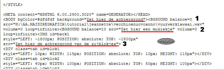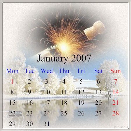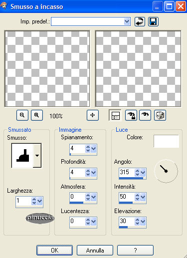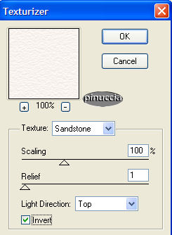qui puoi trovare qualche risposta ai tuoi dubbi. Se l'argomento che ti interessa non è presente, ti prego di segnalarmelo. Materiale qui I mesi di dicembre 2011-gennaio 20122 qui Filtro Texture - Texturizer qui Imposta il colore di primo piano con #F8F3EE, e il colore di sfondo con #CBC5BF. 1. Apri una nuova immagine 500 x 500 con il colore di primo piano. 2. Effetti>Plugins>Texture - Texturizer: apri il menù Texture cliccando sulla freccetta a fianco del box e seleziona la texture Sandstone, con i seguenti settaggi: ![]() 3. Immagine>Aggiungi bordatura, 10 pixels, simmetriche, con il colore di sfondo. 4. Seleziona il bordo con la bacchetta magica ![]() 5. Effetti>Effetti 3D>Smusso a incasso, con i seguenti settaggi: ![]() Selezione>Nessuna selezione. 6. Duplica l'immagine (shift+D) e metti da parte la copia. 7. Apri tutti i tube forniti con il tutorial. 8. Attiva il tube "Winter" e vai a Modifica>Copia. Torna al tuo lavoro e vai a Modifica>Incolla>Incolla come nuovo livello. Spostalo in basso.9. Nella paletta dei livelli abbassa l'opacità di questo livello al 75%. 10. Apri il tube "Oliebollen" e vai a Modifica>Copia. Torna al tuo lavoro e vai a Modifica>Incolla>Incolla come nuovo livello. Spostalo in alto.11. Nella paletta dei livelli abbassa l'opacità al 75%. 12. Apri il tube "December" e vai a Modifica>Copia. Torna al tuo lavoro e vai a Modifica>Incolla>Incolla come nuovo livello. Spostalo in basso.13. Controlla che tutto sia a posto. Eventualmente puoi ancora spostare un po' gli elementi della tag. Livelli>Unisci>Unisci visibile. 14. Immagine>Ridimensiona, a 450x450 pixels, tutti i livelli selezionato. Regola>Messa a fuoco>Metti a fuoco. La prima immagine per lo script è finita. Salva in formato jpg. 15. Attiva la copia dello sfondo che hai messo da parte. Duplicala nuovamente (shift+D) e metti da parte la copia. Ripeti i passaggi dall'8 al 14, ma con i tubes rimanenti, cioè rw-winterwonderland, champagne e januari. Quando avrai terminato, avrai la seconda immagine per lo script. Salvala in formato jpg. ![]() Per lo script avrai bisogno, oltre alle due immagini dicembre e gennaio, di due sfondi il suono dei fuochi artificiali che trovi nello zip ("vuurweklawaai") e di uno sfondo musicale, che è sempre facoltativo. Per il primo sfondo, attiva la seconda copia della trama che hai messo da parte prima. Ridimensionala a 100x100 pixels e salvala come sfondo.jpg. Seleziona una piccola parte della bottiglia di champagne: ![]() Salva come sfondoblocchi.jpg. Se vuoi usare lo script di Jeannette clicca qui (ho tolto il link, perchè il sito è chiuso, ma mantengo le istruzioni che possono servire per casi simili) e segui i preliminari descritti alla fine di questo tutorial, fino all'inserimento dello sfondo-suono. Fai attenzione in questo script, perchè il primo suono da inserire è quello dei fuochi artificiali. Infatti quando cliccherai su Formato>Sfondo>Suono, lo script individuerà subito dove inserire il suono dei fuochi.