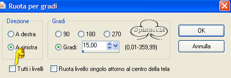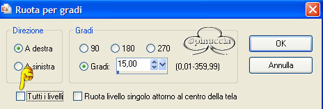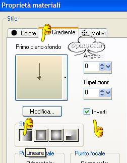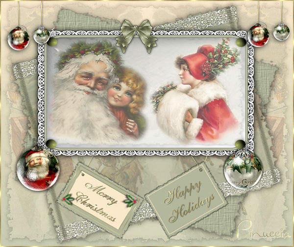 qui puoi trovare qualche risposta ai tuoi dubbi. Se l'argomento che ti interessa non è presente, ti prego di segnalarmelo. Questo tutorial è stato creato con PSP 8.1, ma può essere eseguito con tutte le versioni di PSP. Per questo tutorial ho usato 13 tubes (attenzione: i livelli di questi tubes sono tutti chiusi). Materiale qui e qui Ho diviso i tubes in due zip, per ridurre il peso del materiale. Aprite tutti i tubes in PSP. 1. Apri una nuova immagine trasparente 625 x 525 pixels. 2. Imposta il colore di primo piano con #fae9cb e il colore di sfondo con #c8ccb0. Passa il colore di primo piano a gradiente di primo piano/sfondo, stile lineare, con i seguenti settaggi: (il colore più chiaro deve trovarsi in alto) ![]() 3. Attiva il tube Paper1 e vai a Modifica>Copia. Torna al tuo lavoro e vai a Modifica>Incolla>Incolla come nuovo livello. Nella paletta dei livelli abbassa l'opacità di questo livello al 26%. 4. Apri il tube Paper2 e vai a Modifica>Copia. Torna al tuo lavoro e vai a Modifica>Incolla>Incolla come nuovo livello. Immagine>Ruota>Ruota per gradi, 15 gradi a destra, tutti i livelli non selezionato. ![]() 5. Apri il tube Paper3 e vai a Modifica>Copia. Torna al tuo lavoro e vai a Modifica>Incolla>Incolla come nuovo livello. Immagine>Ruota>Ruota per gradi, 15 gradi a sinistra, tutti i livelli non selezionato. ![]() 6. Apri il tube Lace e vai a Modifica>Copia. Torna al tuo lavoro e vai a Modifica>Incolla>Incolla come nuovo livello. Immagine>Ruota>Ruota per gradi, 15 gradi a sinistra, tutti i livelli non selezionato. Il tube è già al posto giusto. Non occorre spostarlo. 7. Apri il tube Scrap-edge e vai a Modifica>Copia. Torna al tuo lavoro e vai a Modifica>Incolla>Incolla come nuovo livello. Immagine>Ruota>Ruota per gradi, 15 gradi a sinistra, tutti i livelli non selezionato. Posizionalo sul bordo dell'ultimo livello carta.Livelli>Duplica. Spostalo sull'altro lato della carta.![]() 8. Apri il tube Scrap-pic e vai a Modifica>Copia. Torna al tuo lavoro e vai a Modifica>Incolla>Incolla come nuovo livello. Sposta in alto e leggermente sulla destra. 9. Effetti>Effetti 3D>Sfalsa ombra, con i seguenti settaggi, ombra su un nuovo livello selezionato. ![]() Ritorna sul livello del tube e ripeti l'Effetto Sfalsa ombra, ma cambiando verticale e orizzontale a -2. 10. Chiudi tutti i livelli eccetti i livelli delle ombre e dello scrap-pic. Livelli>Unisci>Unisci visibile. Riapri tutti i livelli (Livelli>Visualizza>Tutto). 11. Apri il tube Scrap-deco1 e vai a Modifica>Copia. Torna al tuo lavoro e vai a Modifica>Incolla>Incolla come nuovo livello. Spostalo in basso a sinistra dello scrap-pic.(vedi l'esempio sotto; eventualmente, potrai ancora spostarlo un po' più tardi). 12. Apri il tube Scrap-deco2 e vai a Modifica>Copia. Torna al tuo lavoro e vai a Modifica>Incolla>Incolla come nuovo livello. Spostalo in basso a destra dello scrap-pic.(vedi l'esempio sotto; eventualmente, potrai ancora spostarlo un po' più tardi). 13. Apri il tube Scrap-deco3 e vai a Modifica>Copia. Torna al tuo lavoro e vai a Modifica>Incolla>Incolla come nuovo livello. Spostalo in nell'angolo in alto a sinistra dello scrap-pic.(vedi l'esempio sotto). 14. Livelli>Duplica. Immagine>Rifletti. Sistemalo sull'altro angolo della cornice.Chiudi tutti i livelli eccetto questi ultimi due. Livelli>Unisci>Unisci visibile. Livelli>Duplica. Riapri tutti i livelli (Livelli>Visualizza>Tutto). Spostalo in basso allo scrap-pic.![]() 15. Adesso, se vuoi, puoi spostare le palline di Natale, in modo che sembrino appese da questo ultimo livello. 16. Apri il tube Scrap-deco4 e vai a Modifica>Copia. Torna al tuo lavoro e vai a Modifica>Incolla>Incolla come nuovo livello. Immagine>Ruota>Ruota per gradi, 30 gradi a sinistra. Posizionalo sotto il quadro a destra (vedi la tag finale).17. Apri il tube Scrap-deco5 e vai a Modifica>Copia. Torna al tuo lavoro e vai a Modifica>Incolla>Incolla come nuovo livello. Immagine>Ruota>Ruota per gradi, 30 gradi a destra. Spostalo a sinistra sotto il quadretto (vedi la tag finale).18. Apri il tube scrap-deco6 e vai a Modifica>Copia. Torna al tuo lavoro e vai a Modifica>Incolla>Incolla come nuovo livello. Spostalo in alto a sinistra.Livelli>Duplica. Spostalo in alto a destra (vedi la tag finale).19. Apri il tube scrap-deco7 e vai a Modifica>Copia. Torna al tuo lavoro e vai a Modifica>Incolla>Incolla come nuovo livello. Mettilo dove preferisci.20. Livelli>Unisci>Unisci visibile. Immagine>Ridimensiona, della misura che preferisci. Regola>Messa a fuoco>Metti a fuoco. 21. Selezione>Seleziona tutto. Selezione>Modifica>Contrai, di 2 pixels. Selezione>Inverti. Riempi con un Motivo oro.22. Aggiungi il tuo nome e hai finito. ![]() Se hai problemi o dubbi, o trovi un link non funzionante, o anche soltanto per un saluto, scrivimi. 4 Dicembre 2006 |